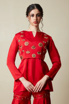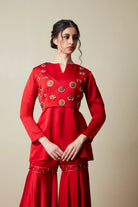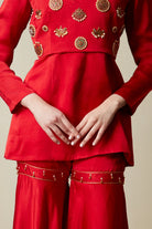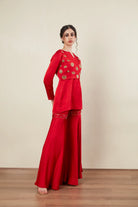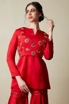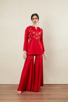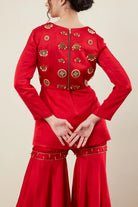 Round Neck -V slit -Full Sleeves -Kurta -Sharara pants -Back Metal Zipper -Crop Jacket -South Indian Jewellery Embellishment