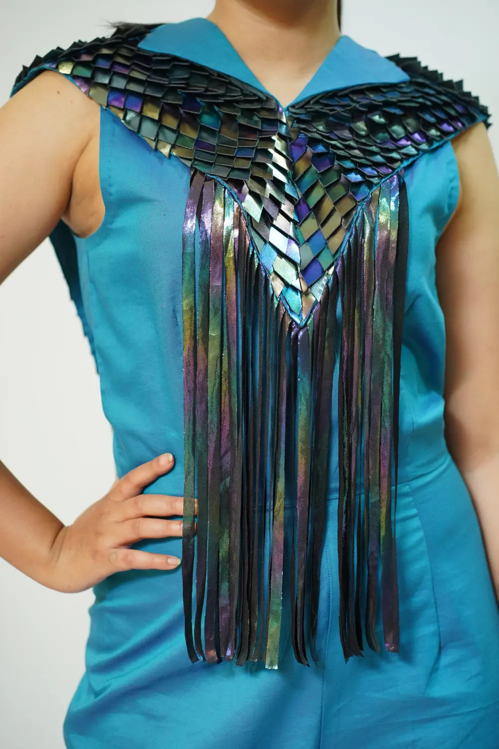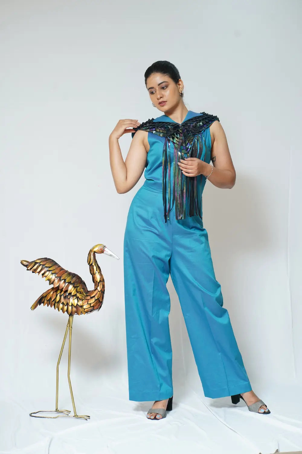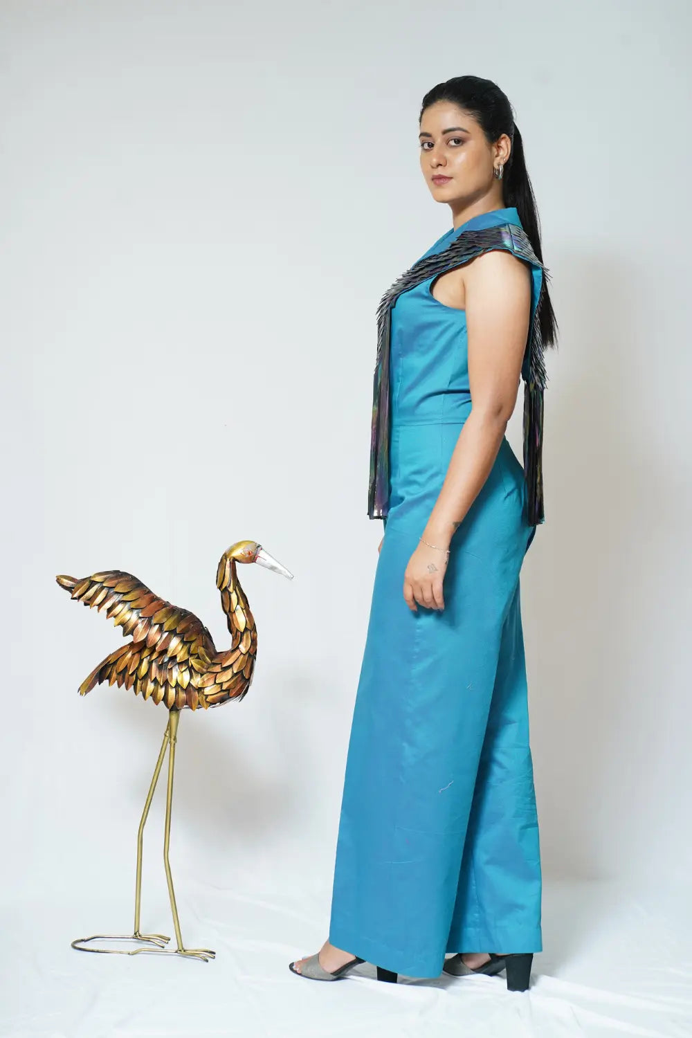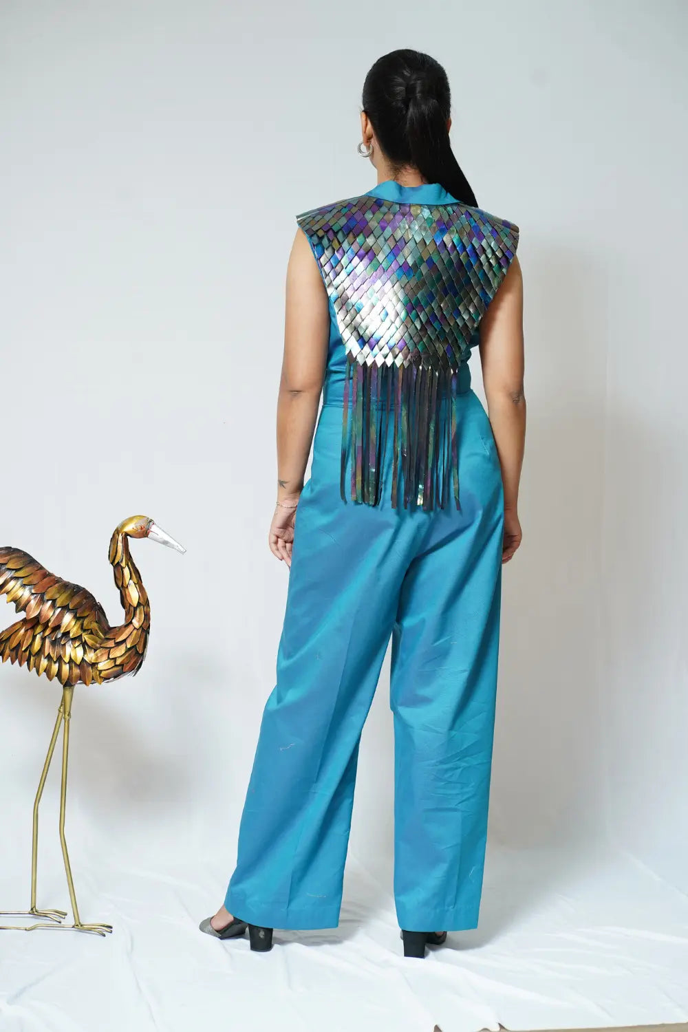 -Metallurgic embroidery on vest -detachable cape -cotton satin jumpsuit -Shirt collar