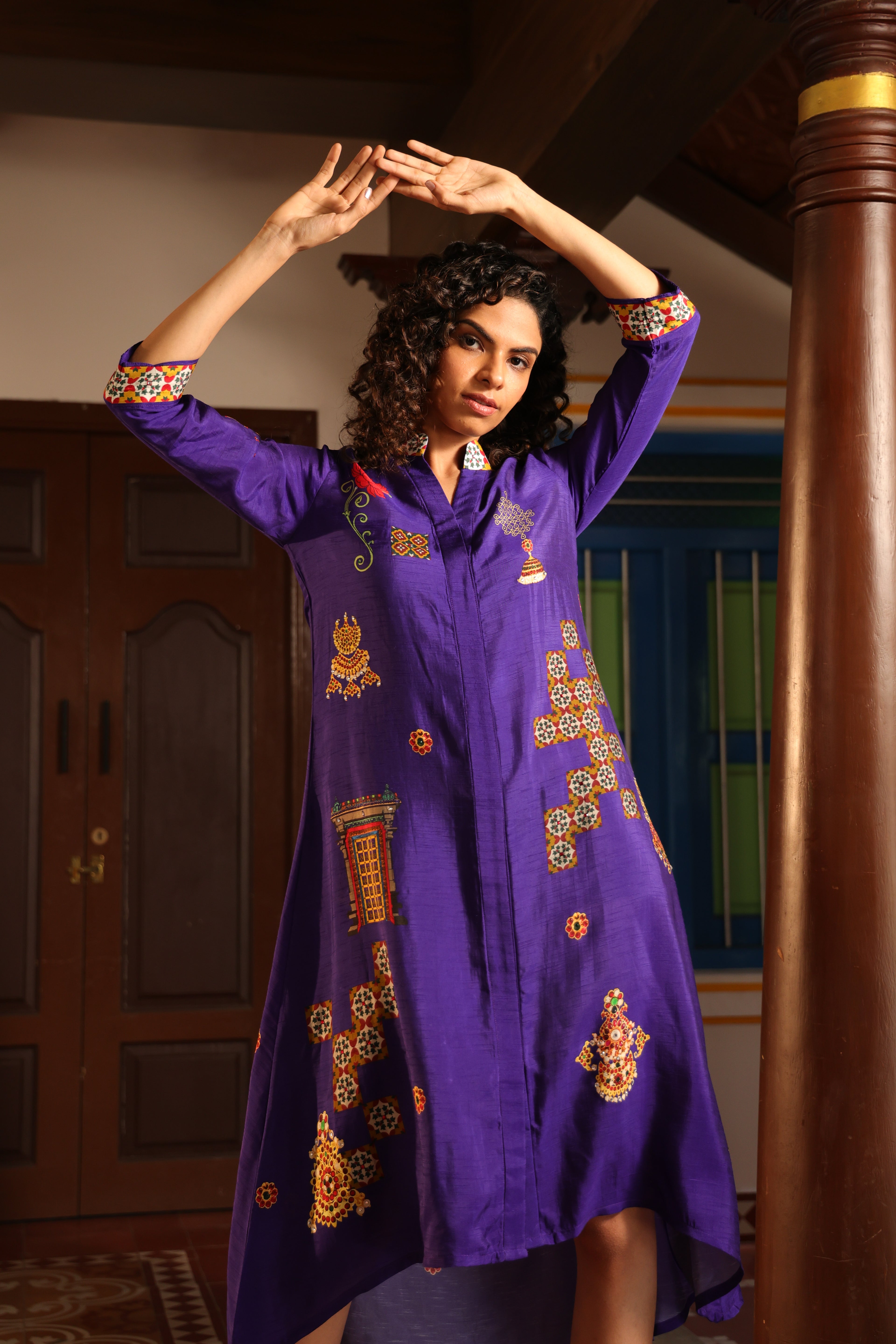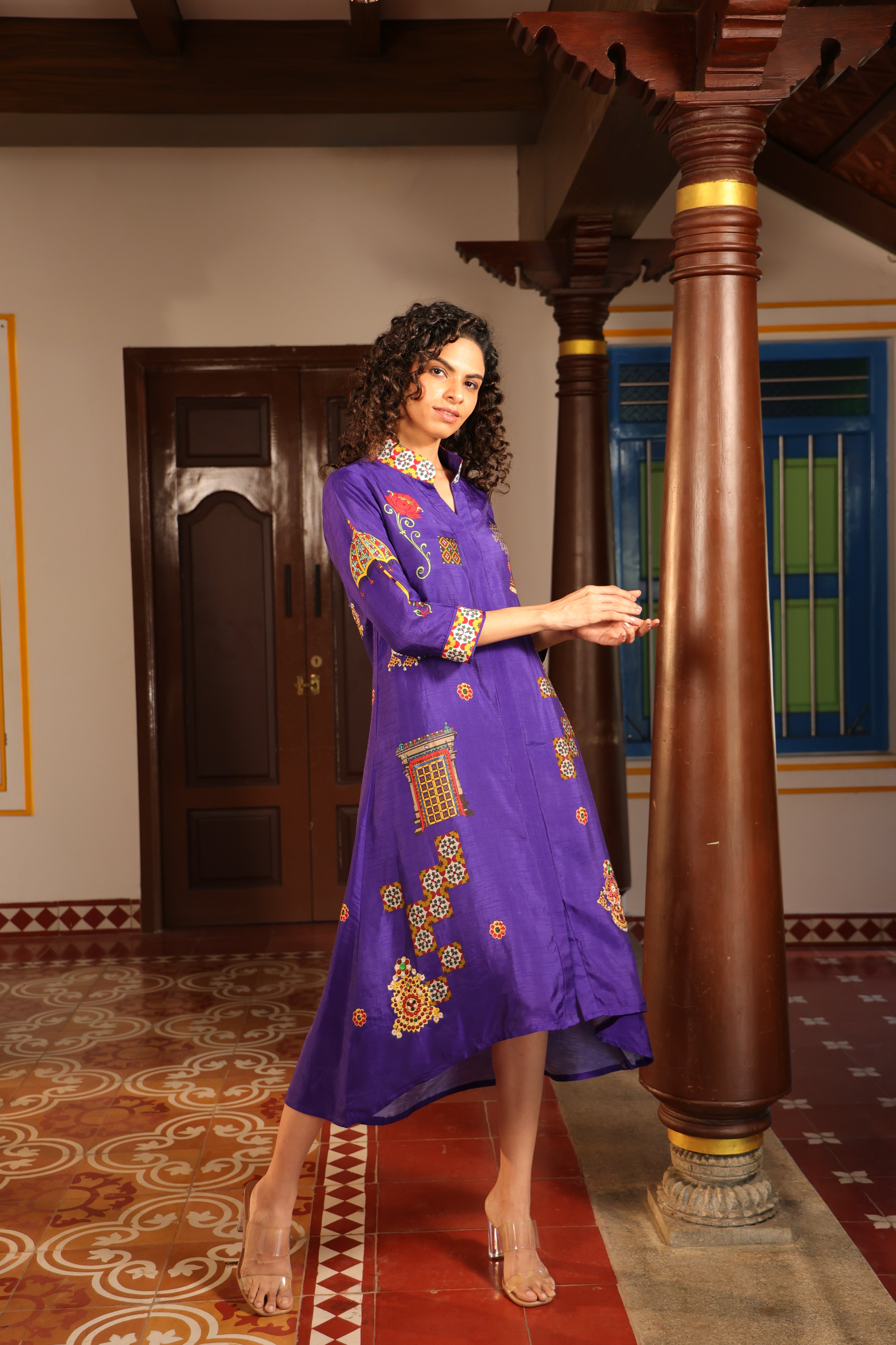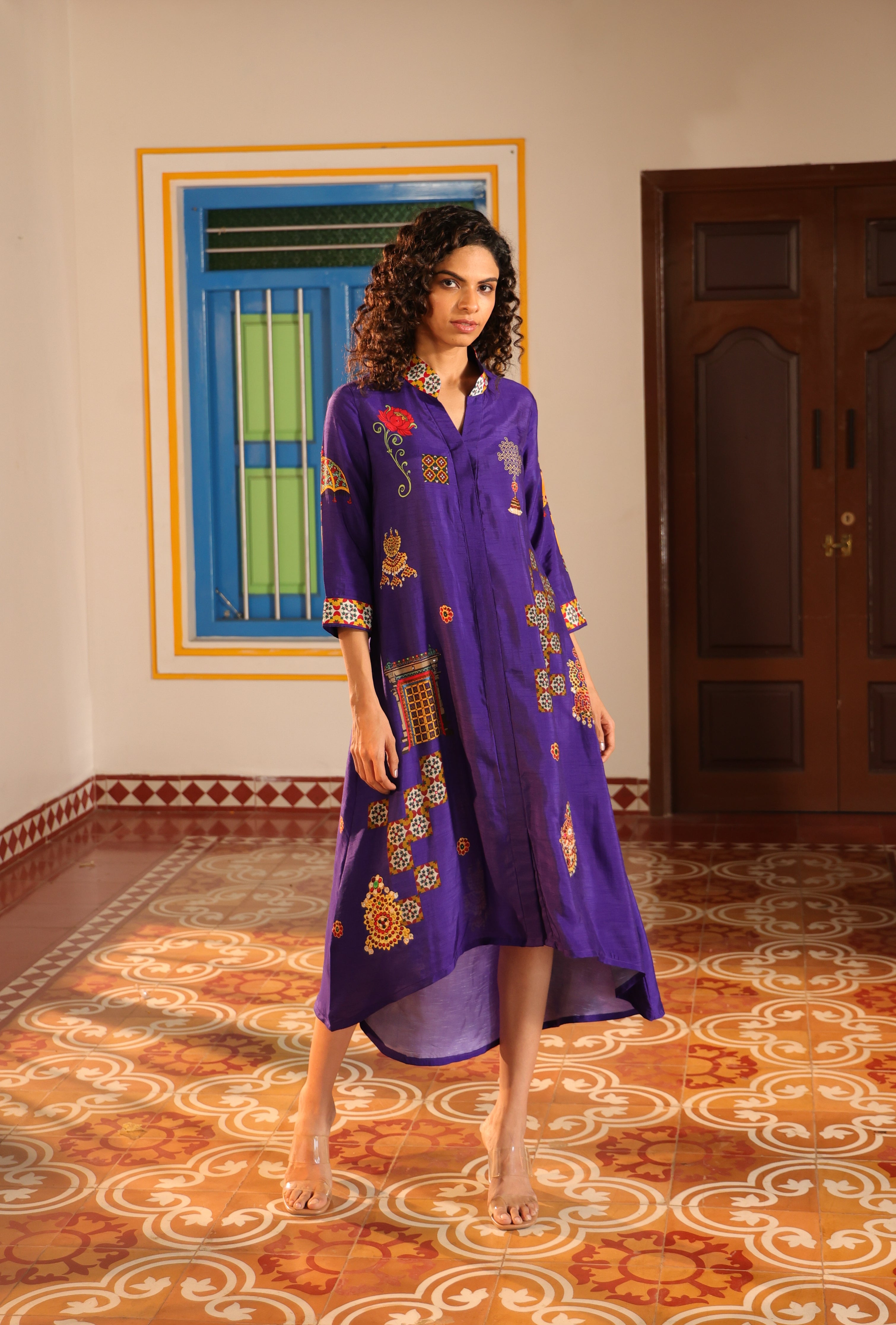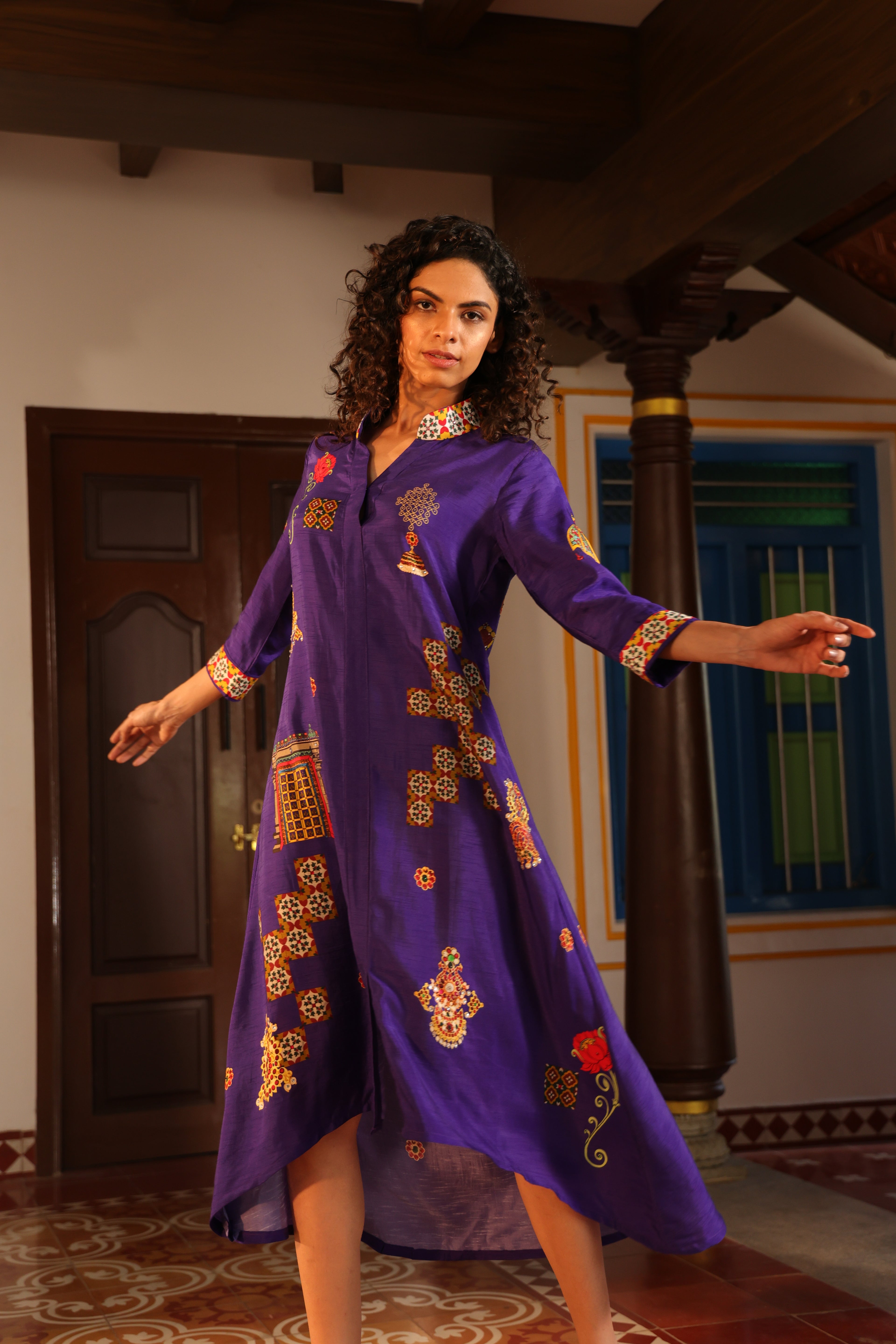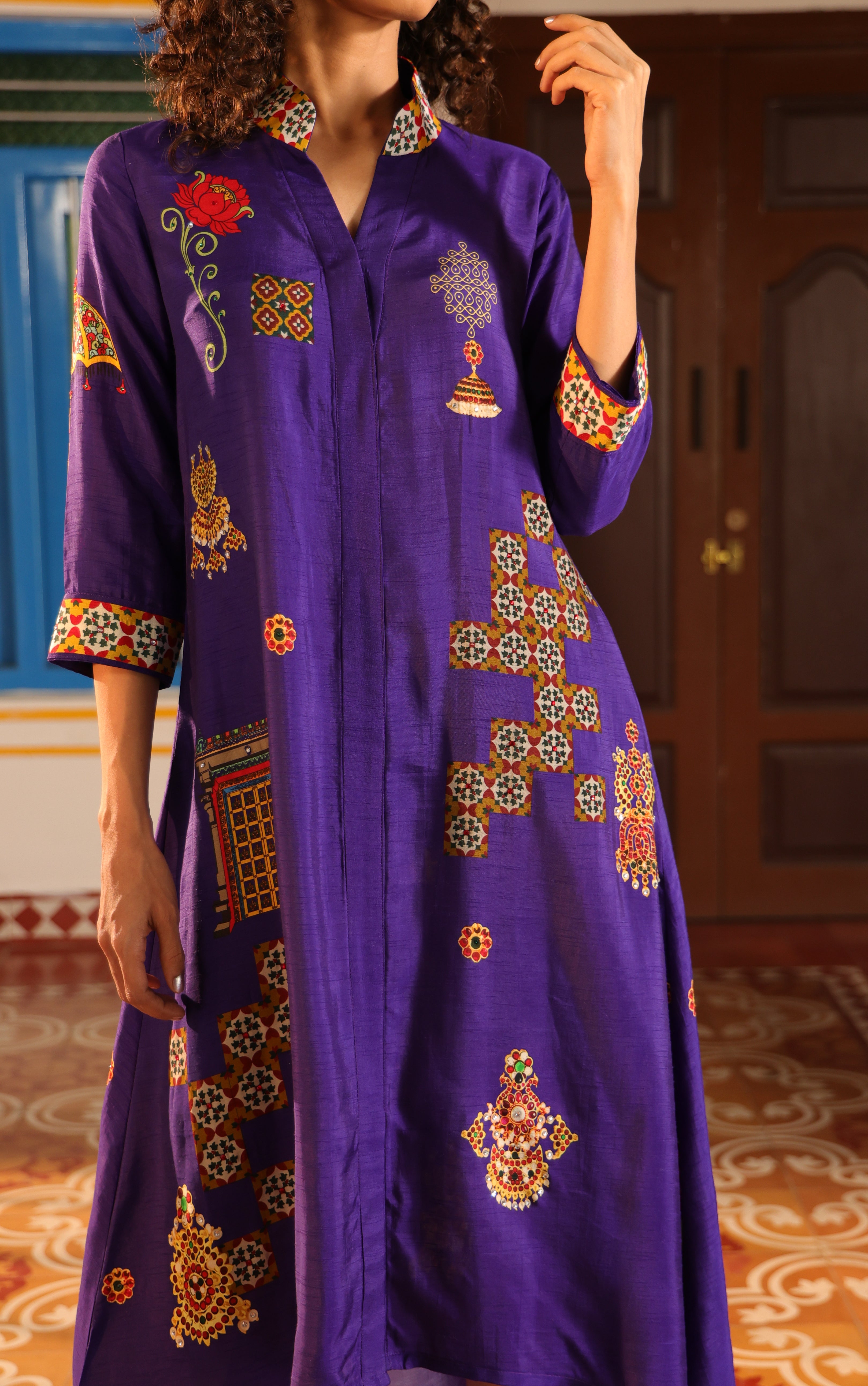 Shirt dress with collar, front open 3/4 sleeves with chettinad architechture and jewellery print embellished with stone embroidery.
