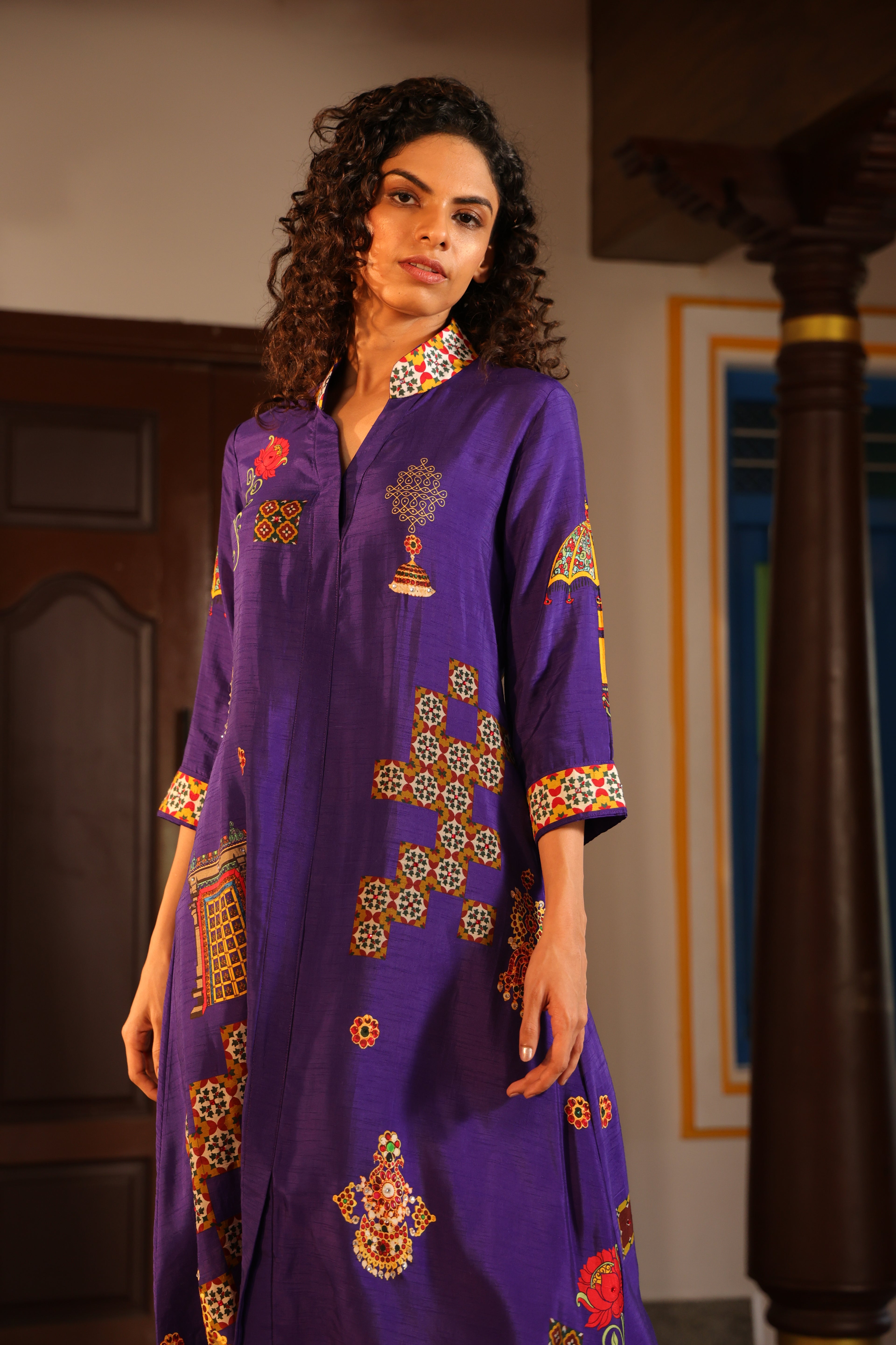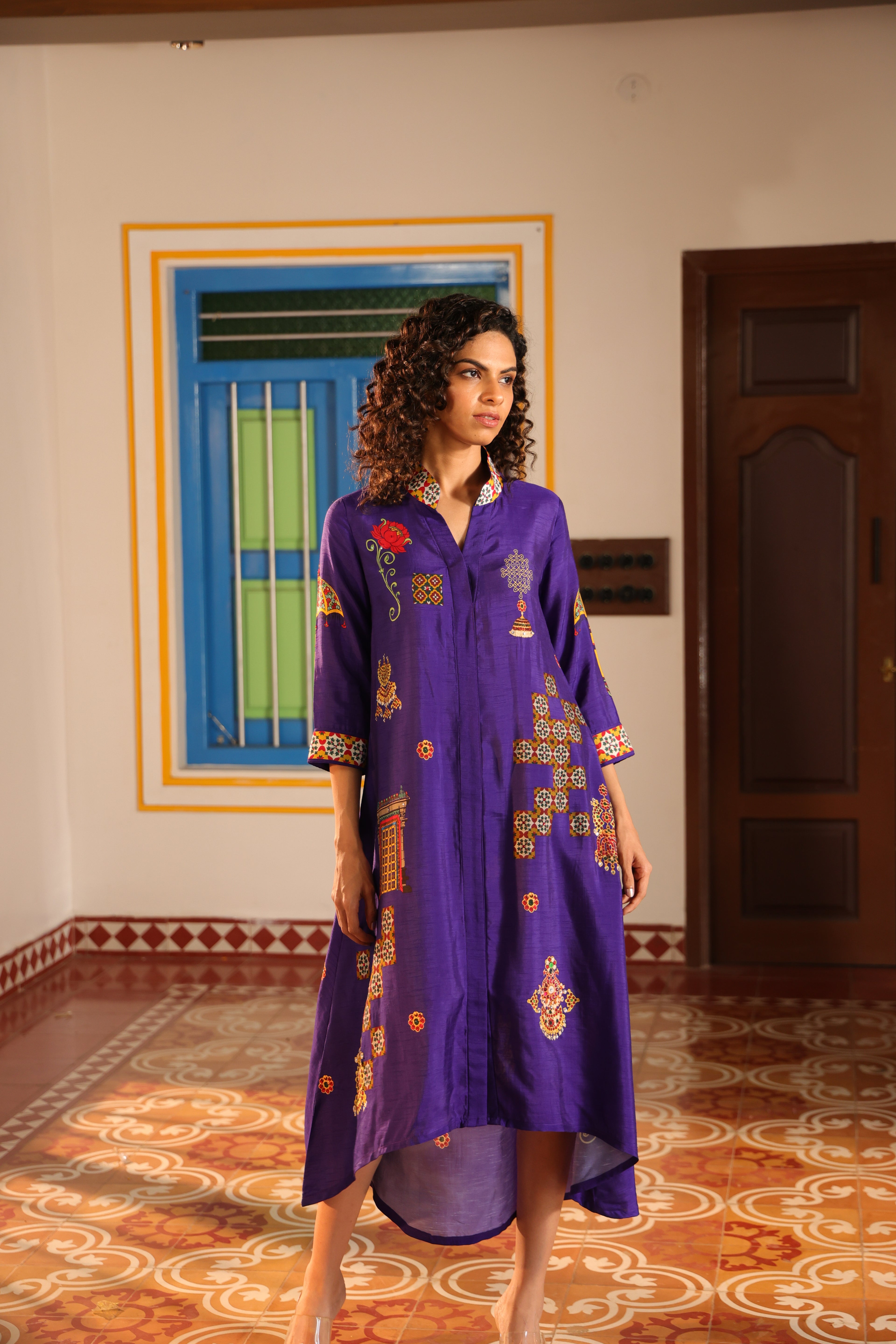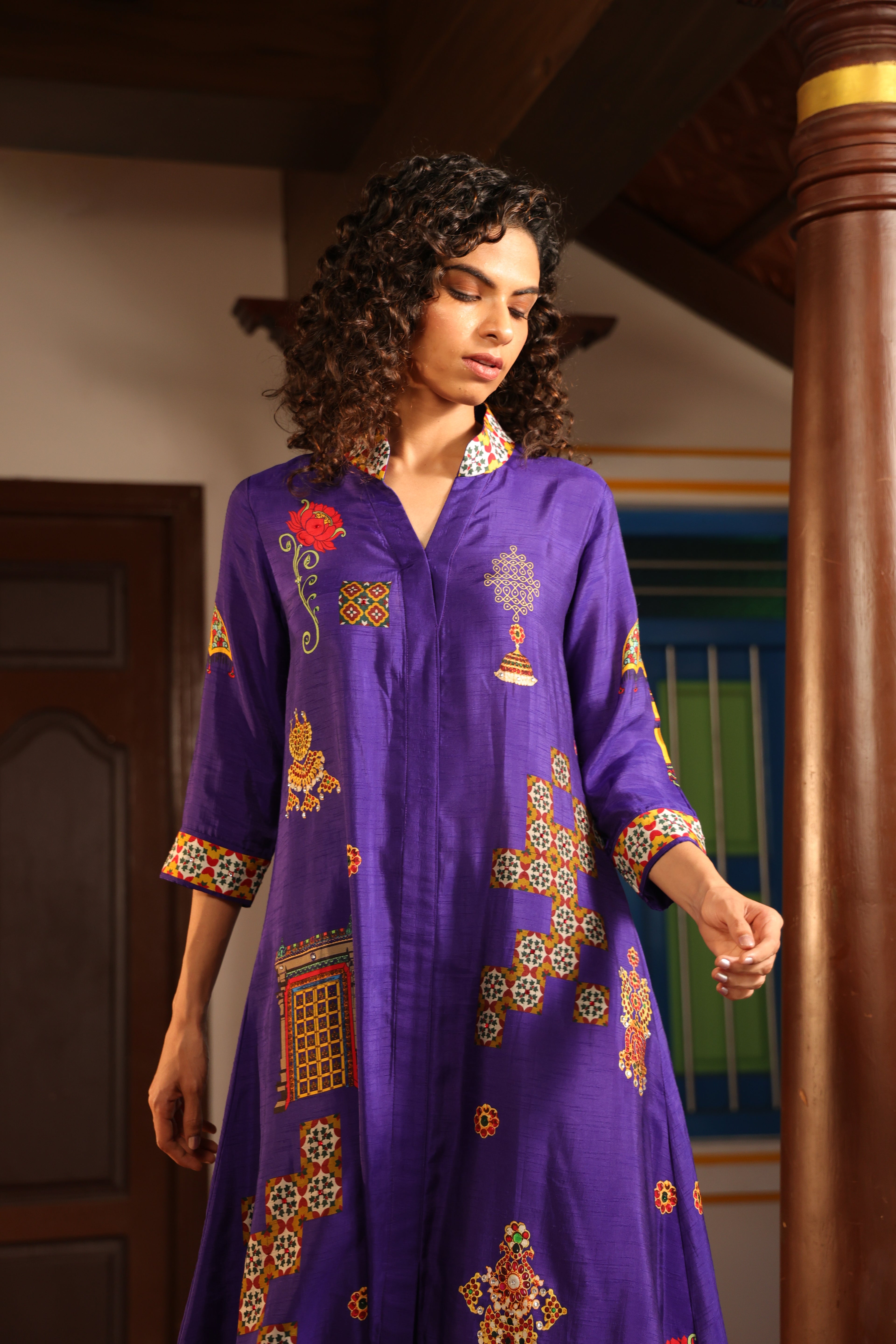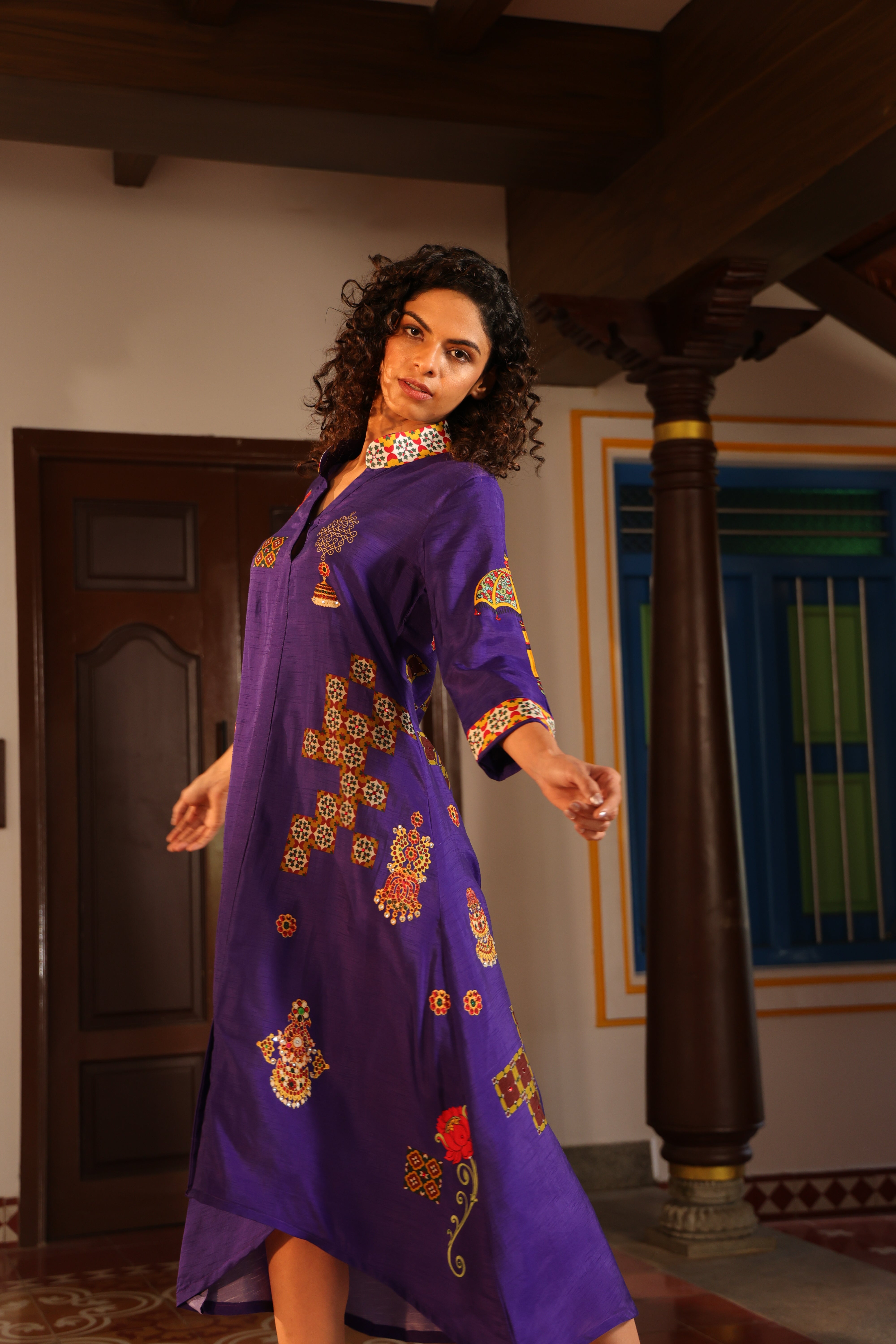 Shirt dress with collar, front open 3/4 sleeves with chettinad architechture and jewellery print embellished with stone embroidery.