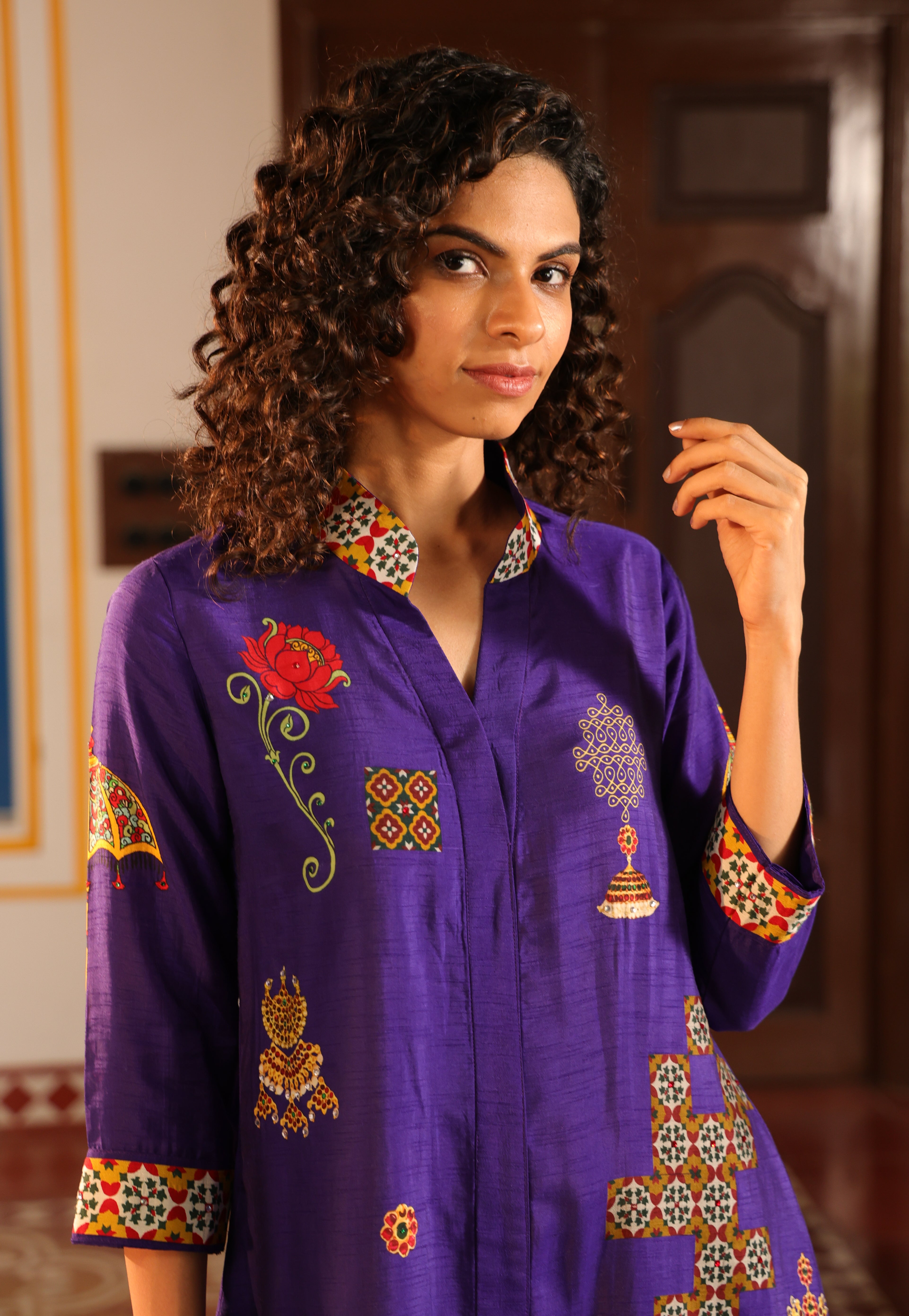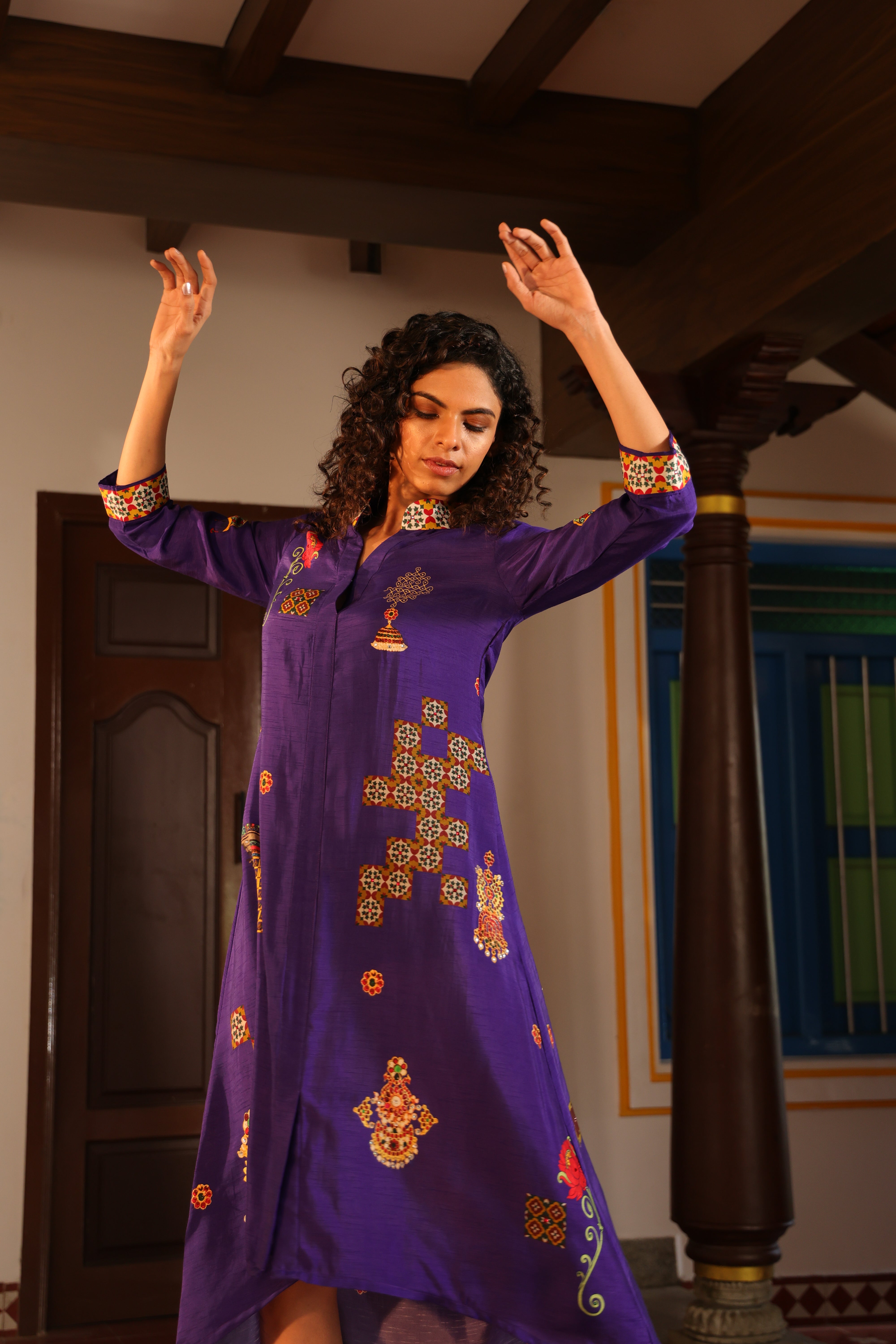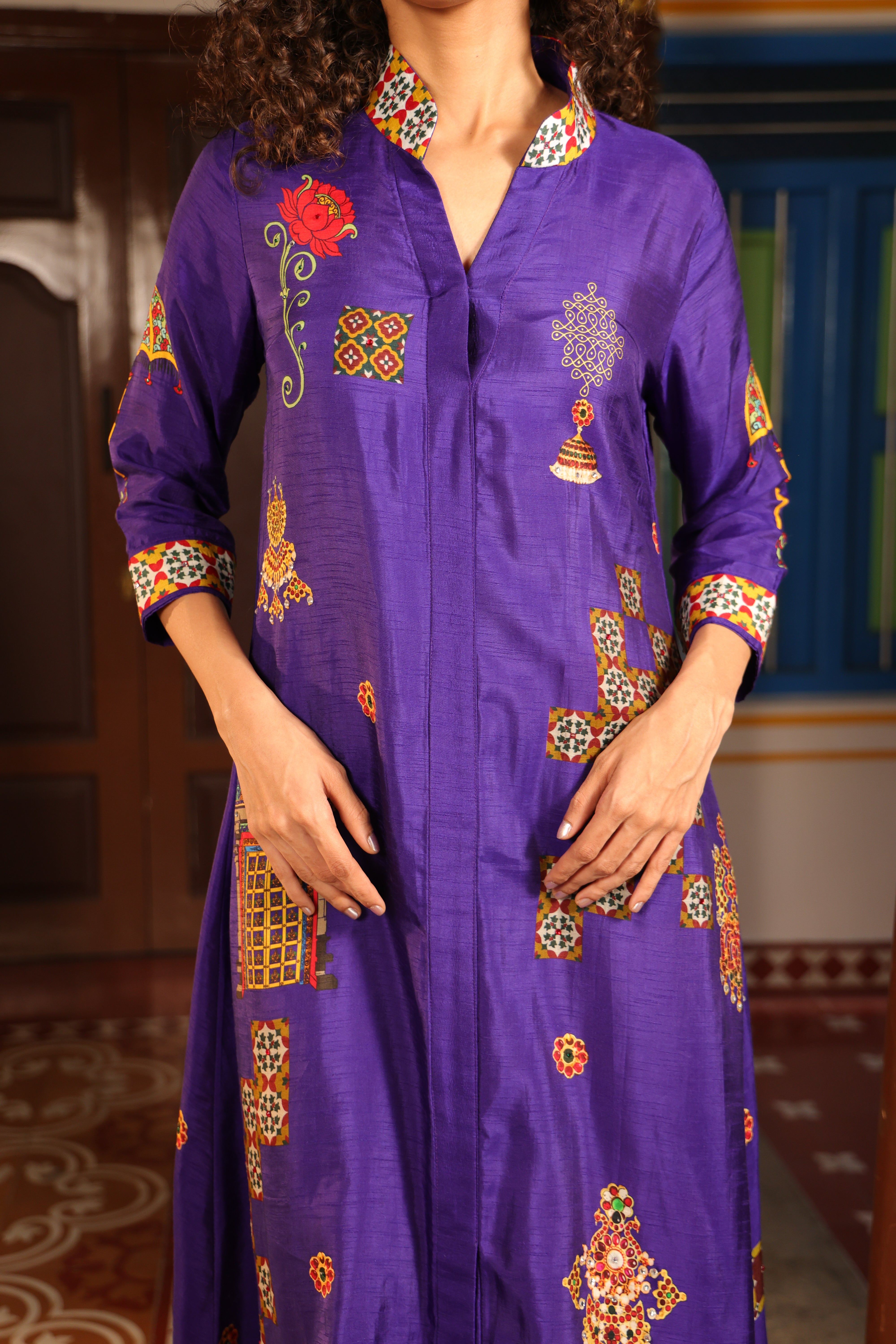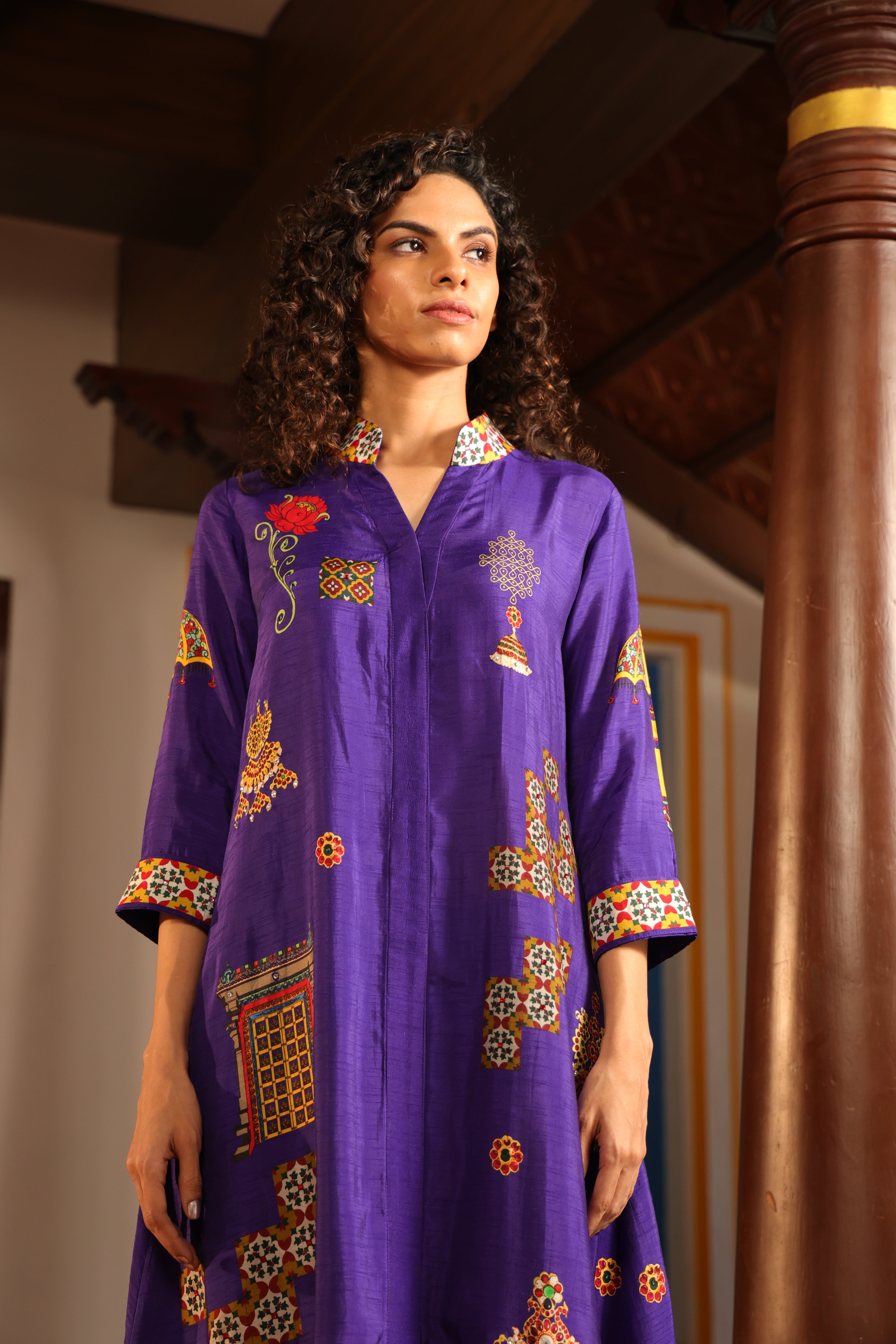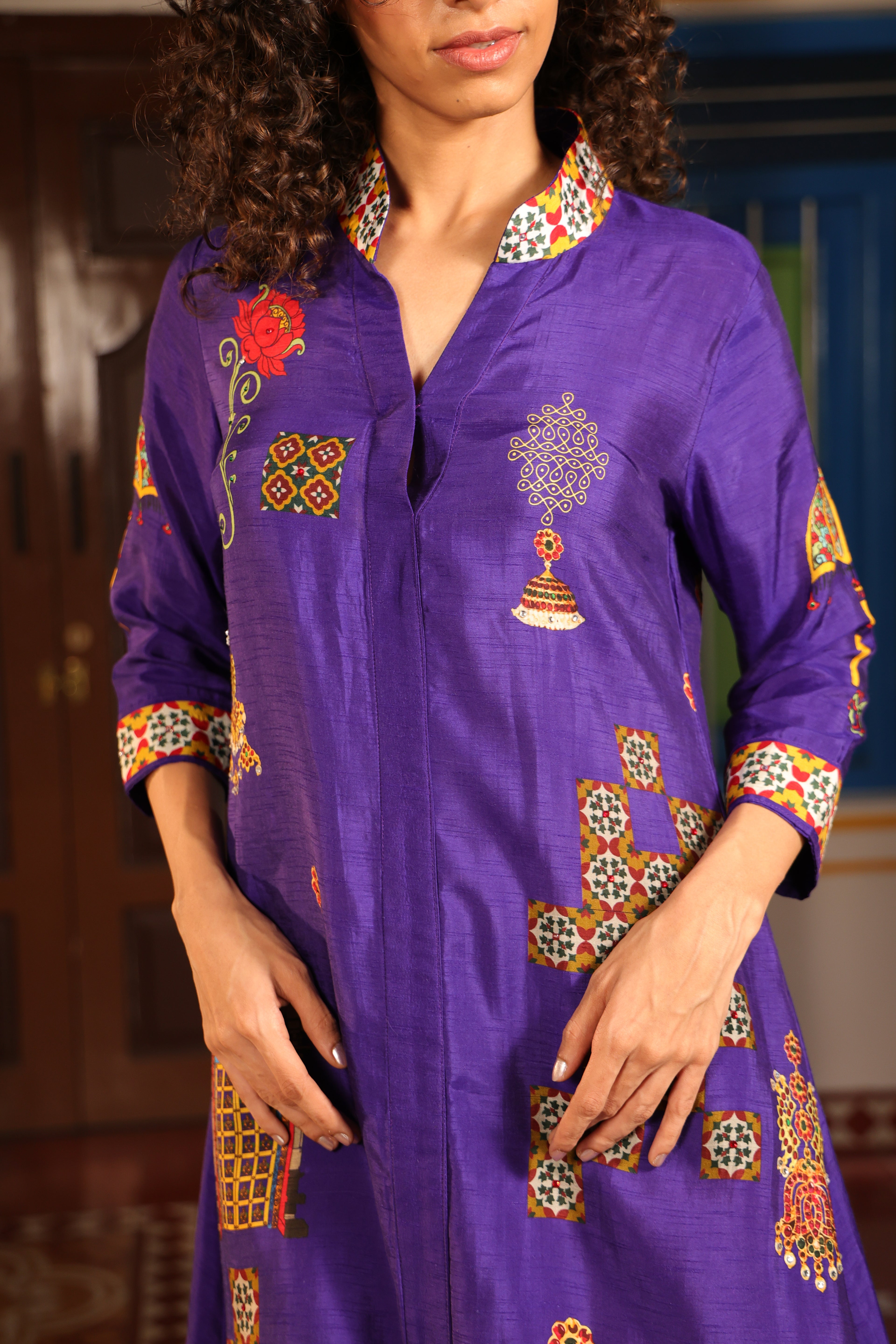 Shirt dress with collar, front open 3/4 sleeves with chettinad architechture and jewellery print embellished with stone embroidery.