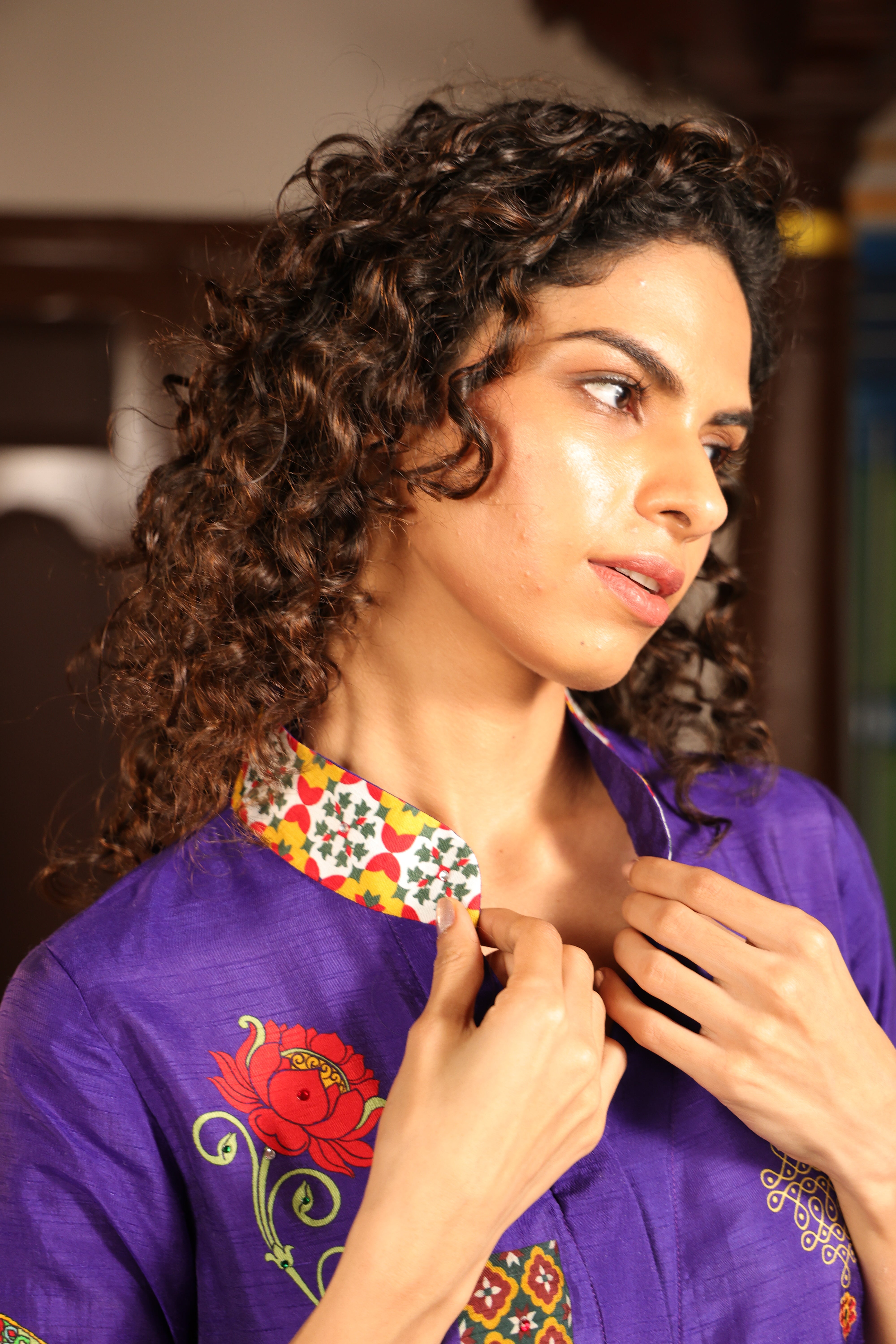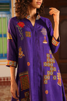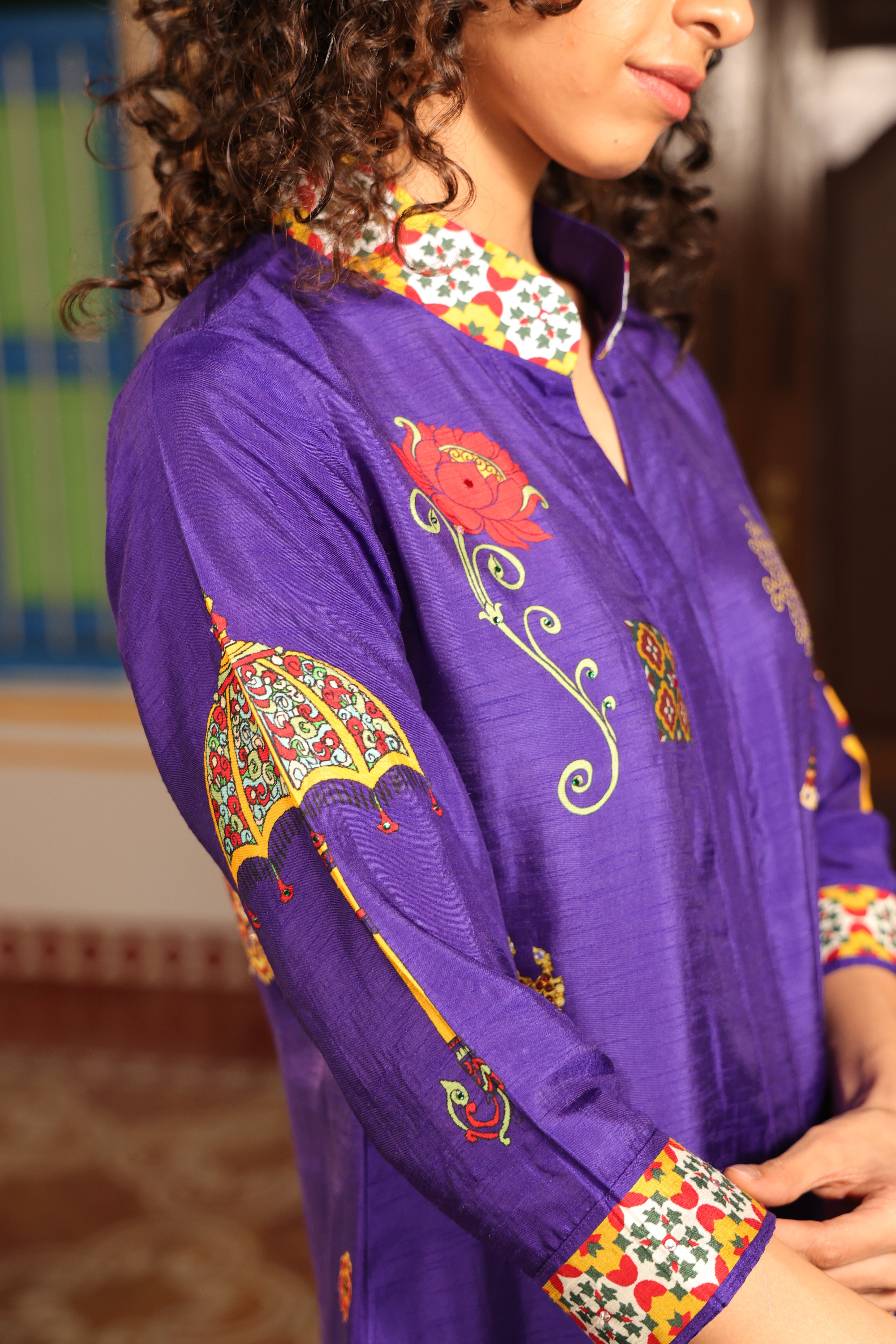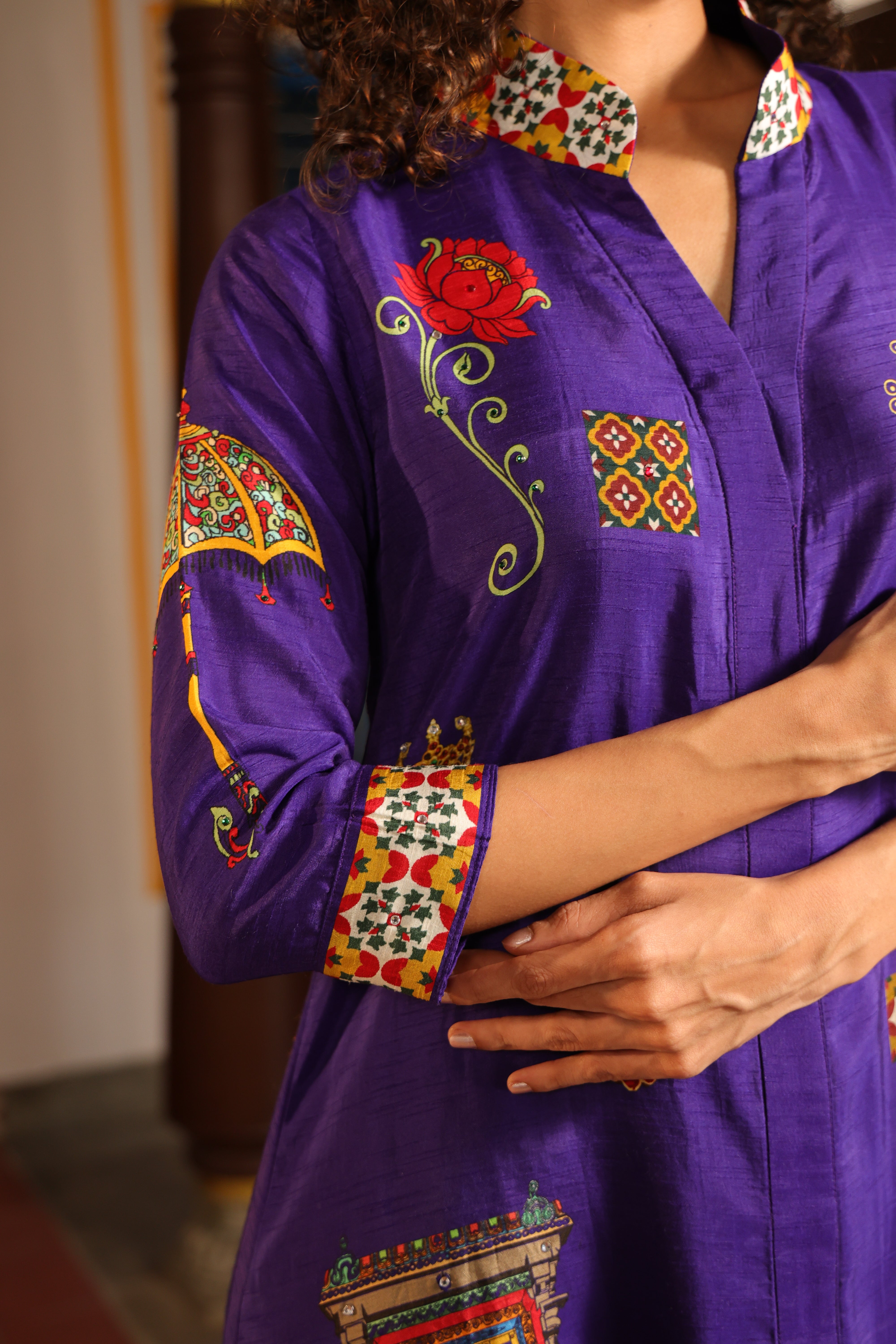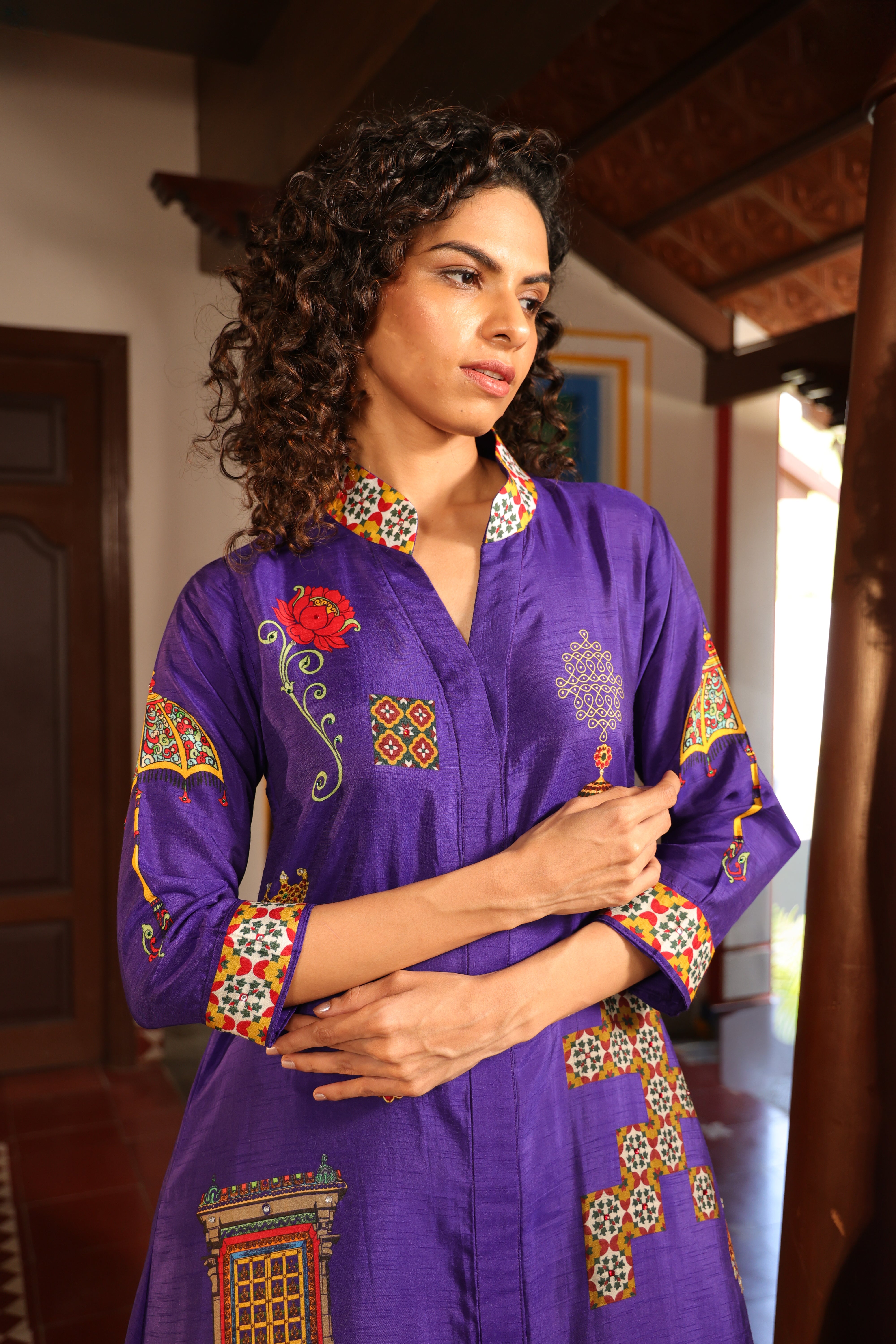 Shirt dress with collar, front open 3/4 sleeves with chettinad architechture and jewellery print embellished with stone embroidery.