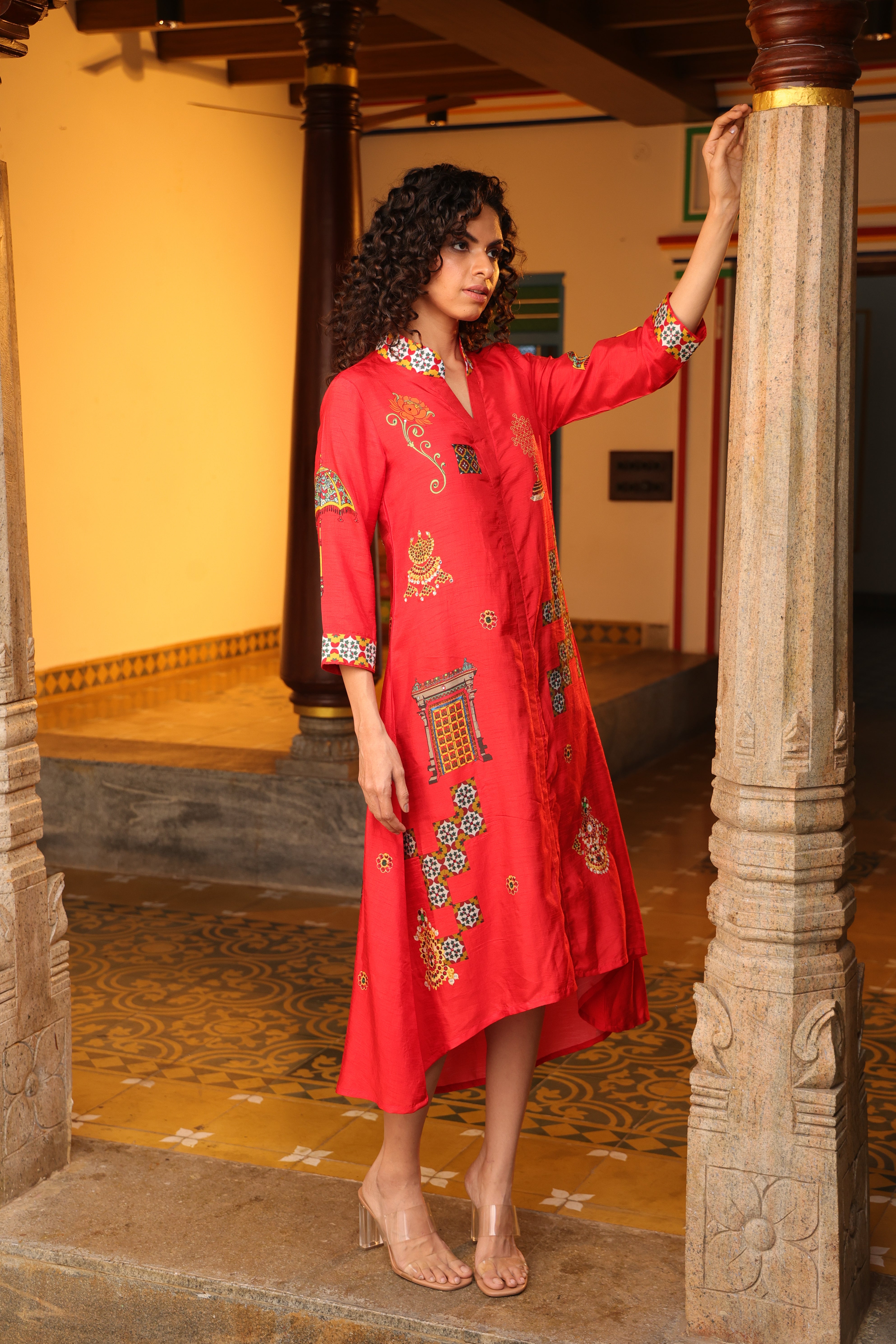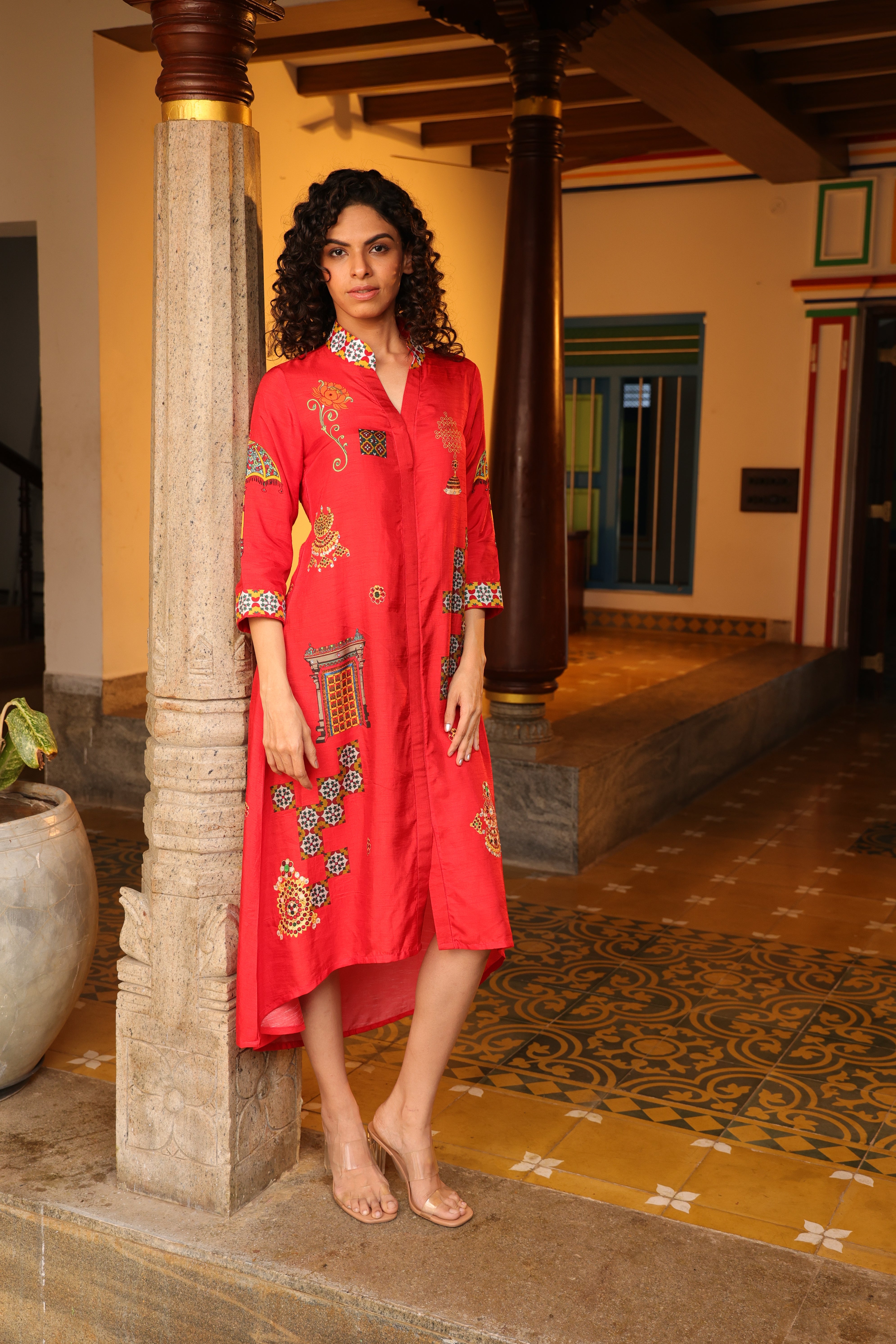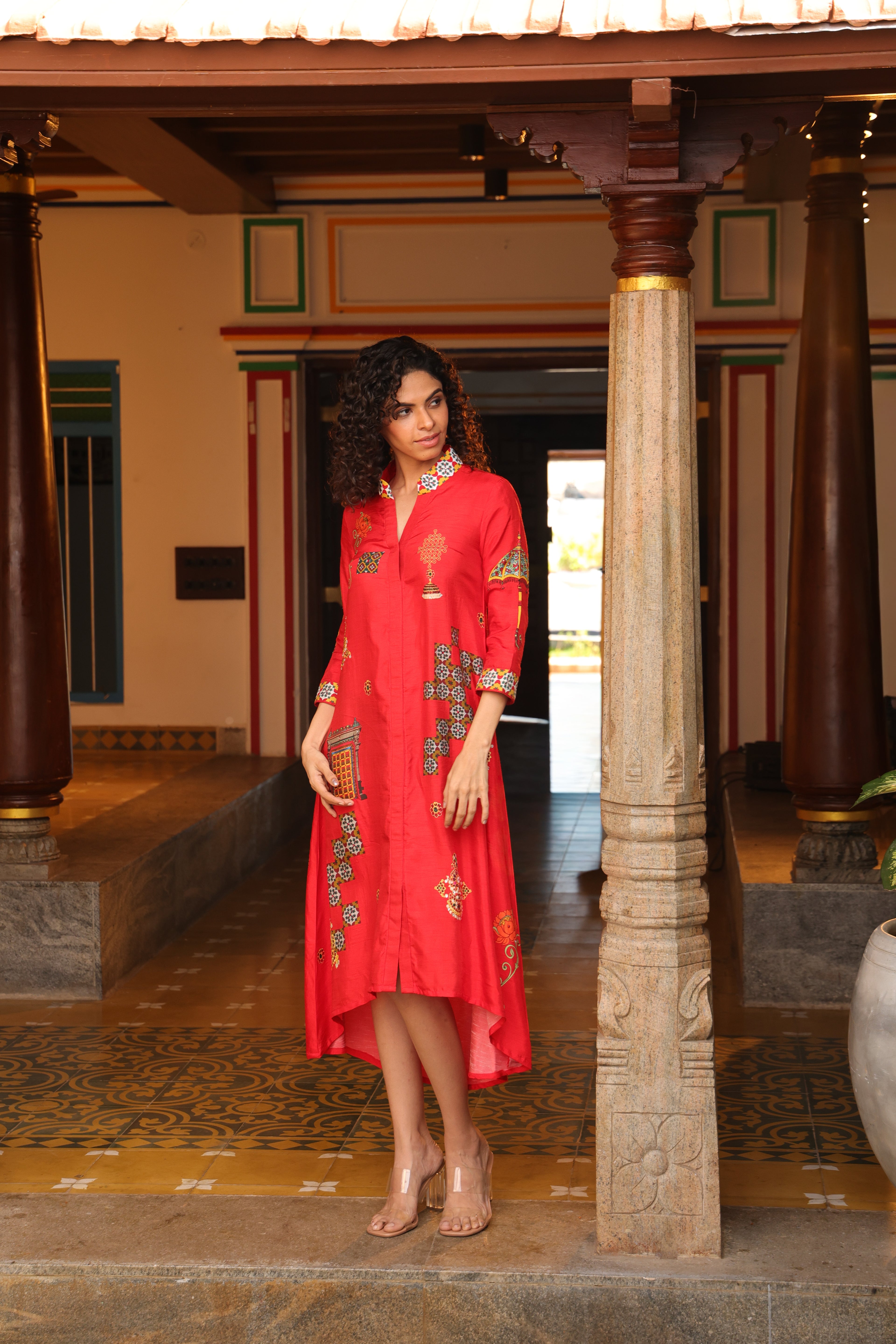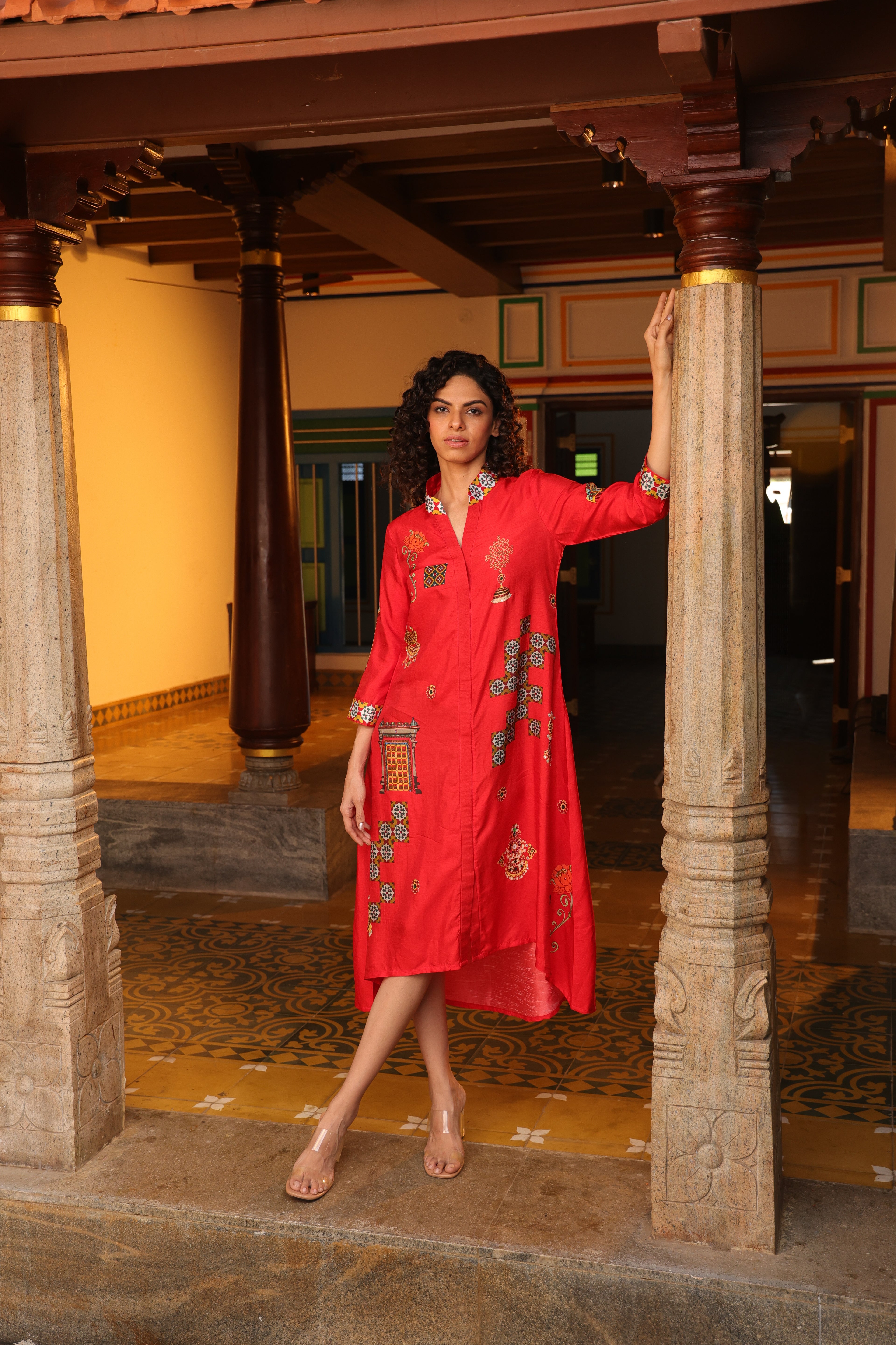 Shirt dress with collar, front open 3/4 sleeves with chettinad architechture and jewellery print embellished with stone embroidery.