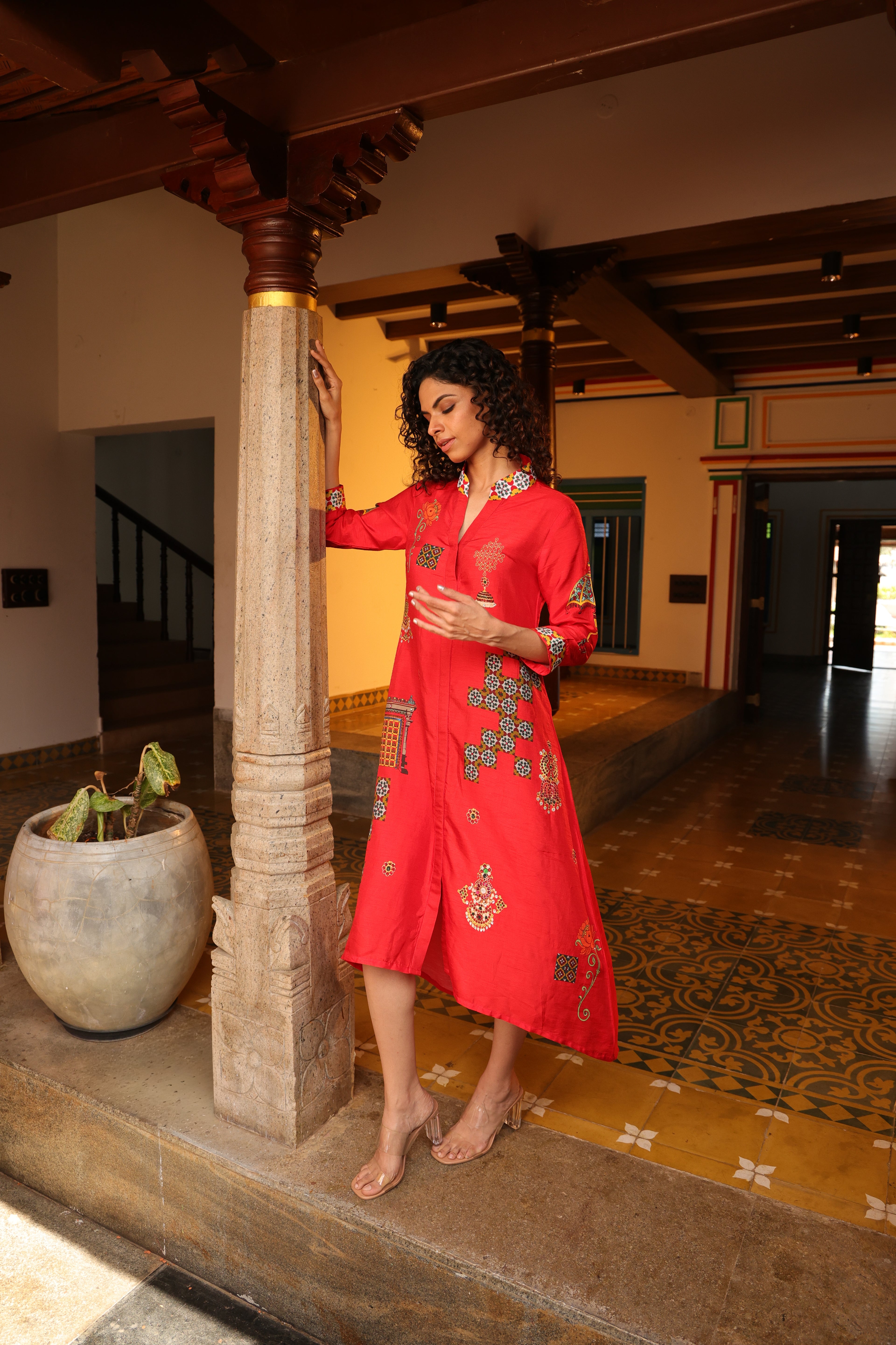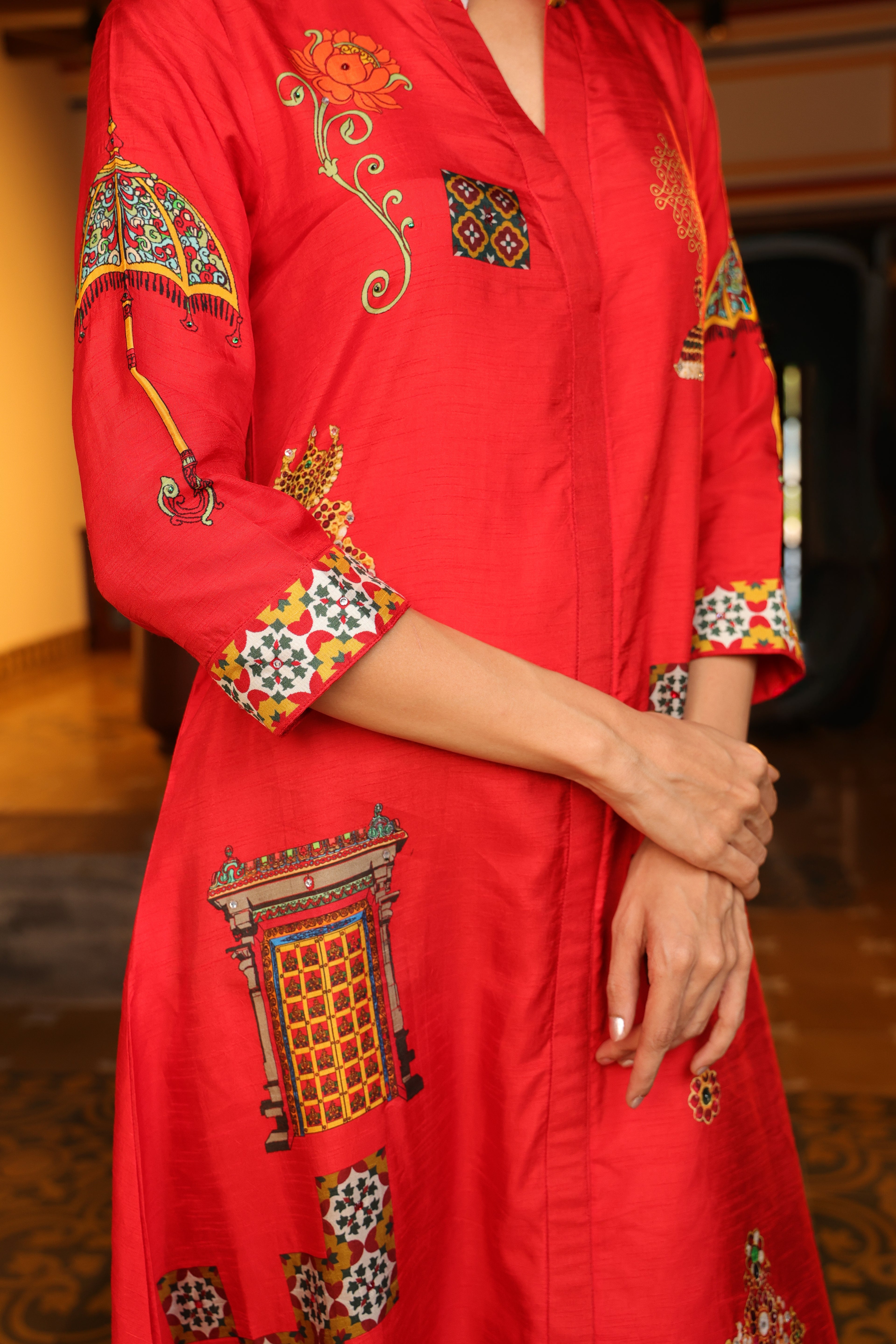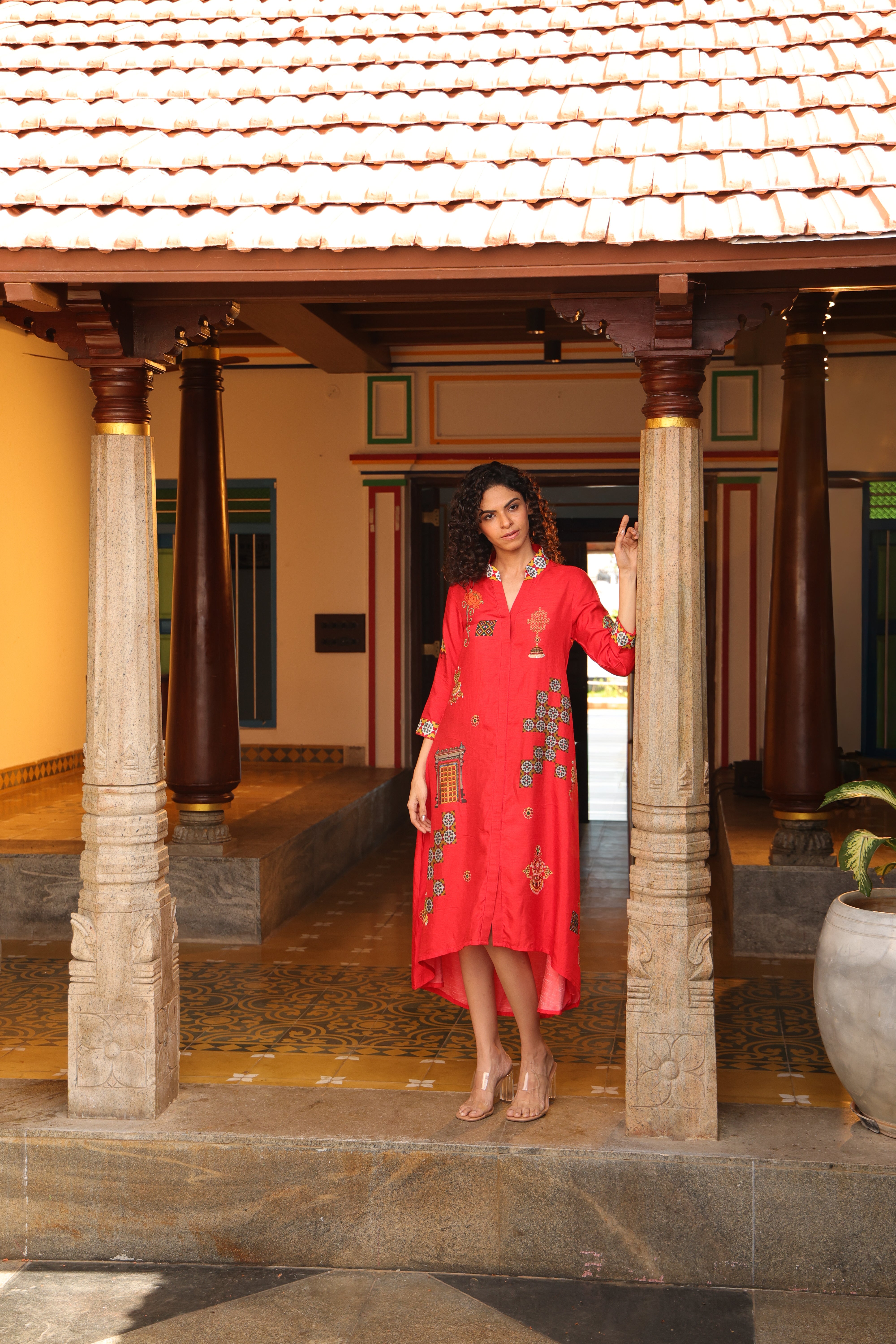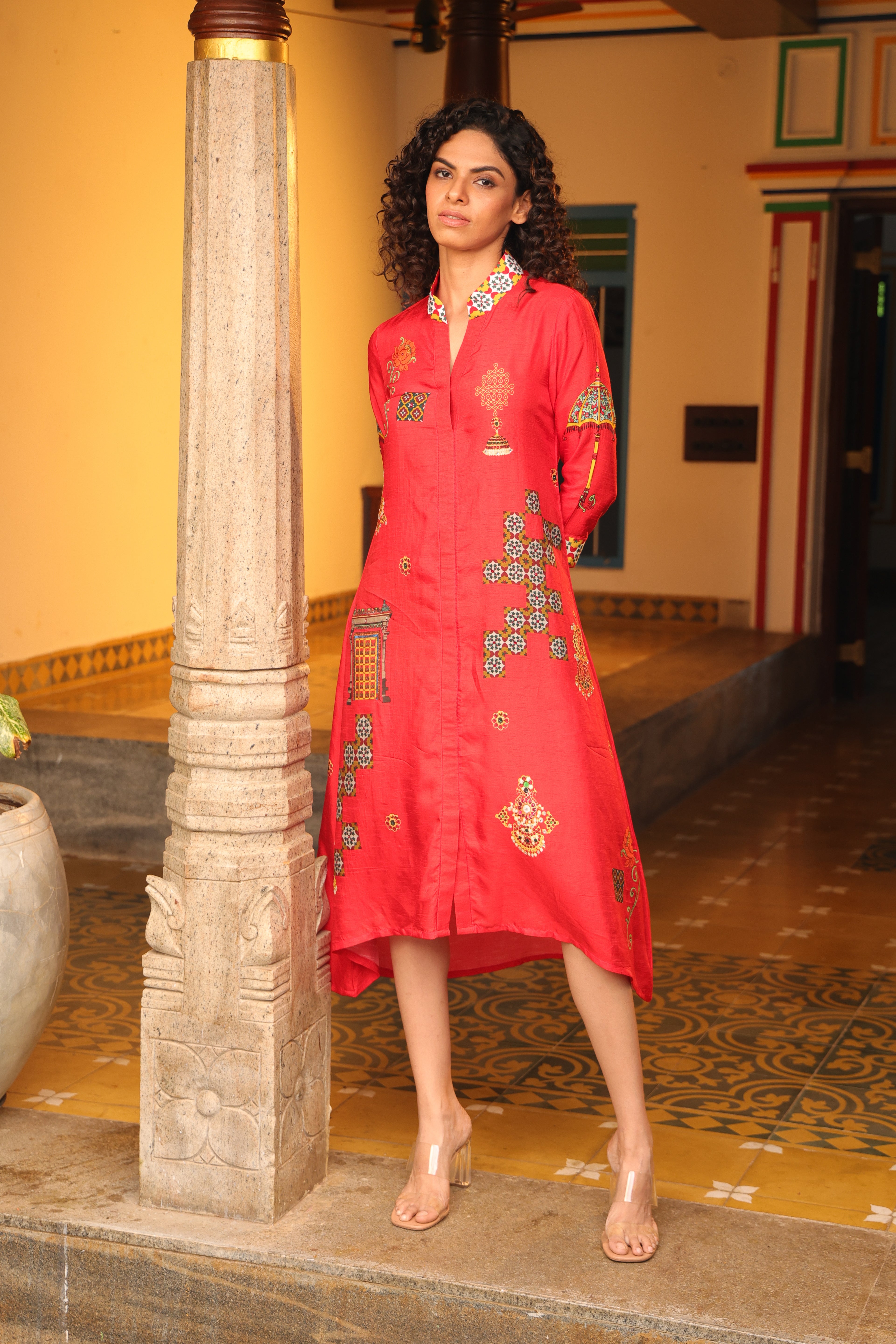 Shirt dress with collar, front open 3/4 sleeves with chettinad architechture and jewellery print embellished with stone embroidery.