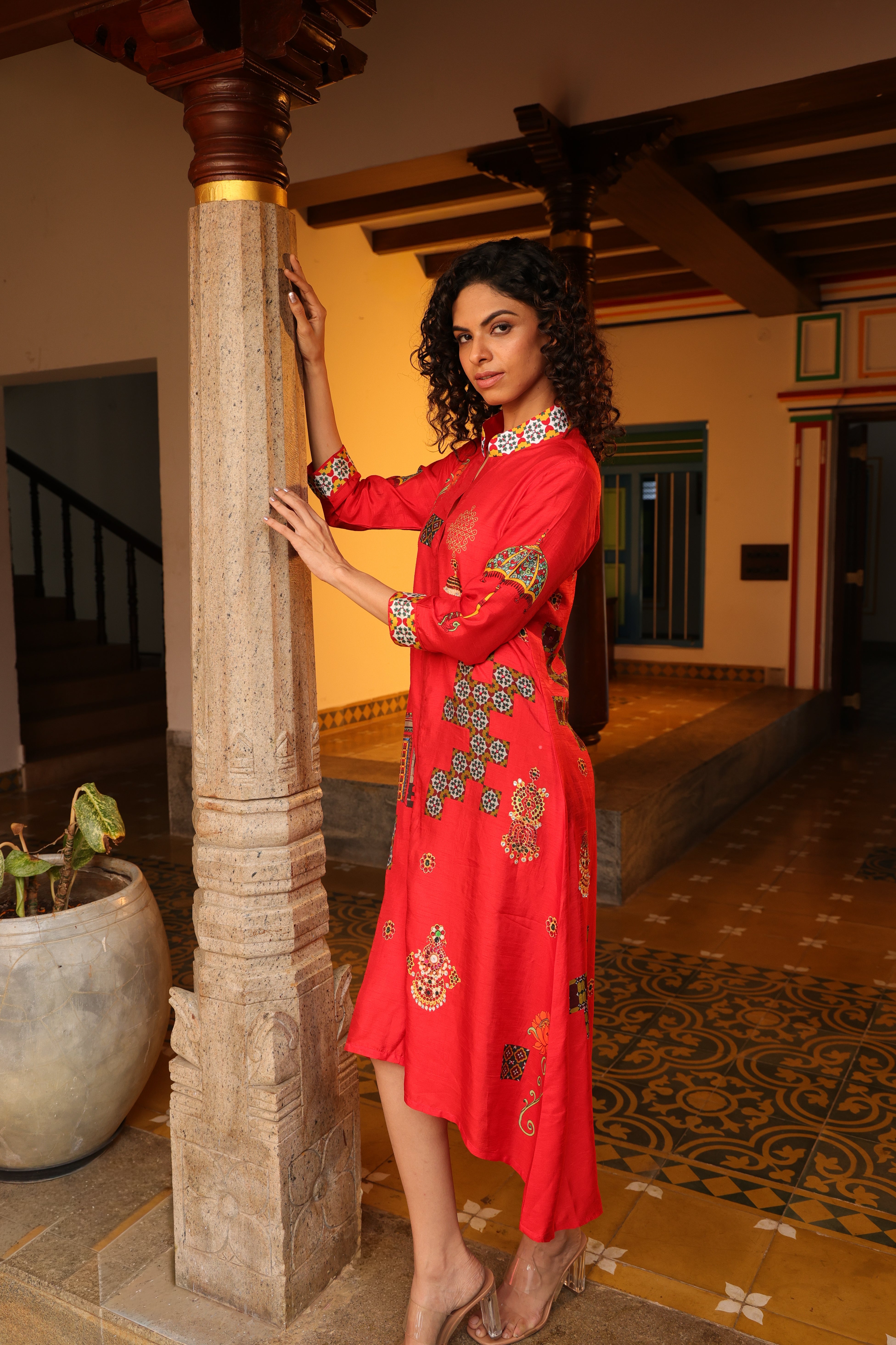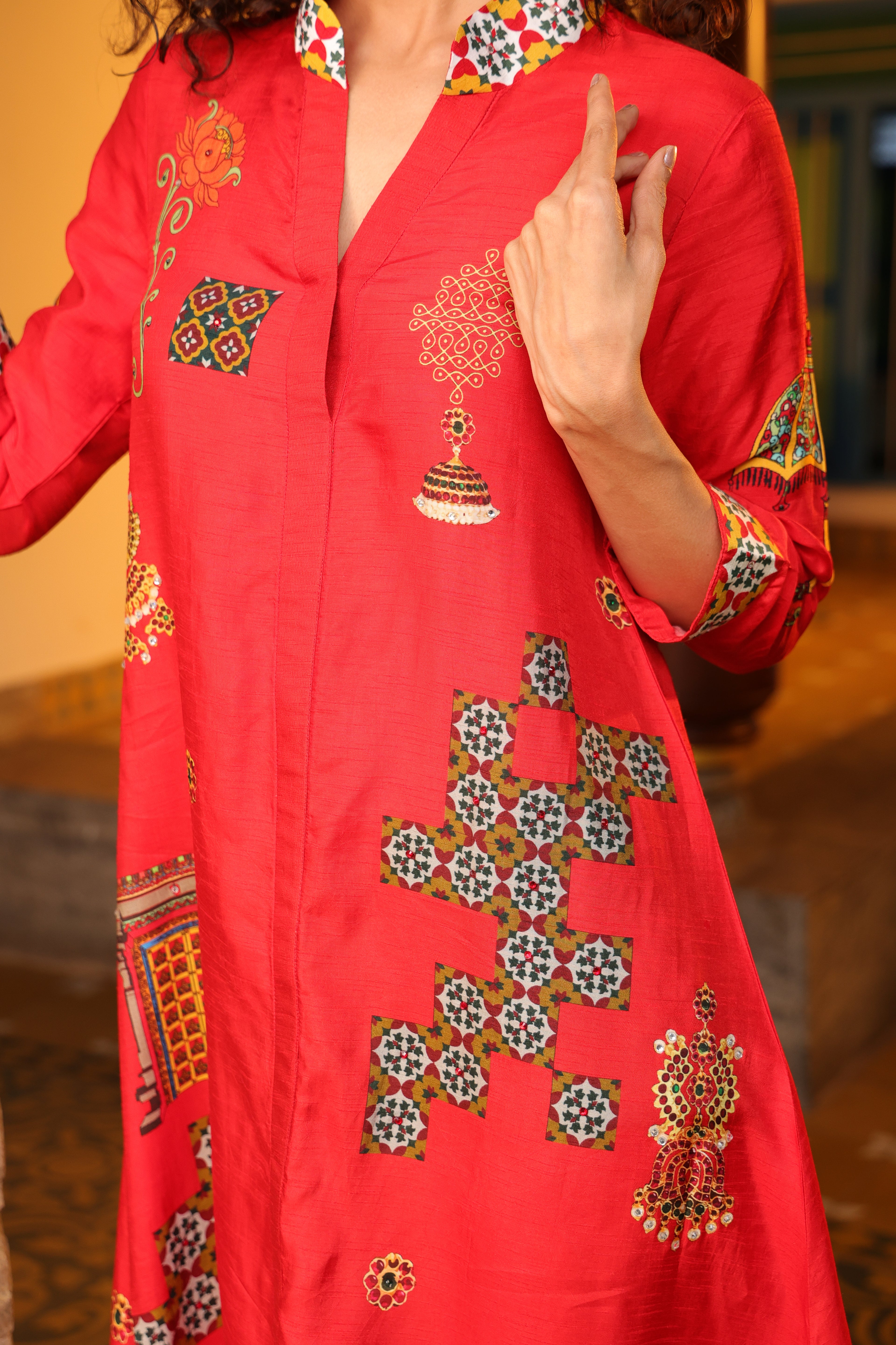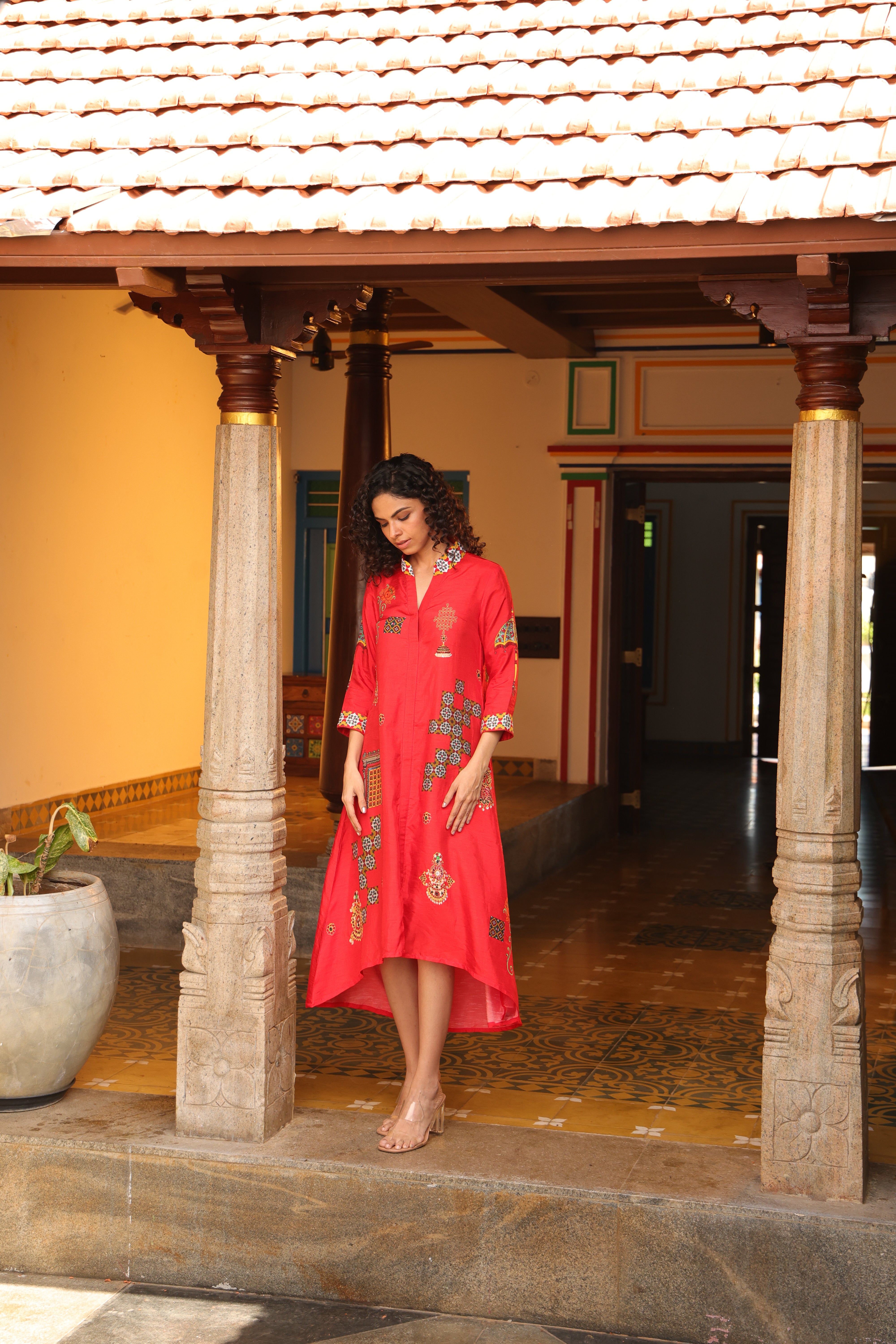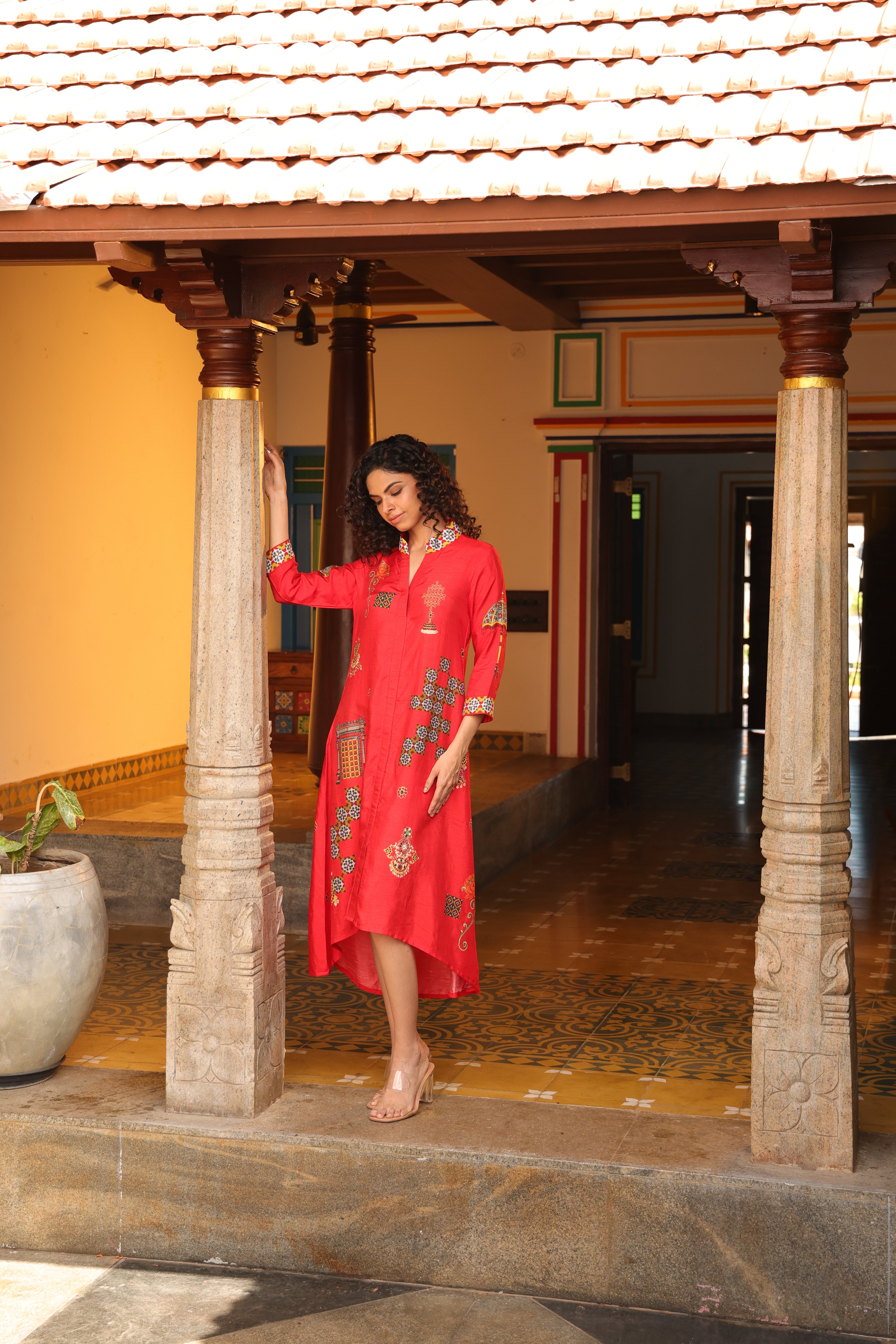 Shirt dress with collar, front open 3/4 sleeves with chettinad architechture and jewellery print embellished with stone embroidery.