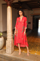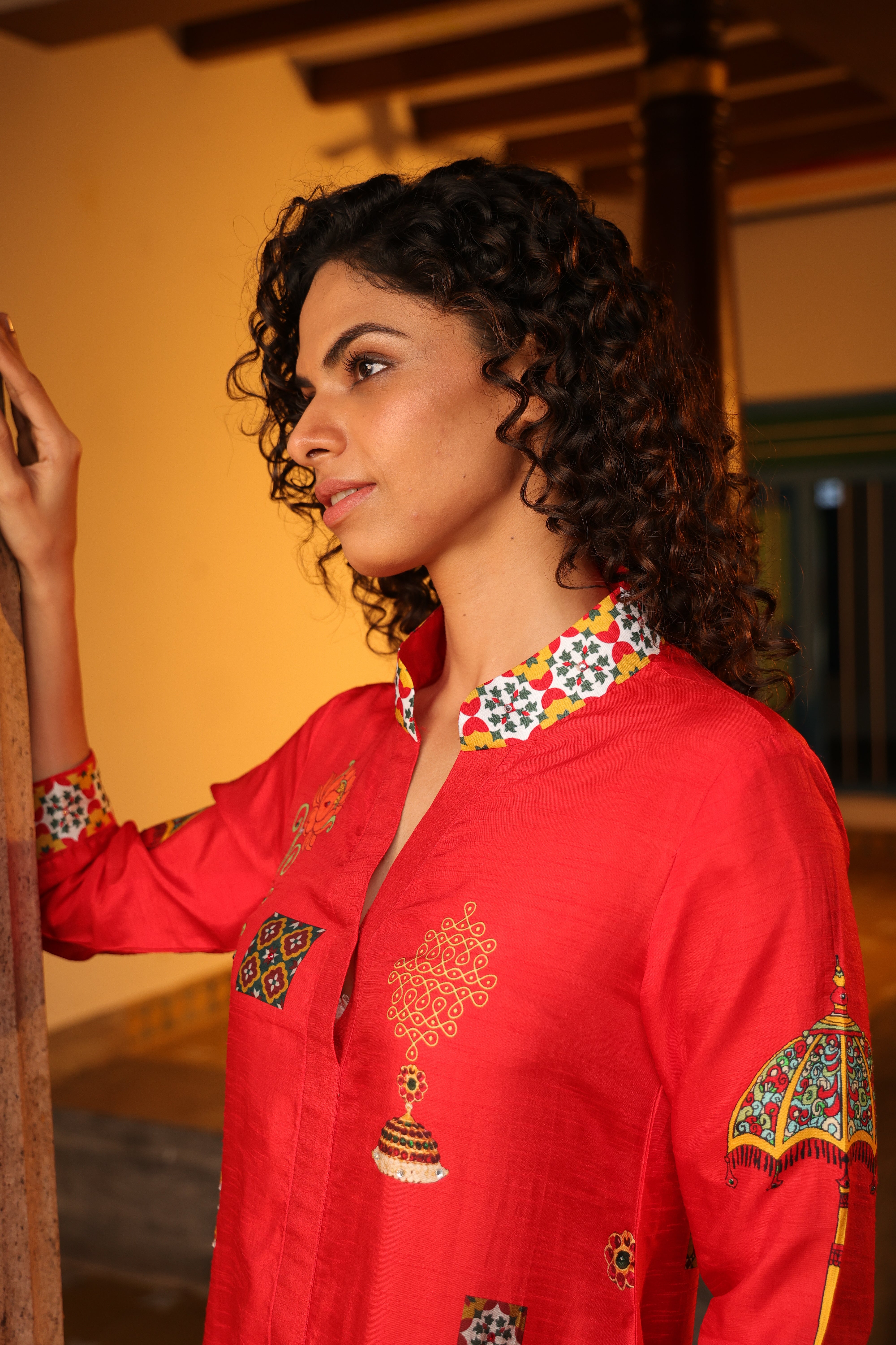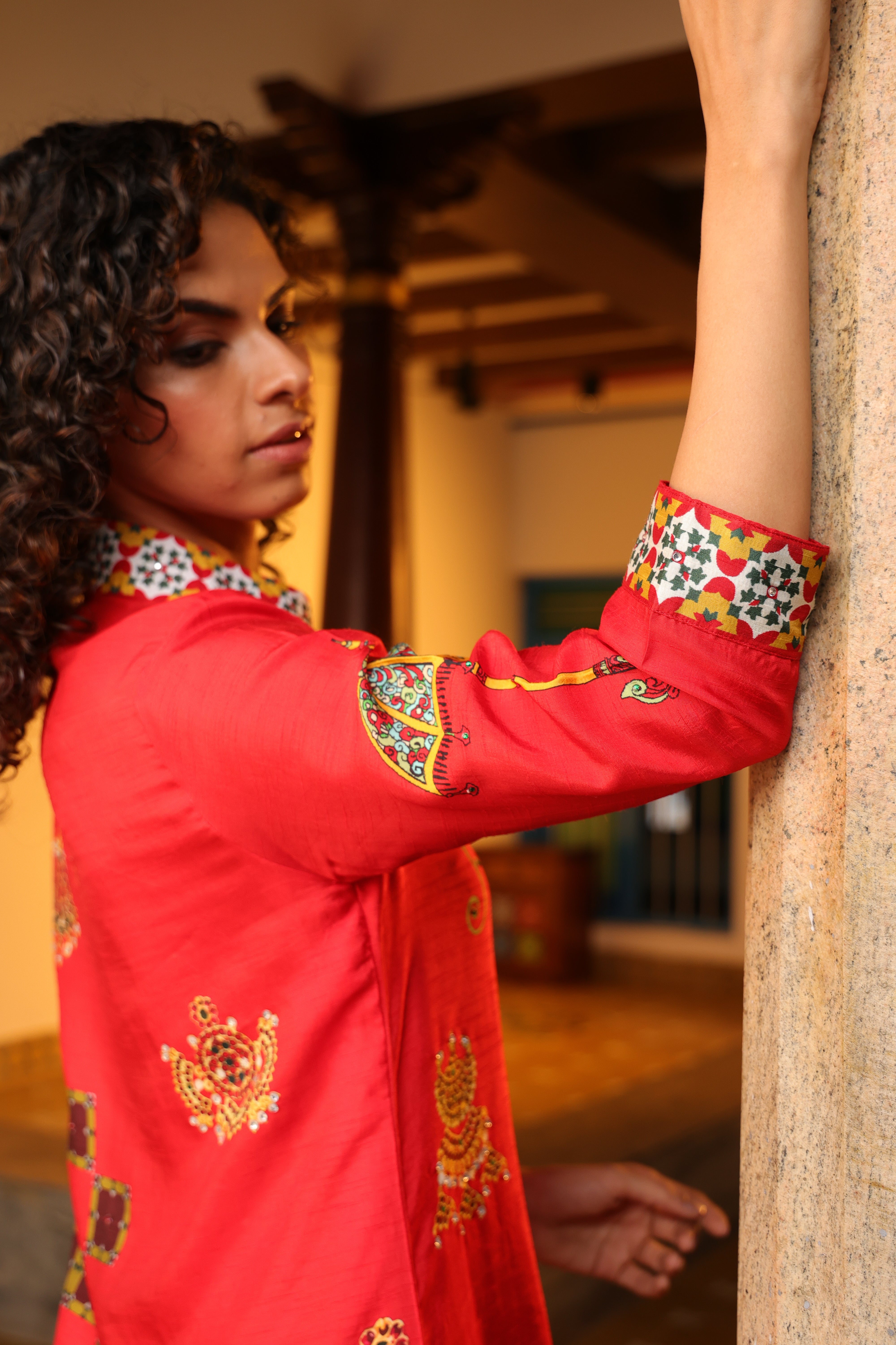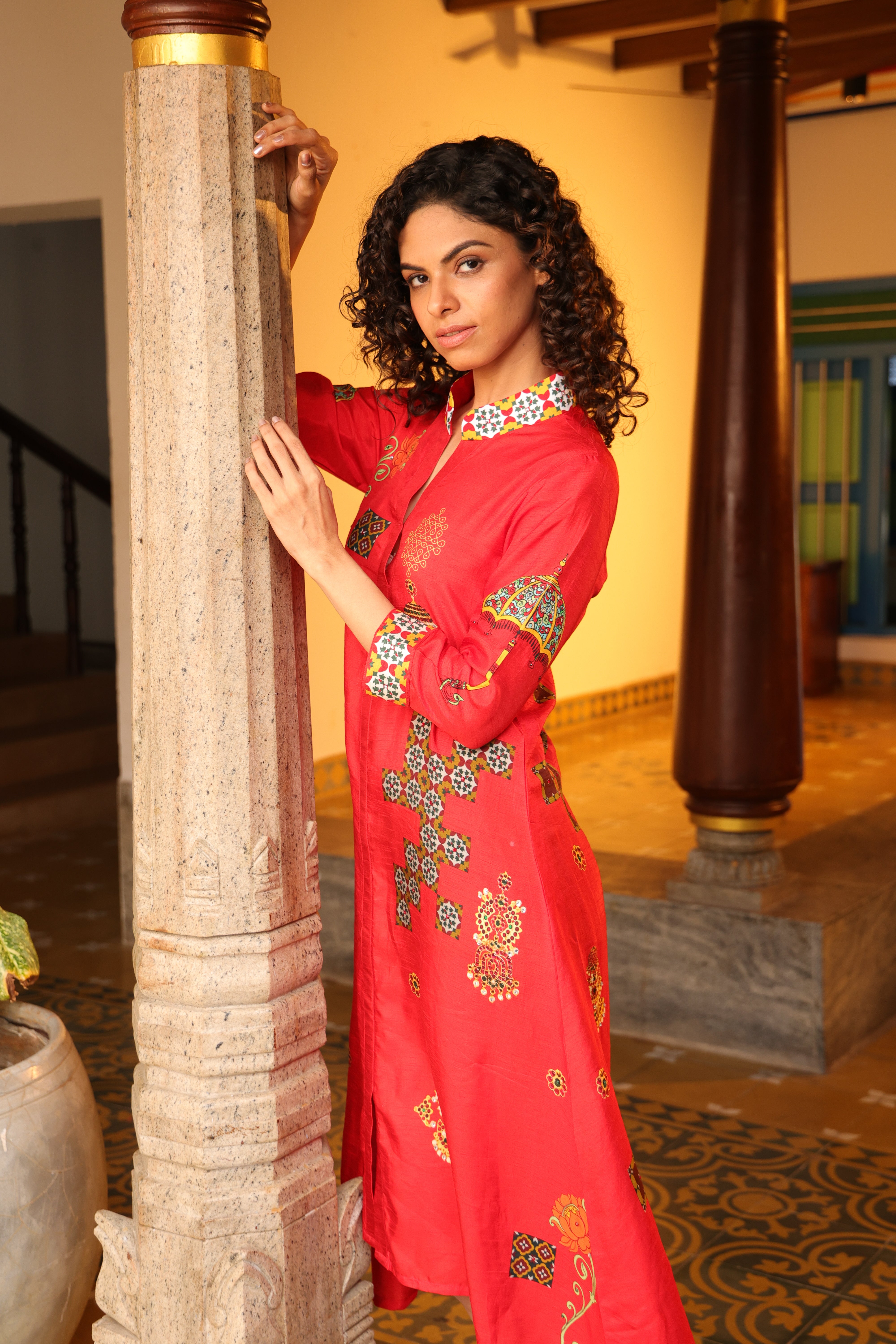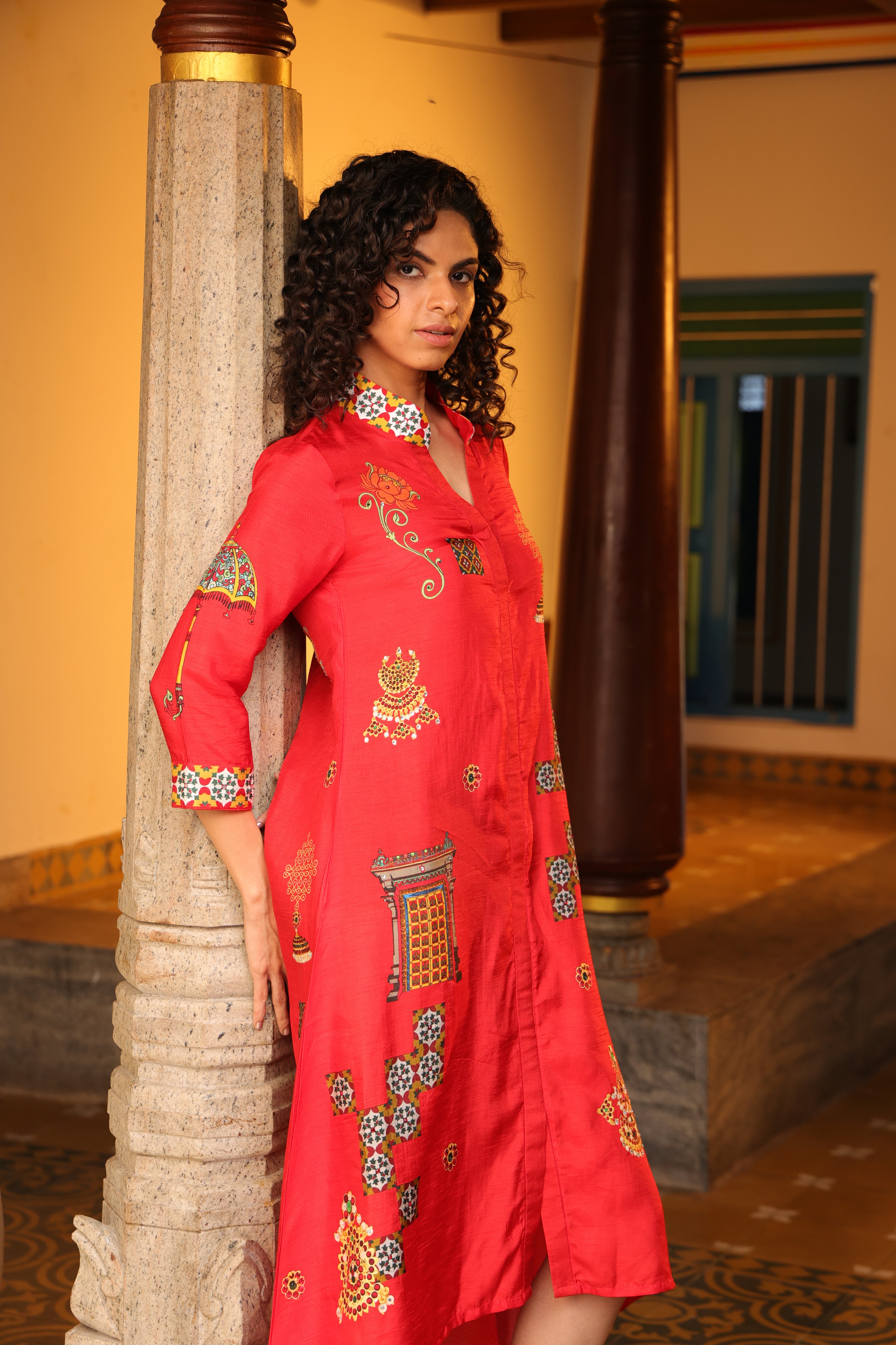 Shirt dress with collar, front open 3/4 sleeves with chettinad architechture and jewellery print embellished with stone embroidery.