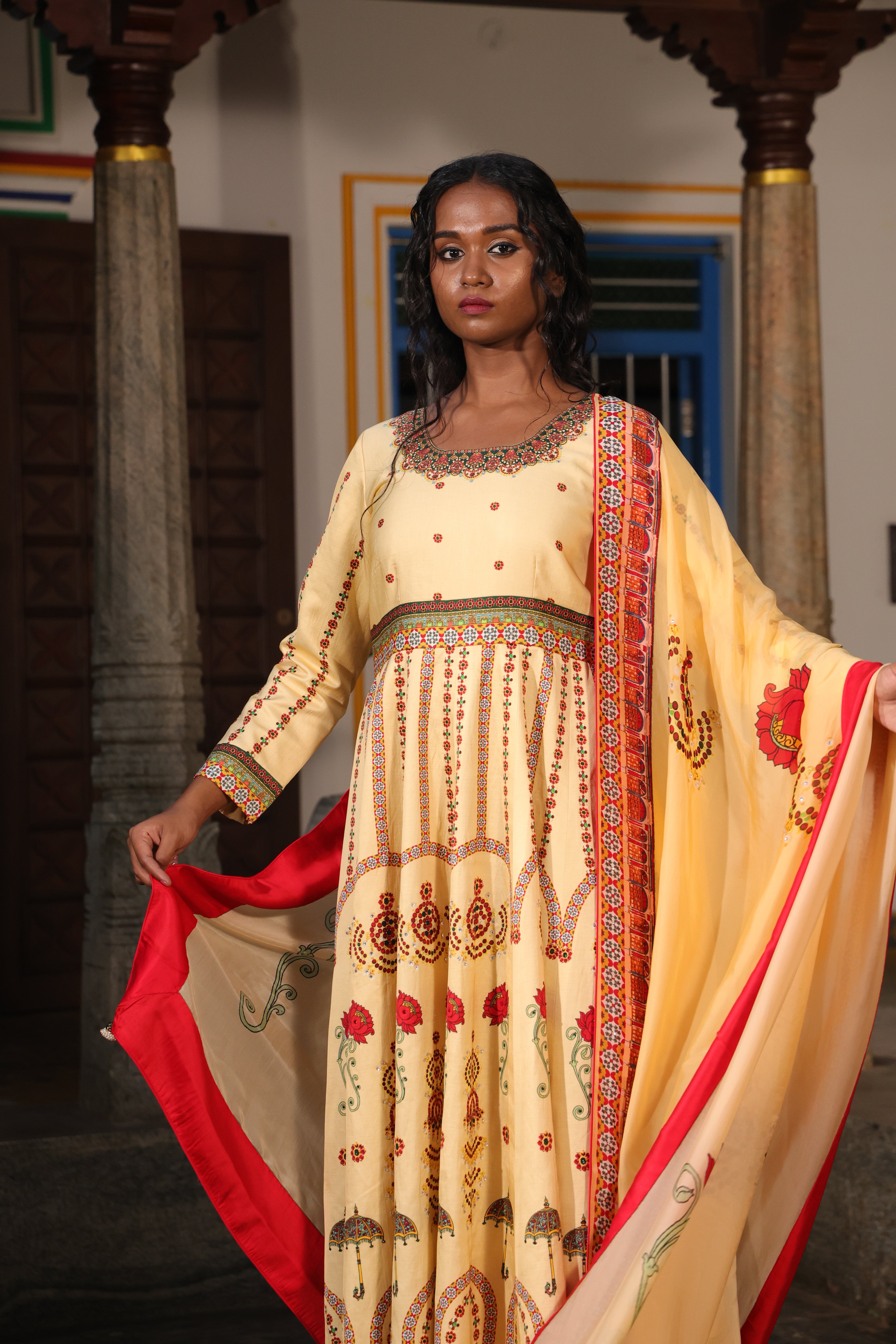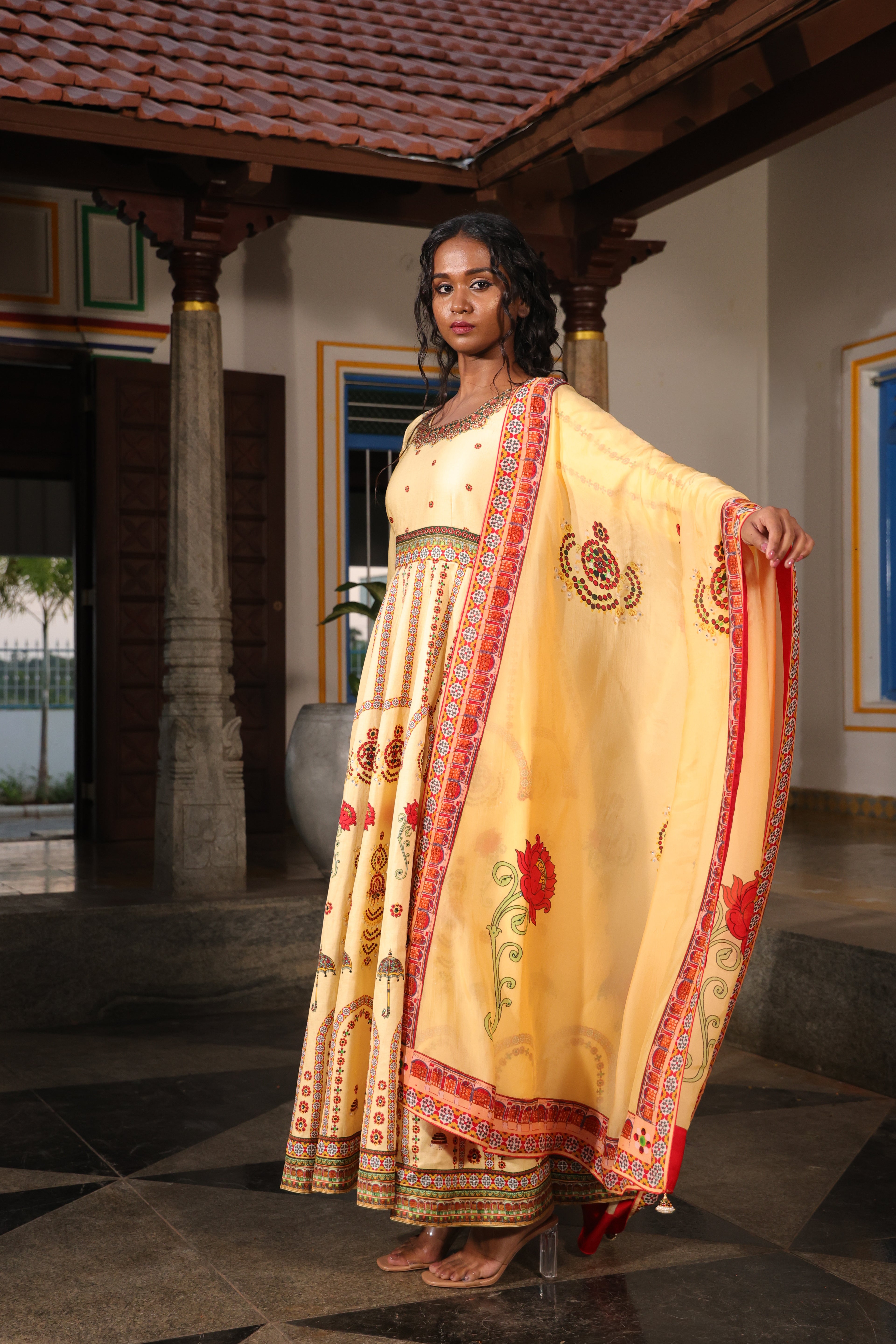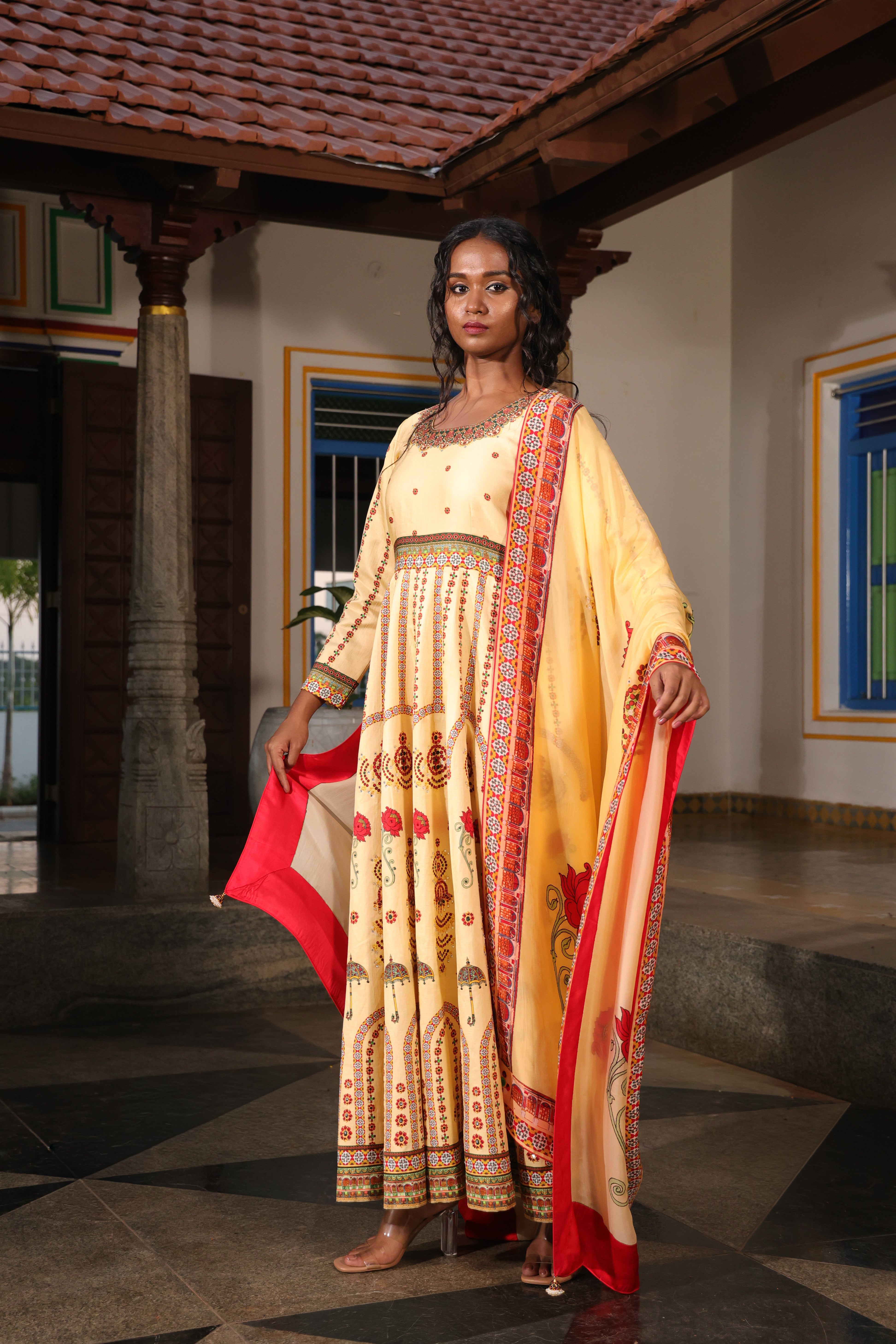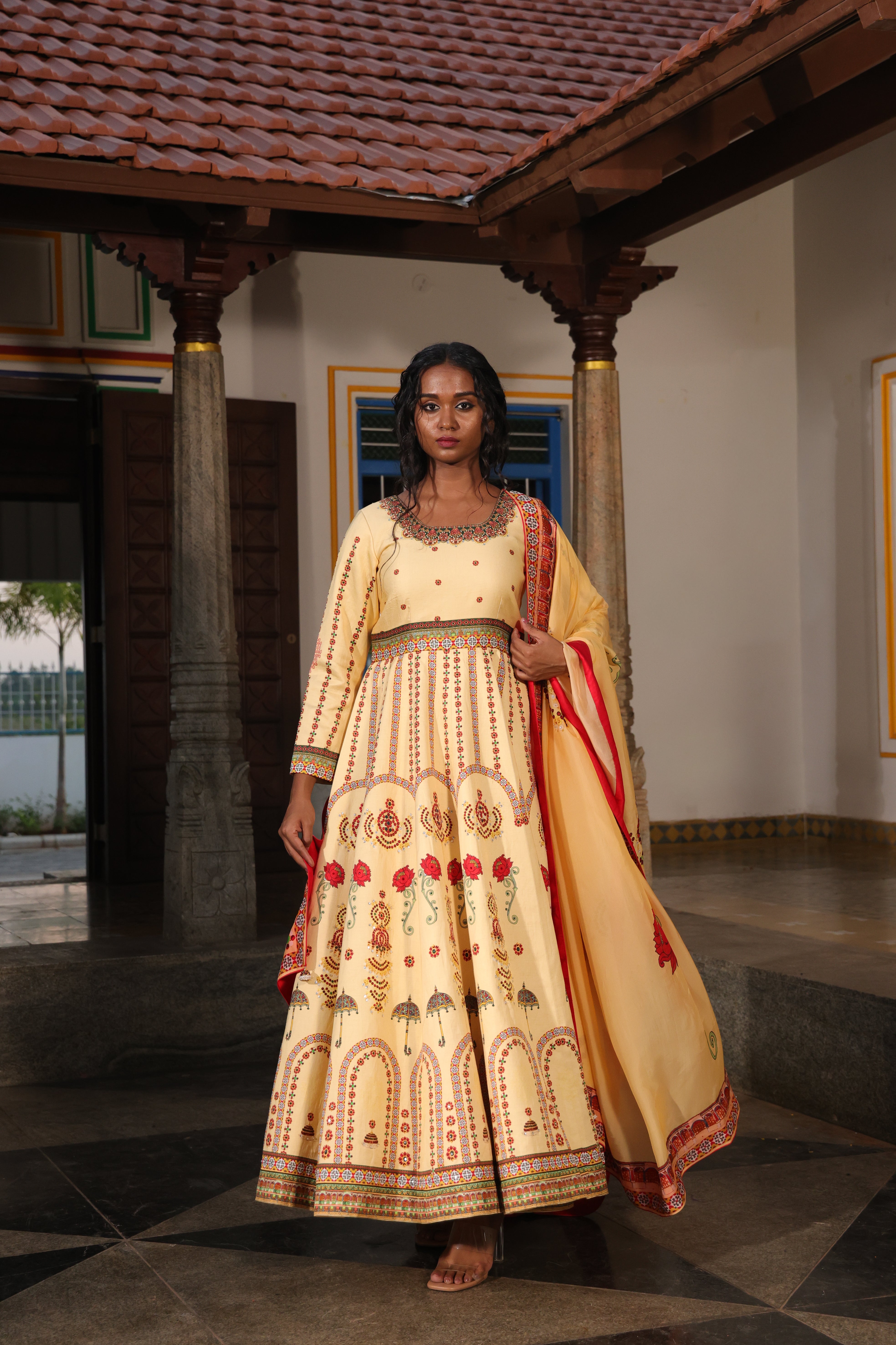 Anarkali with bust joint with chettinad architechture and jewellery print embellished with stone embroidery.