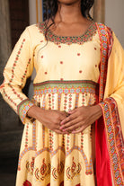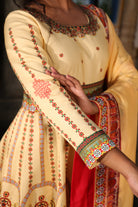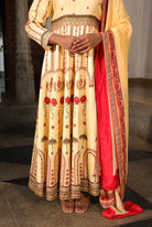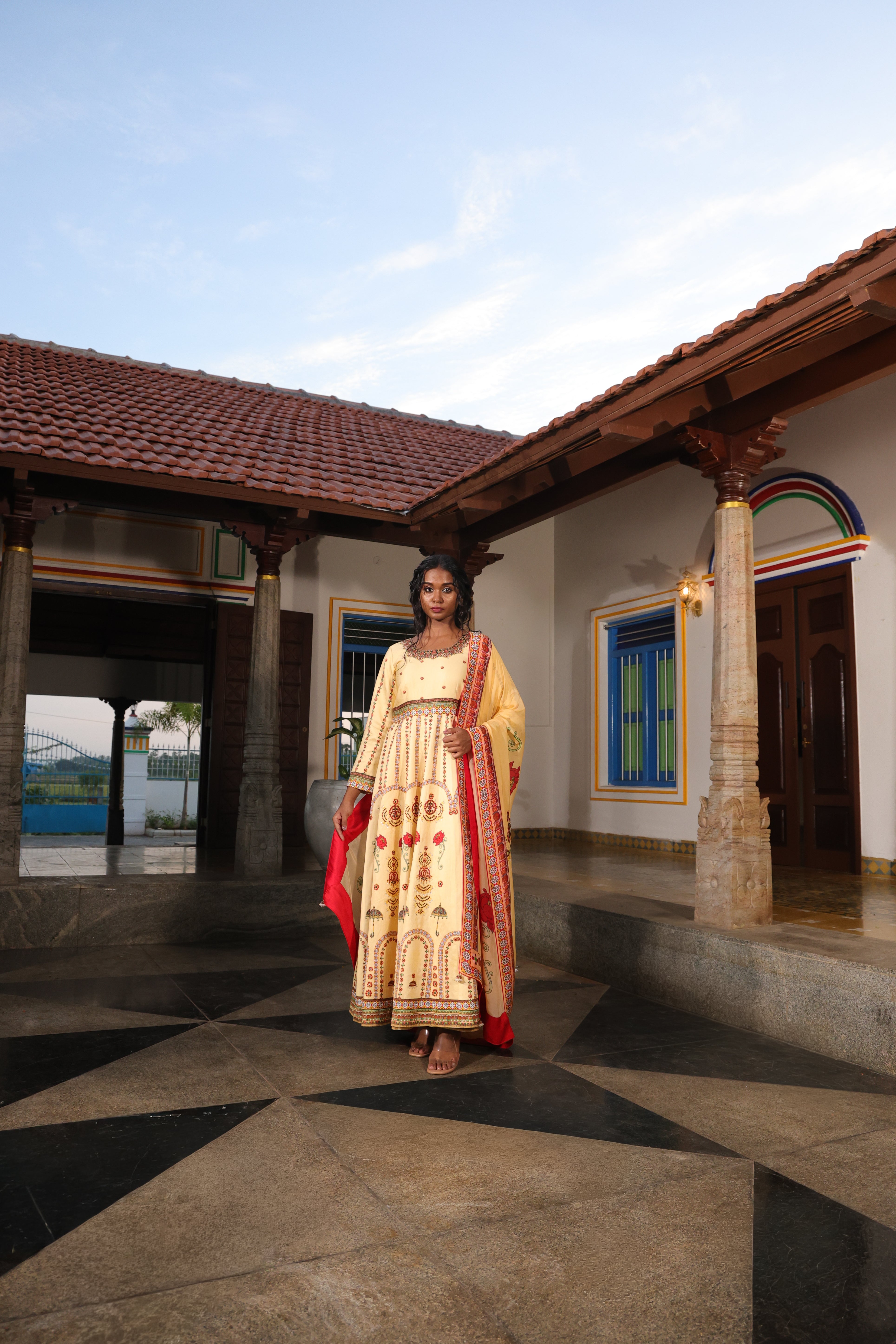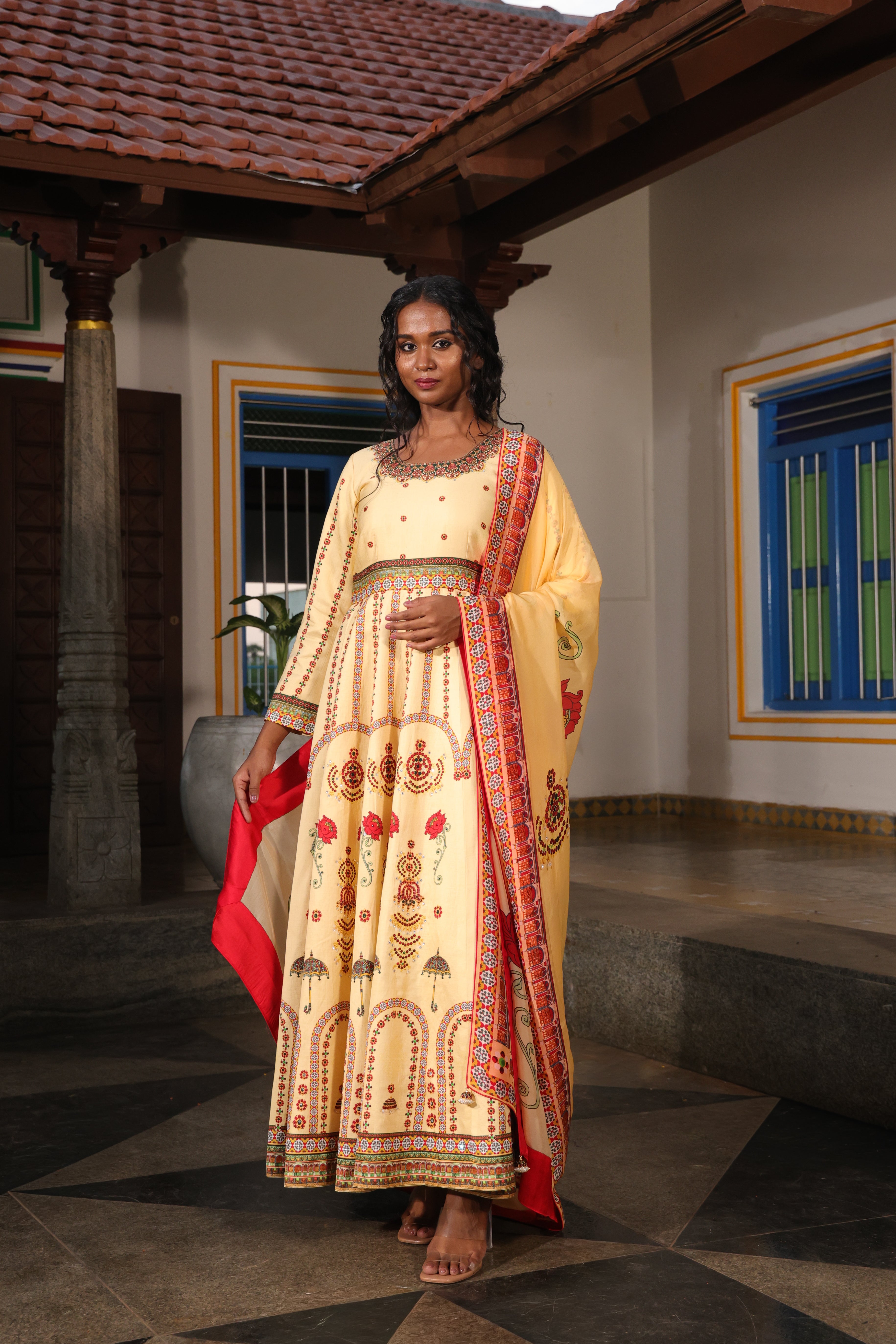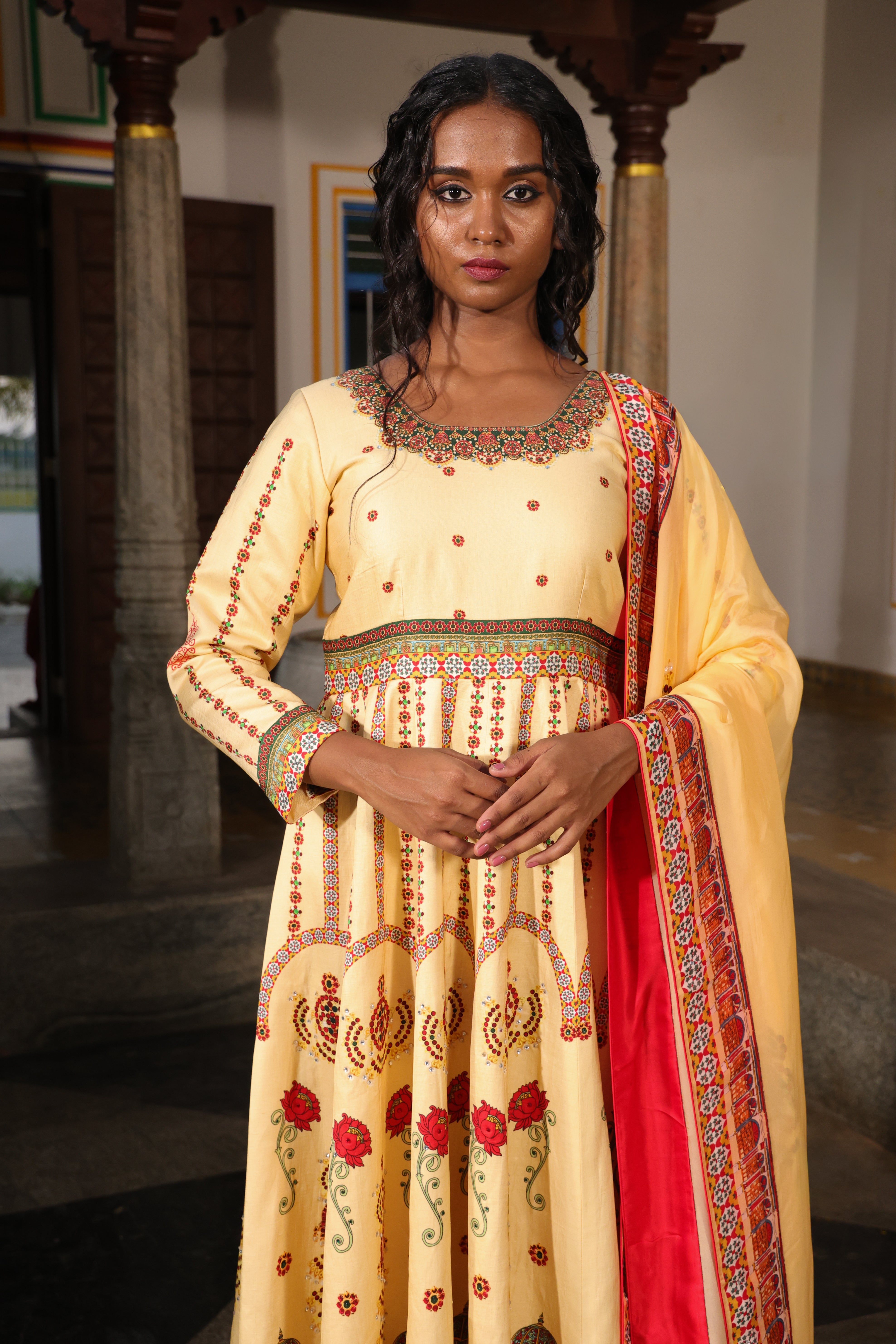 Anarkali with bust joint with chettinad architechture and jewellery print embellished with stone embroidery.