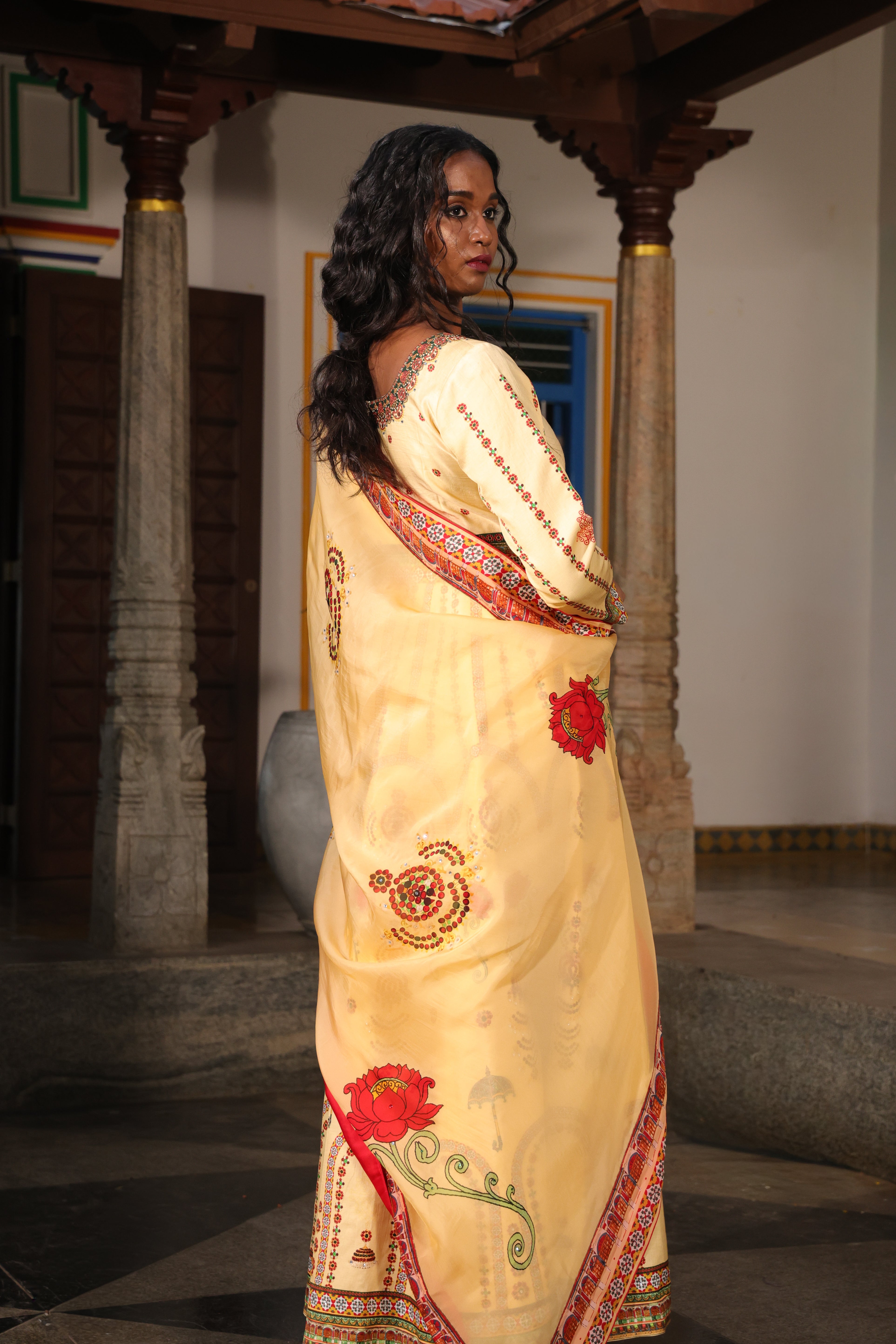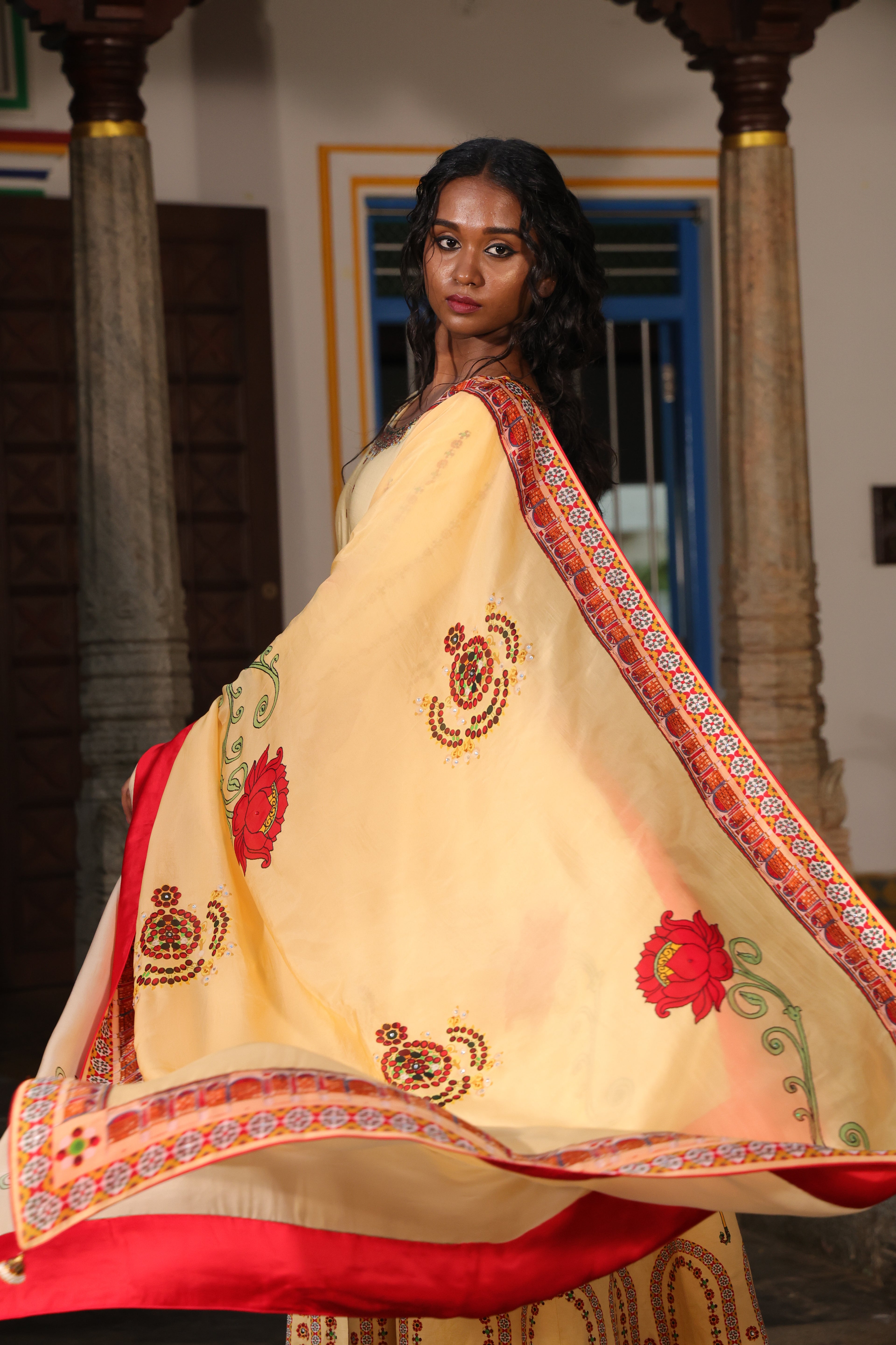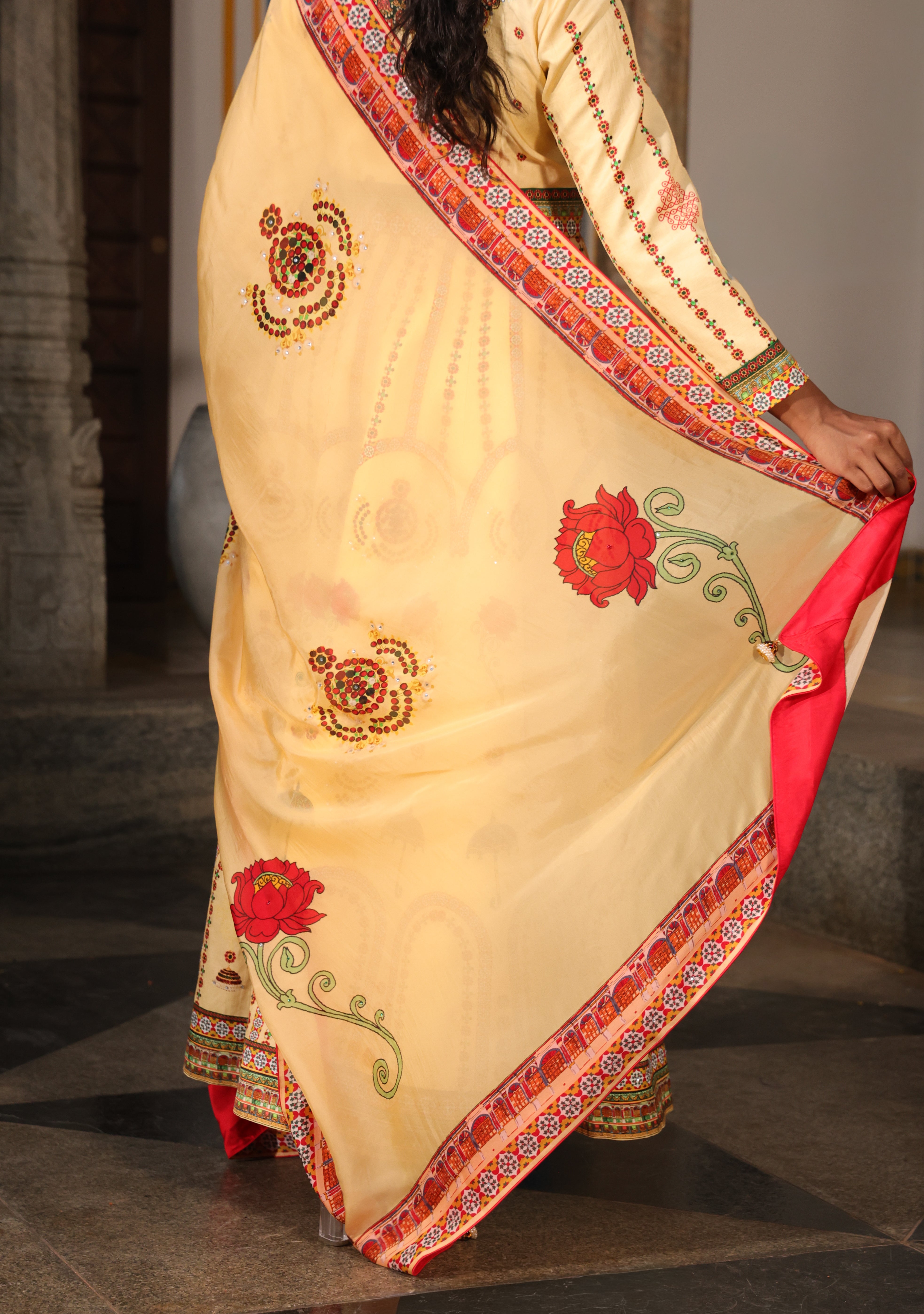 2.5 meter soft organza dupatta with chettinad architechture and jewellery print embellished with stone embroidery.