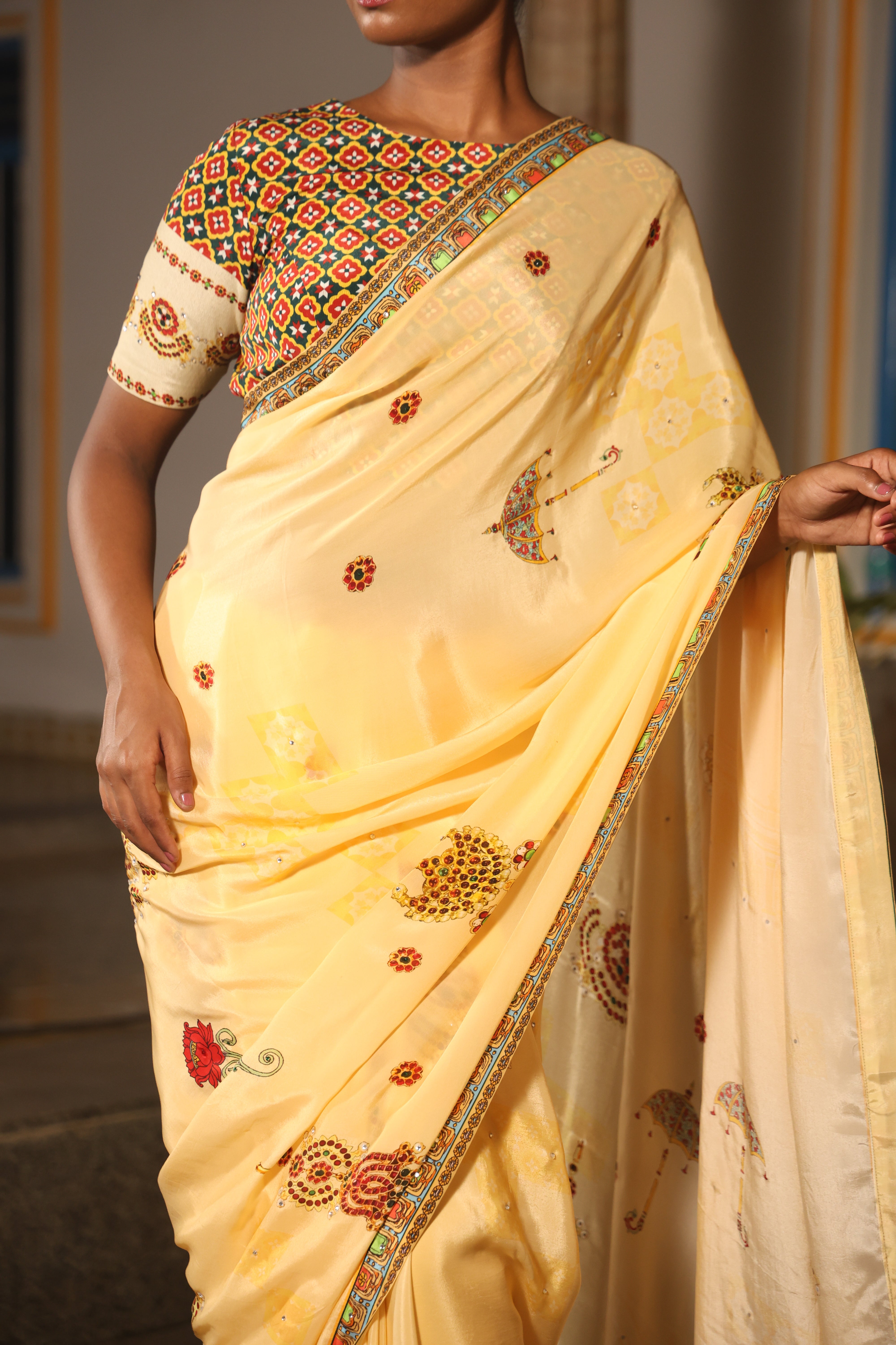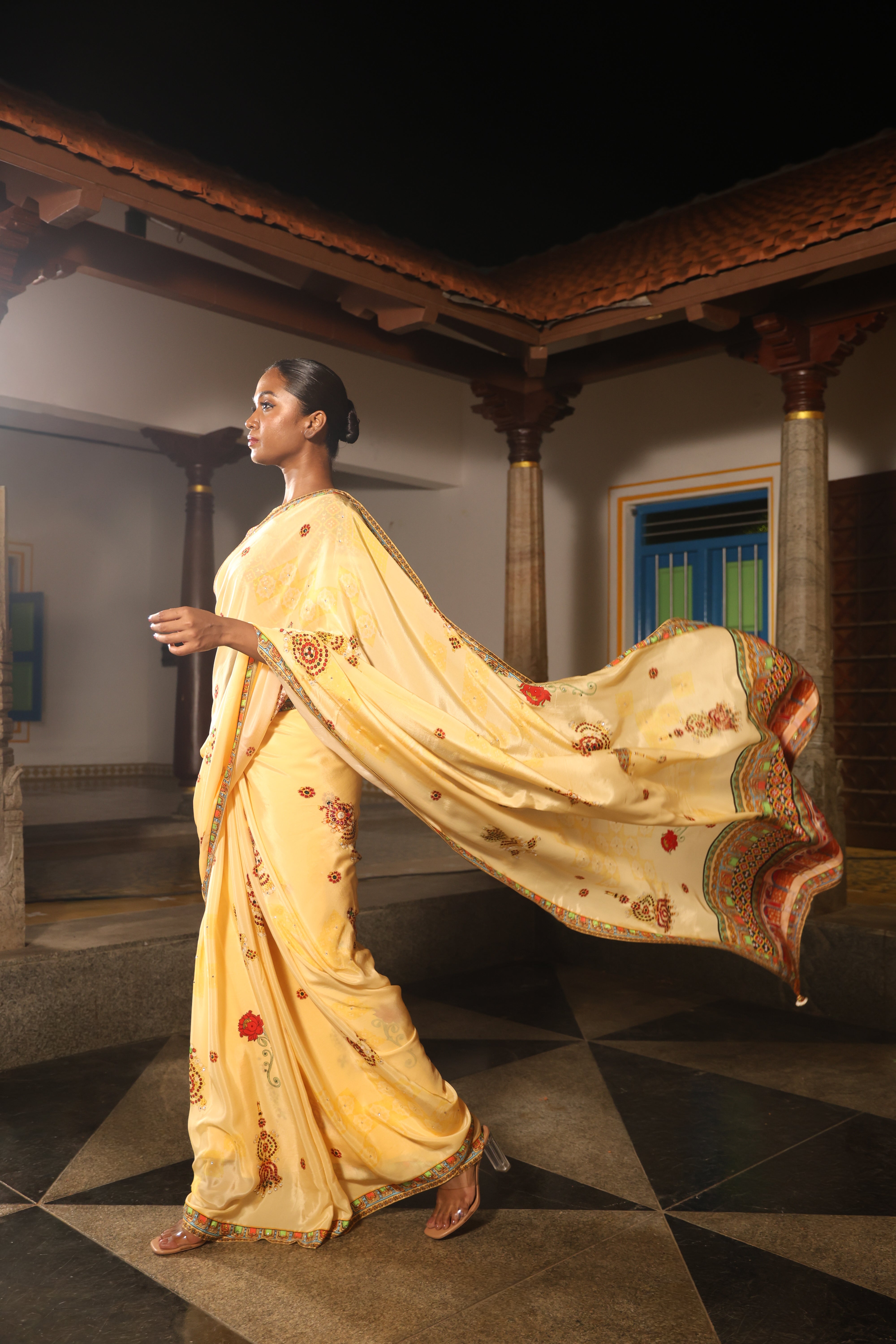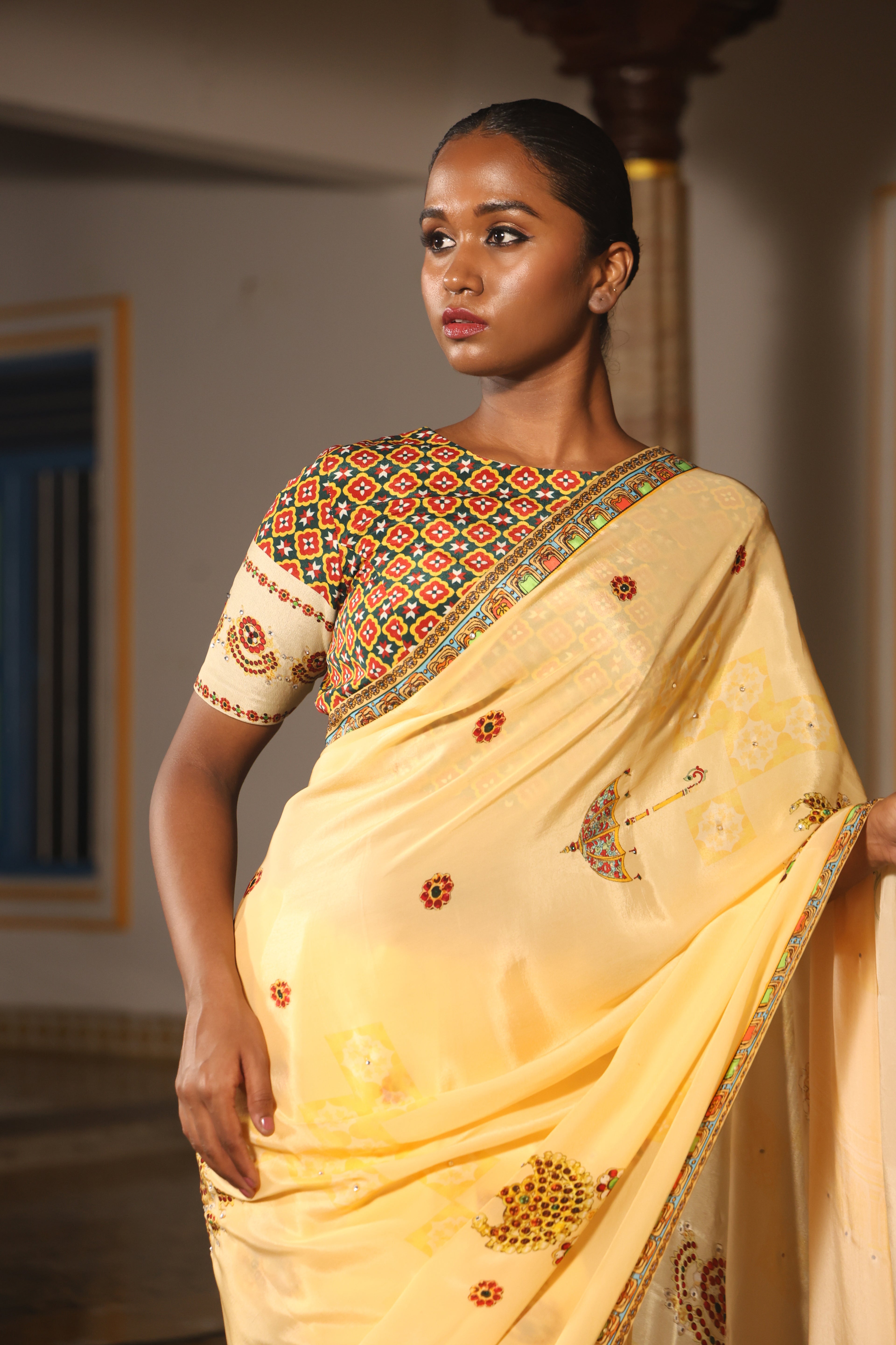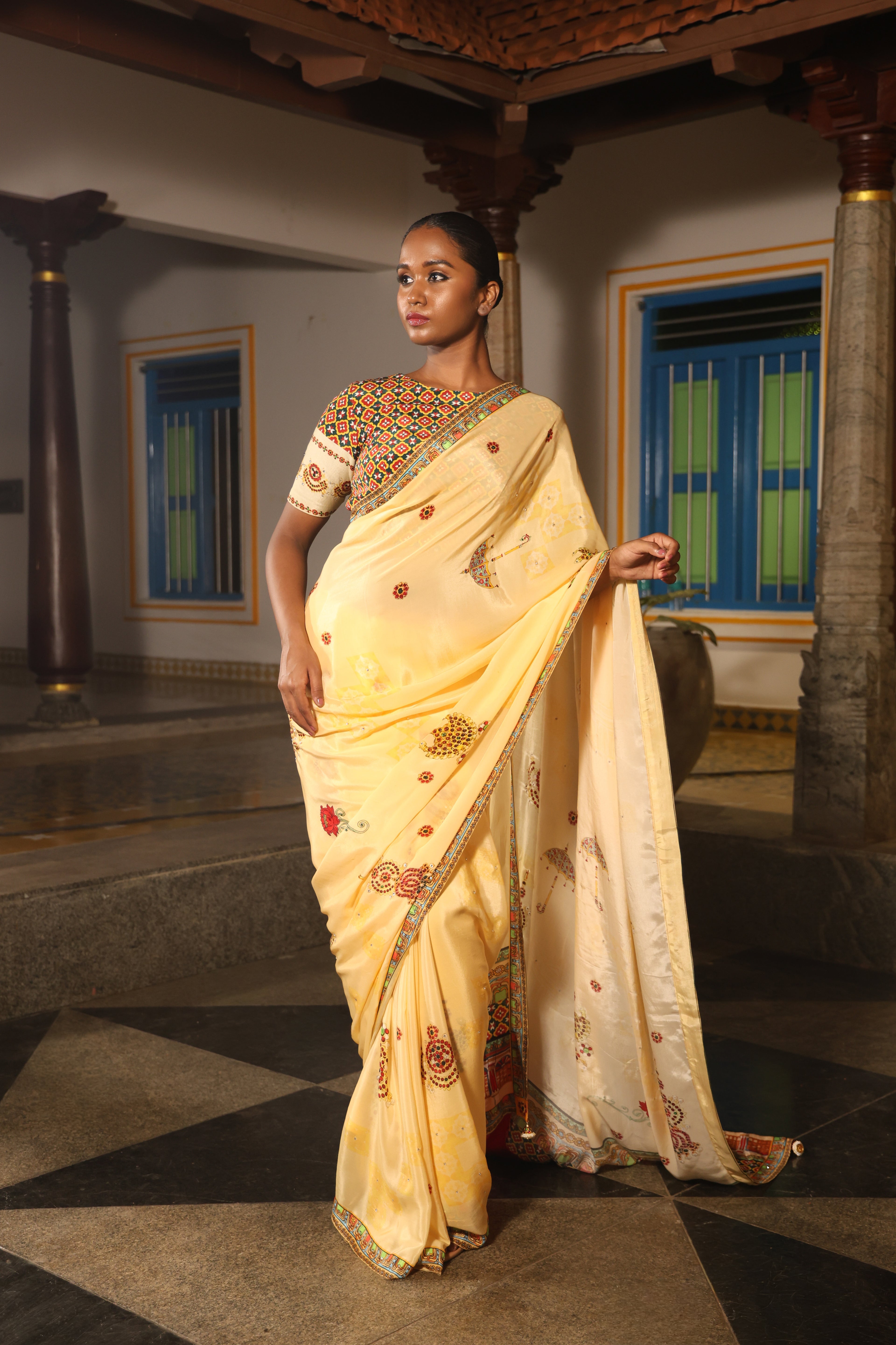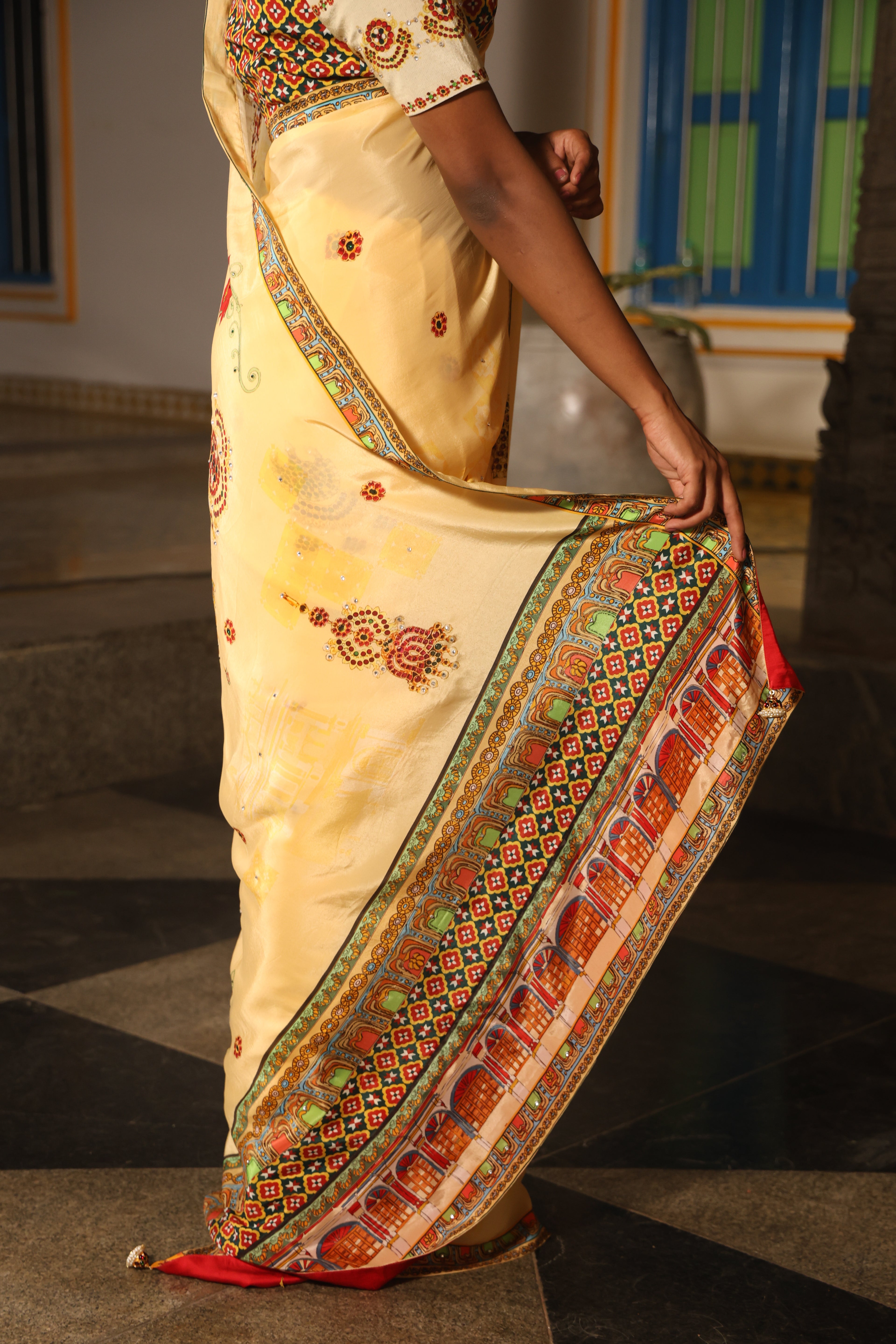5.5 Meters with chettinad architechture print and jewellery print embellished with stone embroidery.