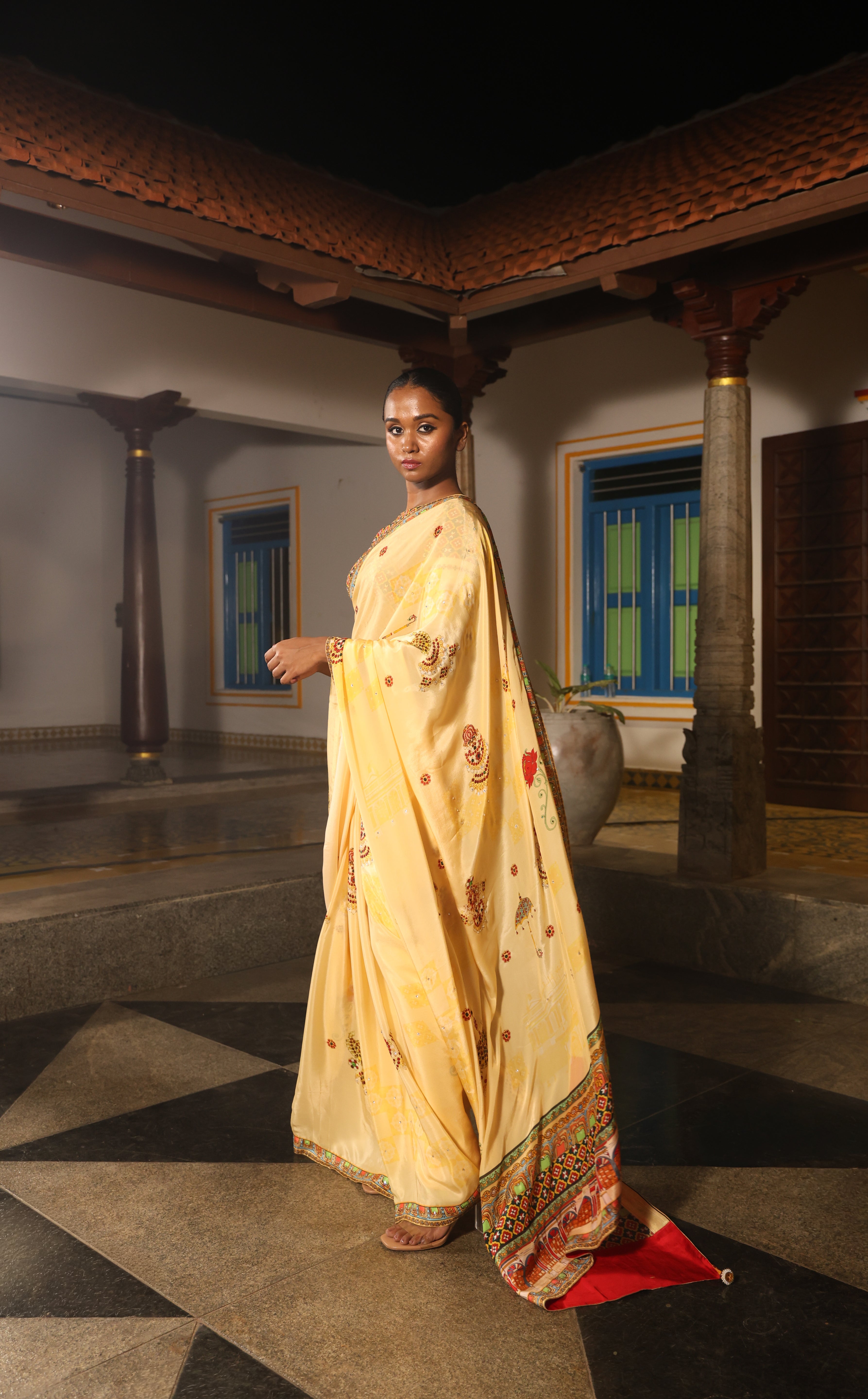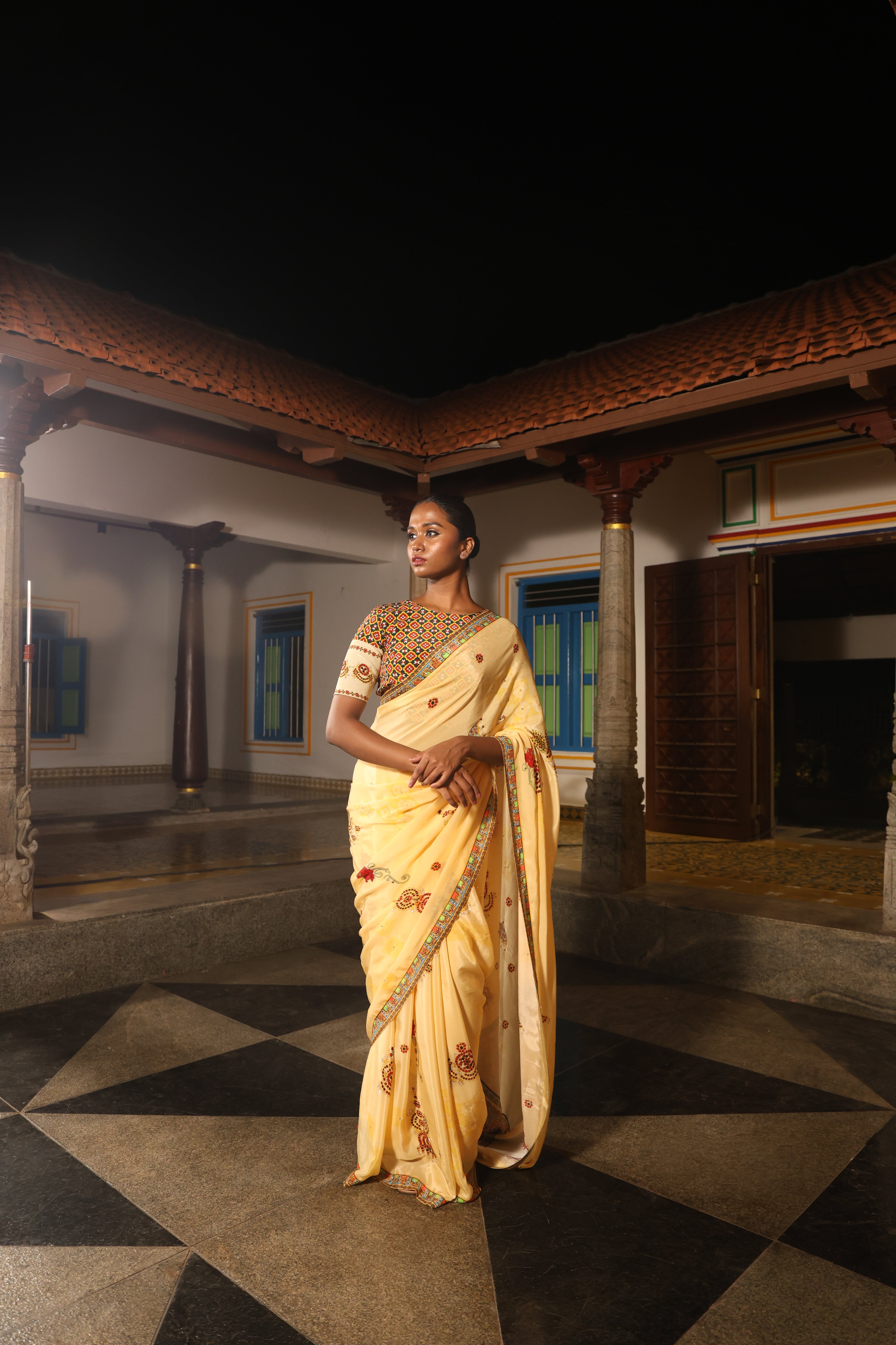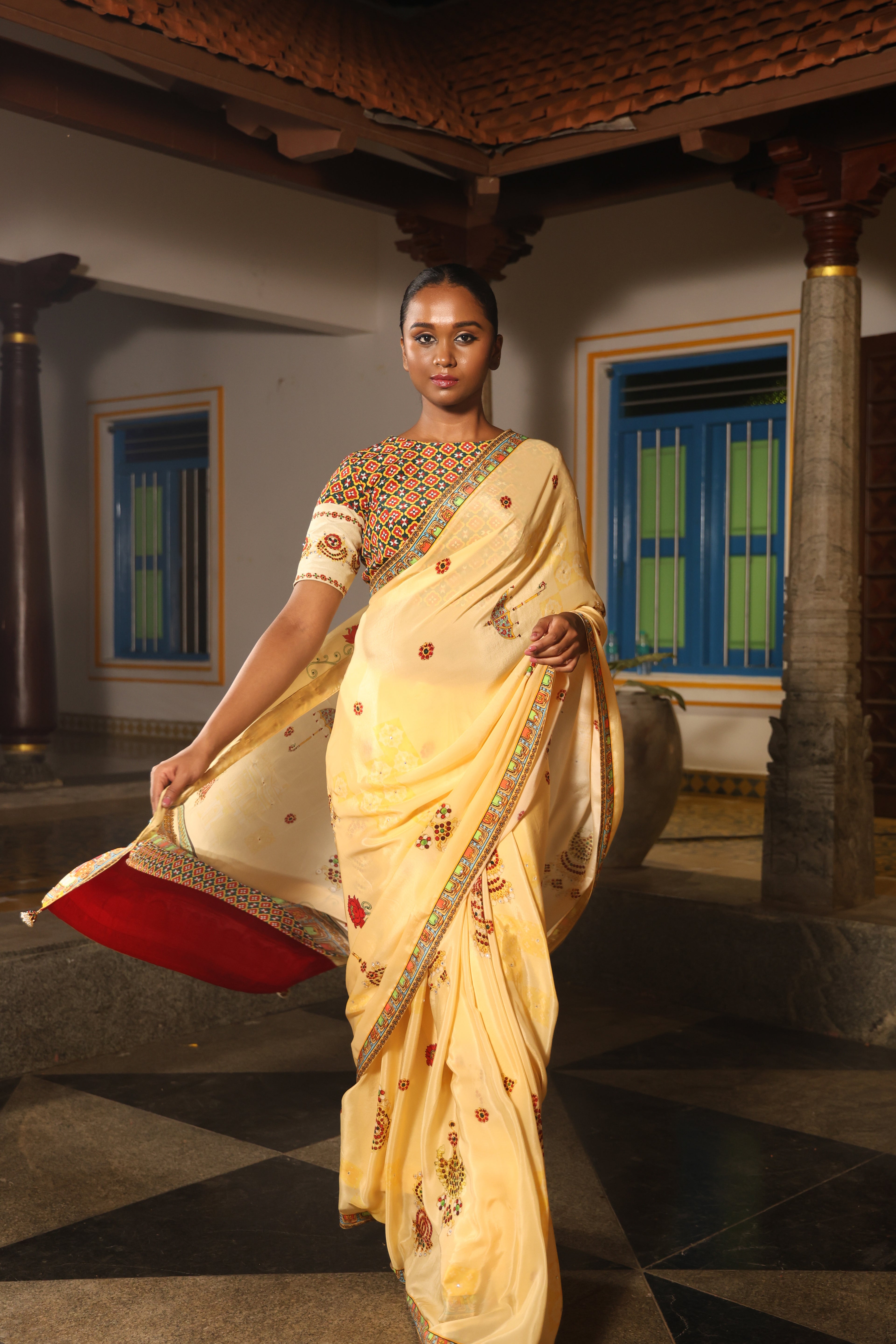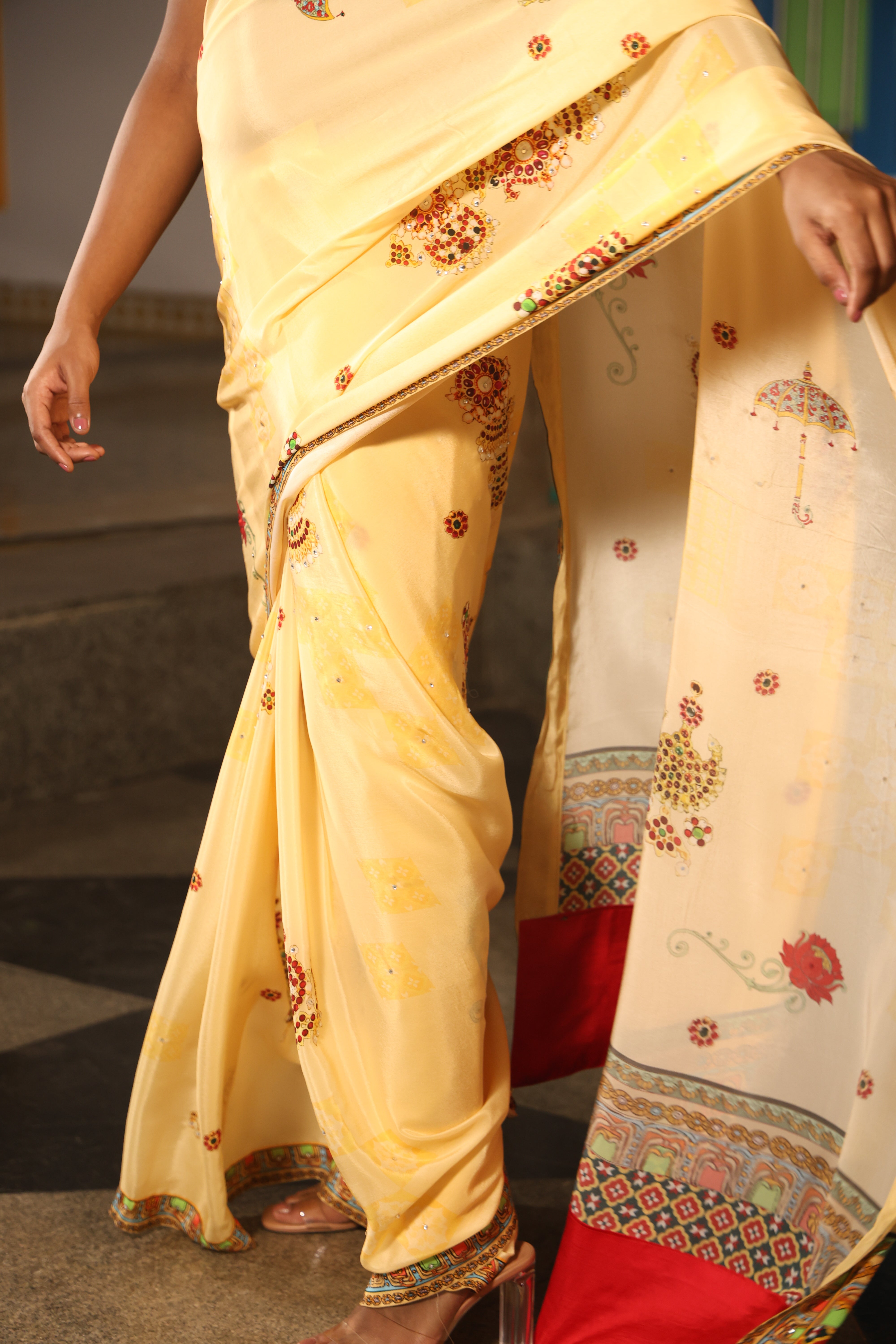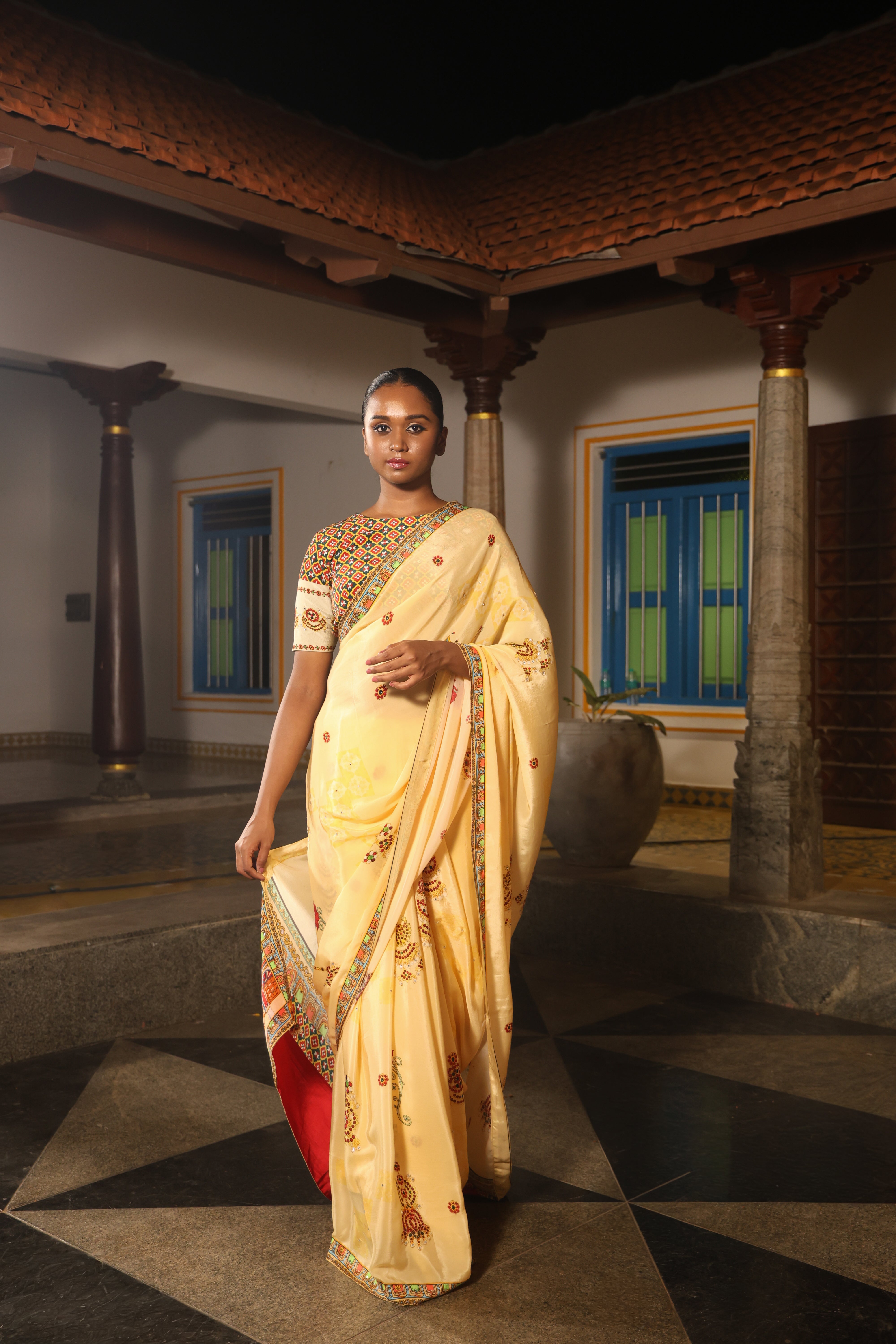 5.5 Meters with chettinad architechture print and jewellery print embellished with stone embroidery.