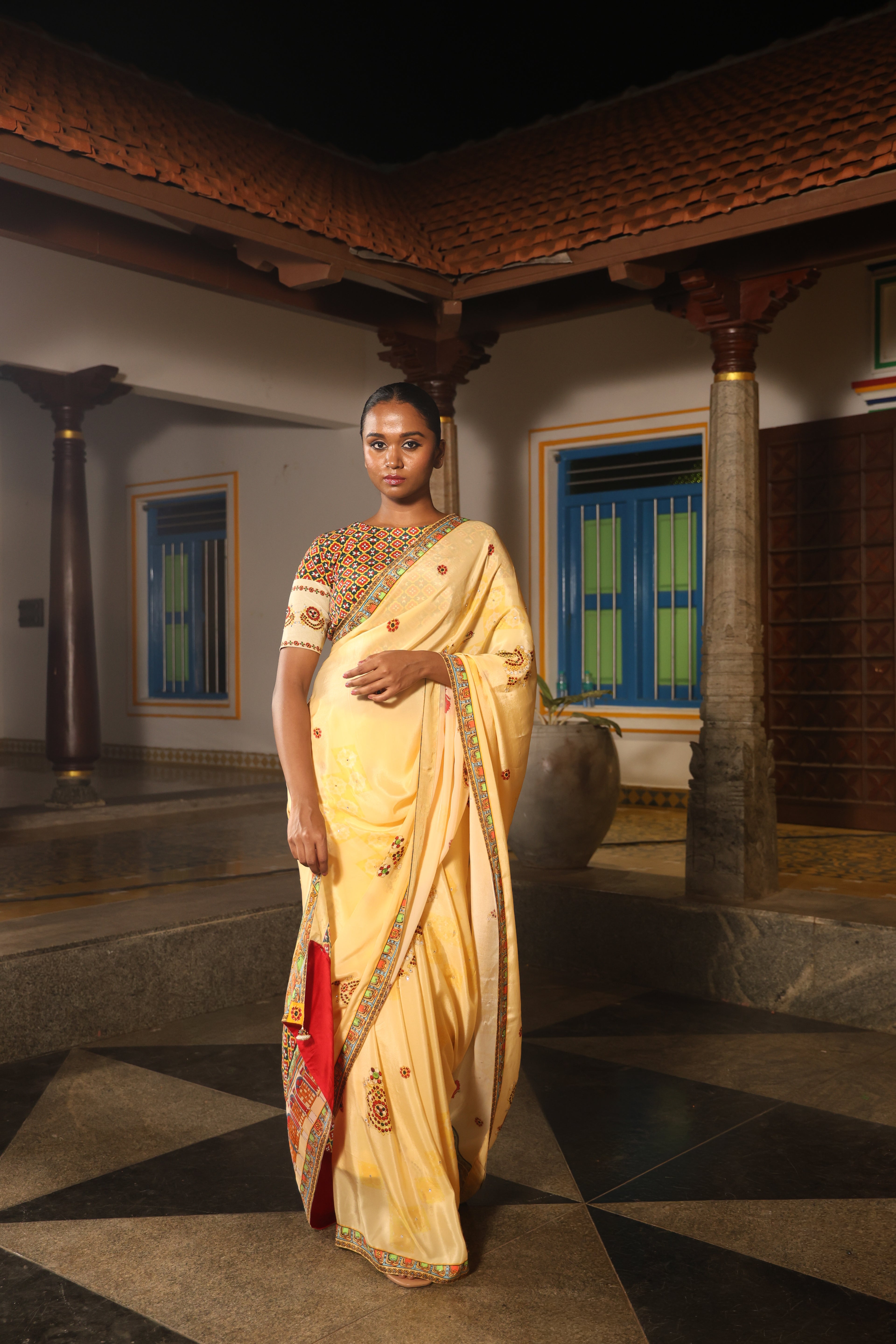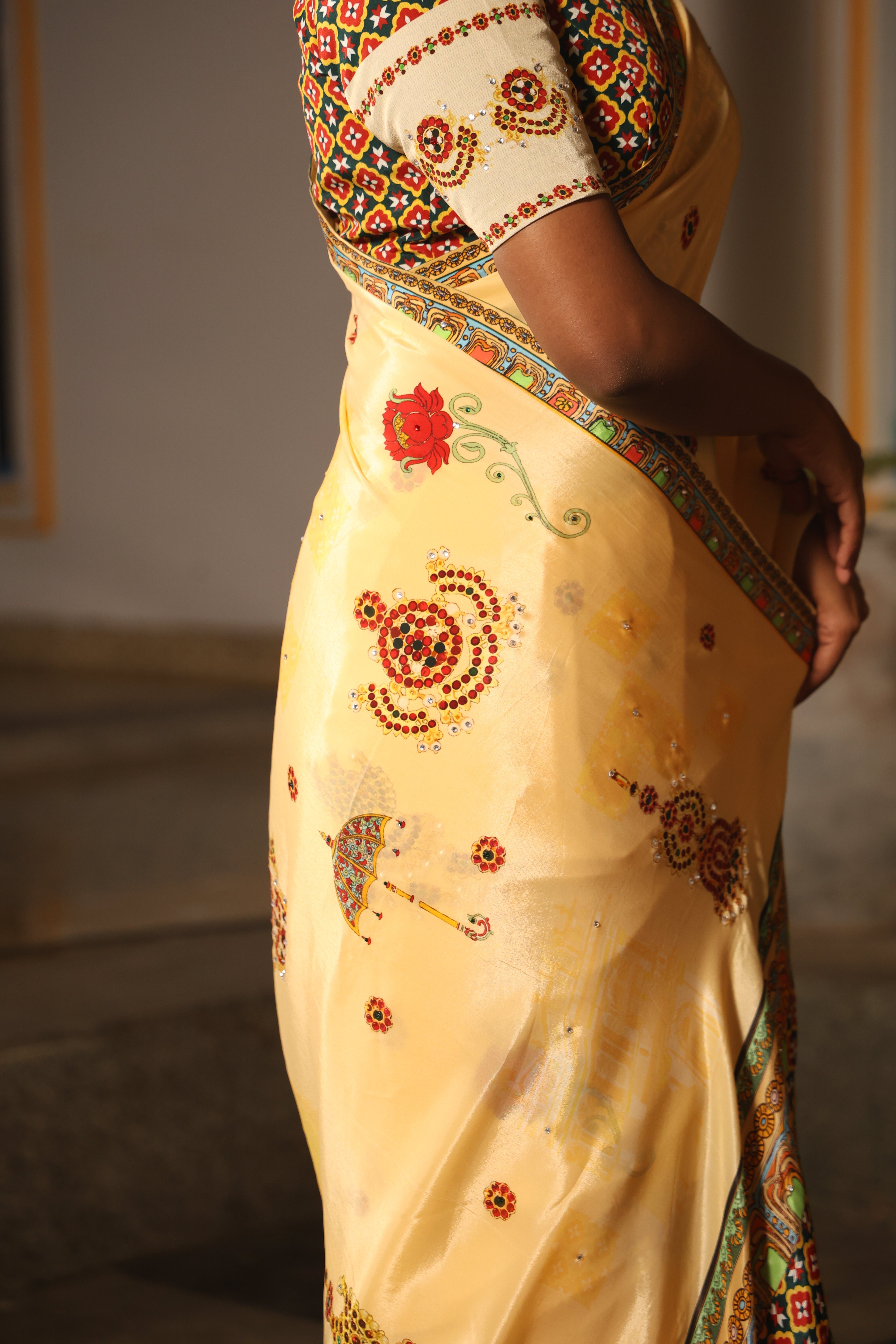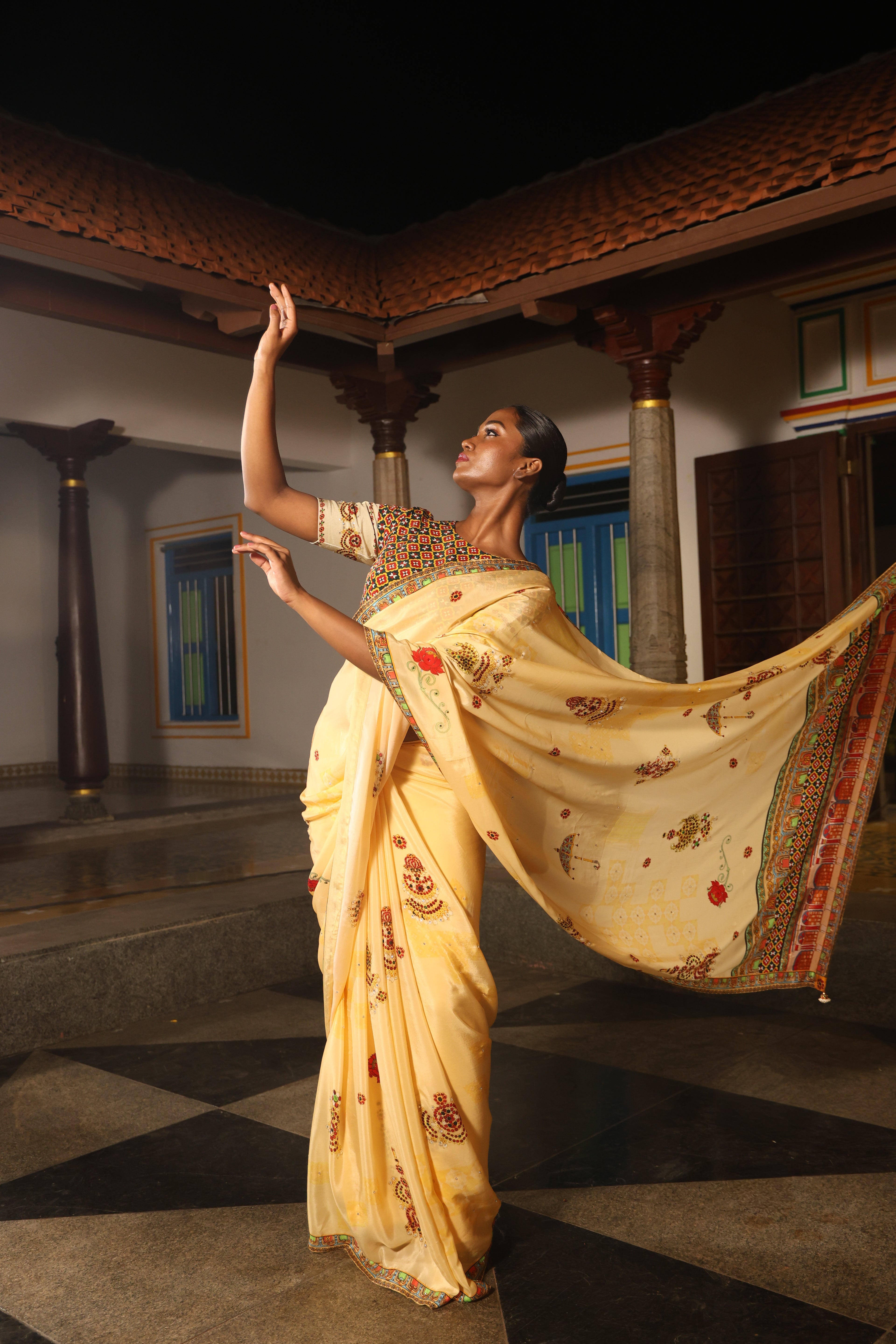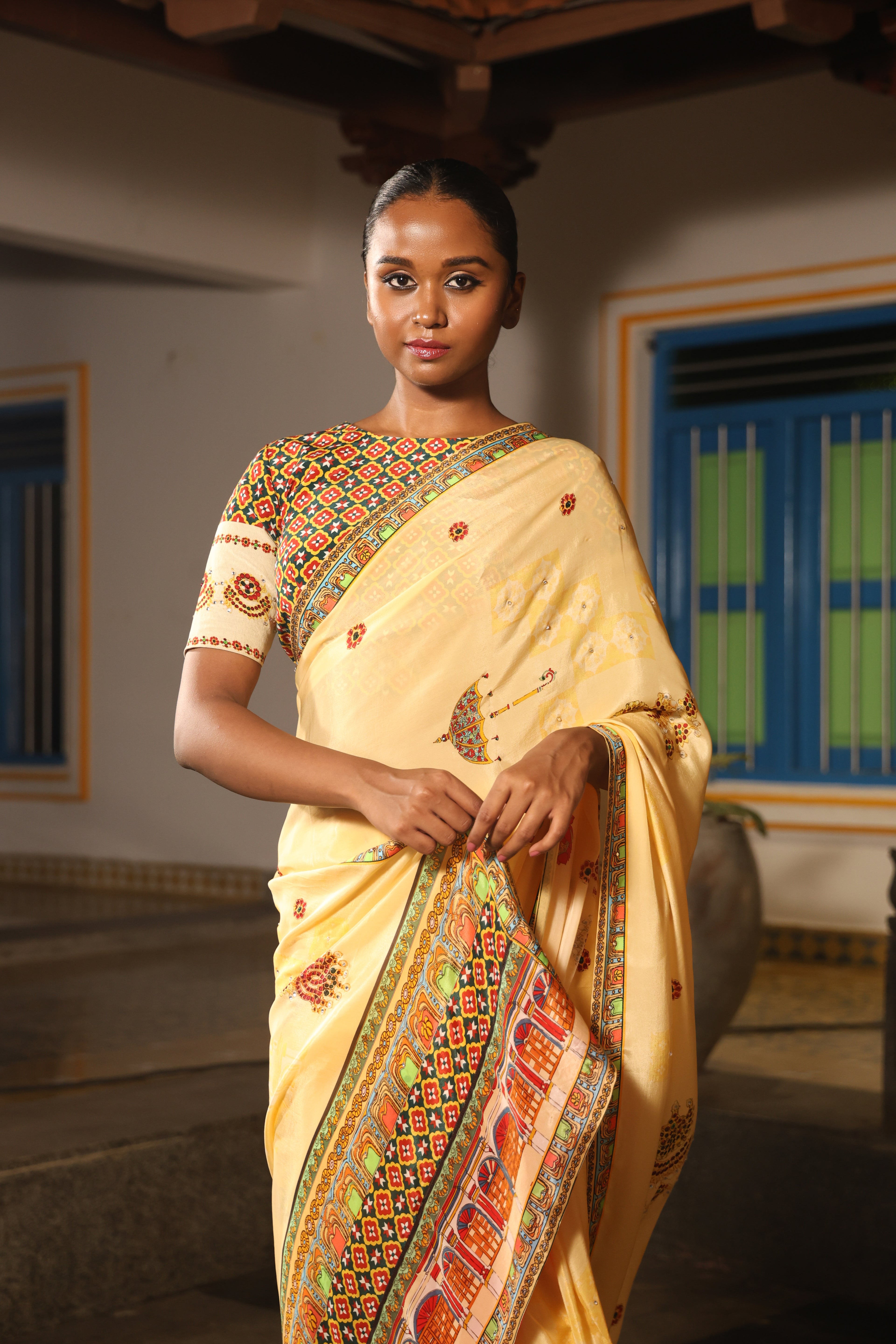 5.5 Meters with chettinad architechture print and jewellery print embellished with stone embroidery.