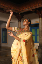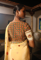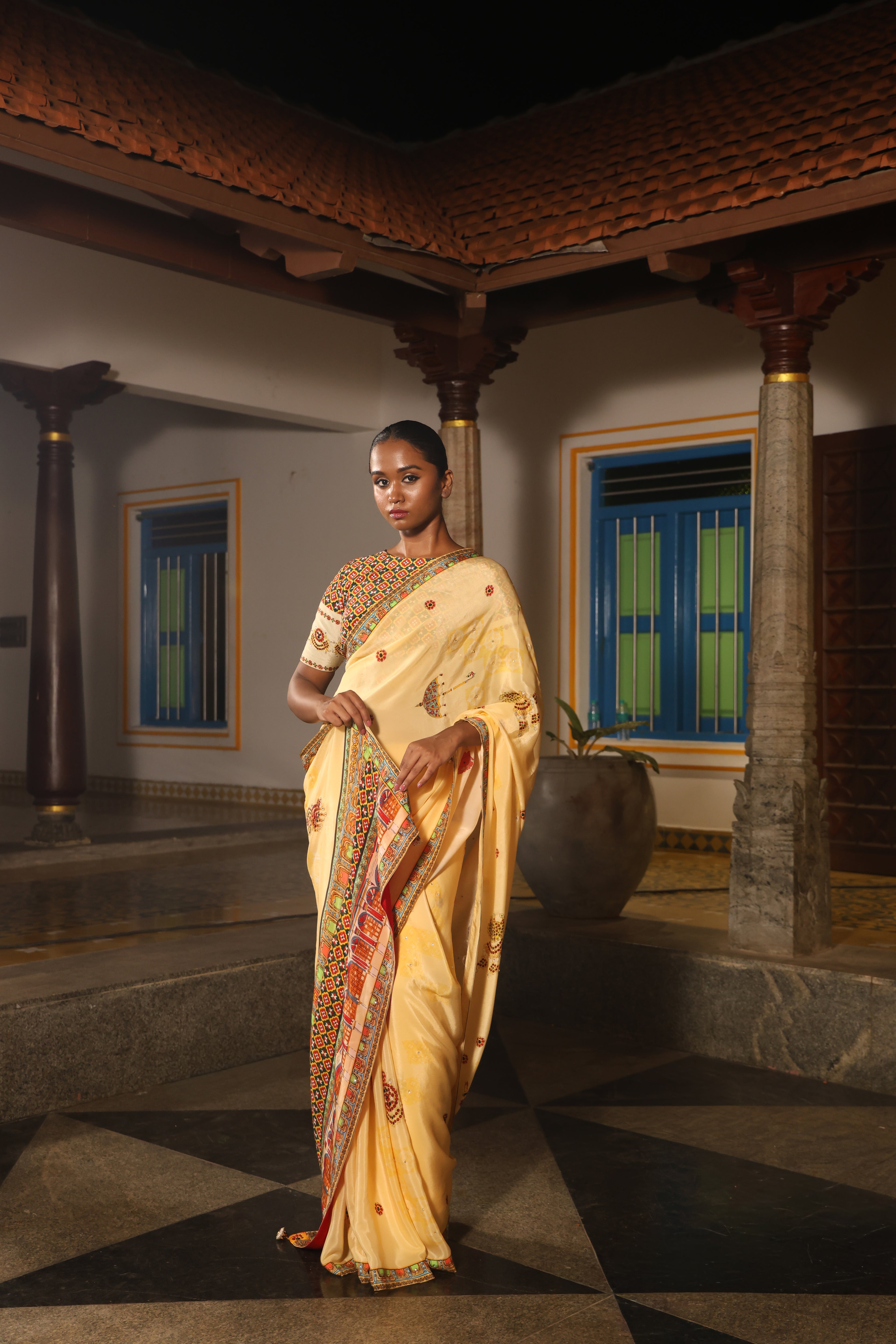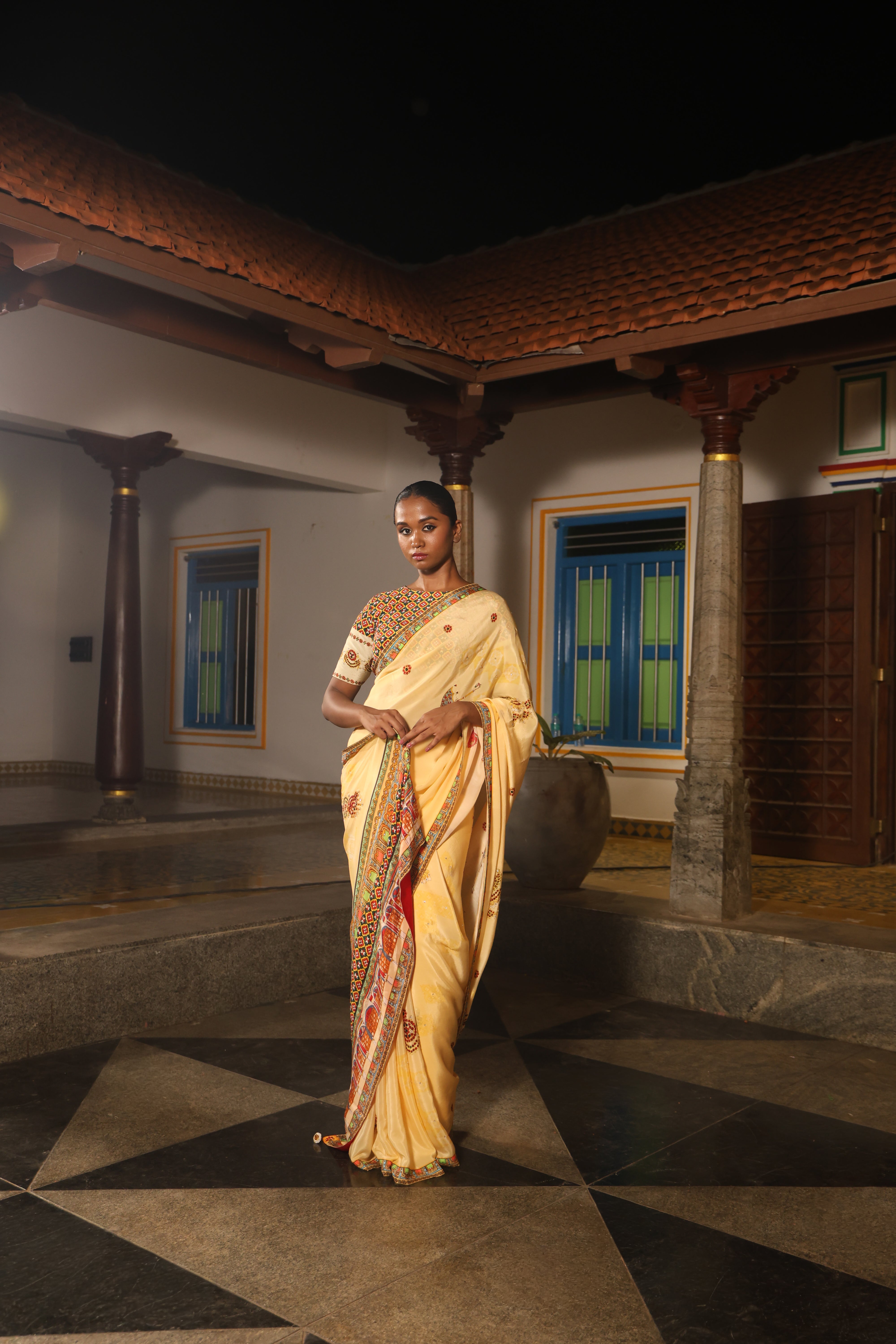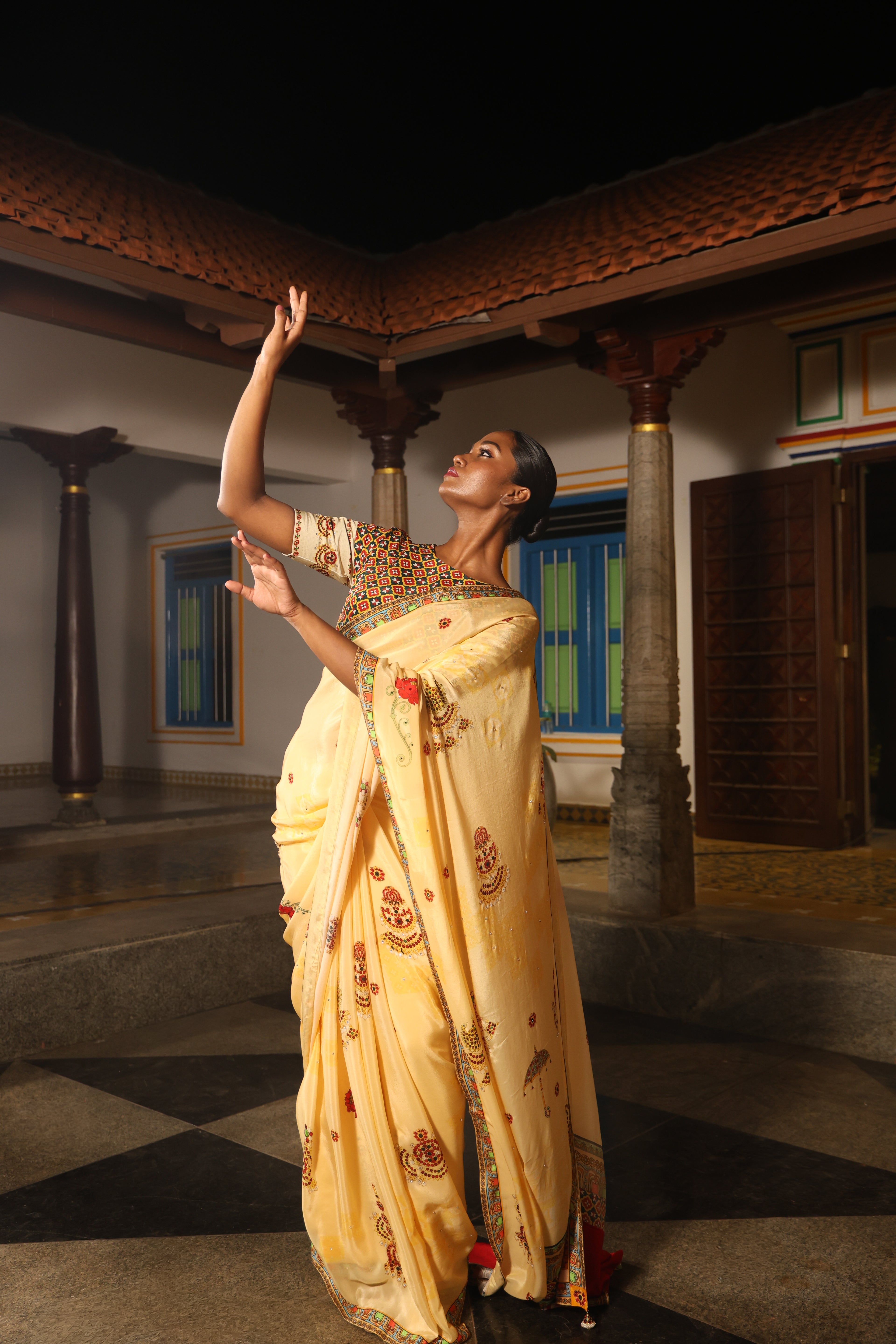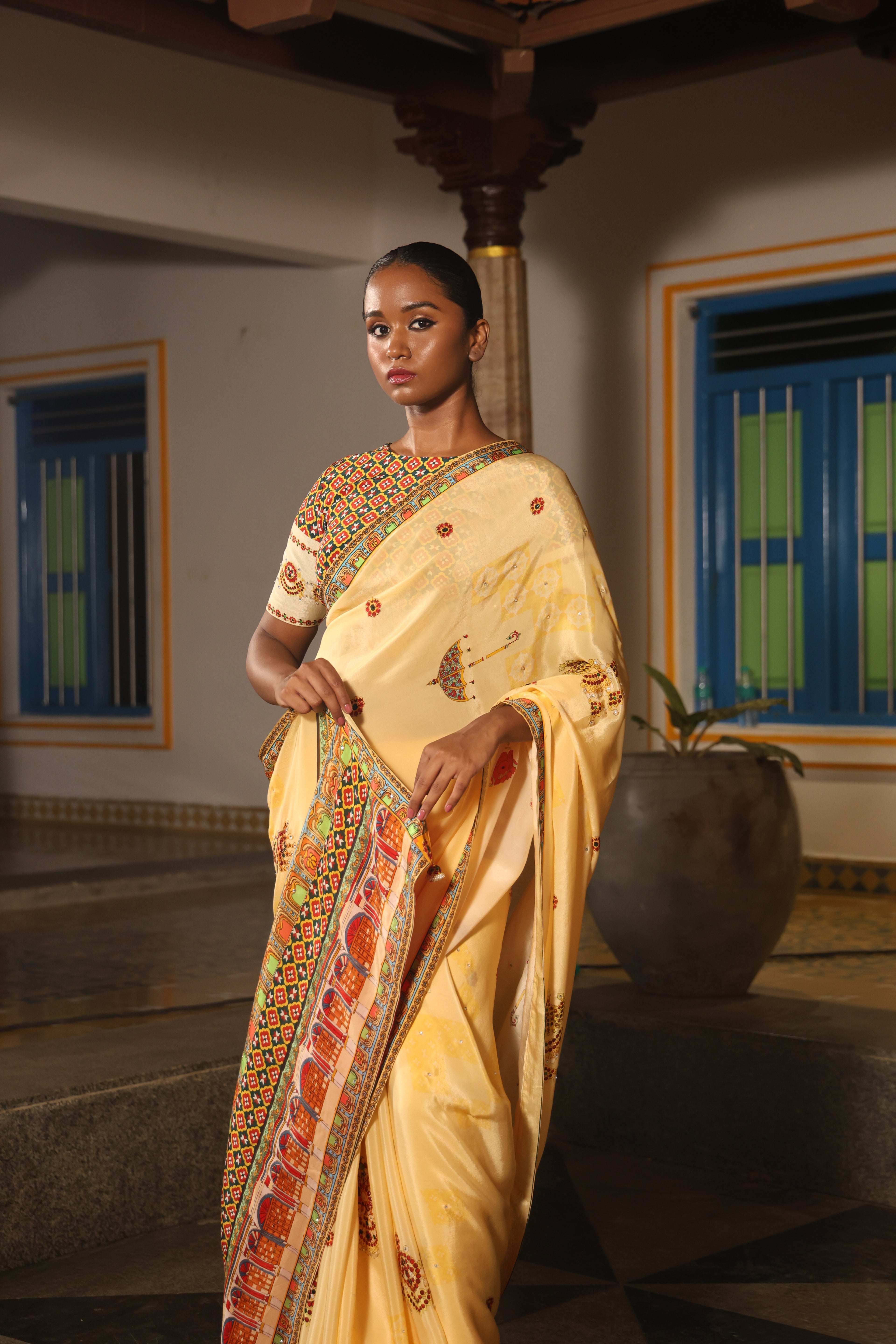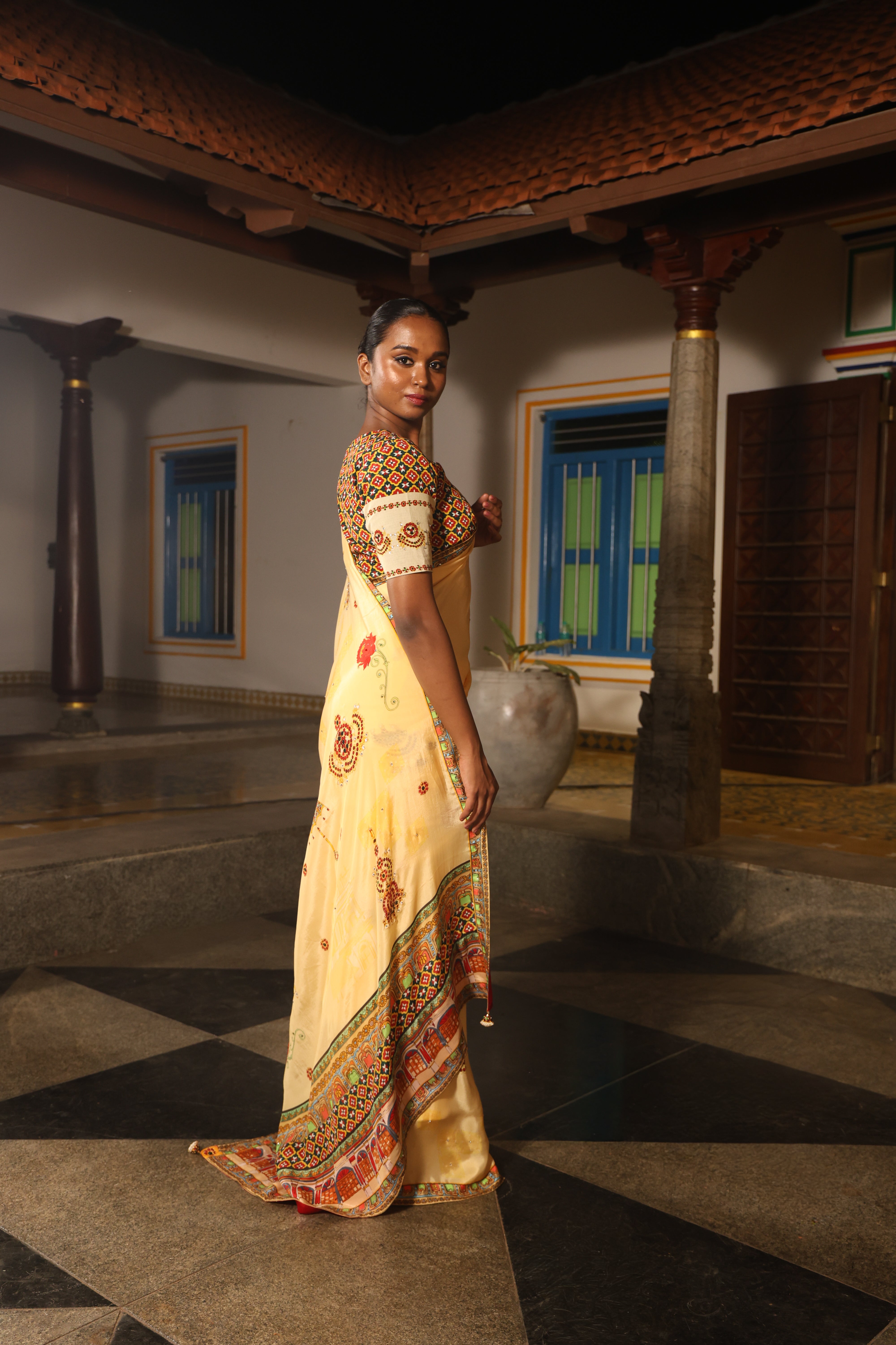 5.5 Meters with chettinad architechture print and jewellery print embellished with stone embroidery.