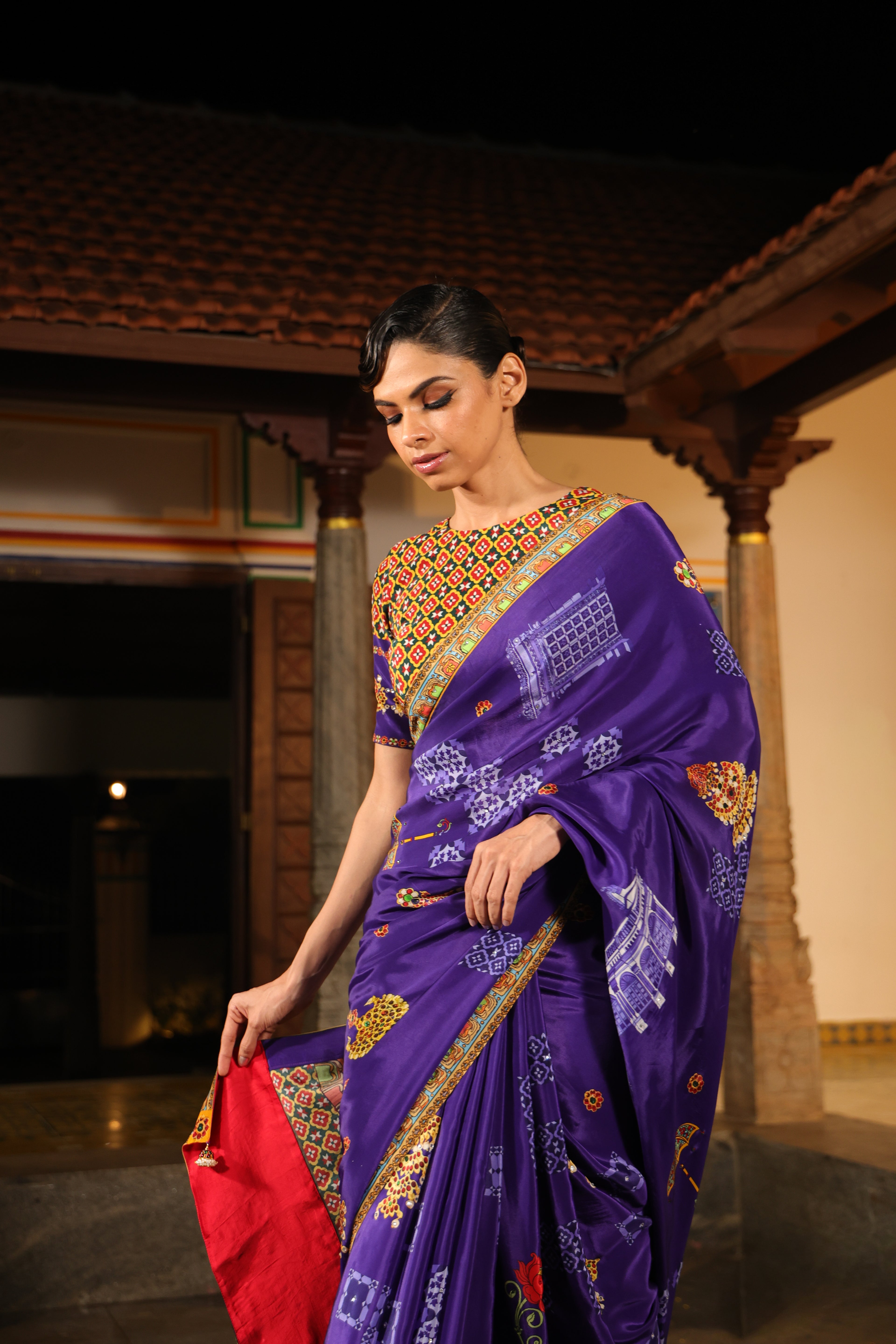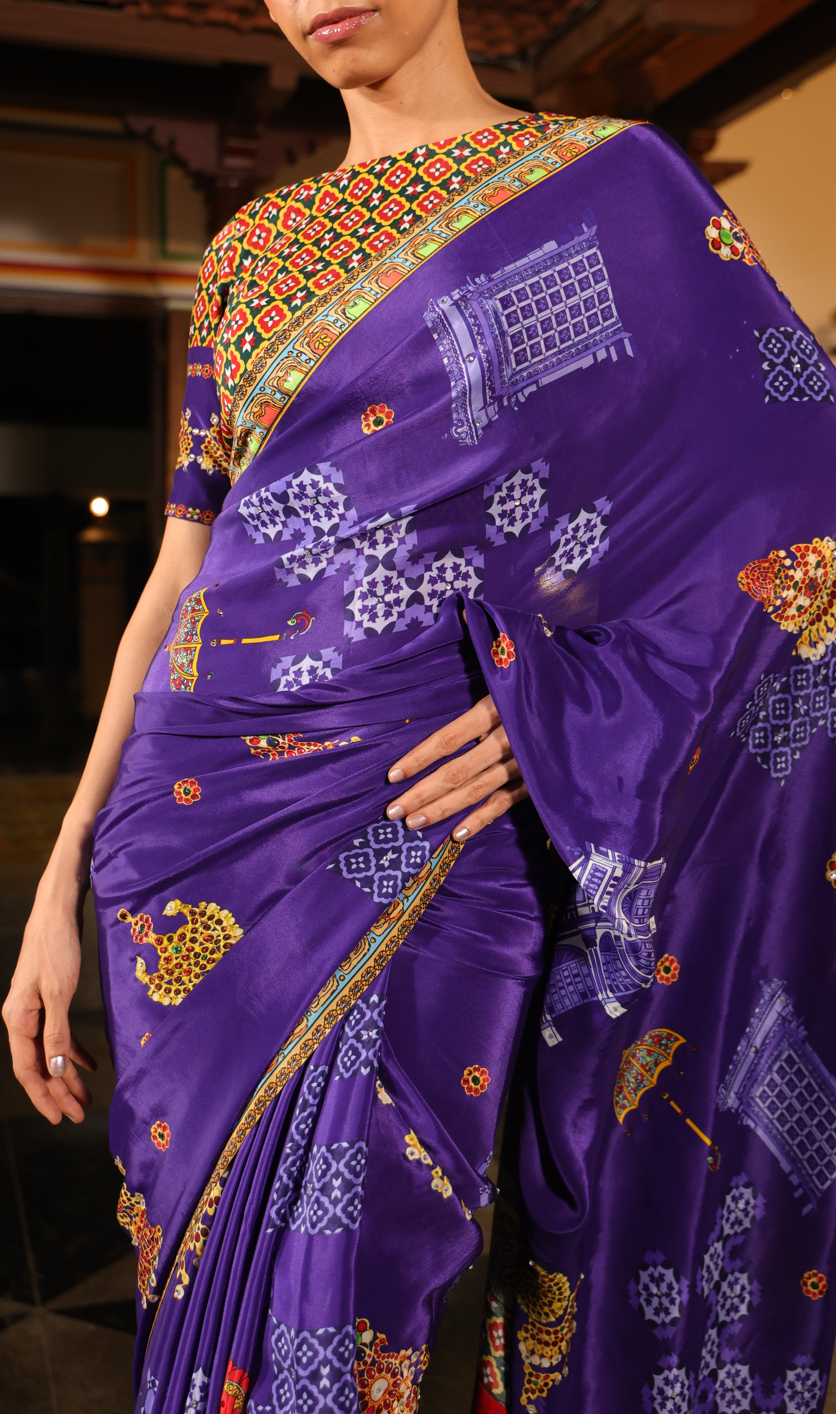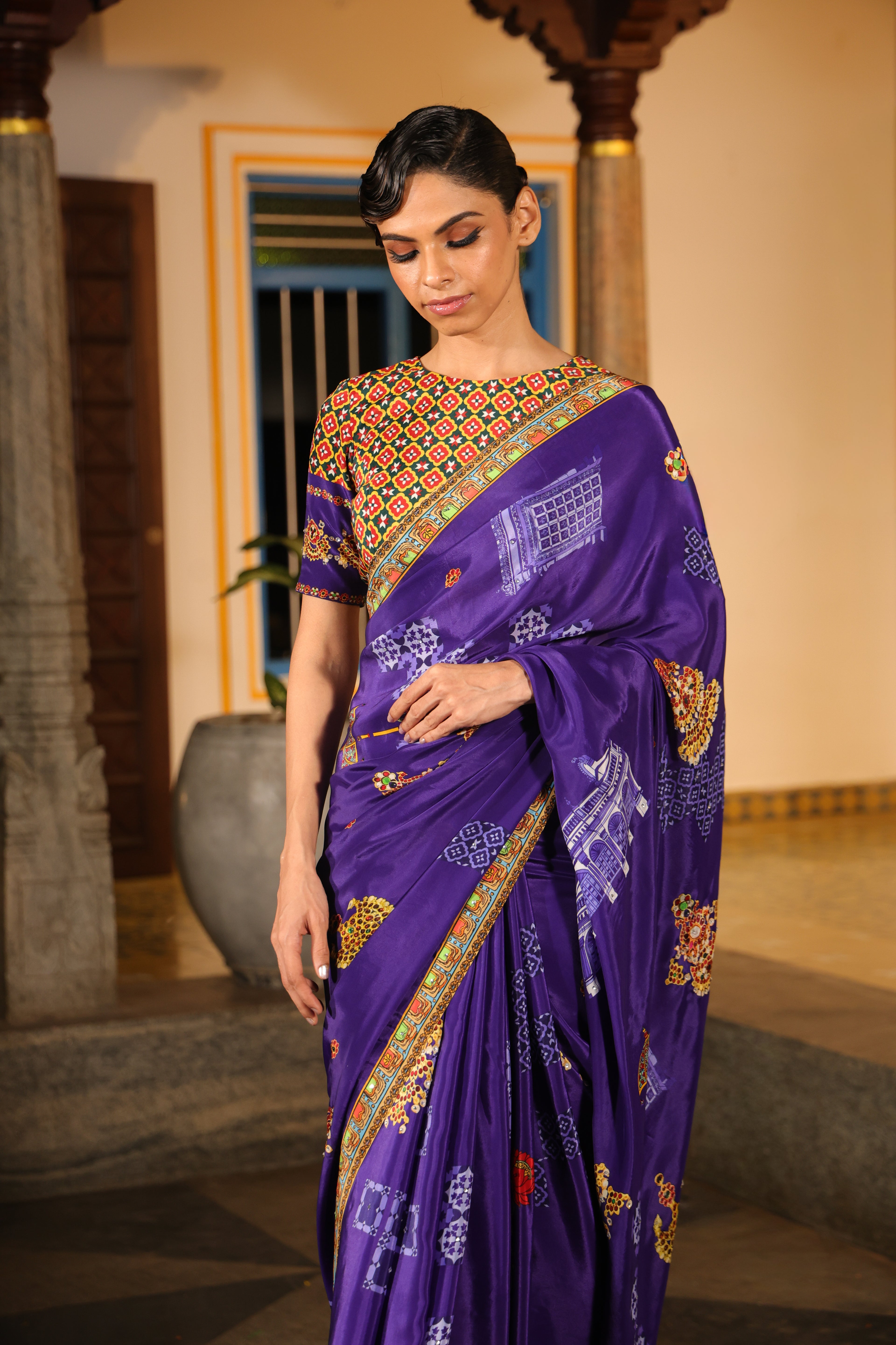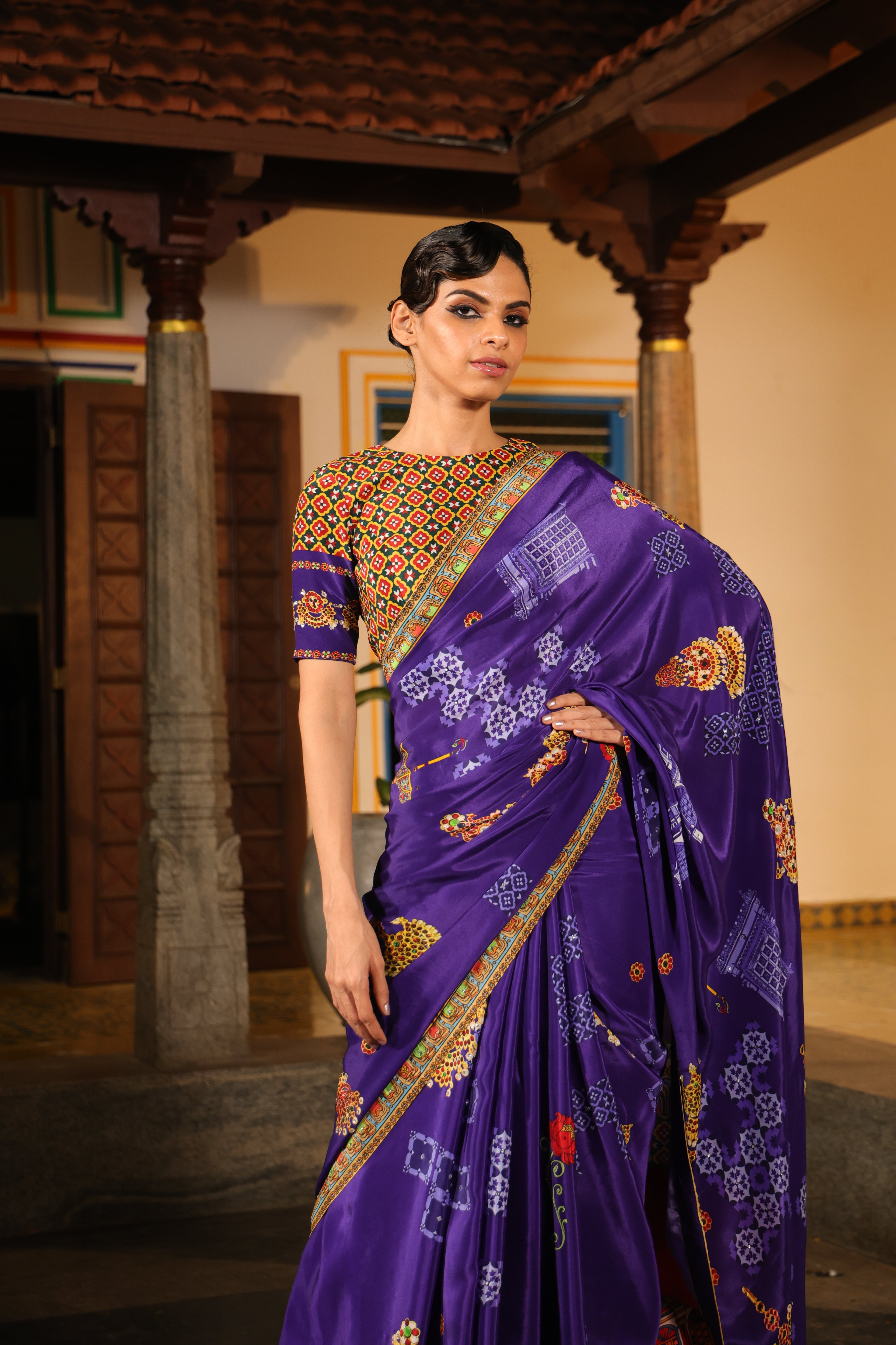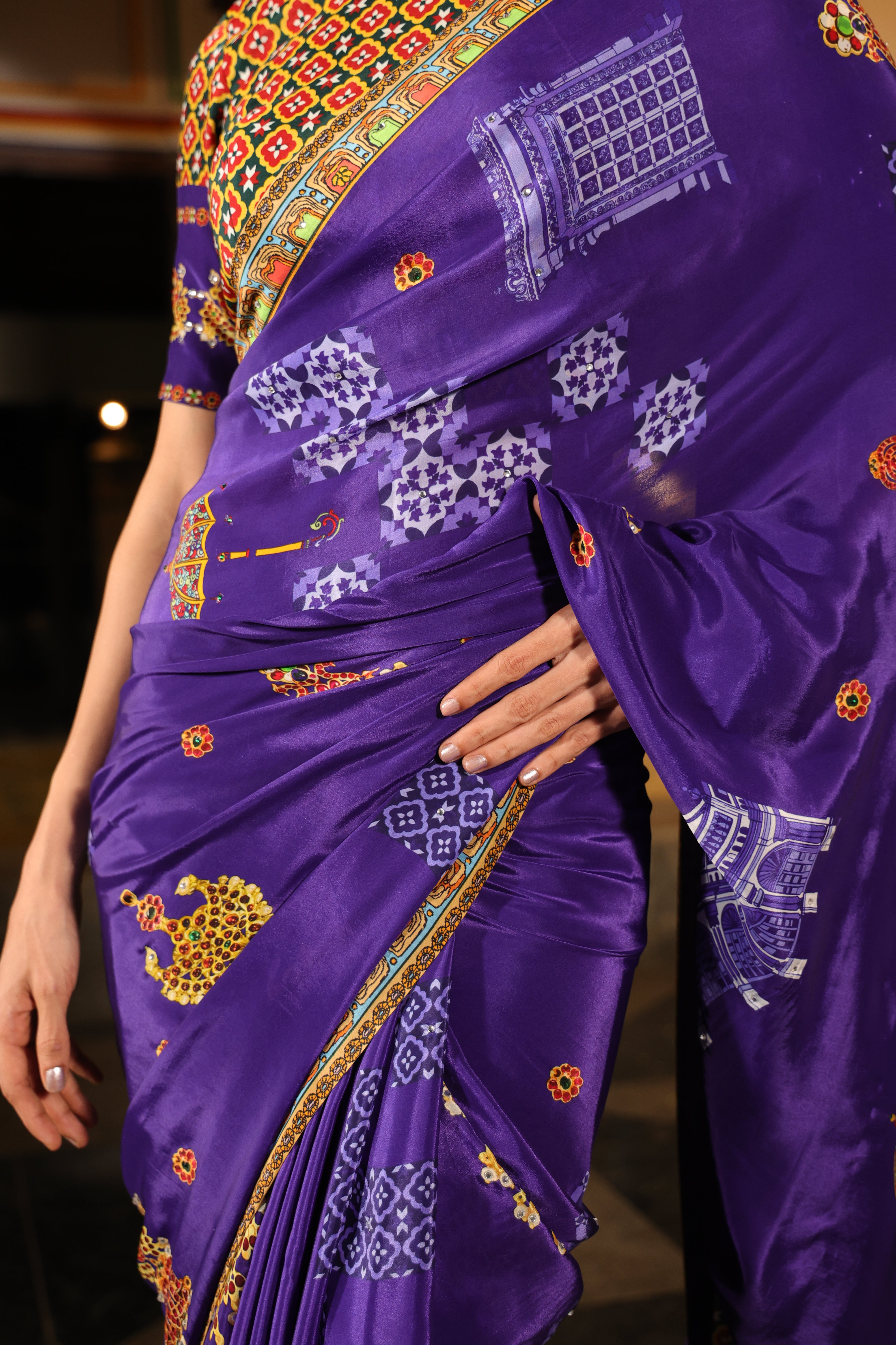 5.5 Meters with chettinad architechture print and jewellery print embellished with stone embroidery.
