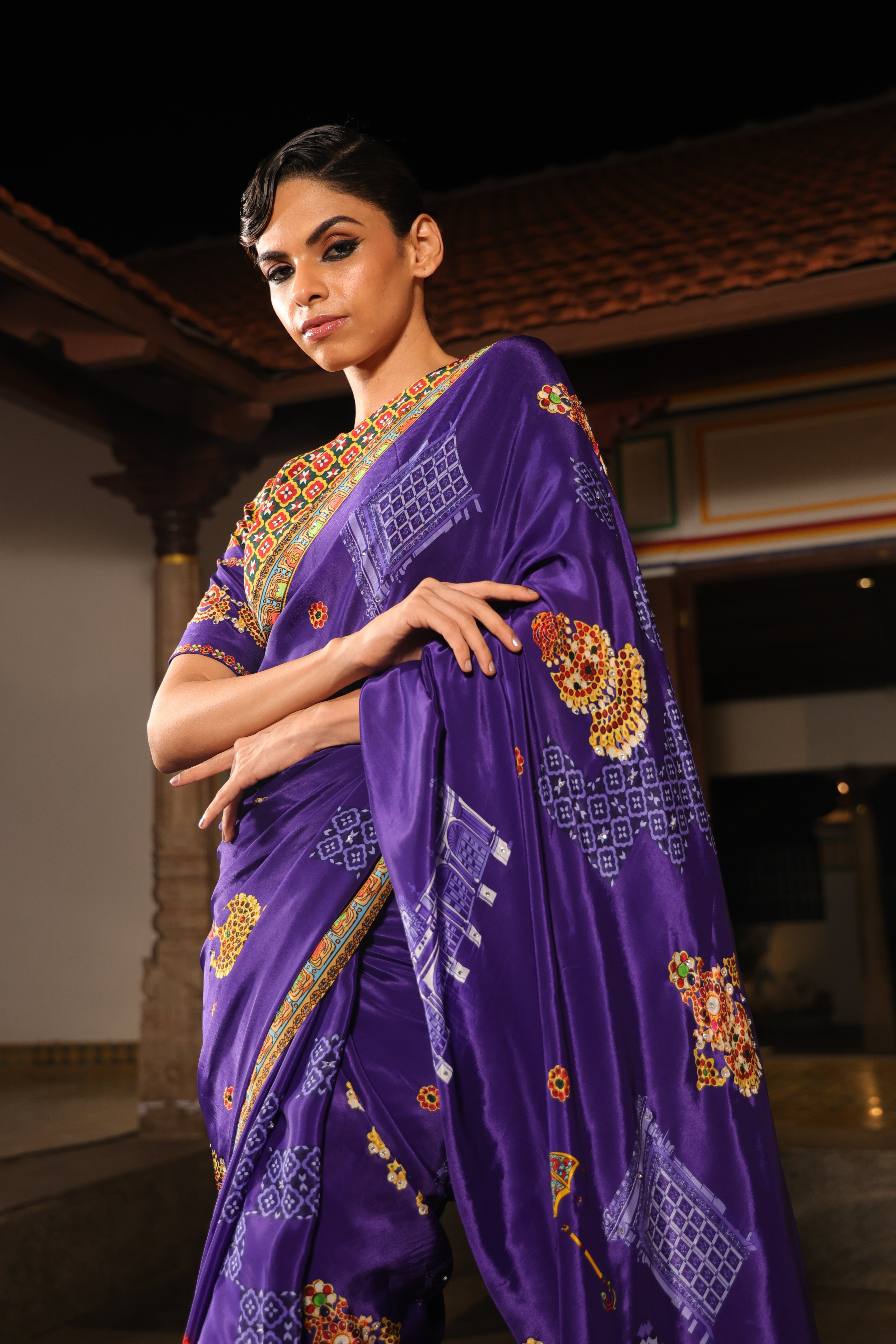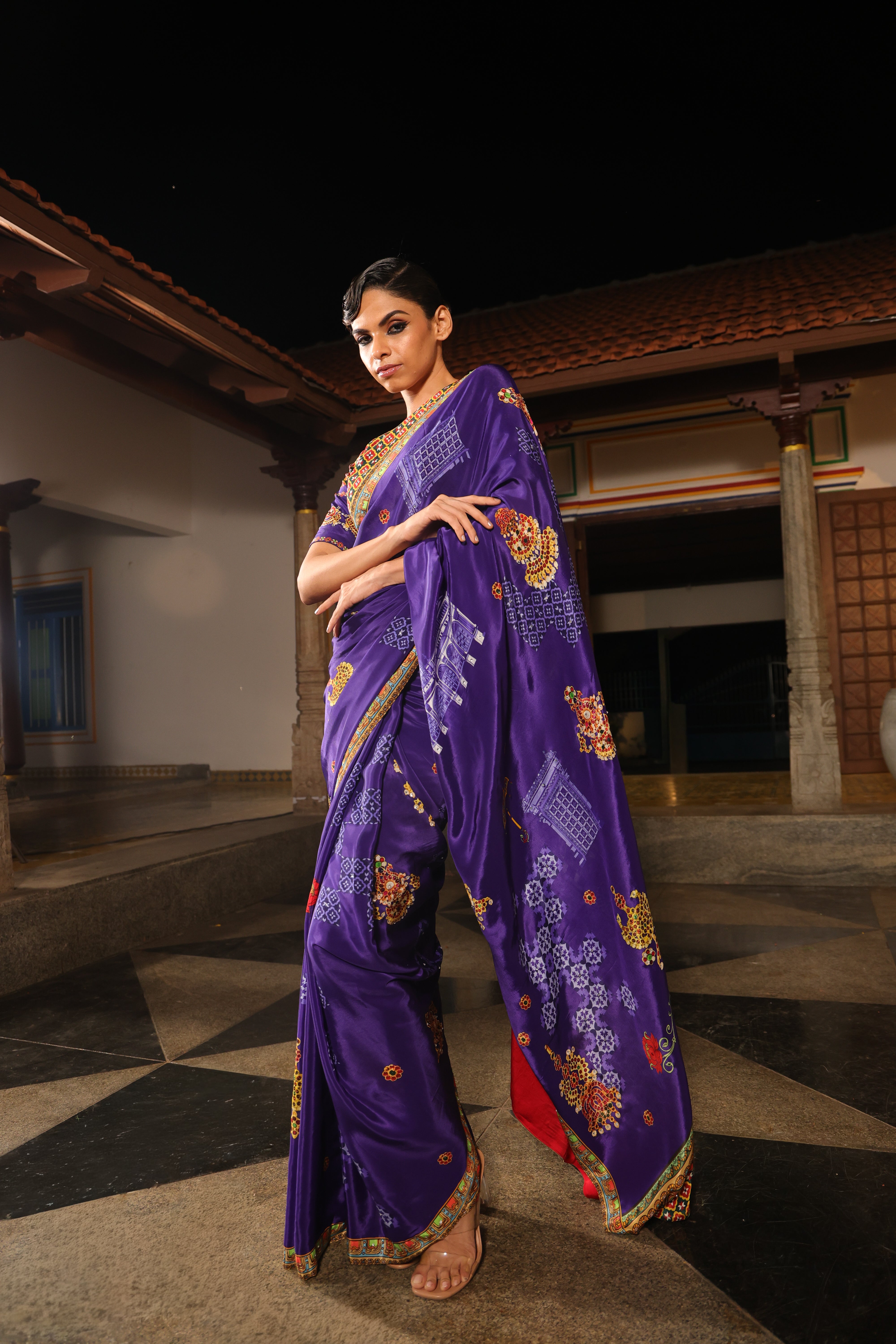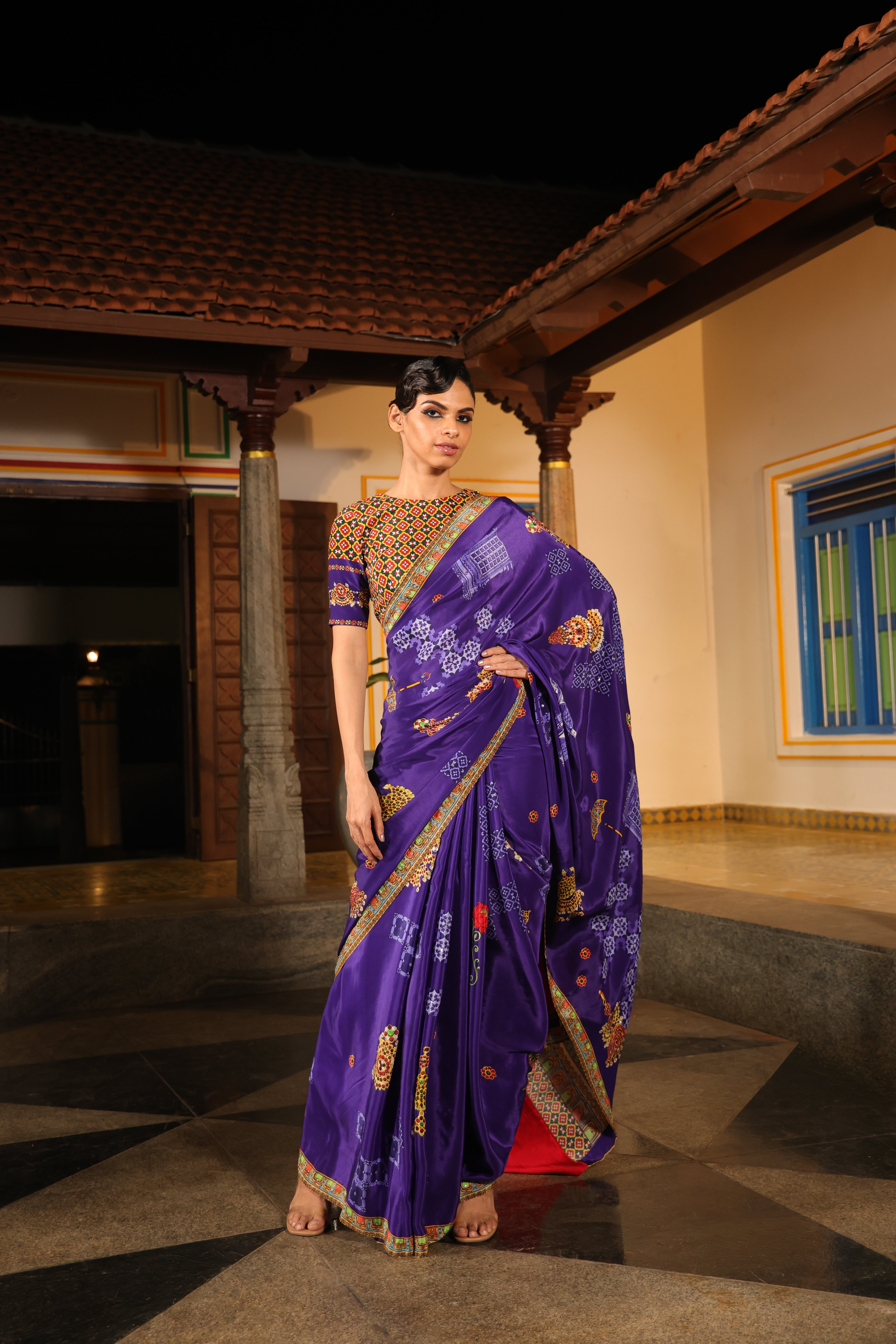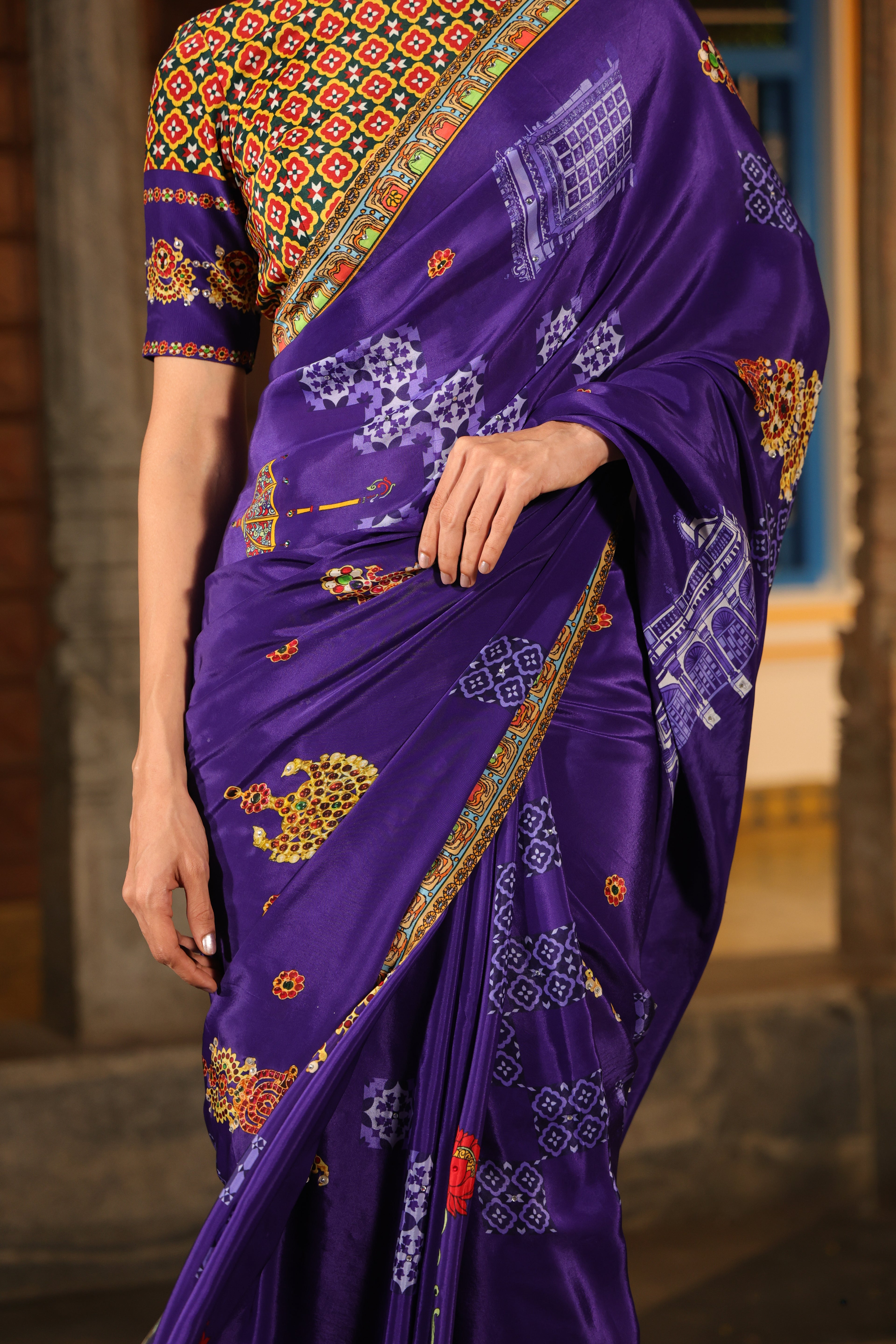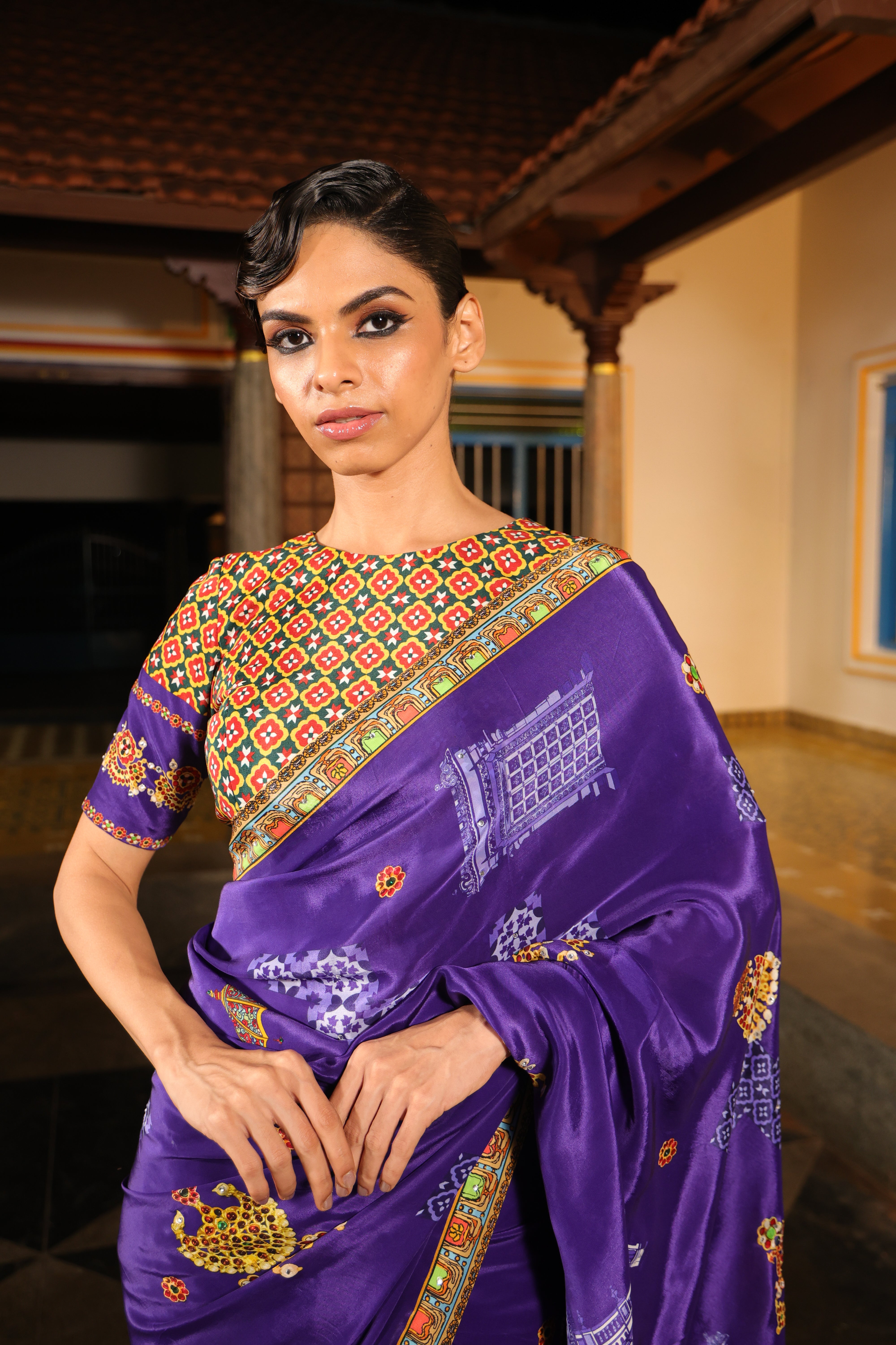 5.5 Meters with chettinad architechture print and jewellery print embellished with stone embroidery.