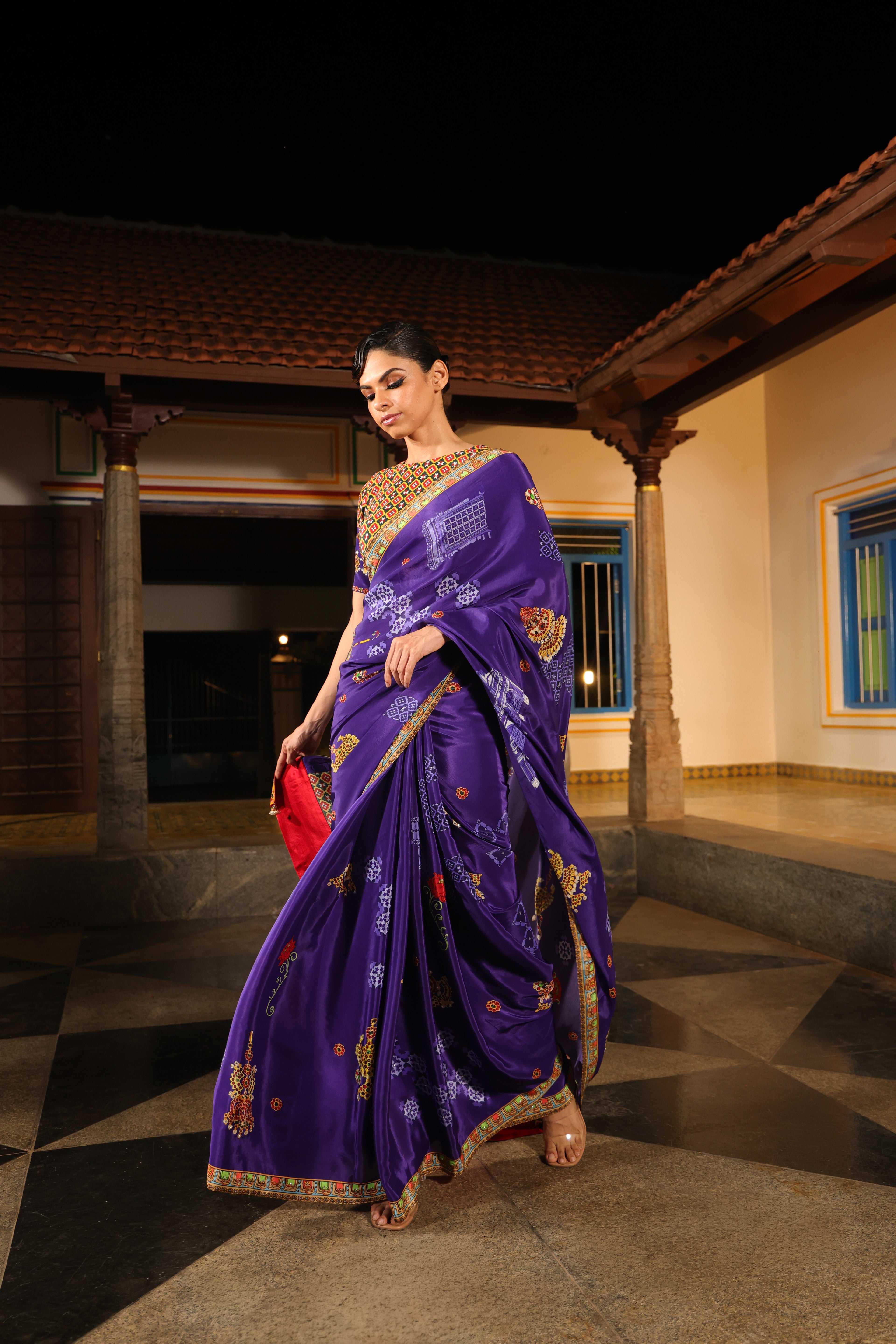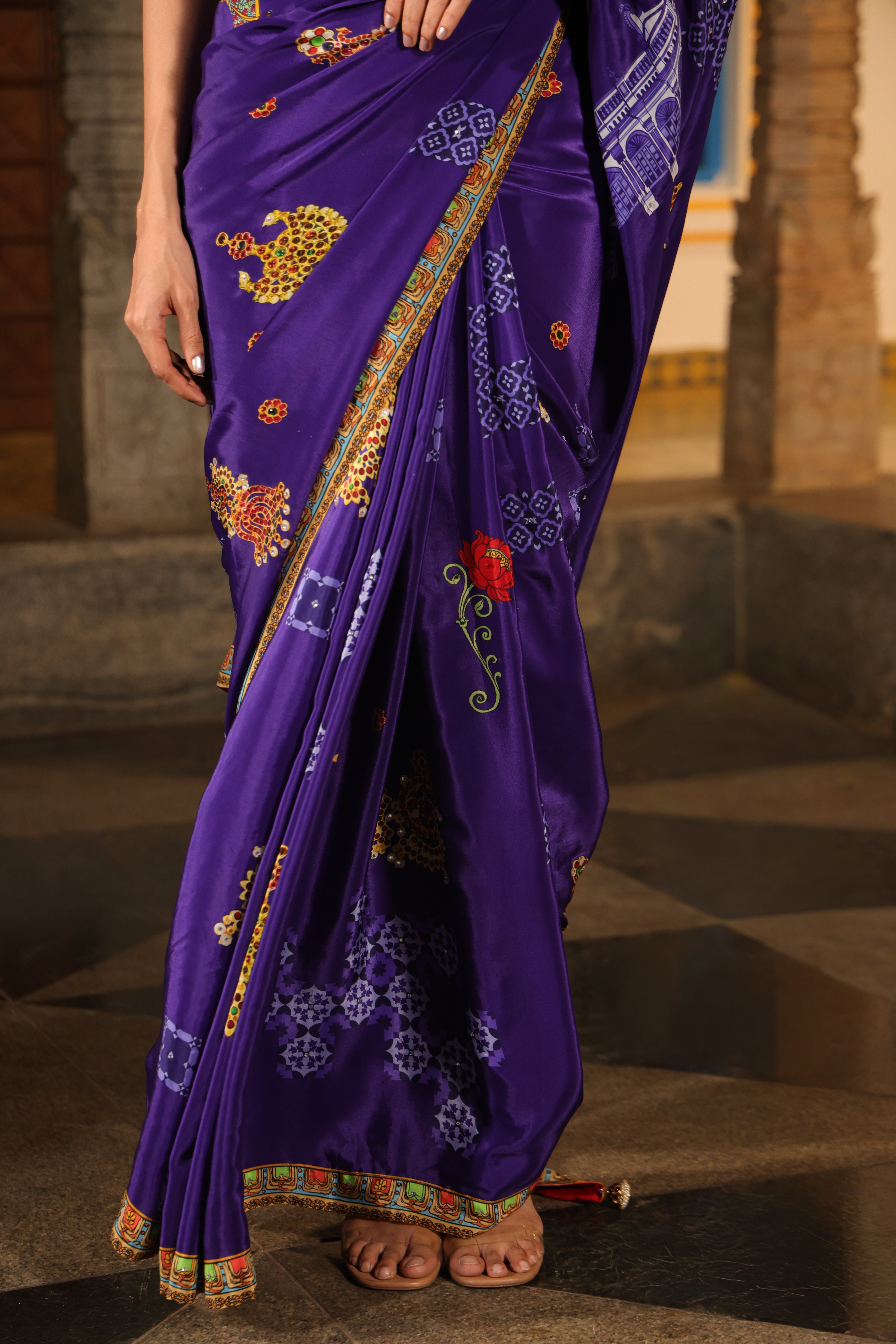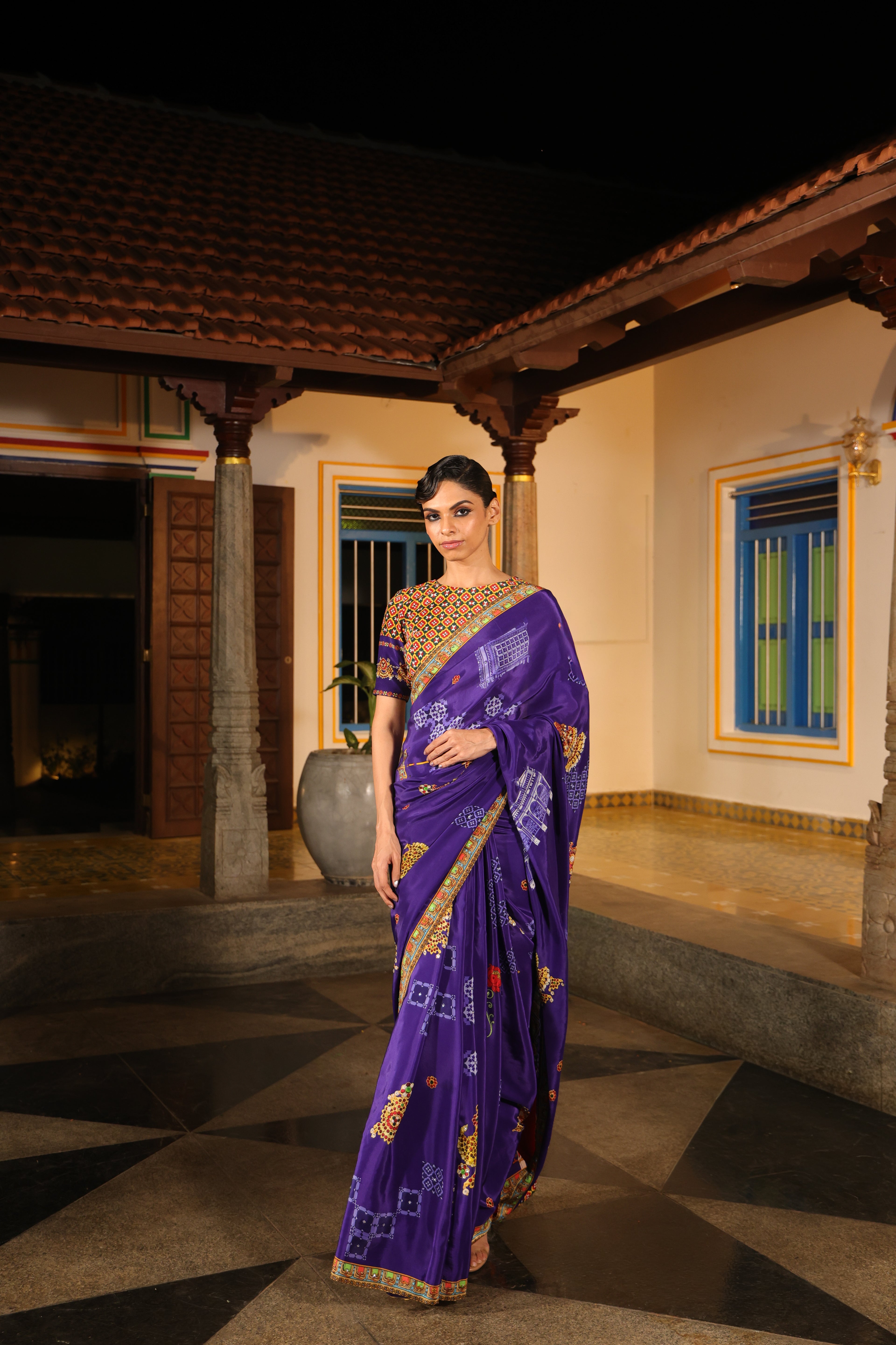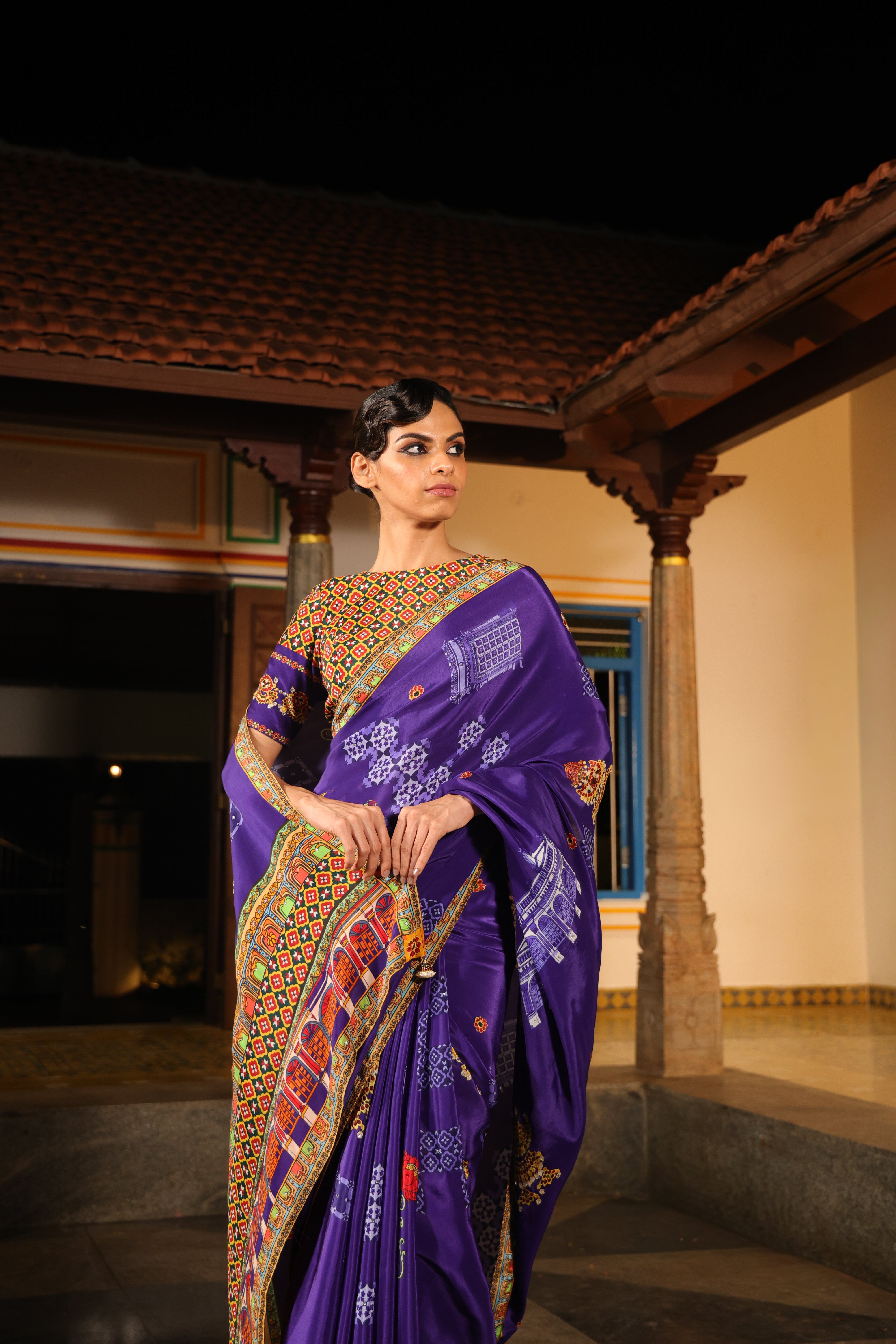 5.5 Meters with chettinad architechture print and jewellery print embellished with stone embroidery.