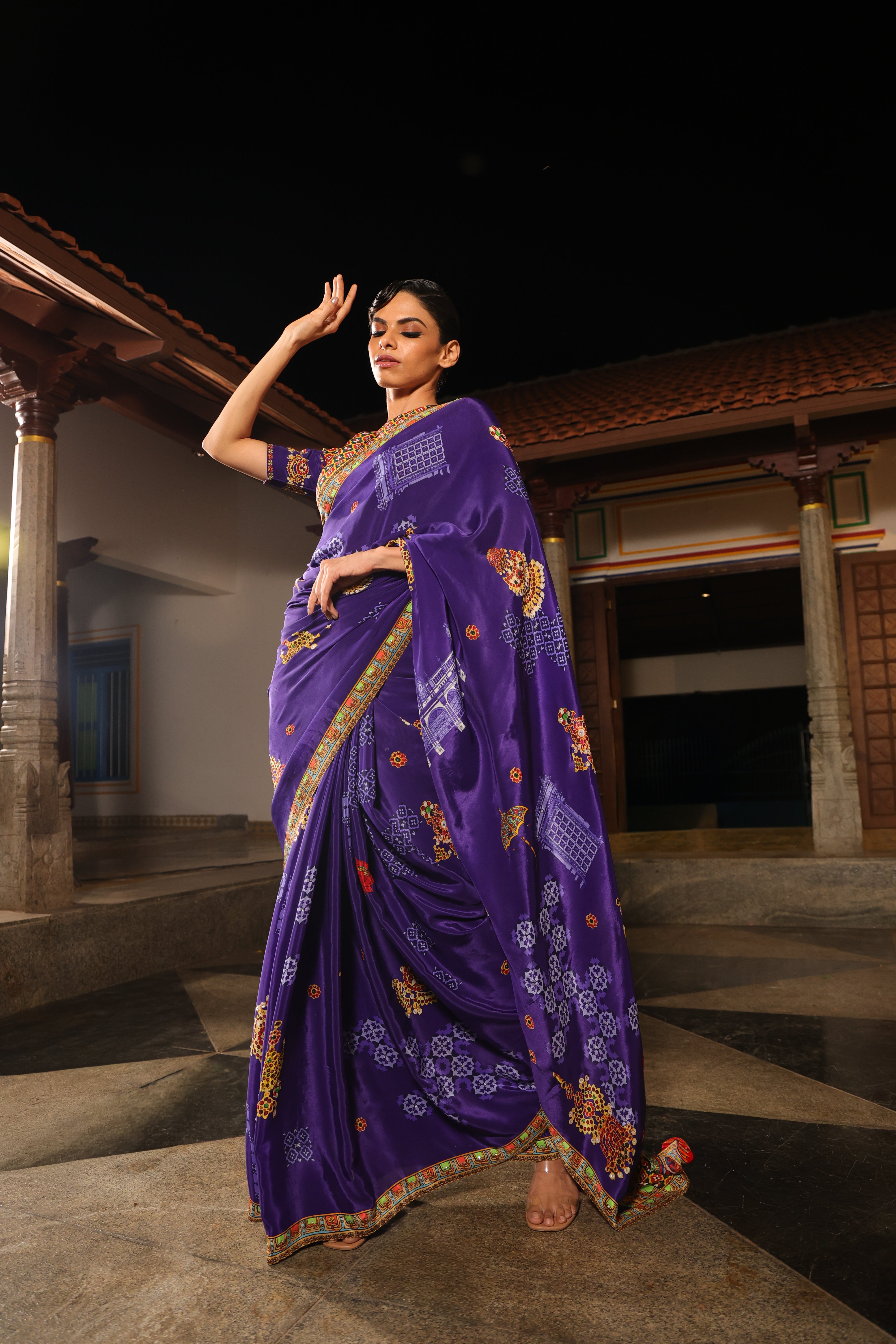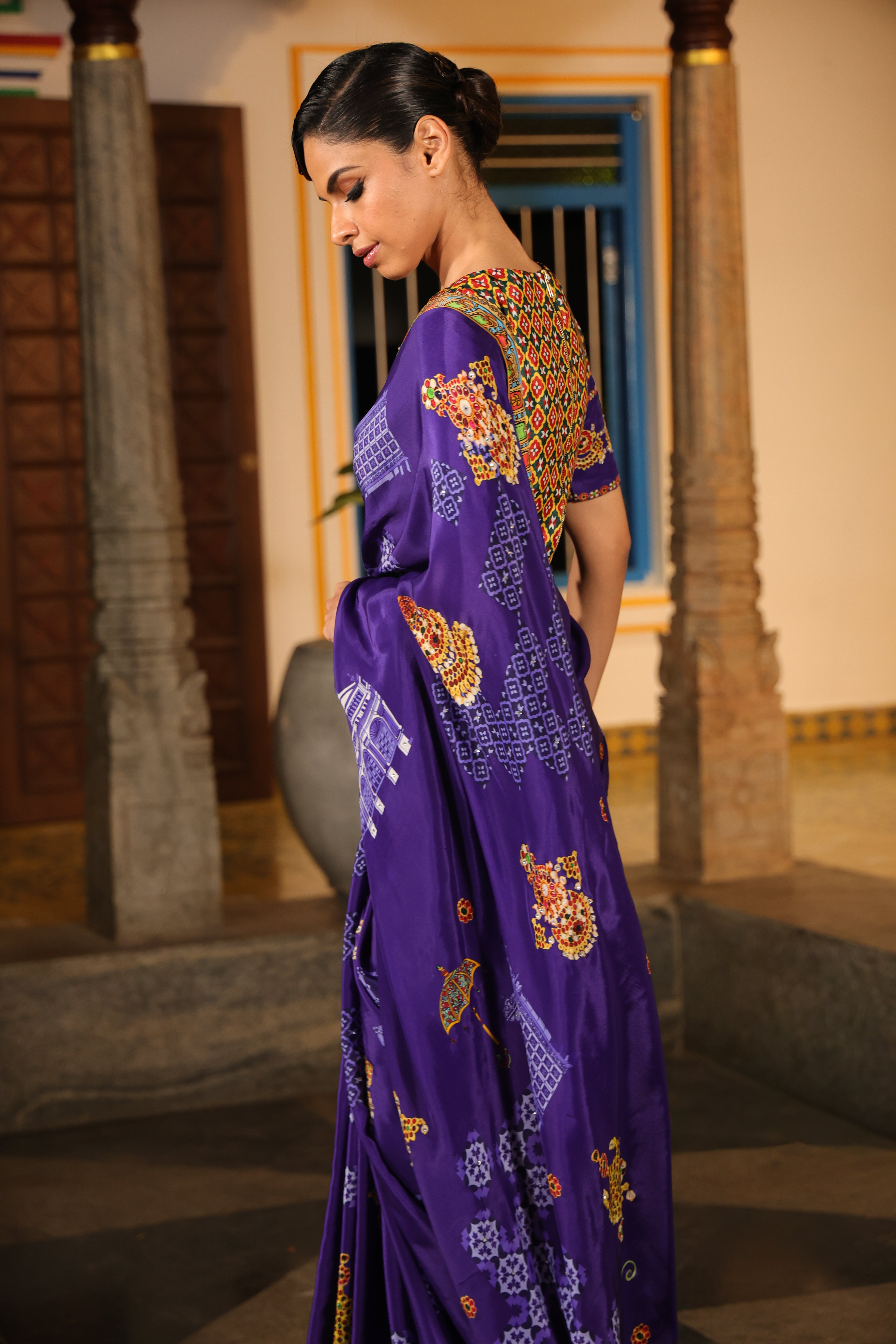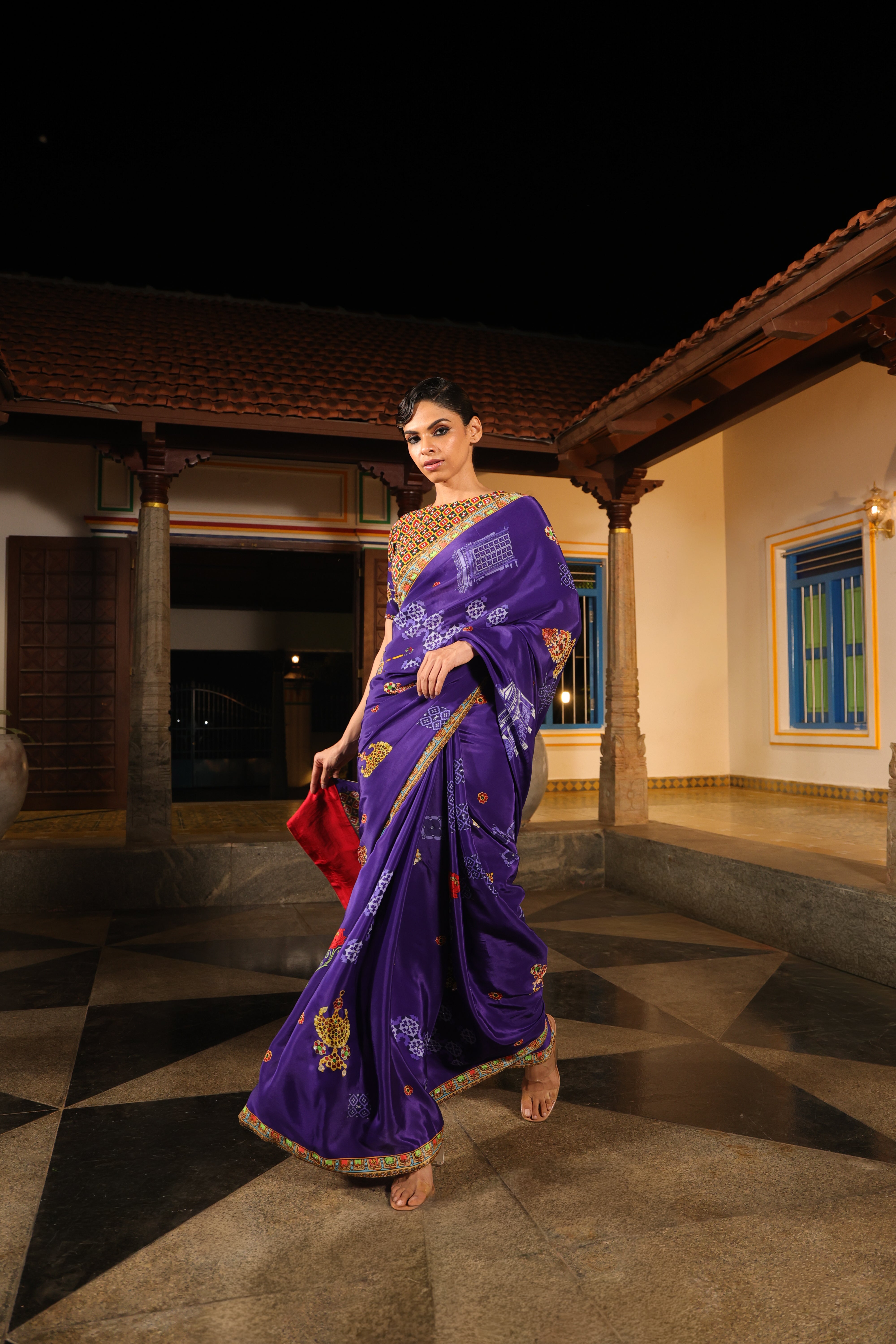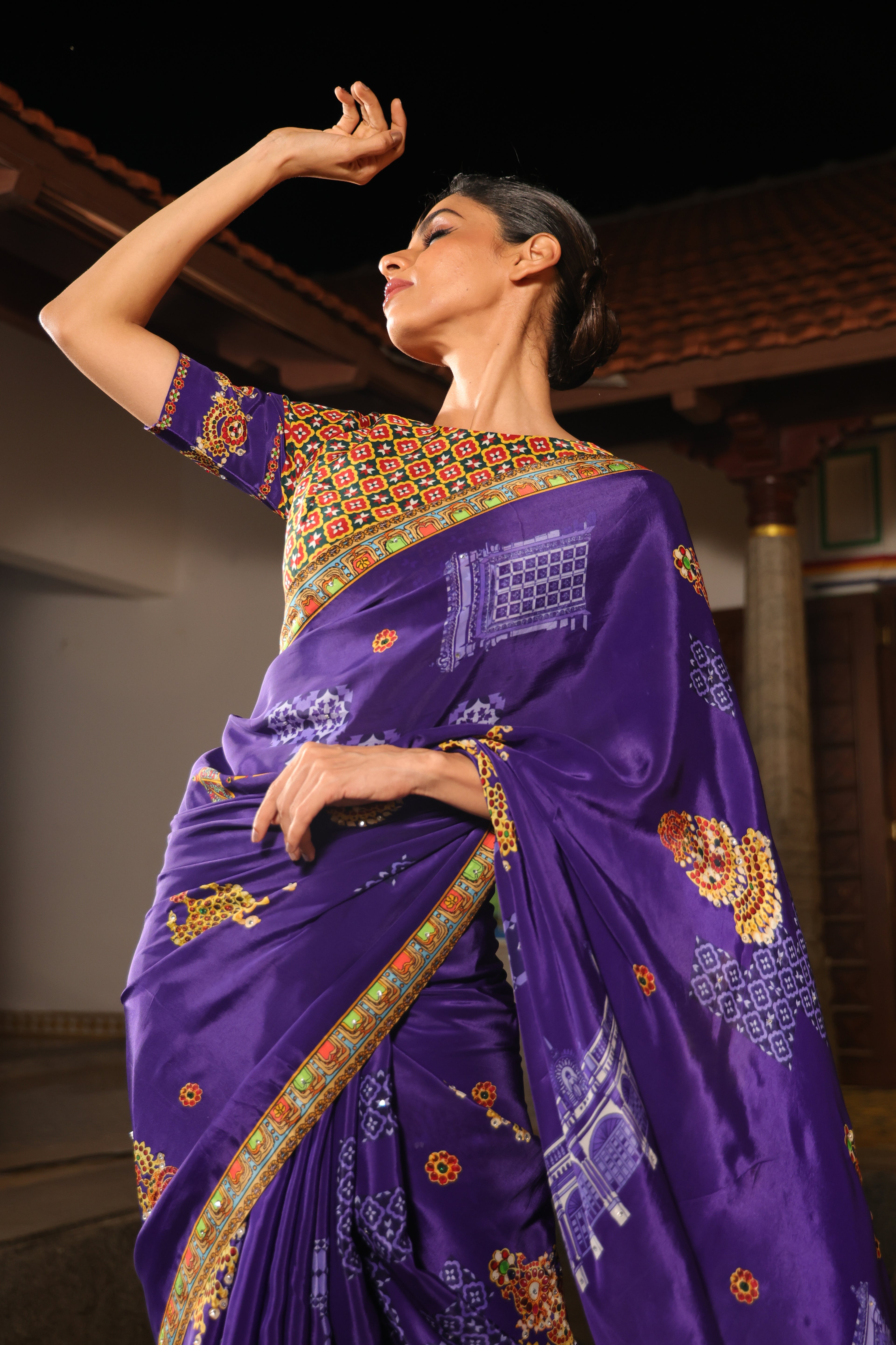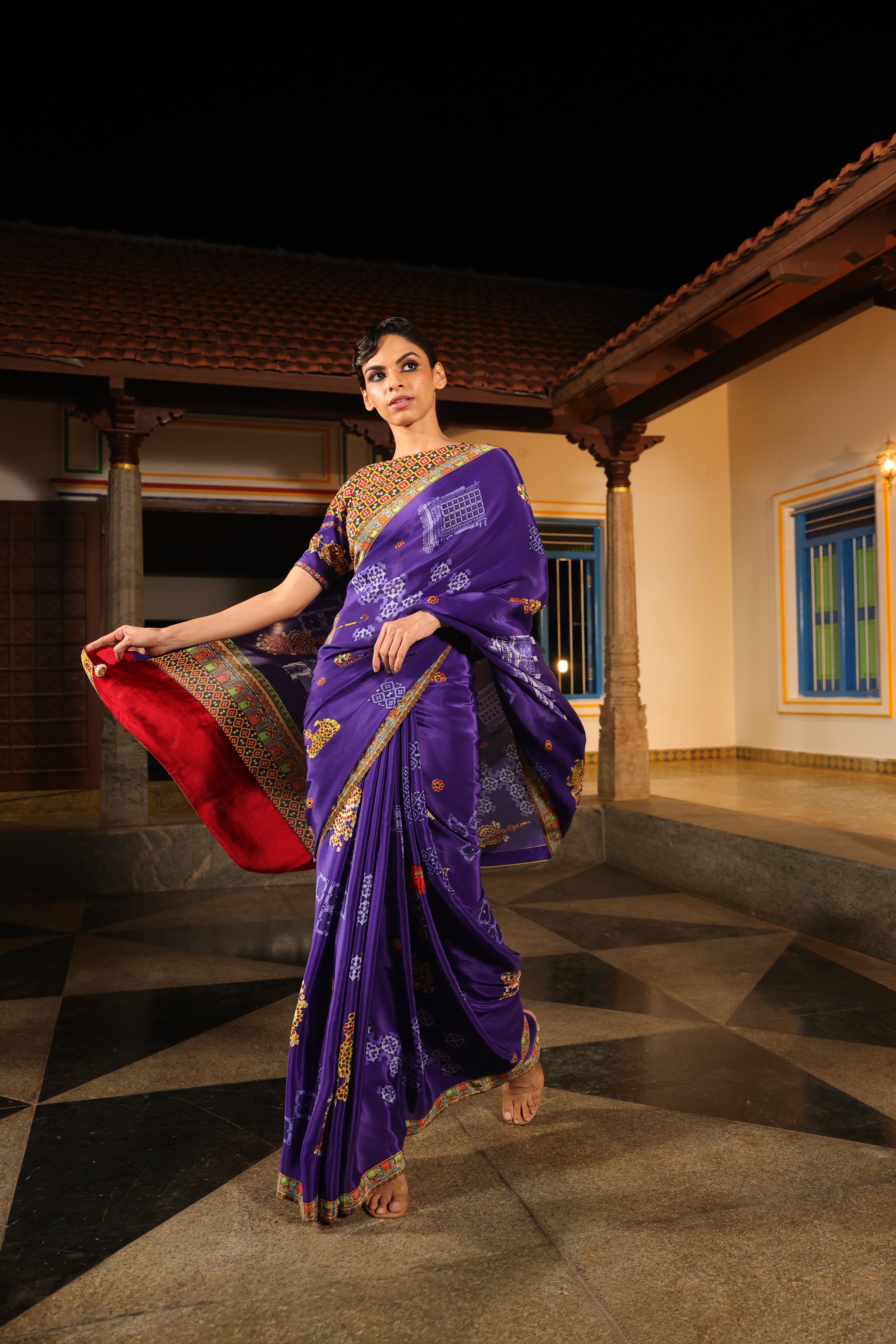 5.5 Meters with chettinad architechture print and jewellery print embellished with stone embroidery.