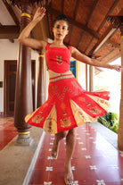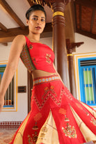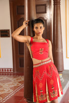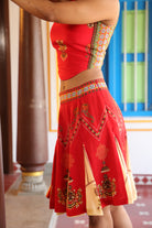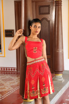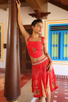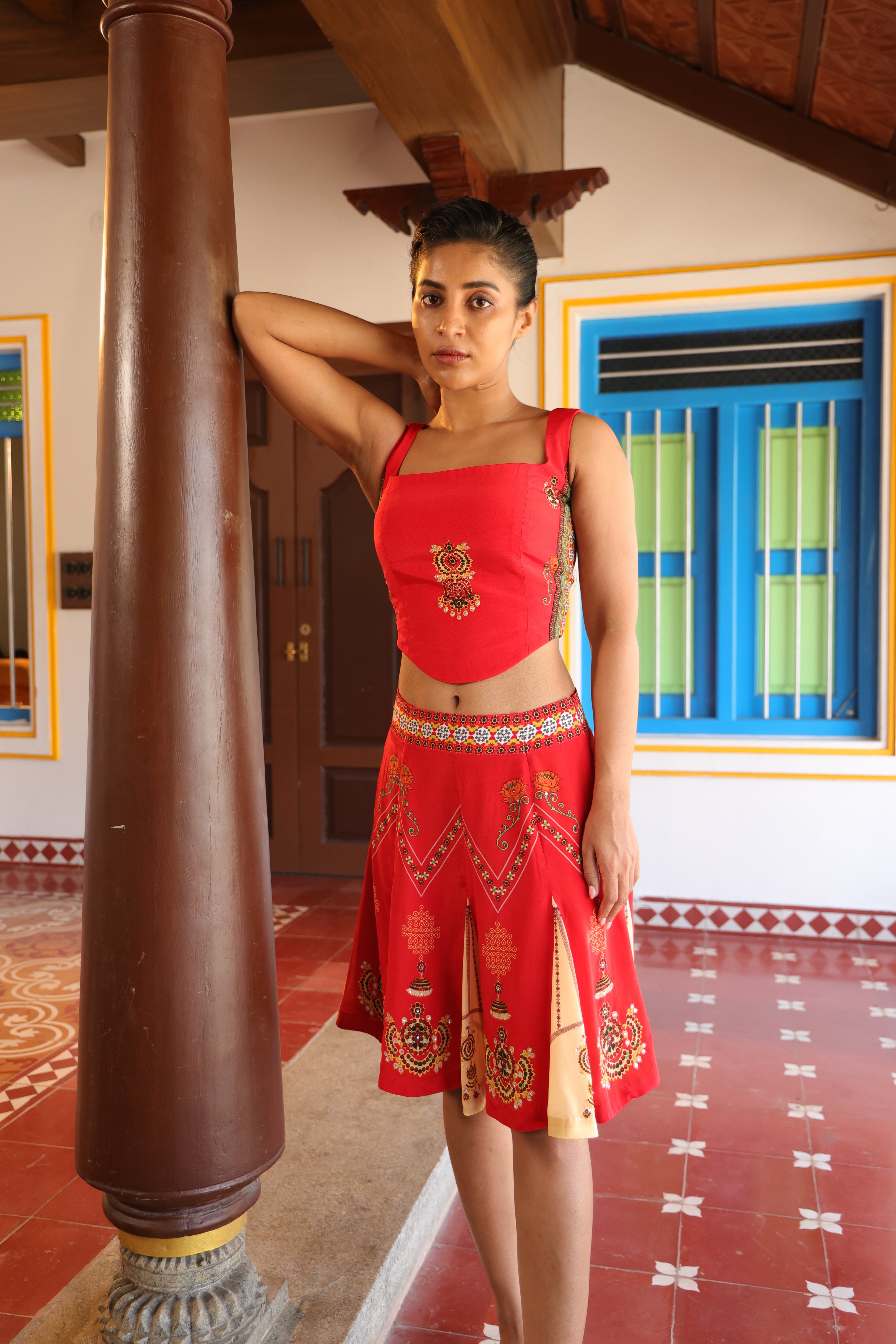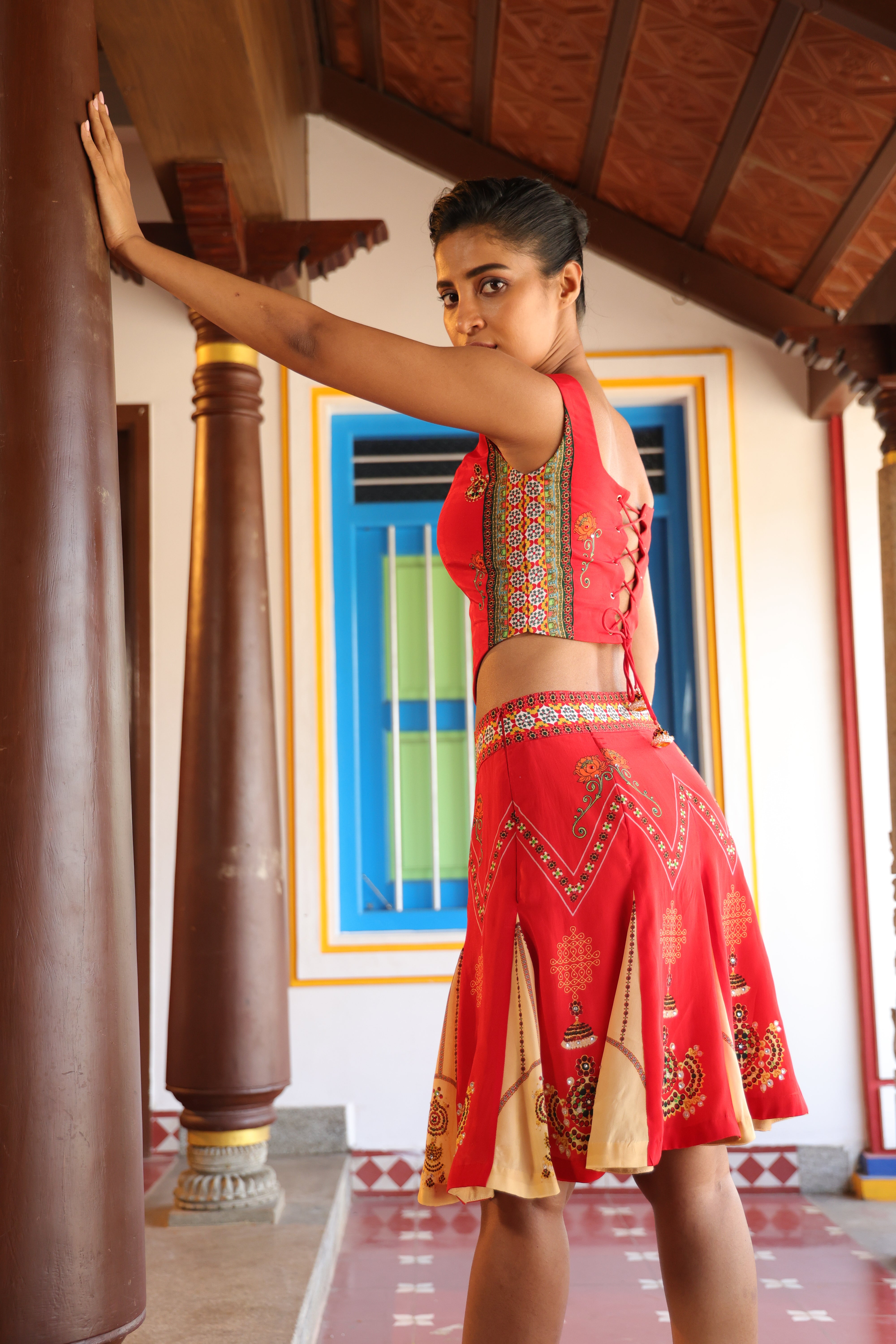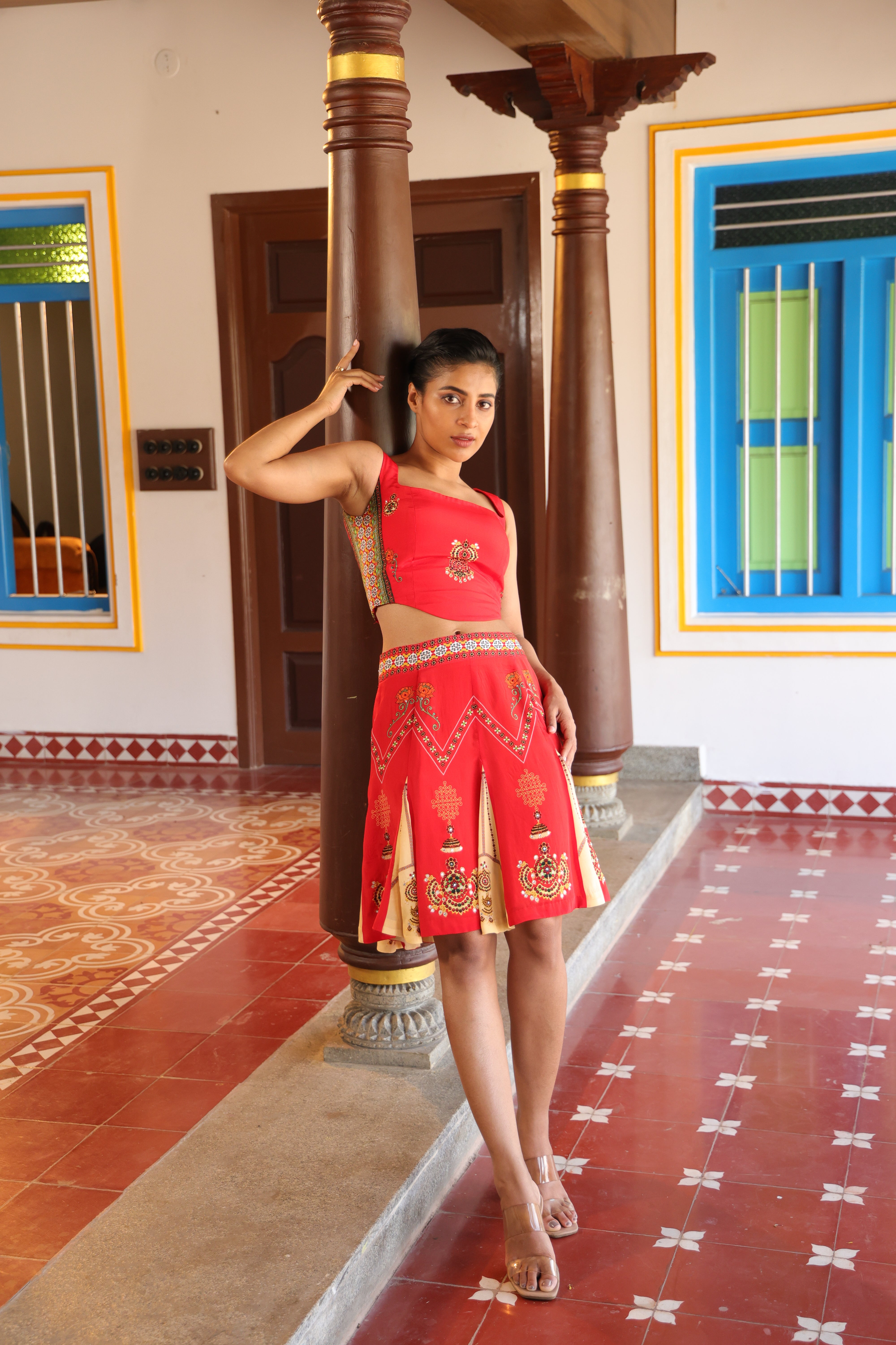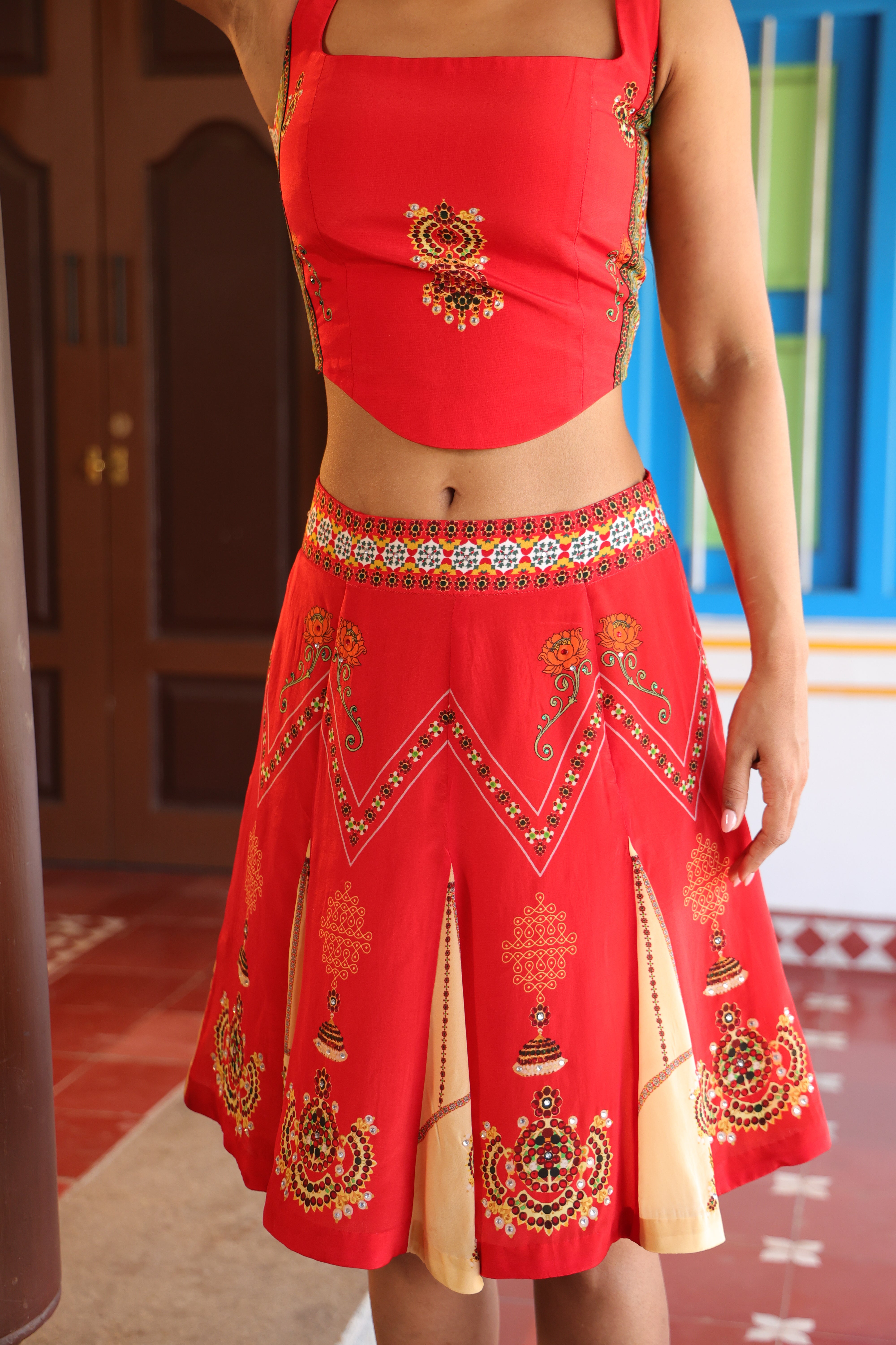 Teamed with short kali skirt which has chettinad architechture and jewellery print with stone embroidery.