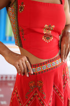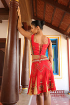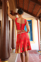 Corset top with chettinad architechture and jewellery print with stone embroidery back open, metal rivet with jhumka.