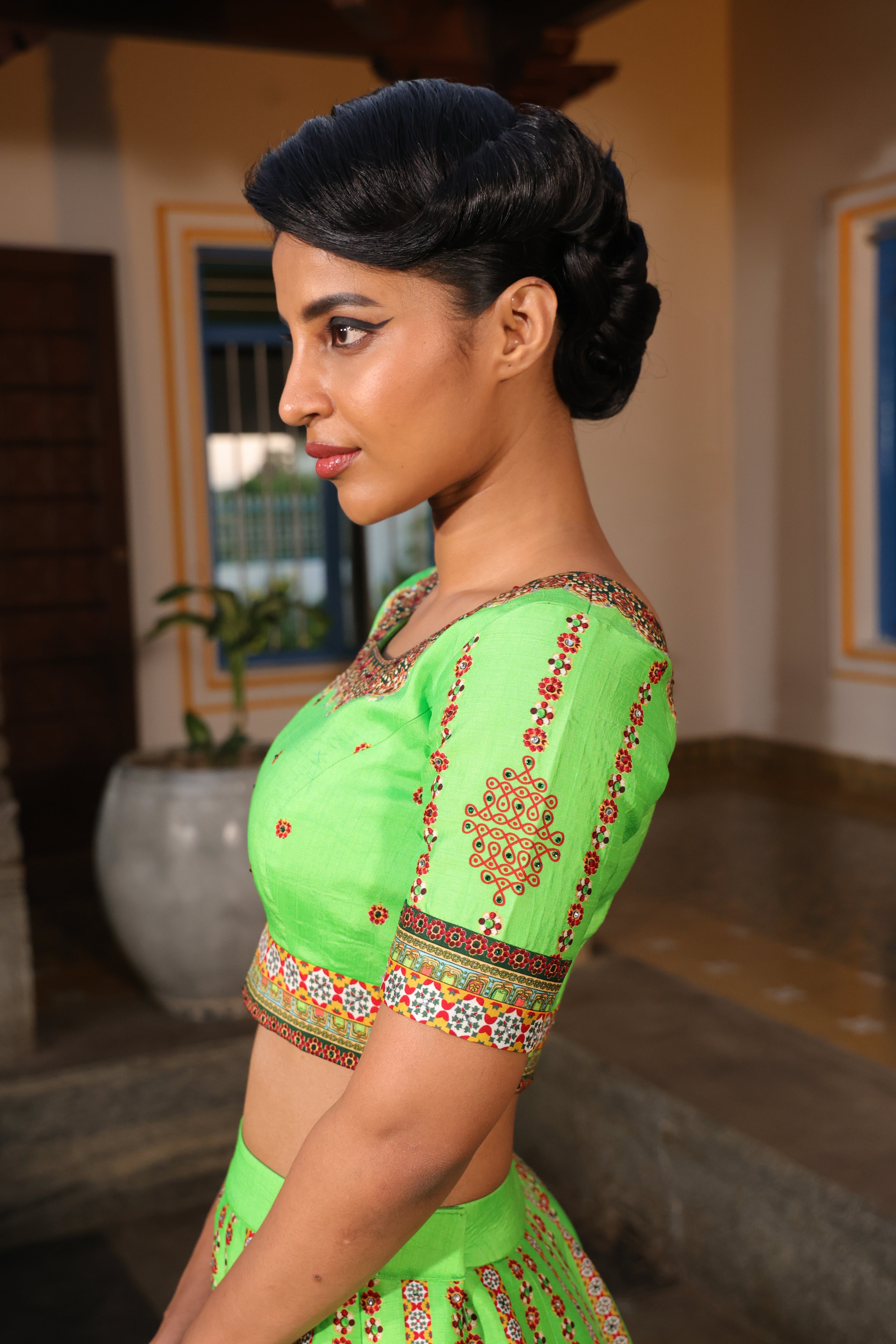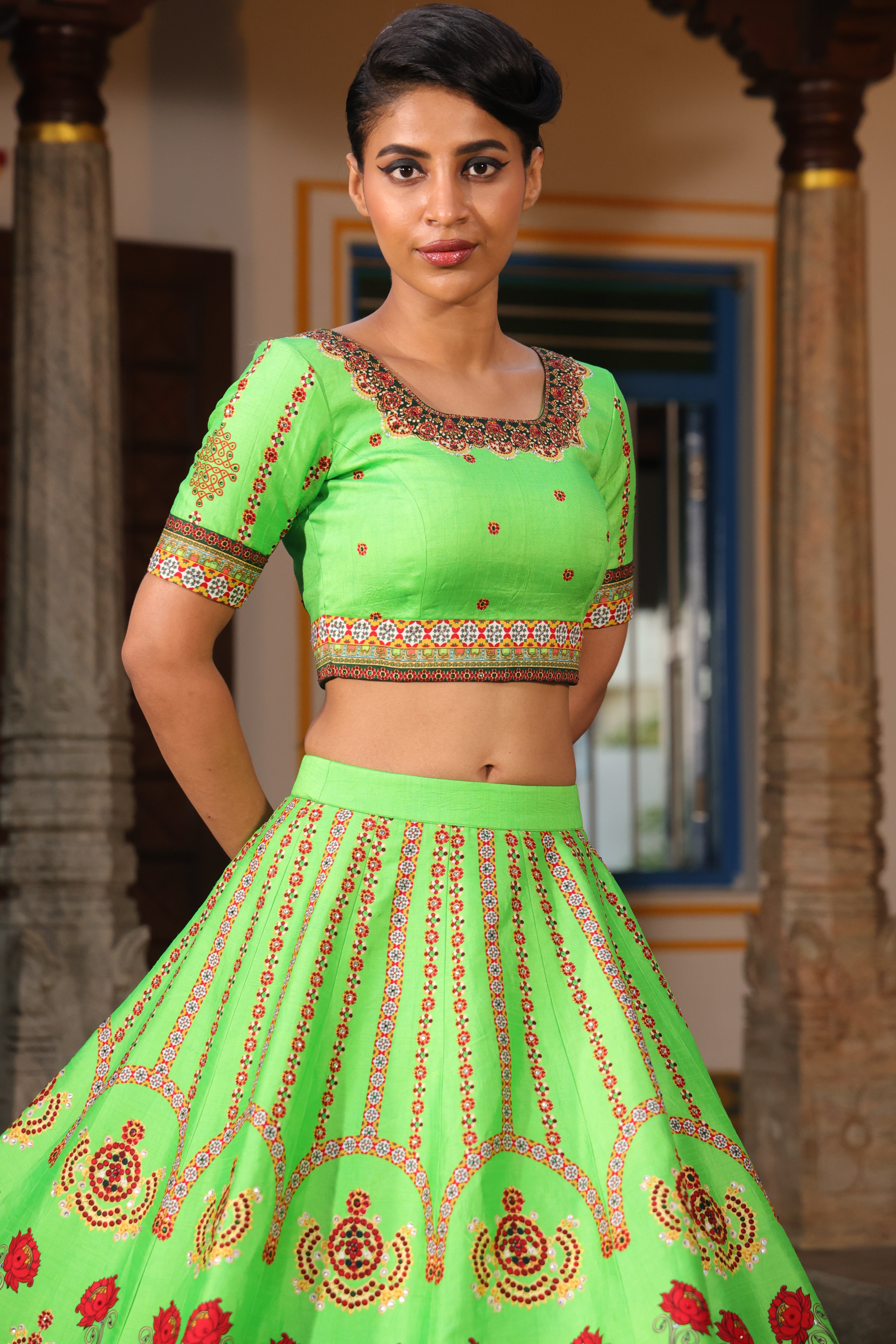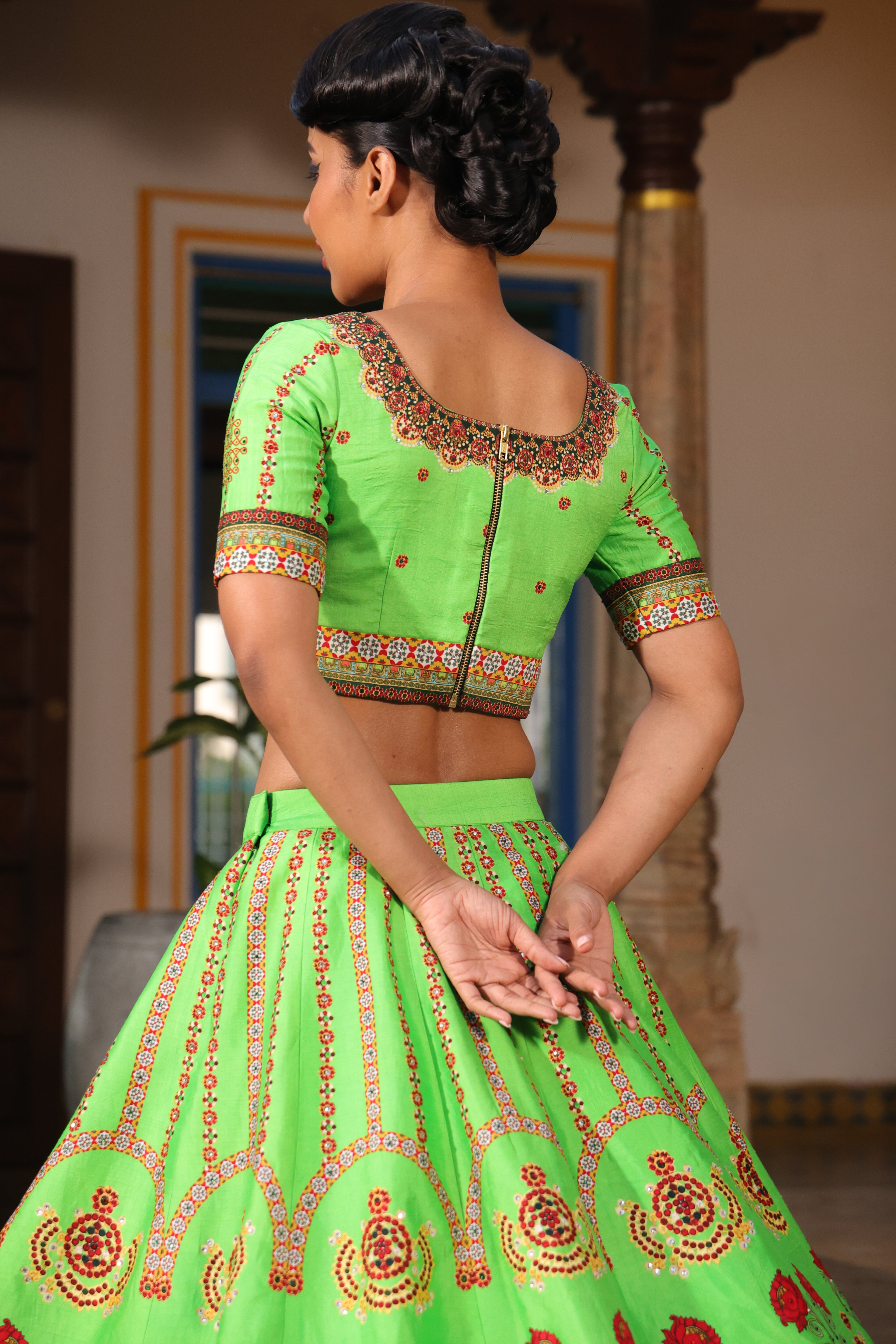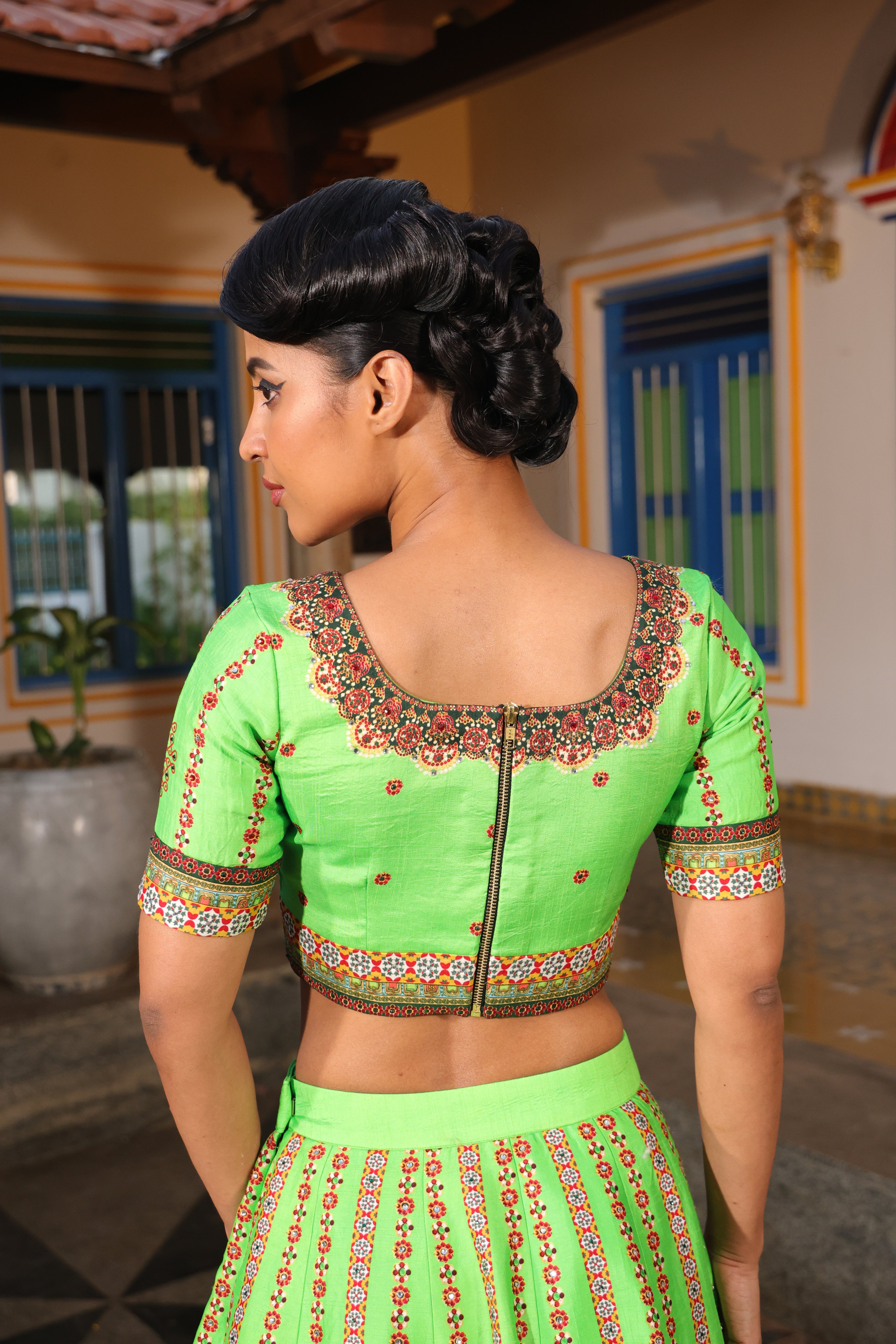 Round neck blouse, back open, metal zipper, short sleeves with chettinad architechture print and jewellery print embellished with stone embroidery.