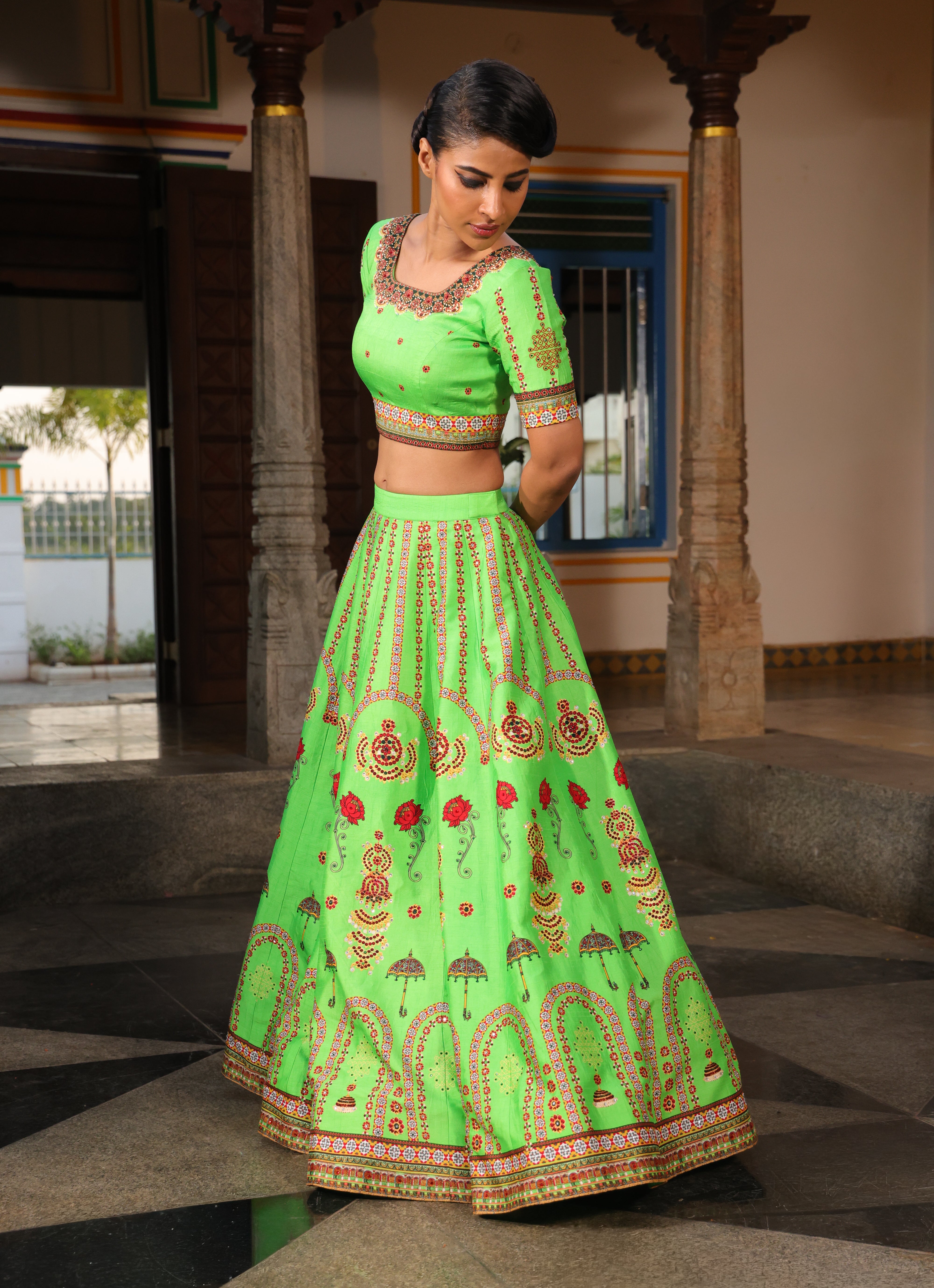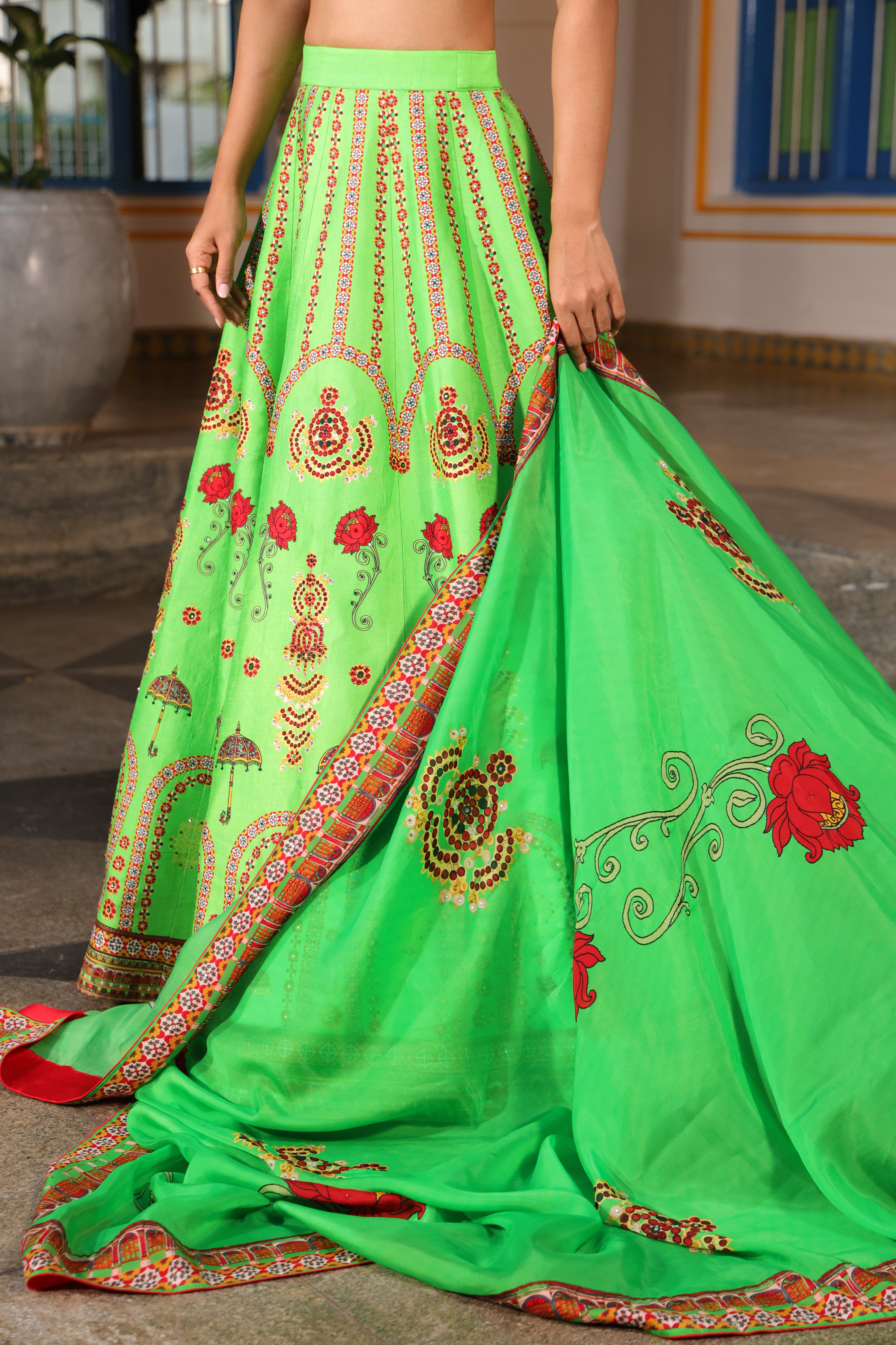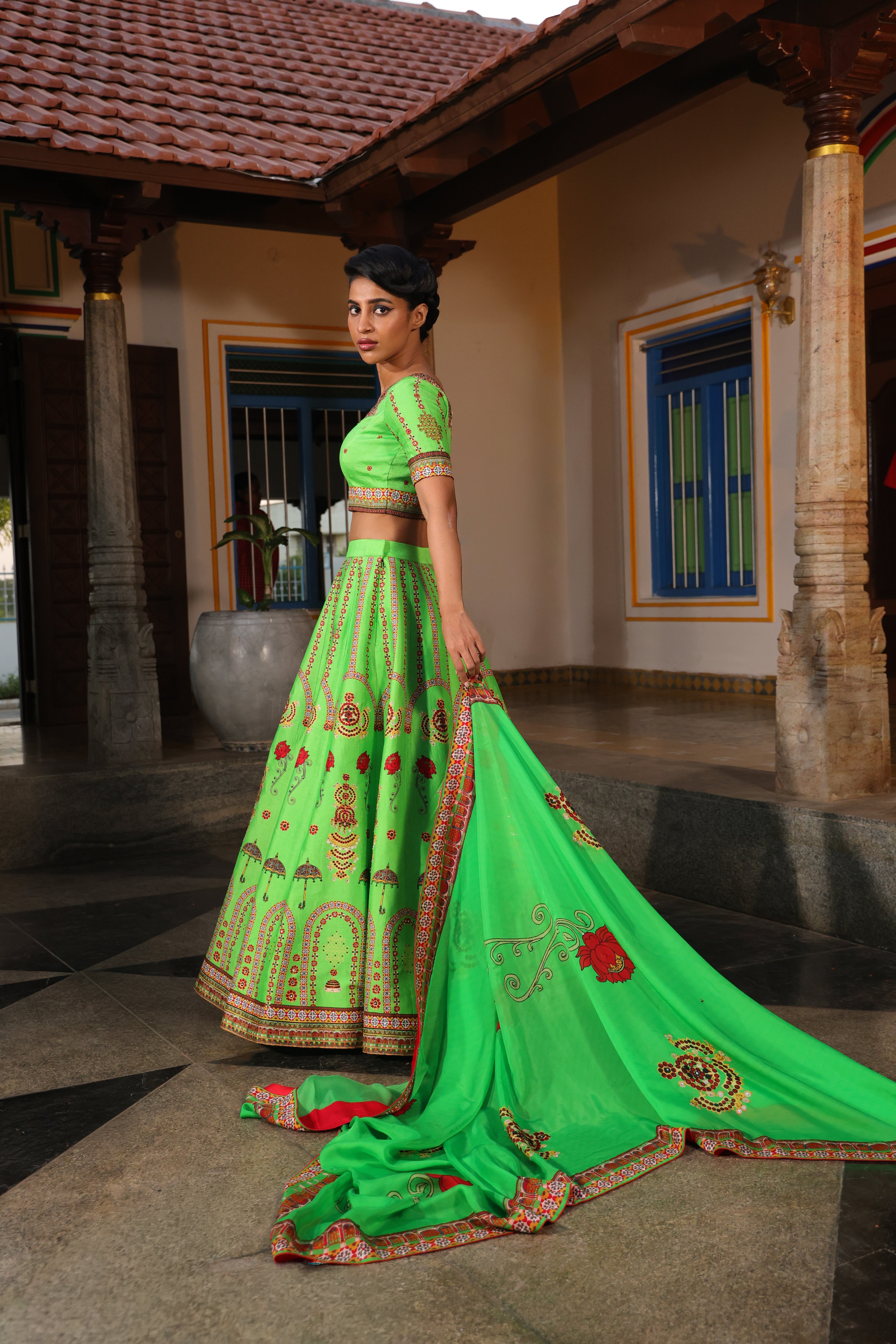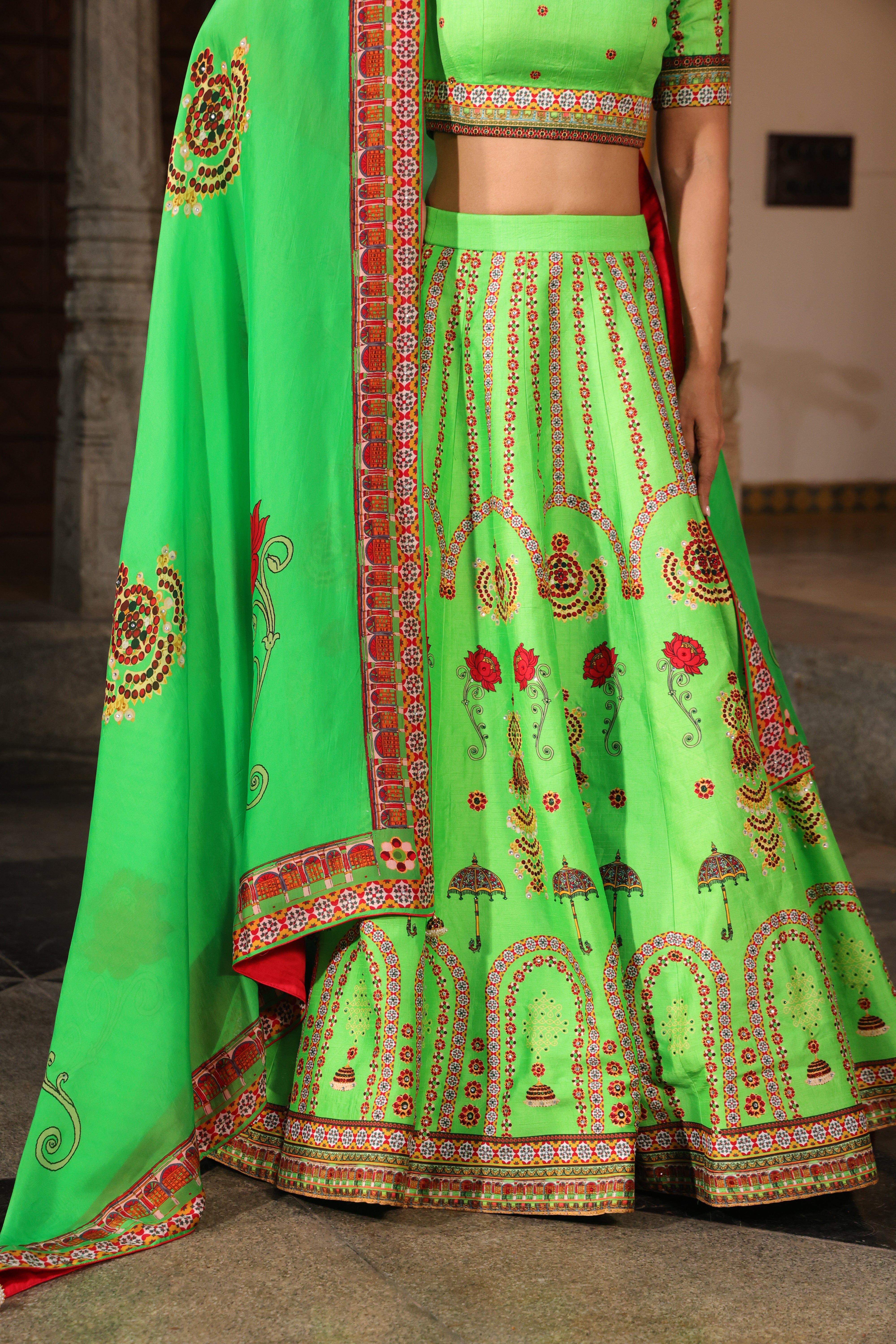 Multiple kalli lehenga with chettinad architechture print and jewellery print embellished with stone embroidery.