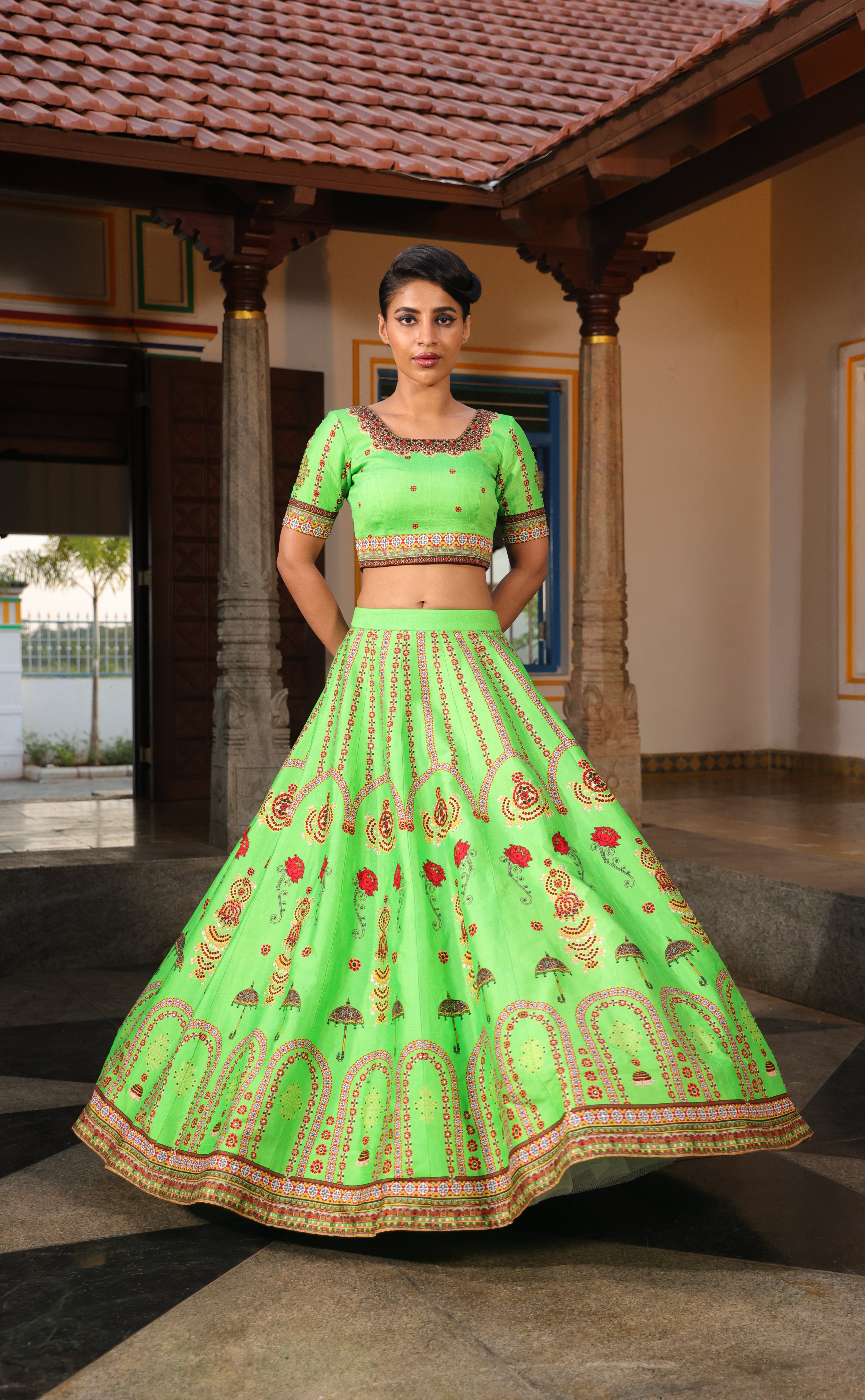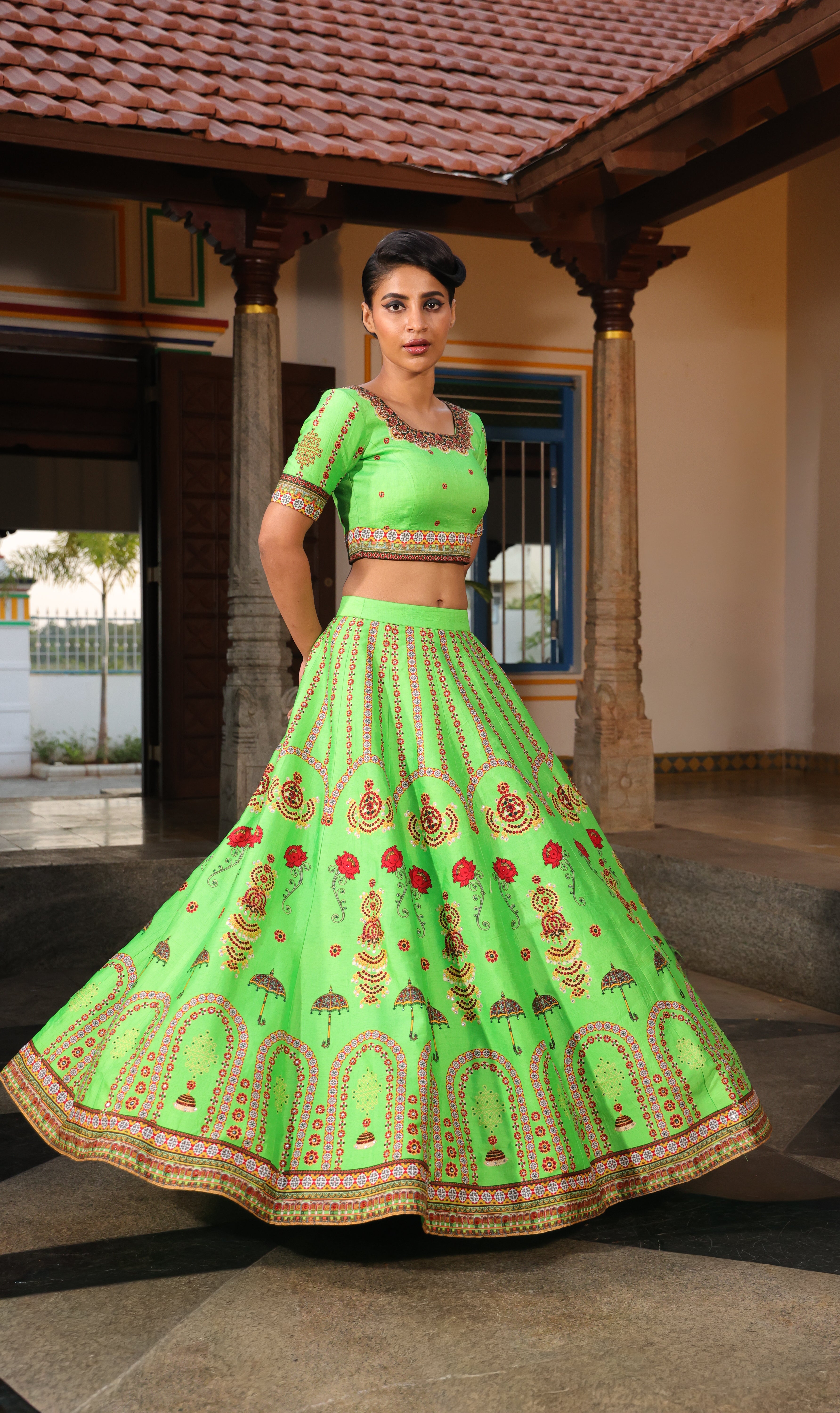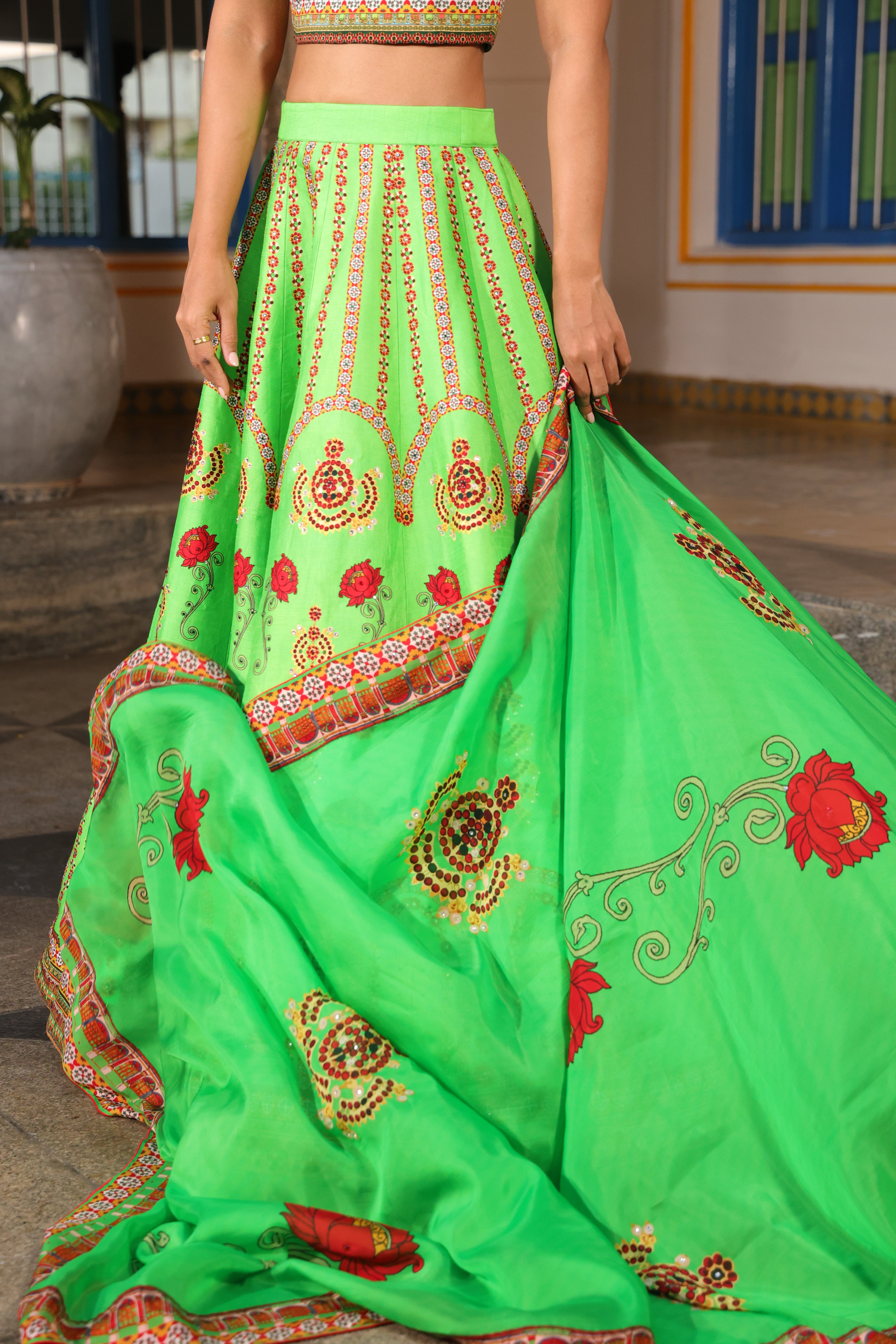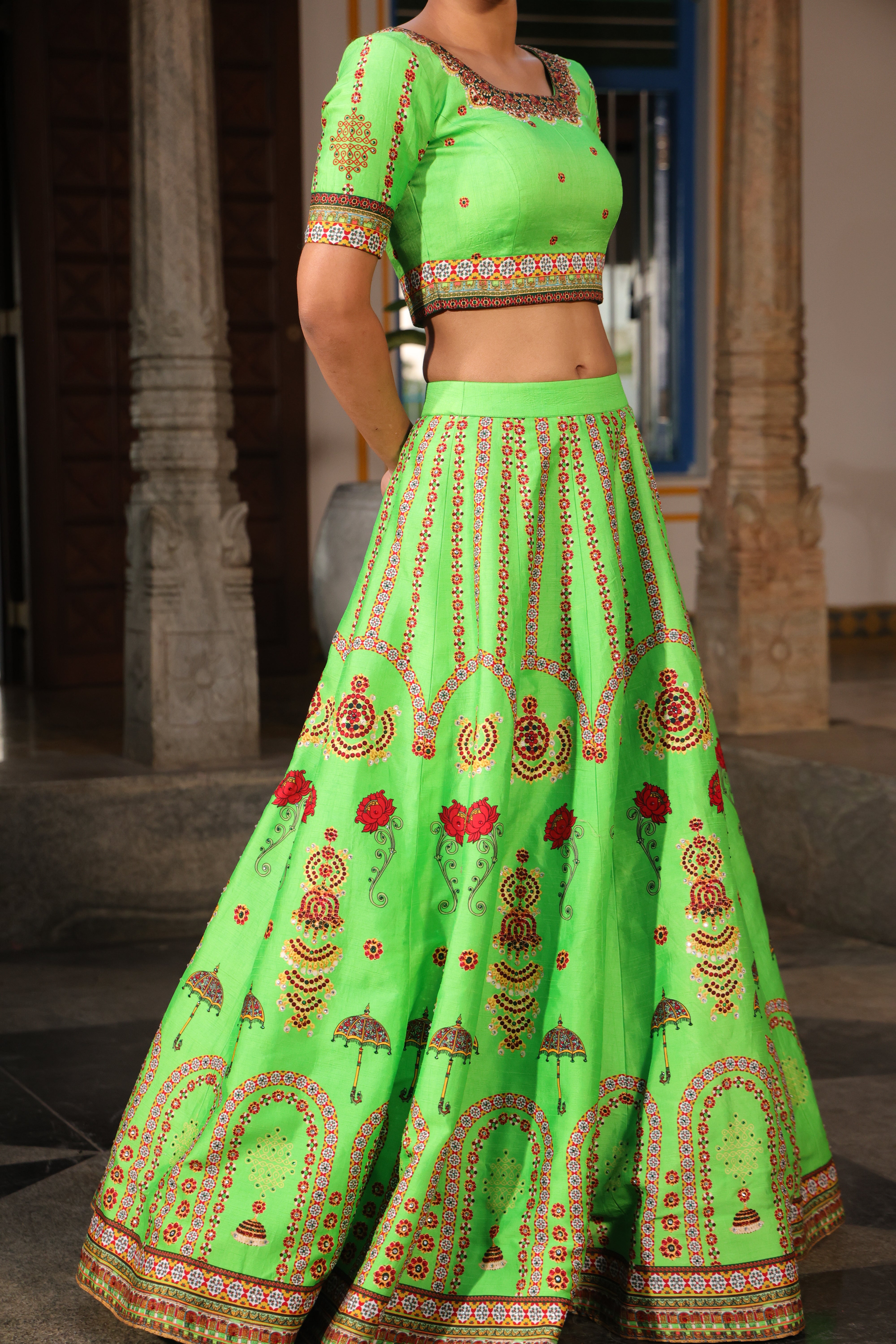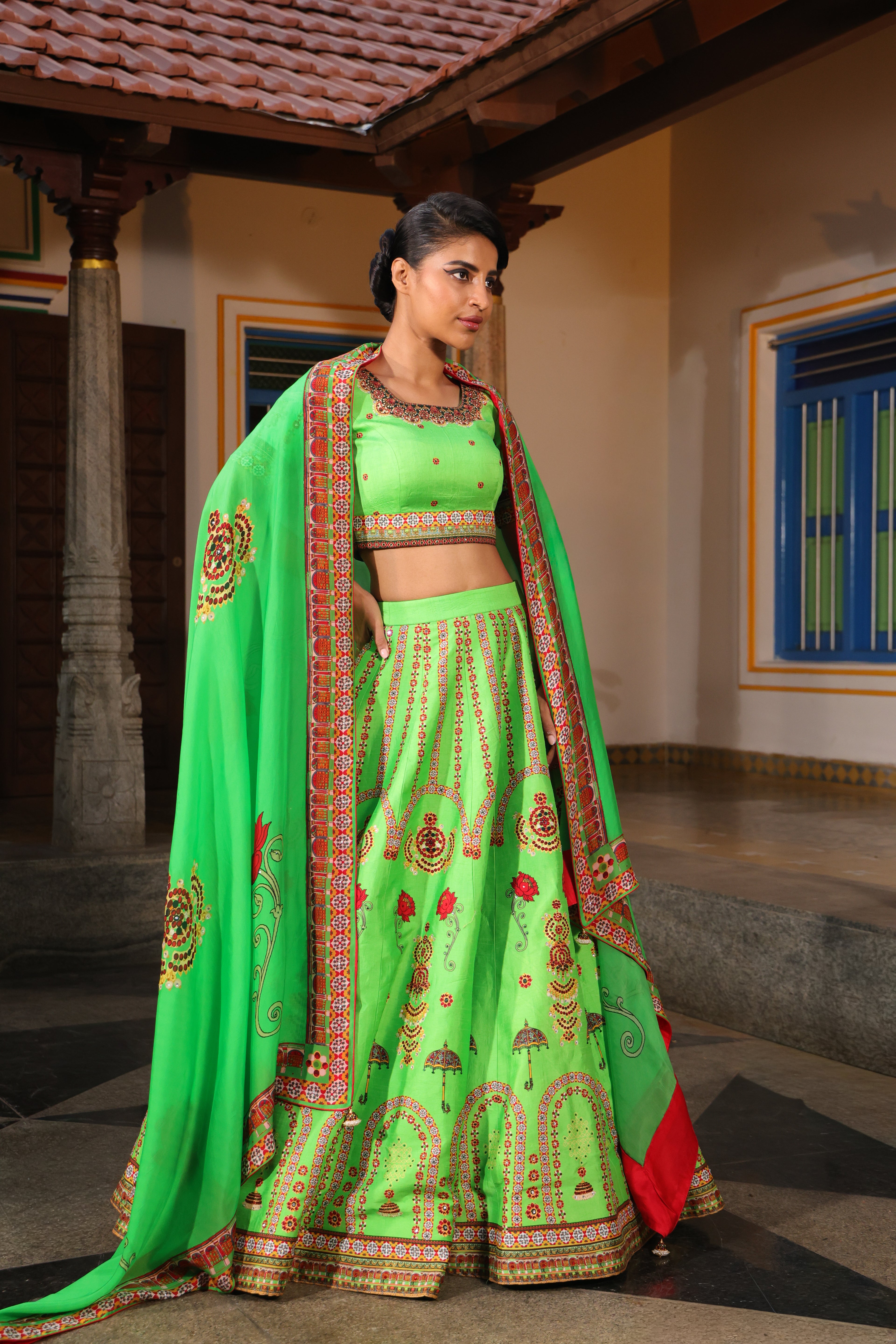 Multiple kalli lehenga with chettinad architechture print and jewellery print embellished with stone embroidery.