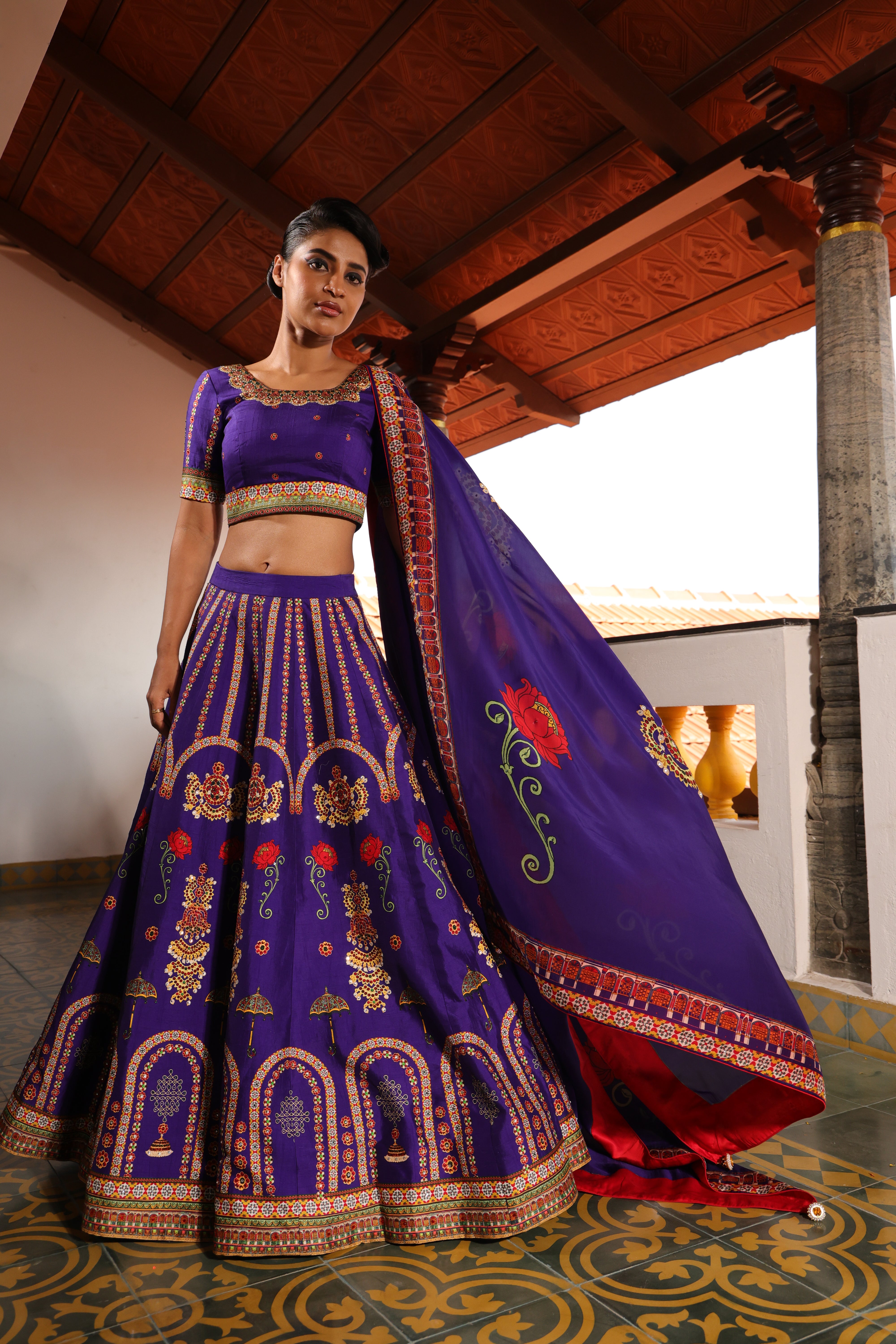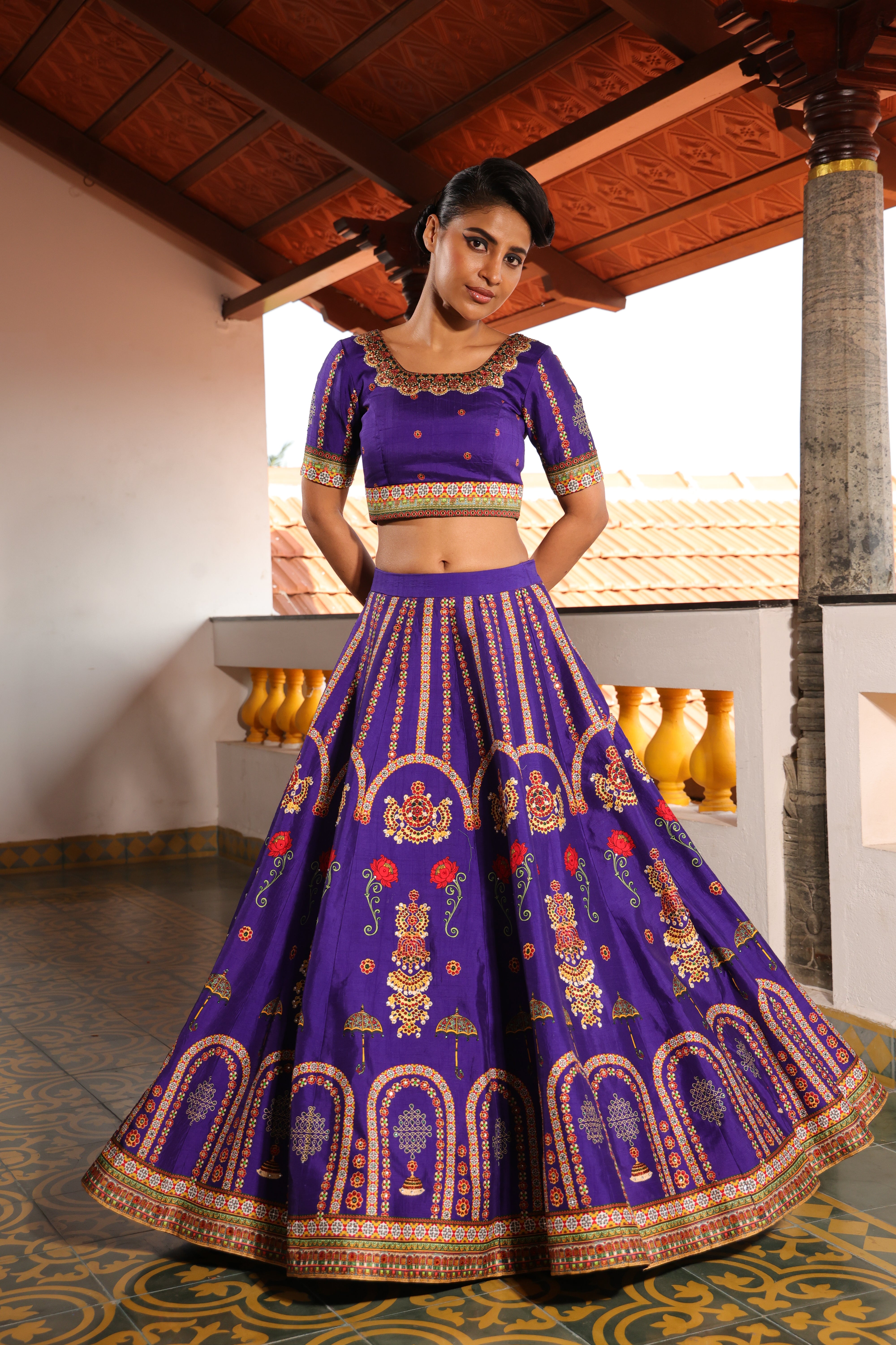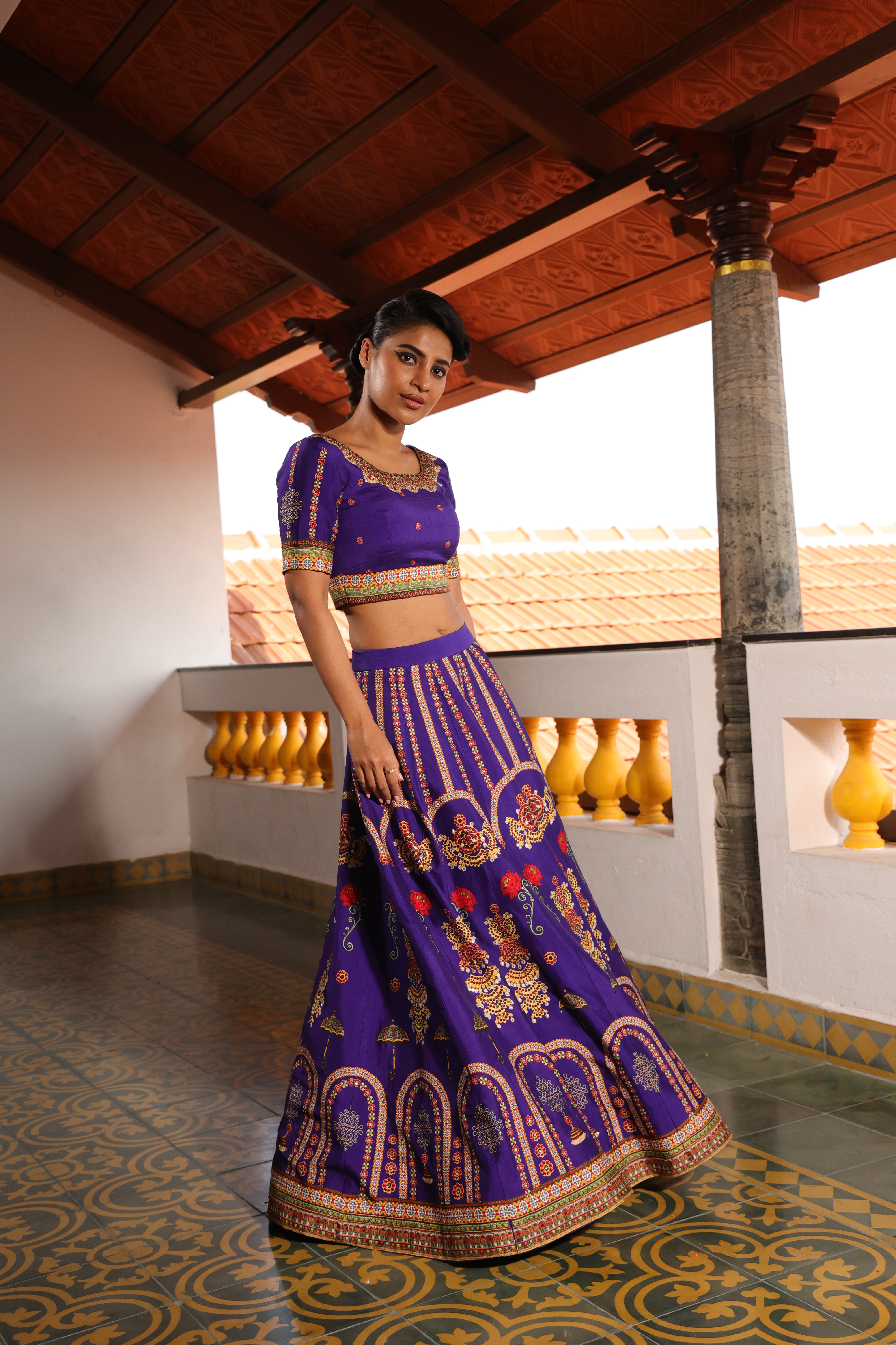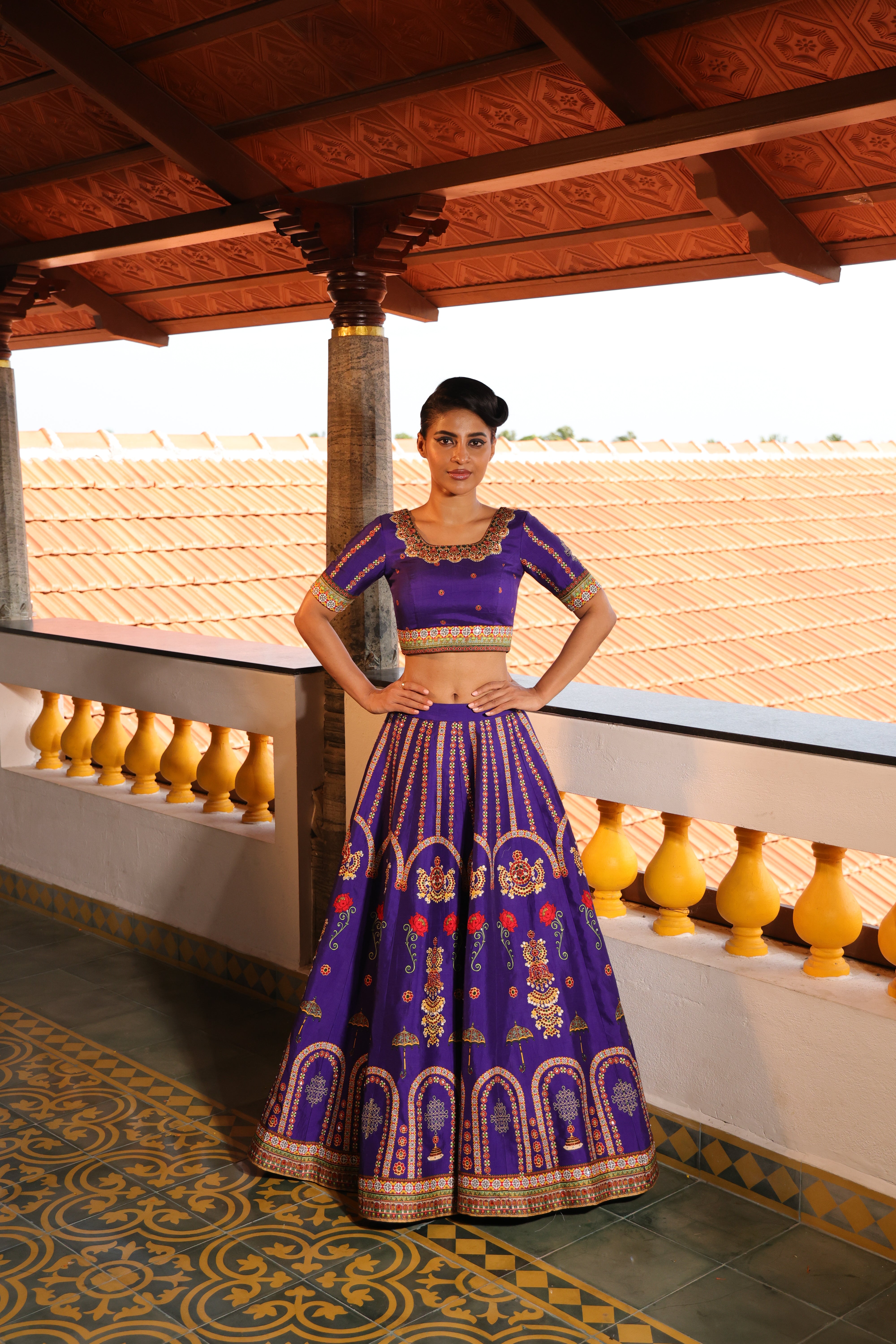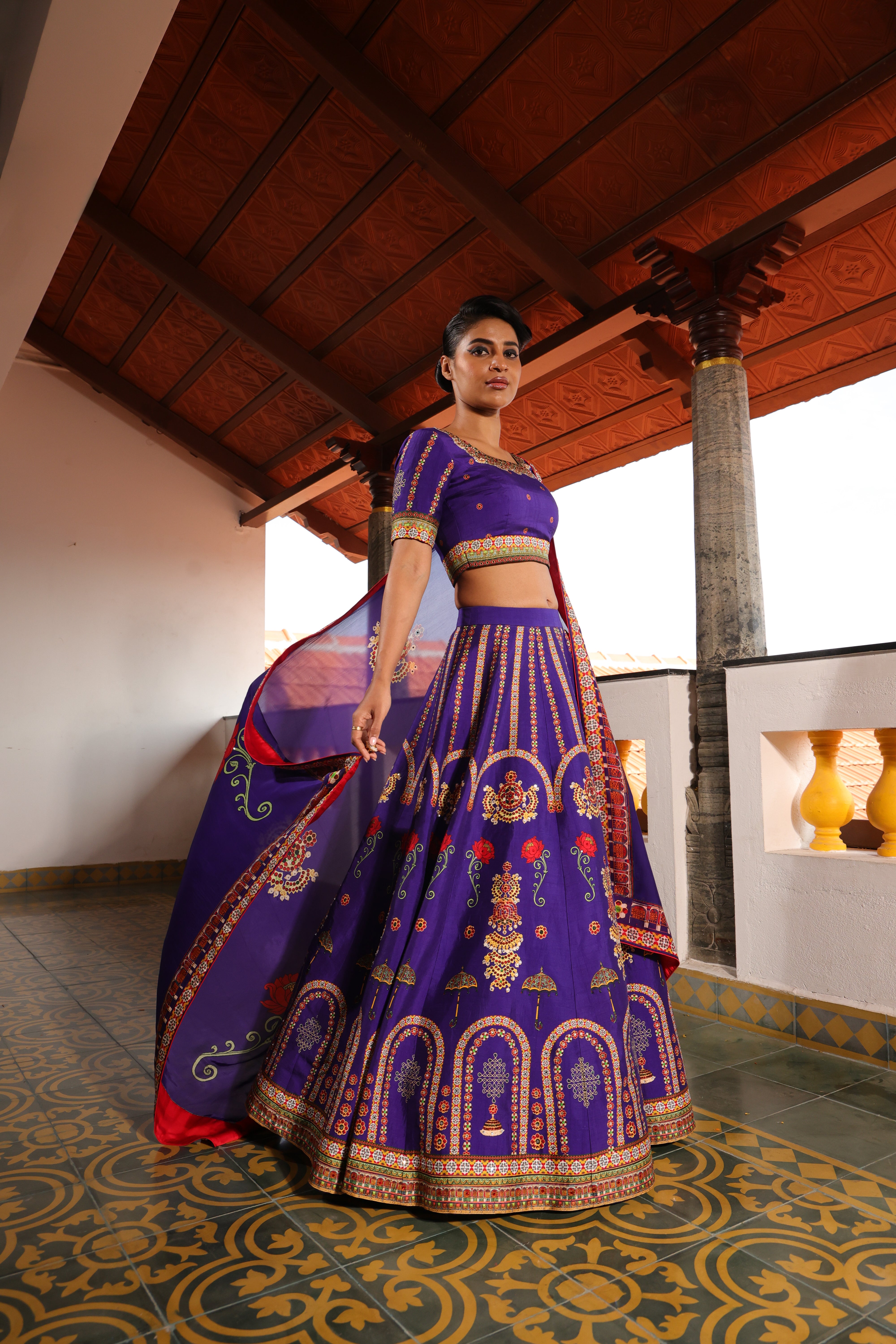 Multiple kalli lehenga with chettinad architechture print and jewellery print embellished with stone embroidery.