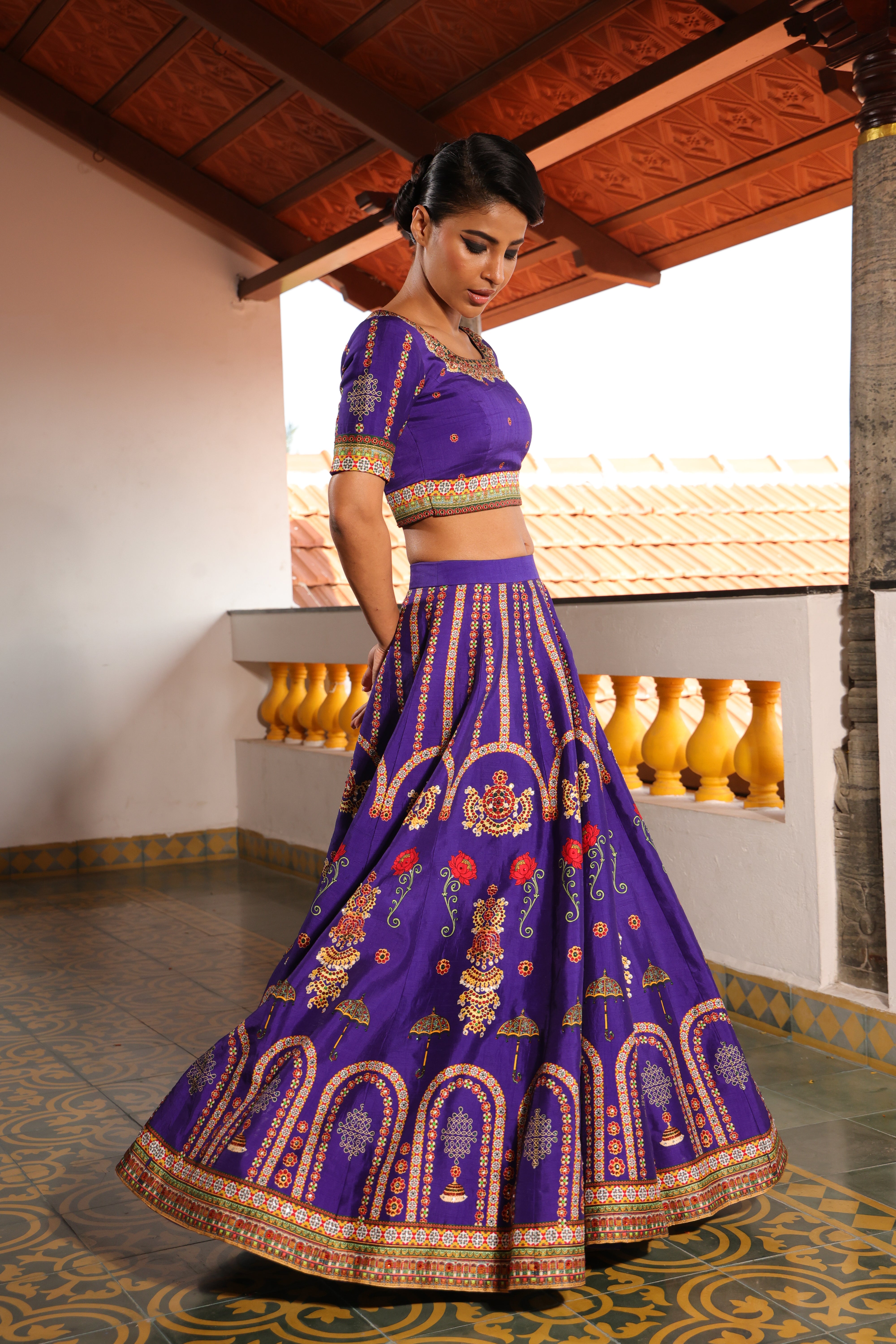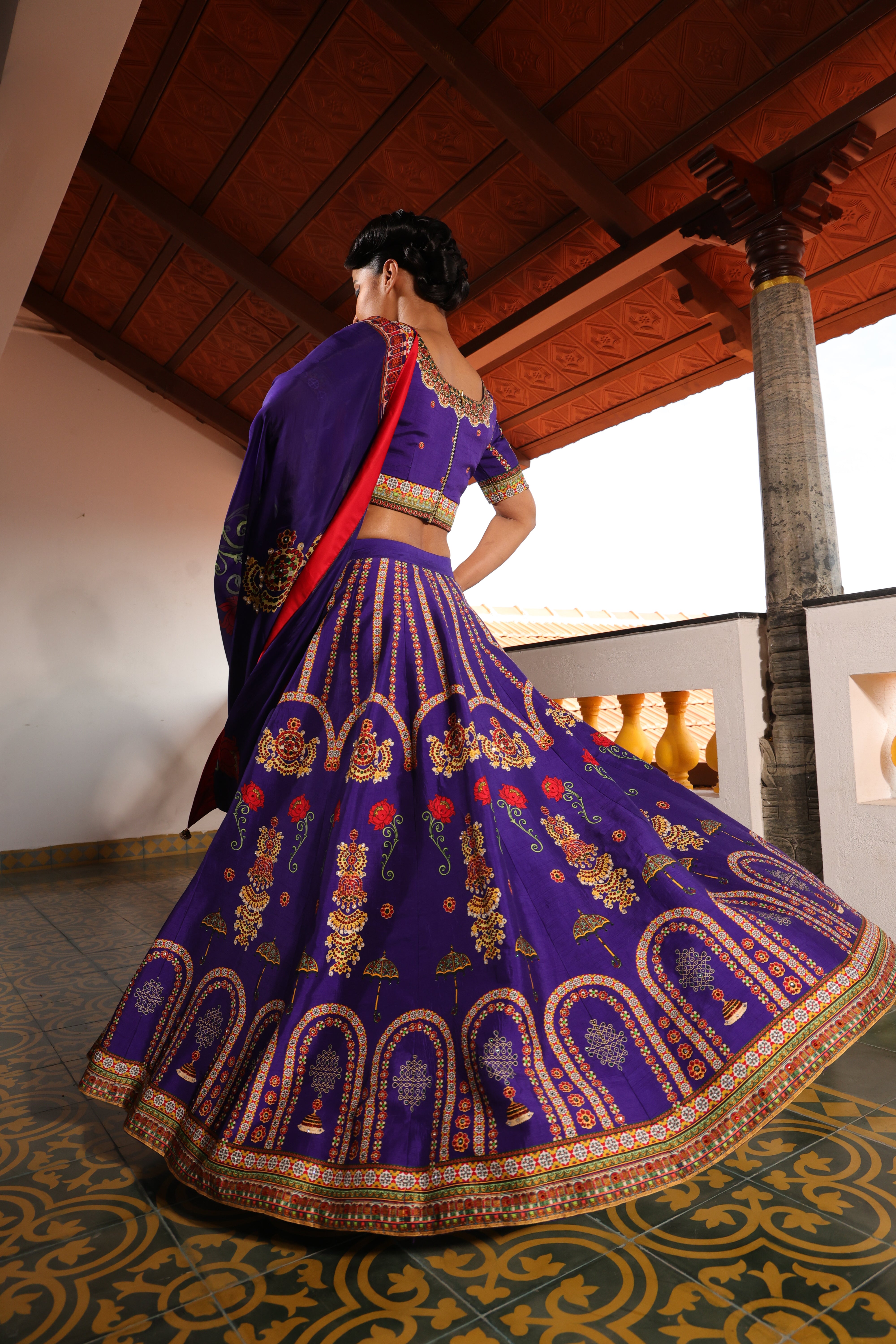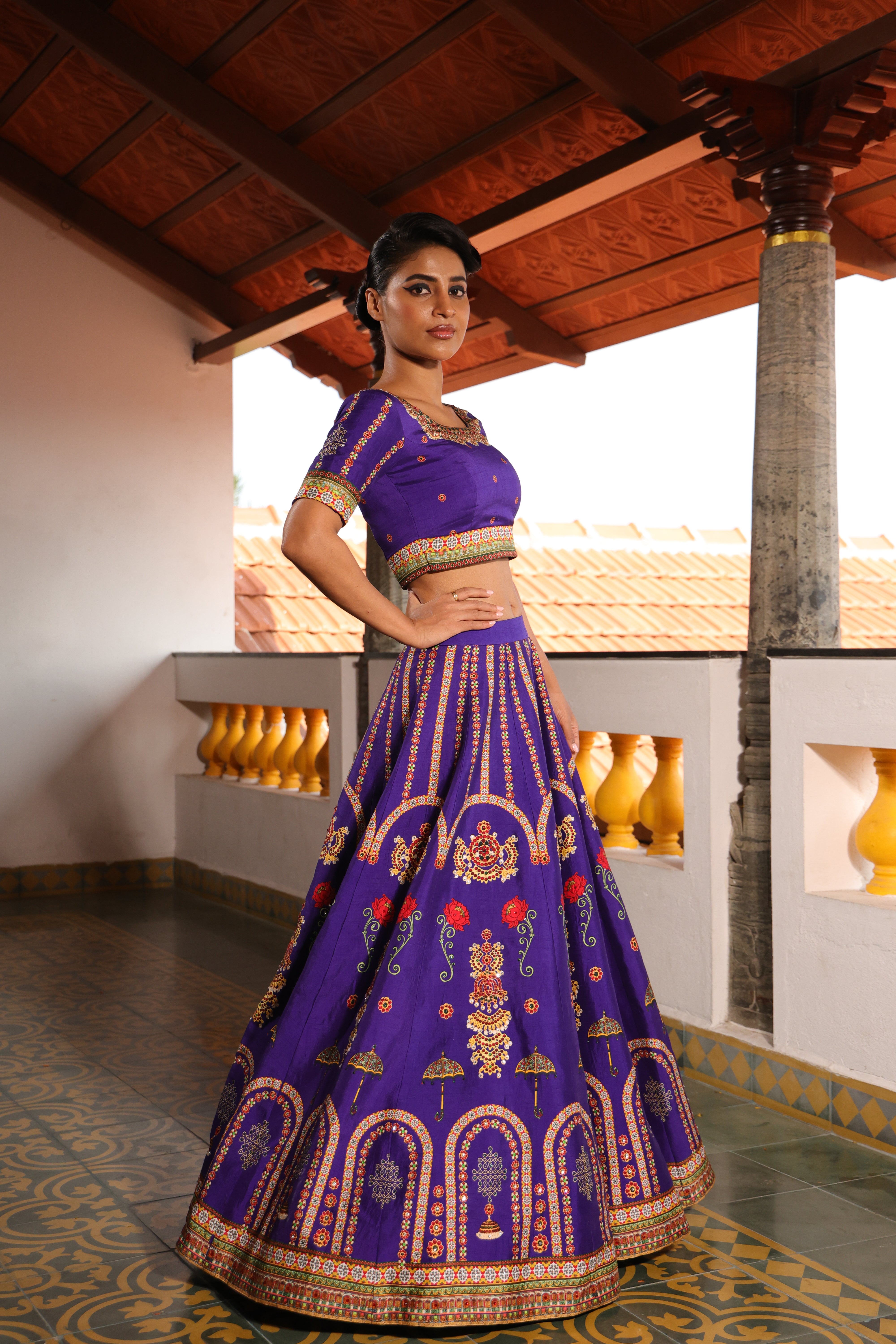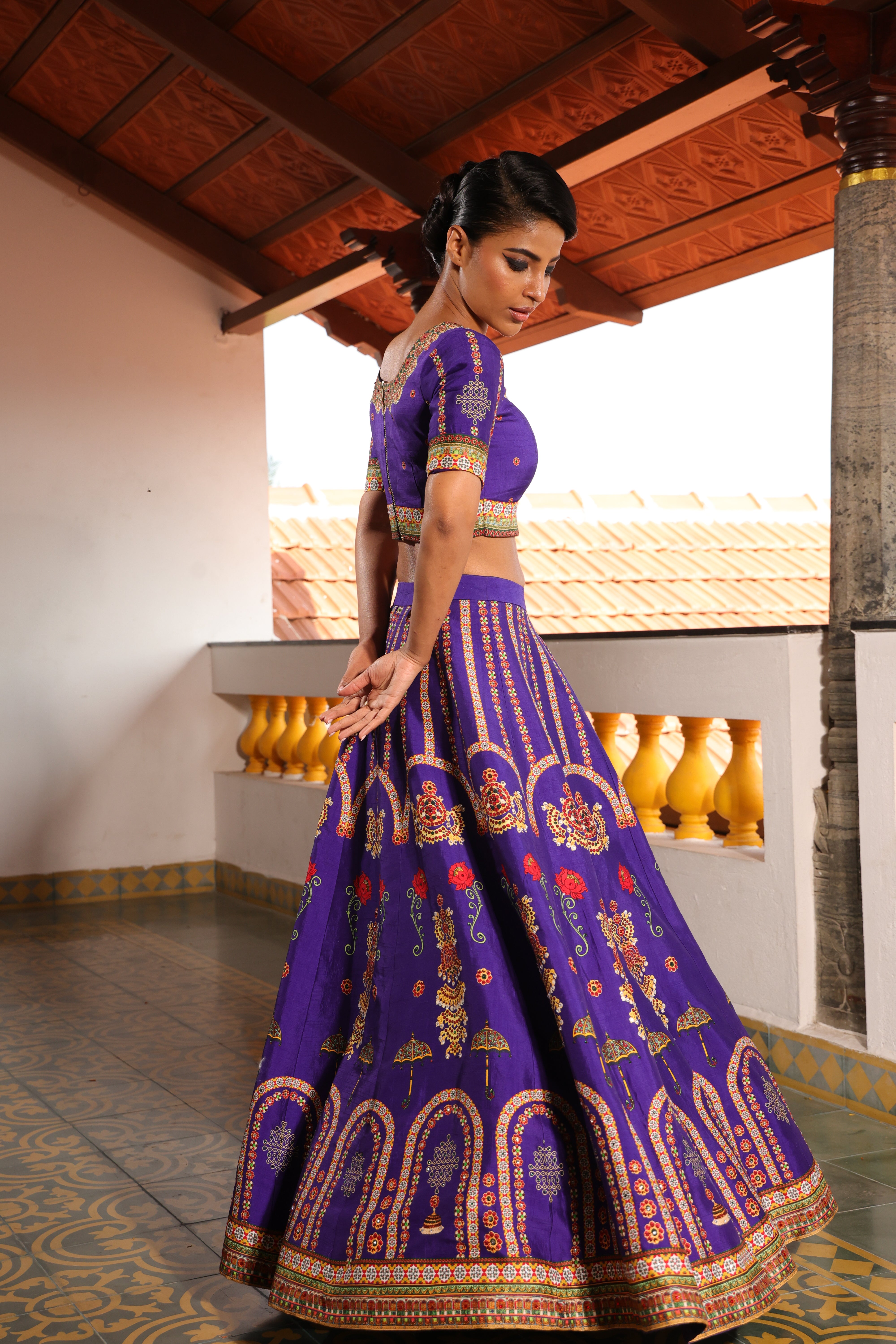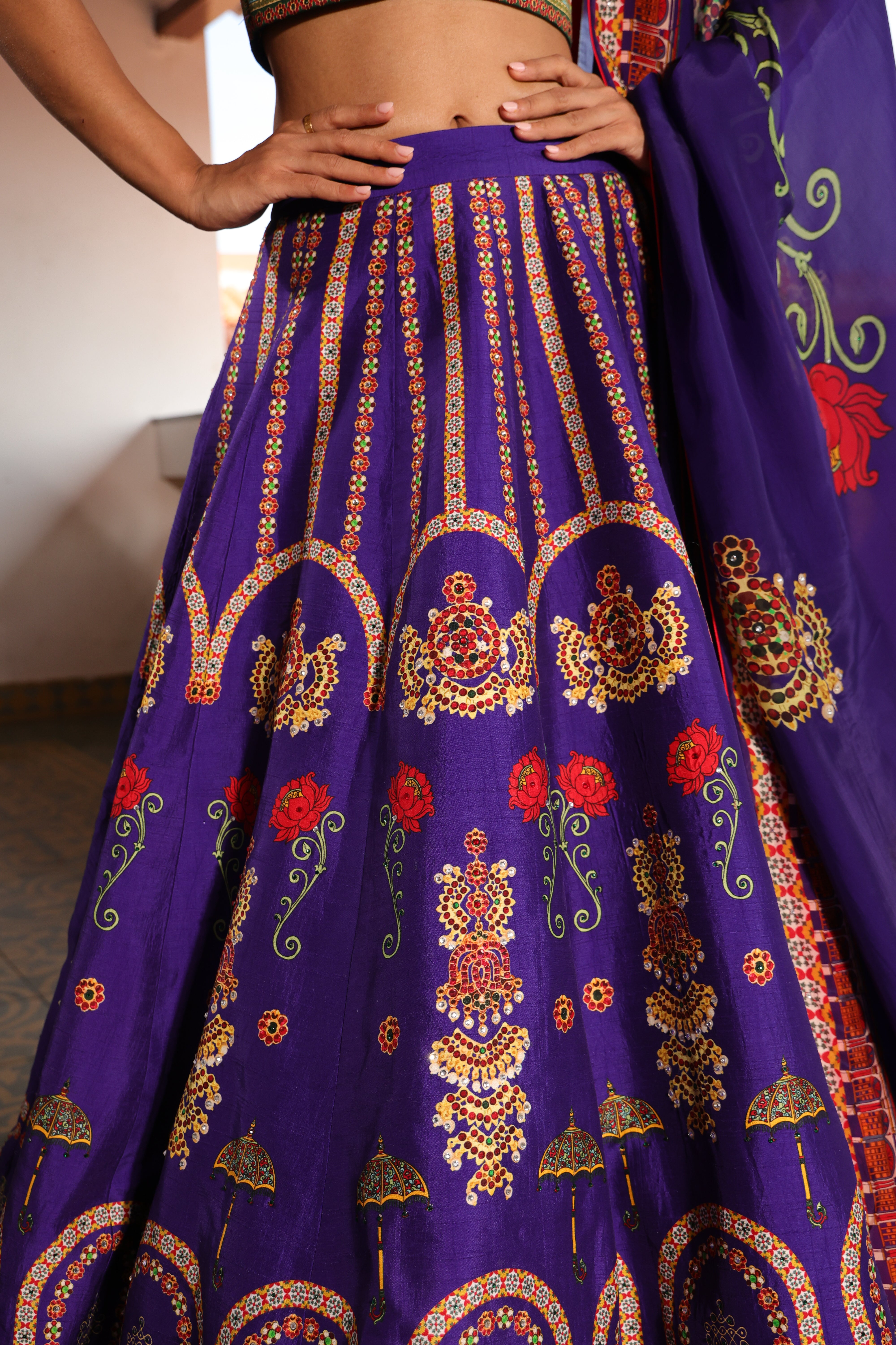 Multiple kalli lehenga with chettinad architechture print and jewellery print embellished with stone embroidery.