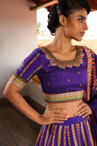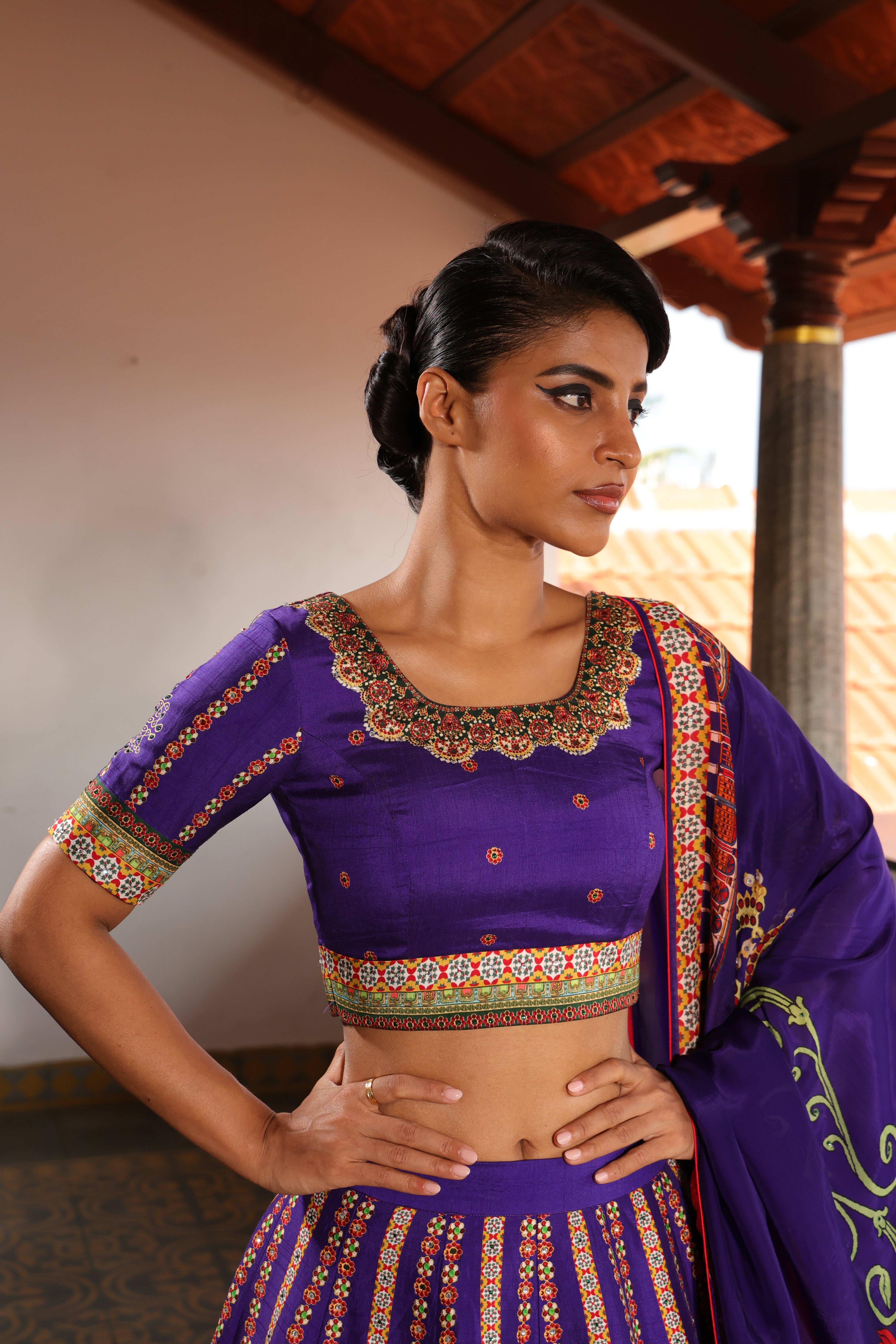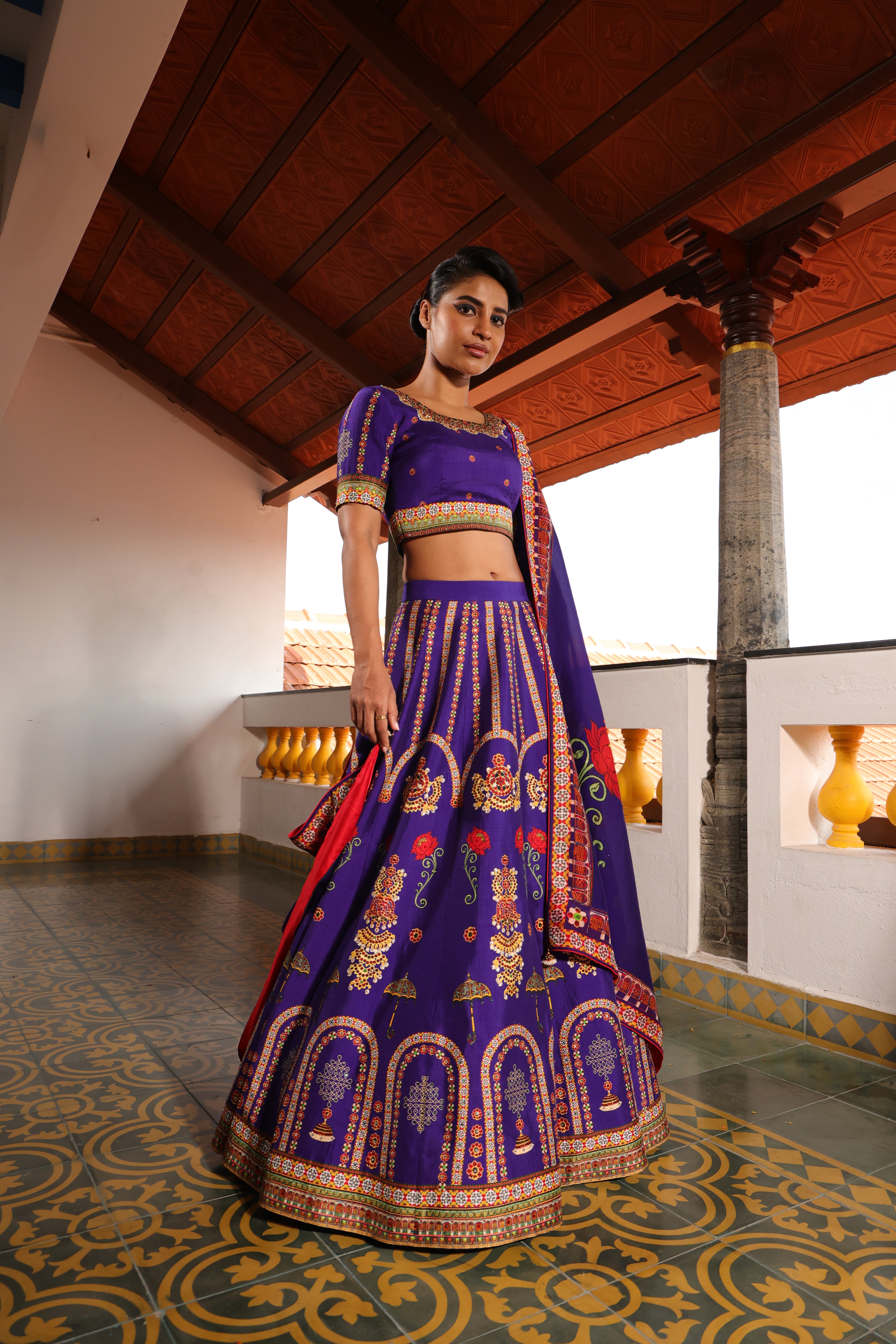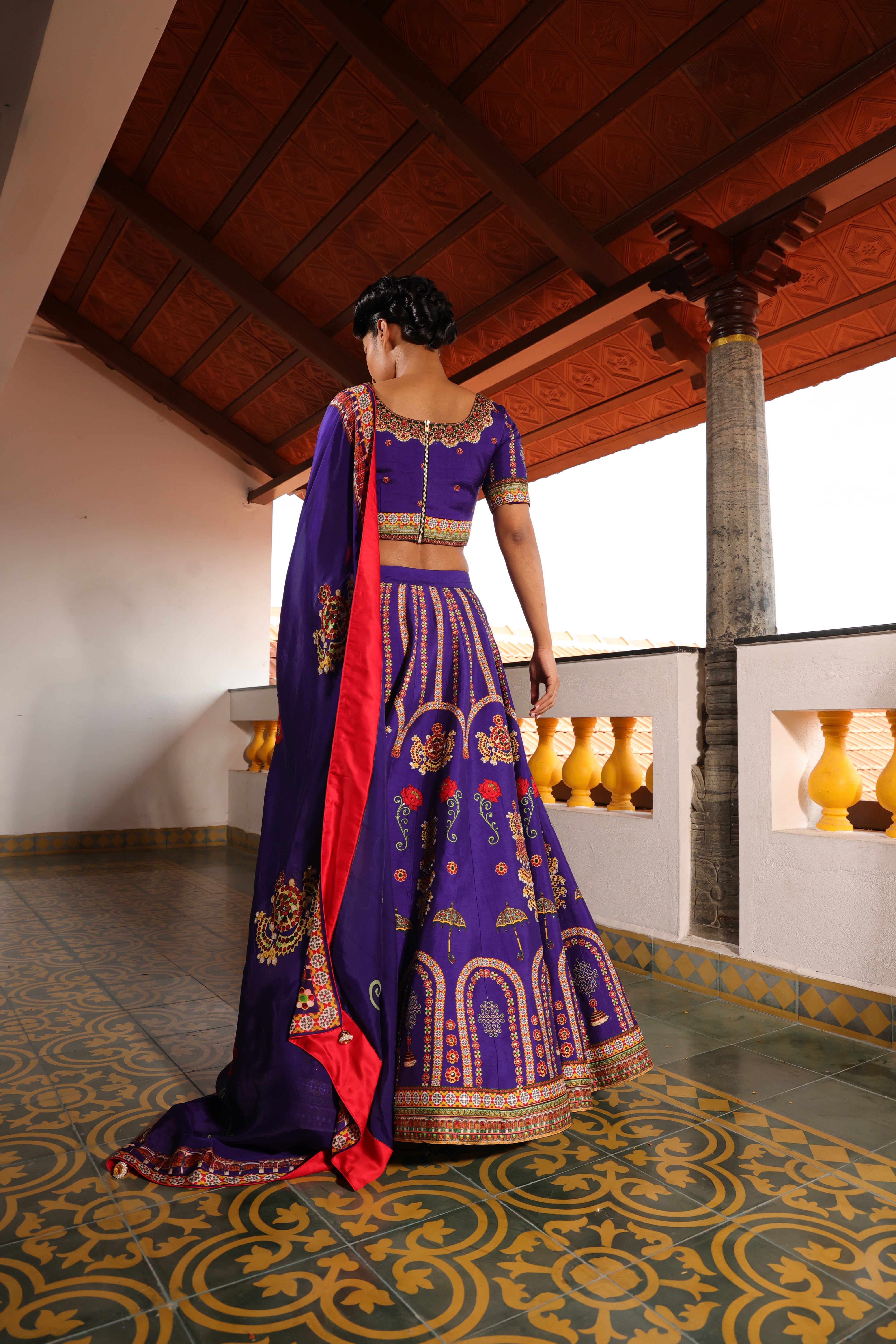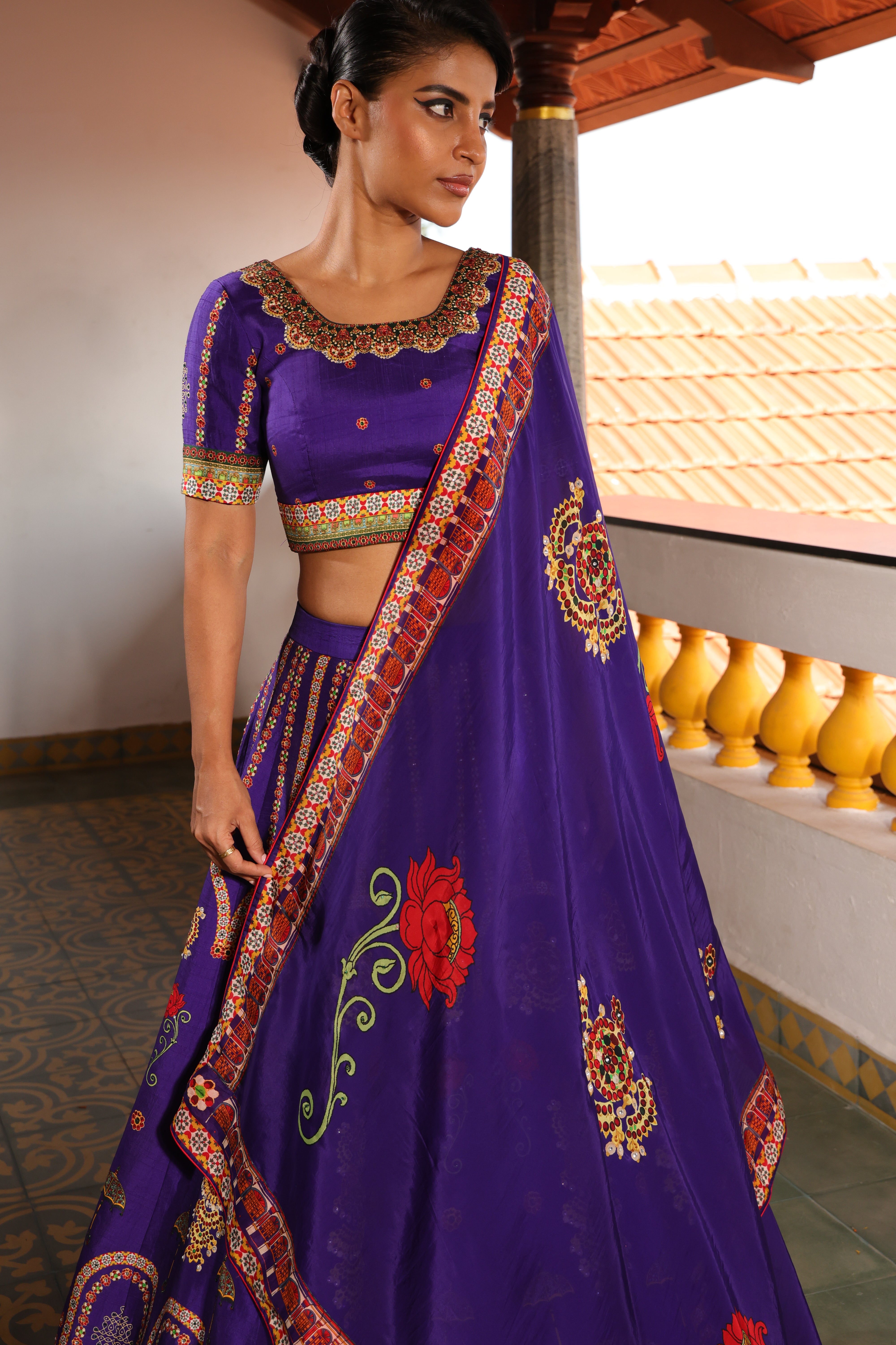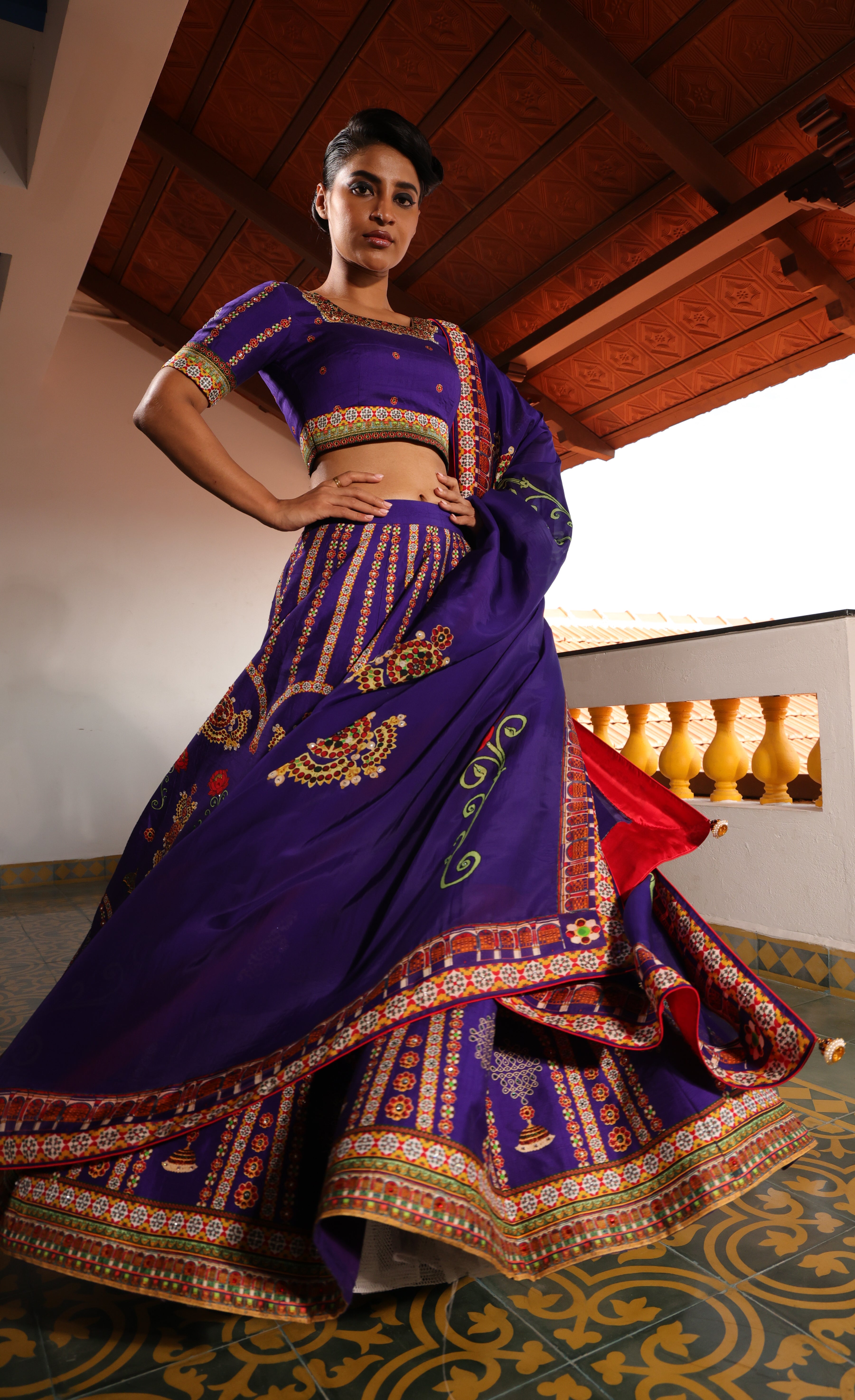 Multiple kalli lehenga with chettinad architechture print and jewellery print embellished with stone embroidery.