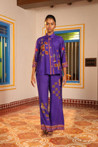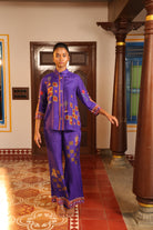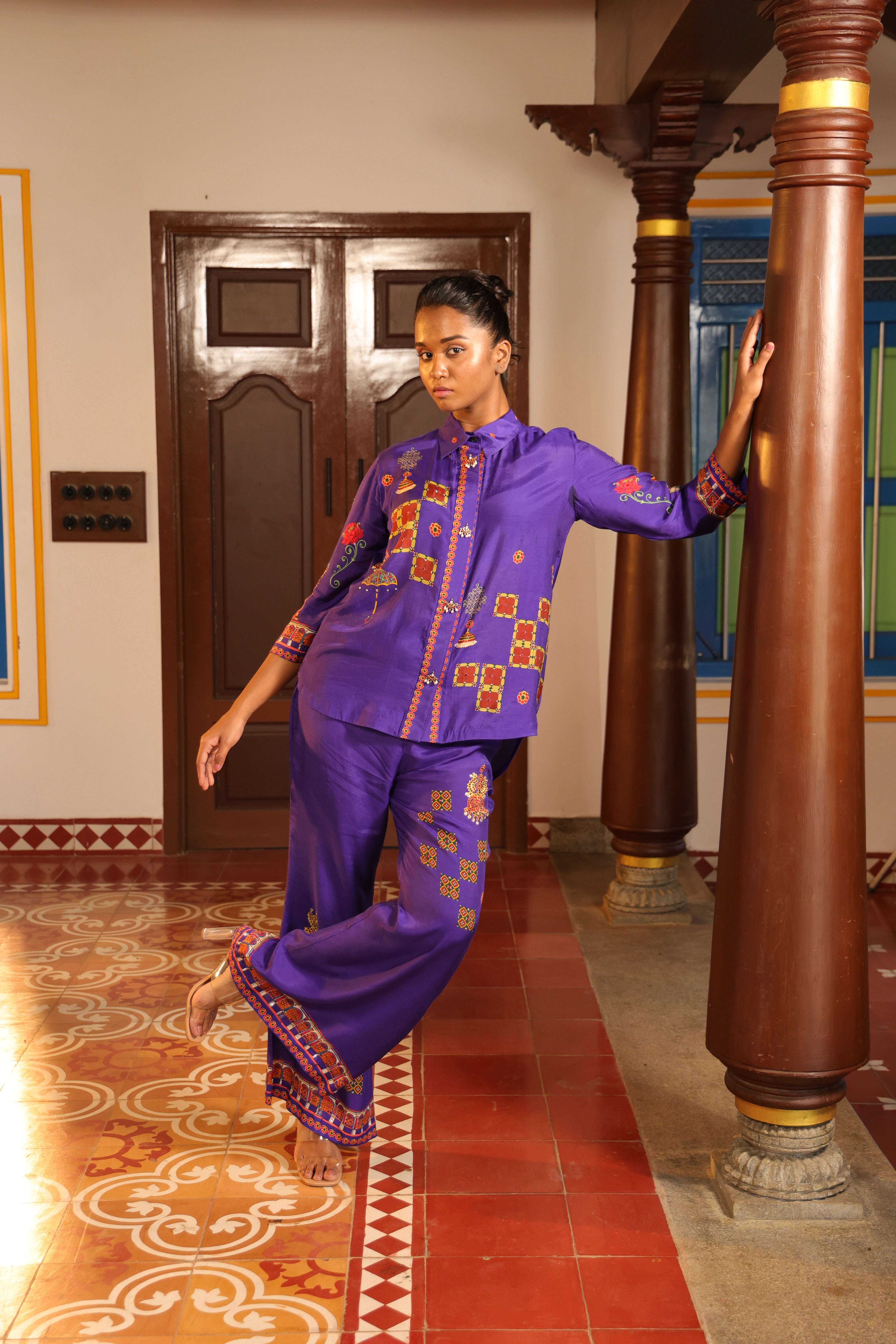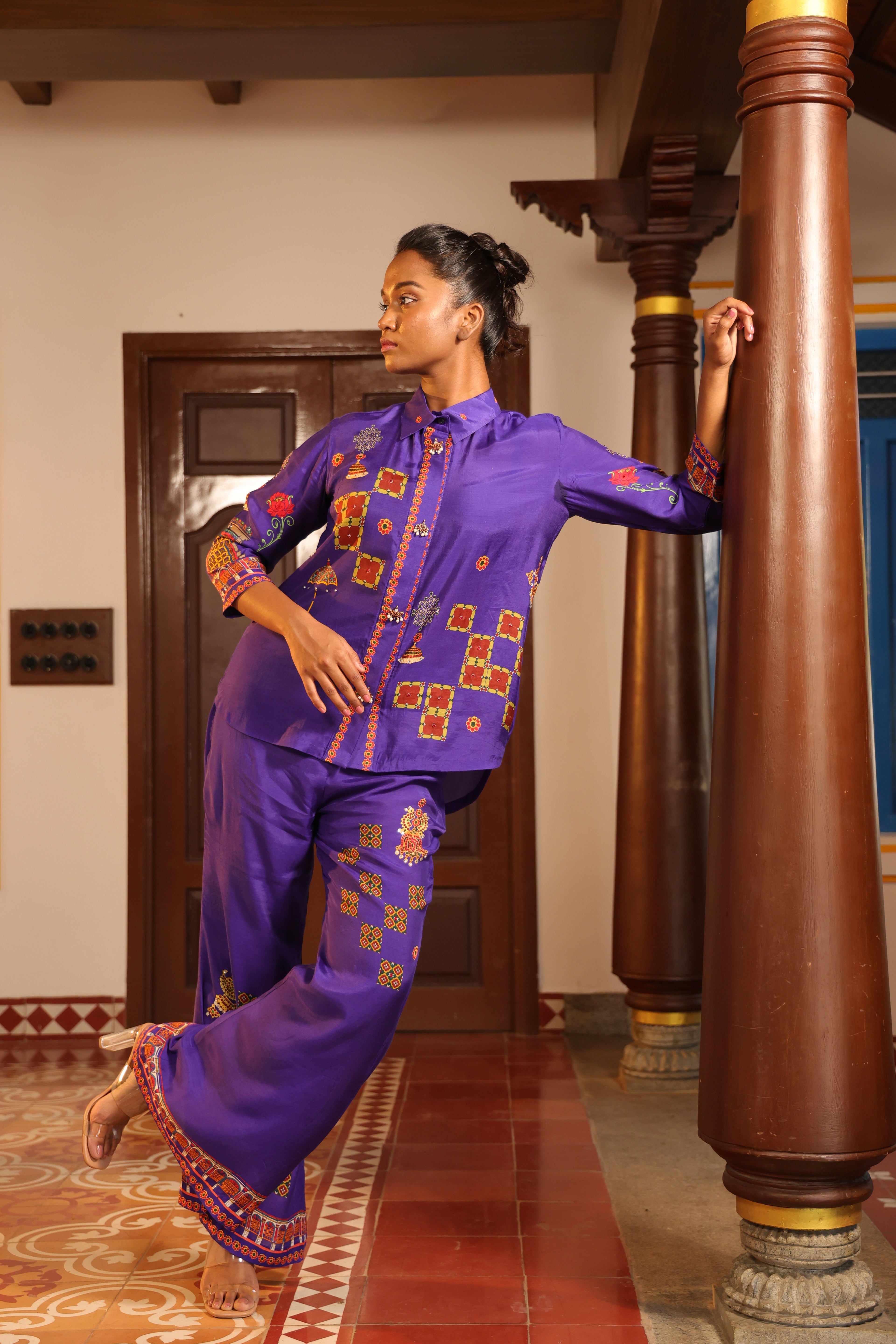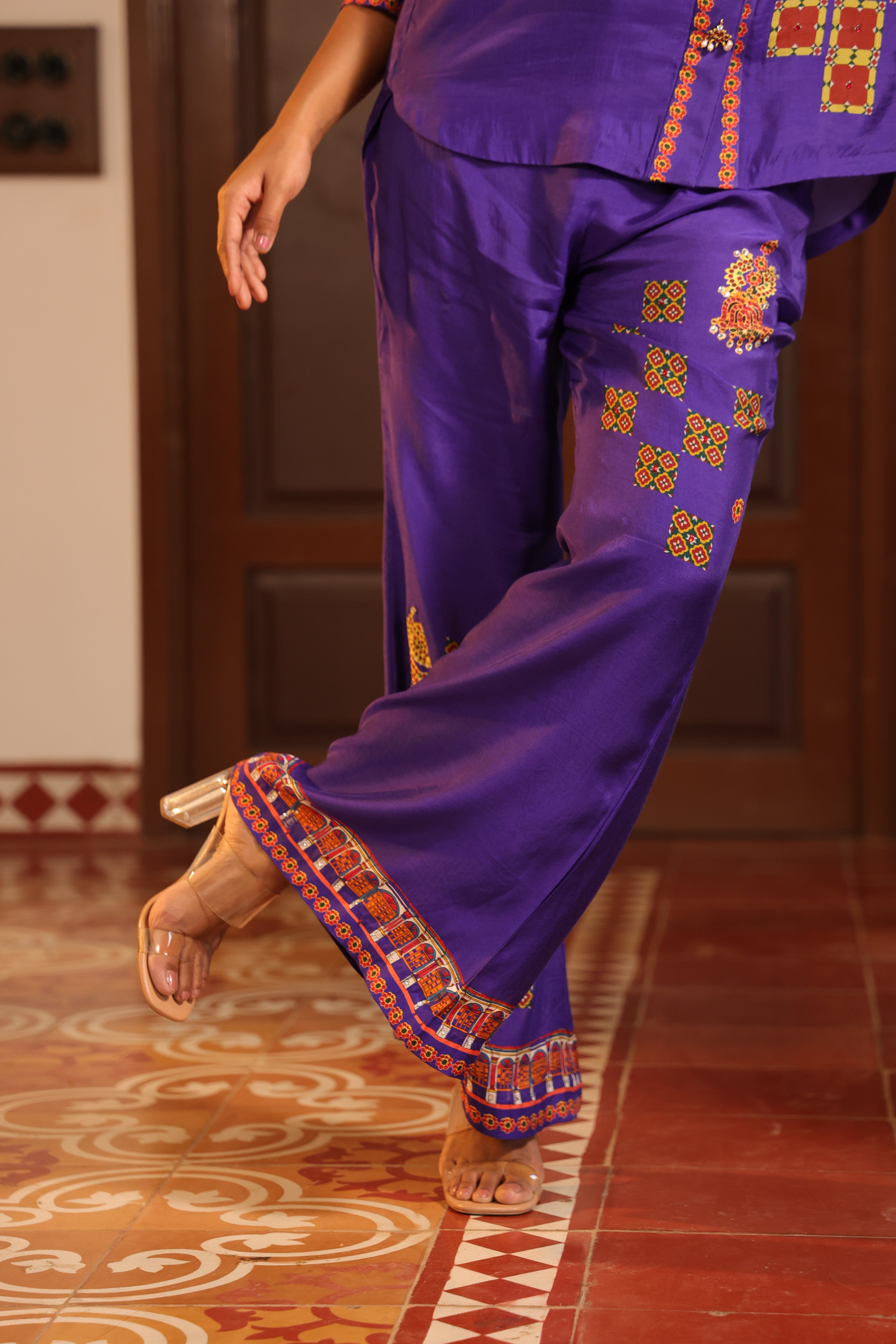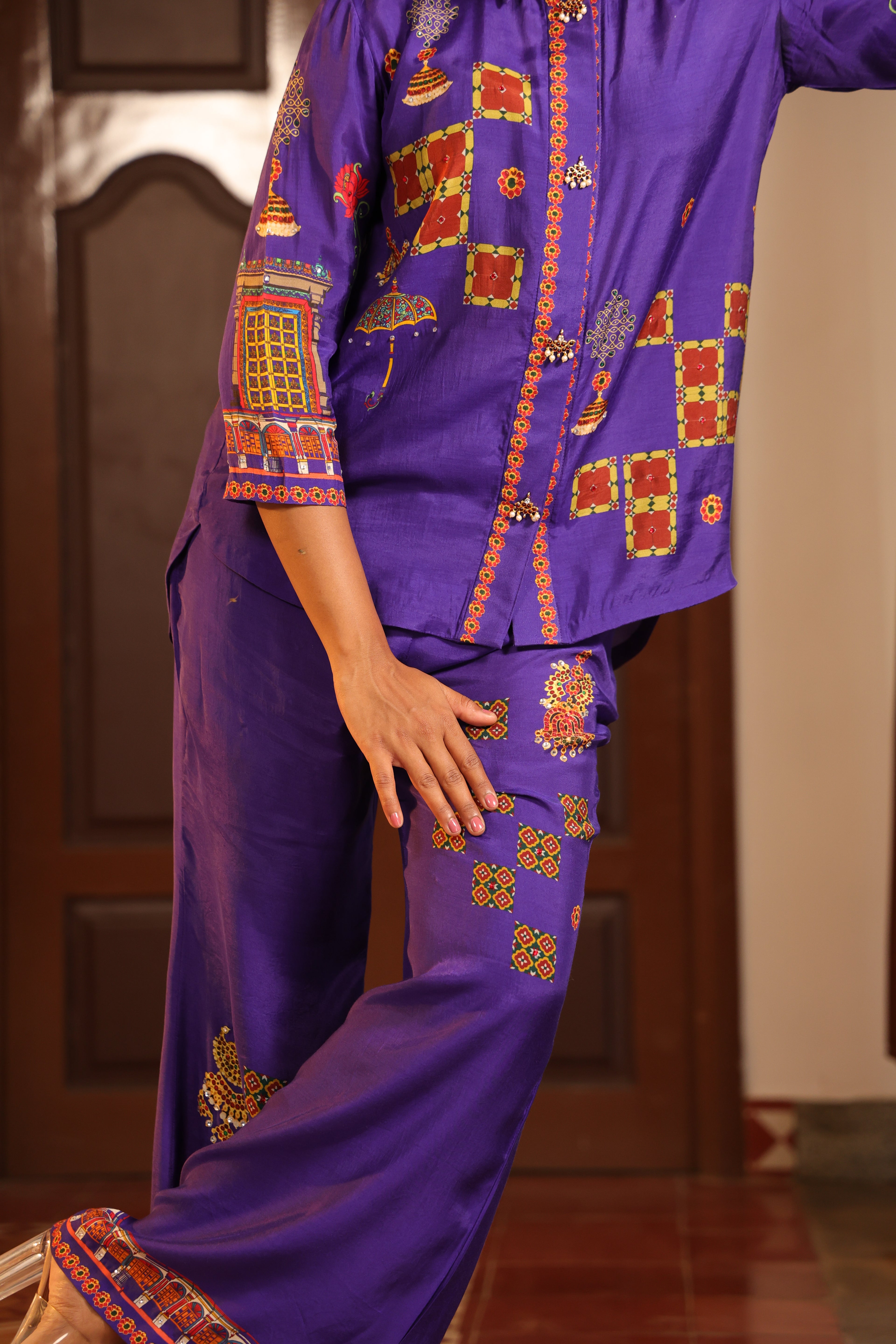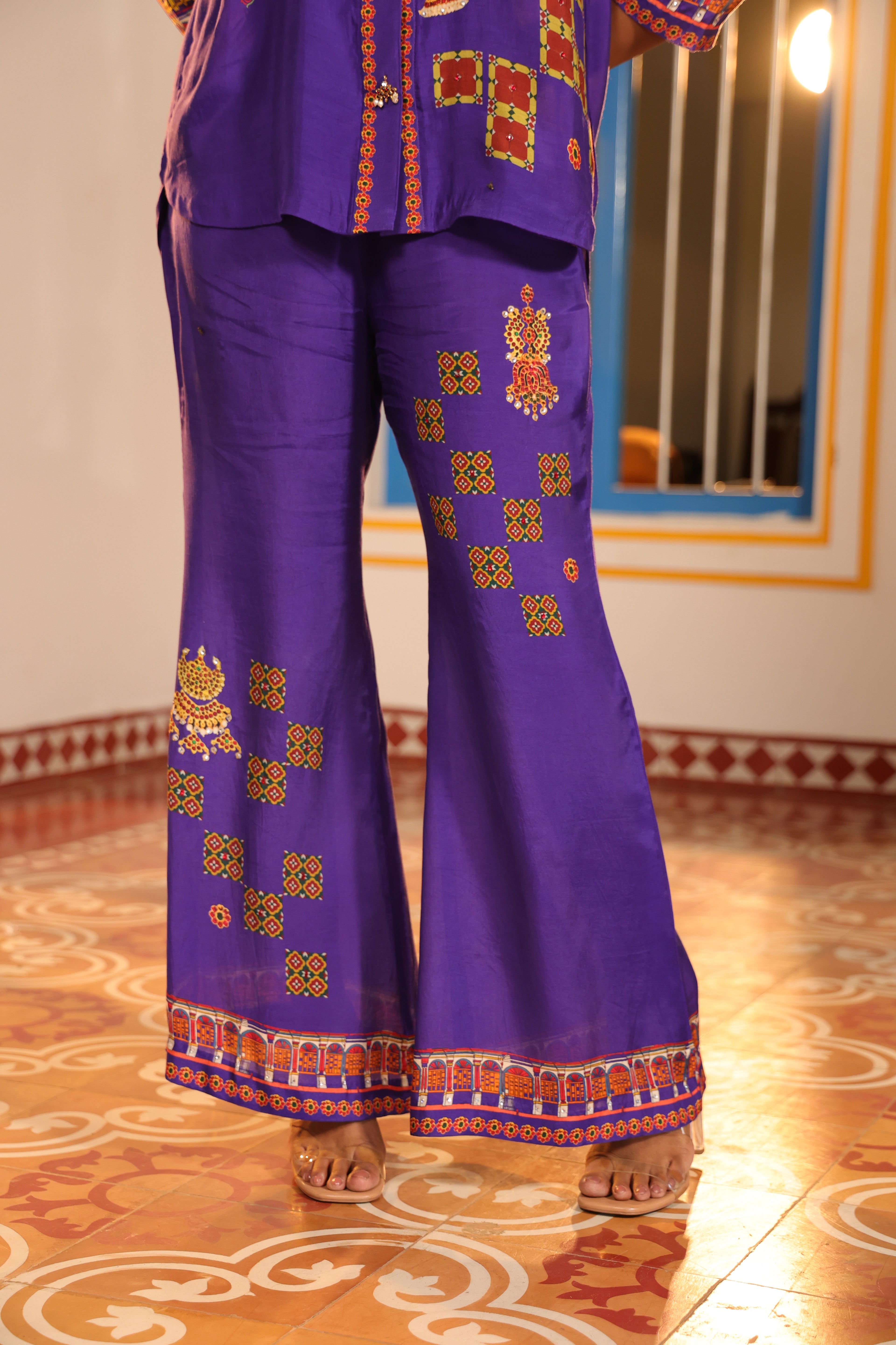 Loose pants with chettinad architechture print and jewellery print embellished with stone embroidery.