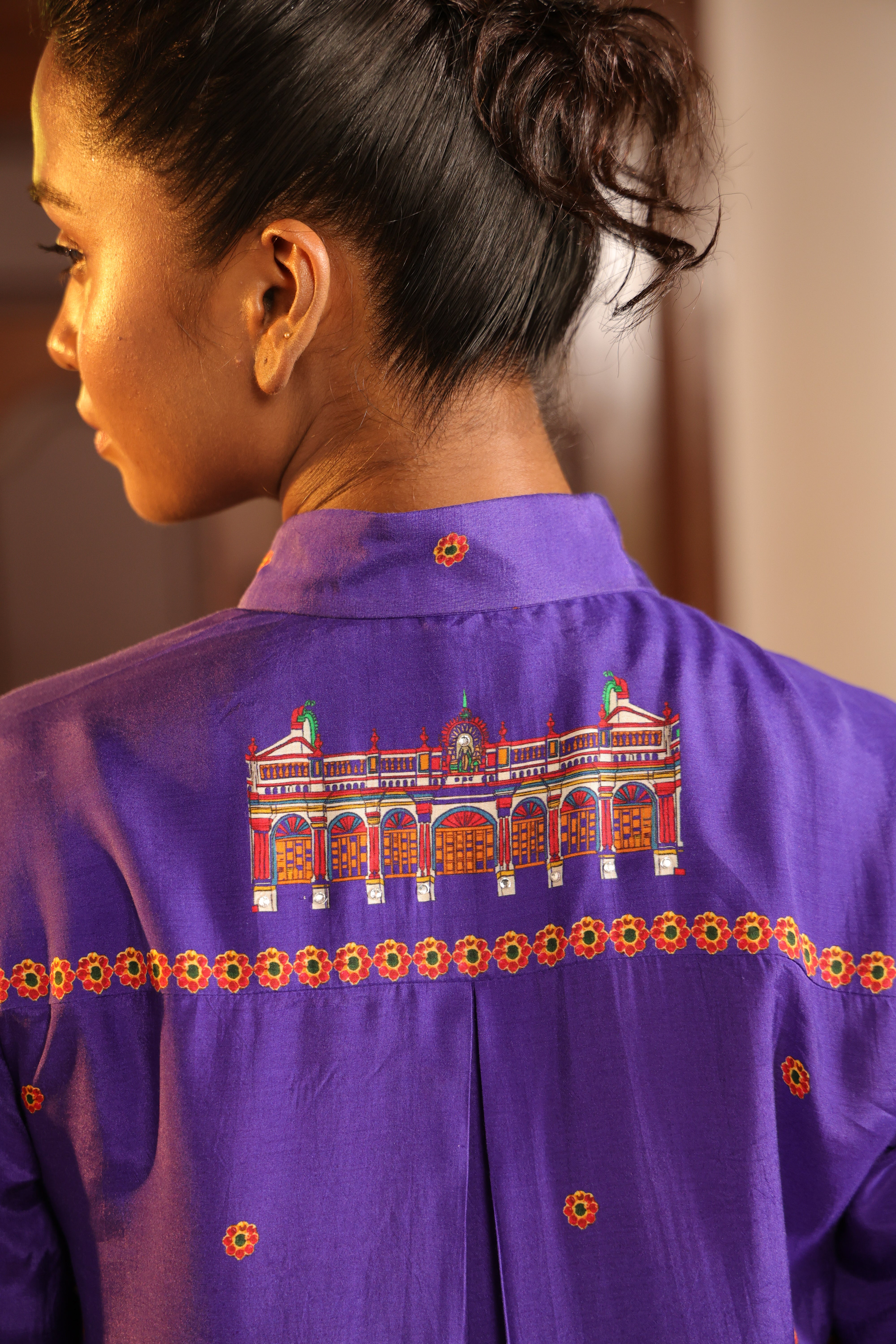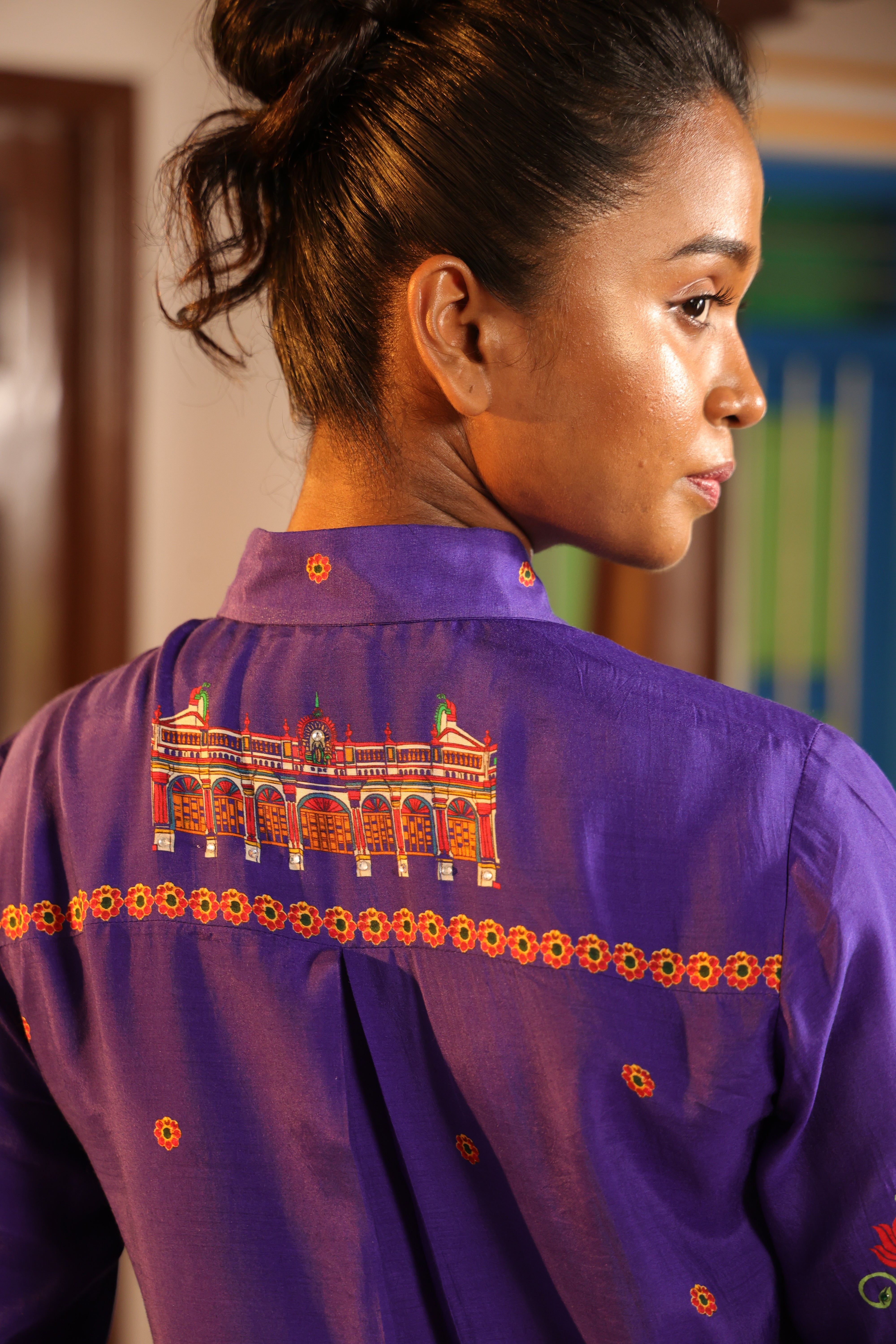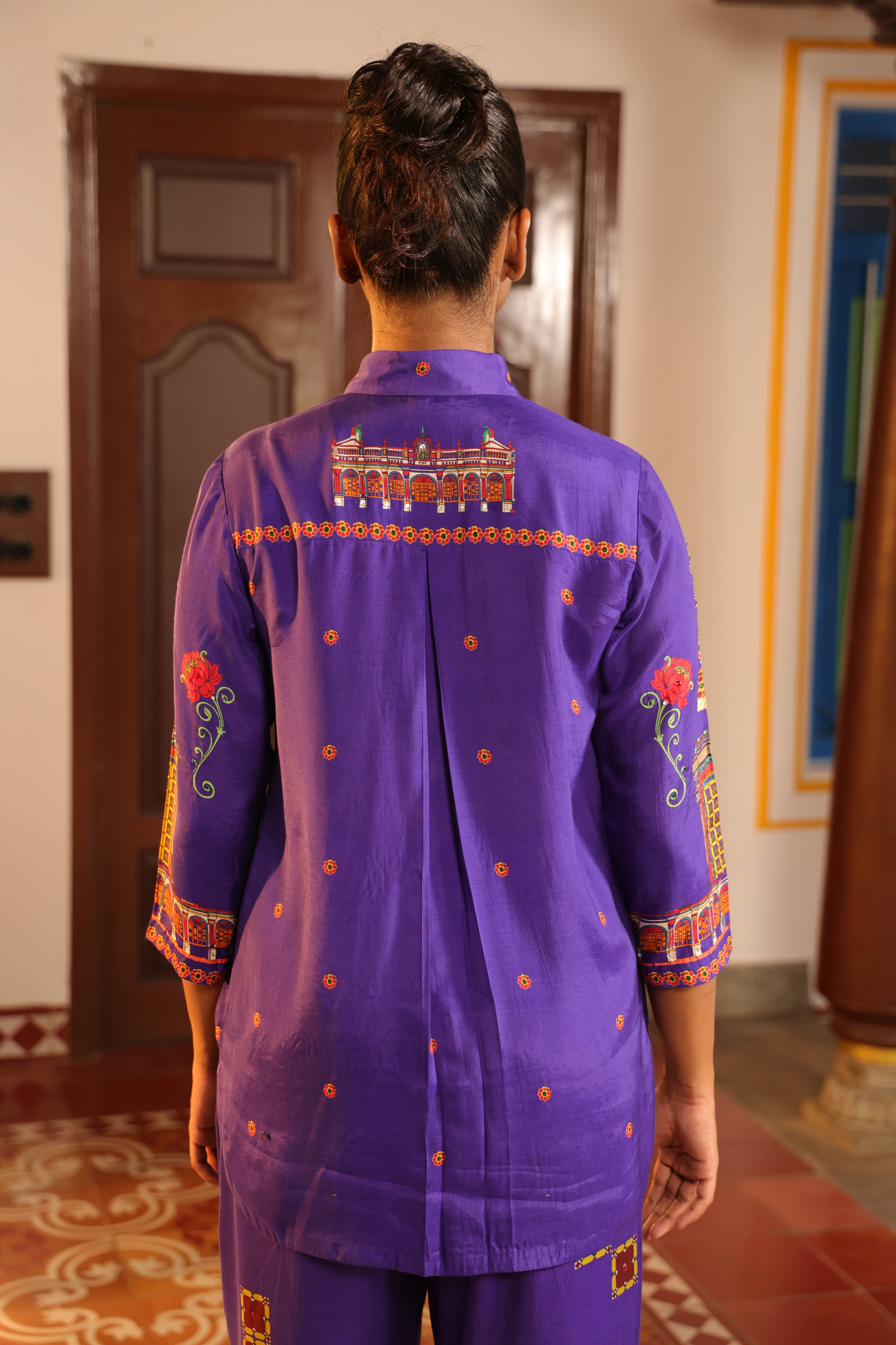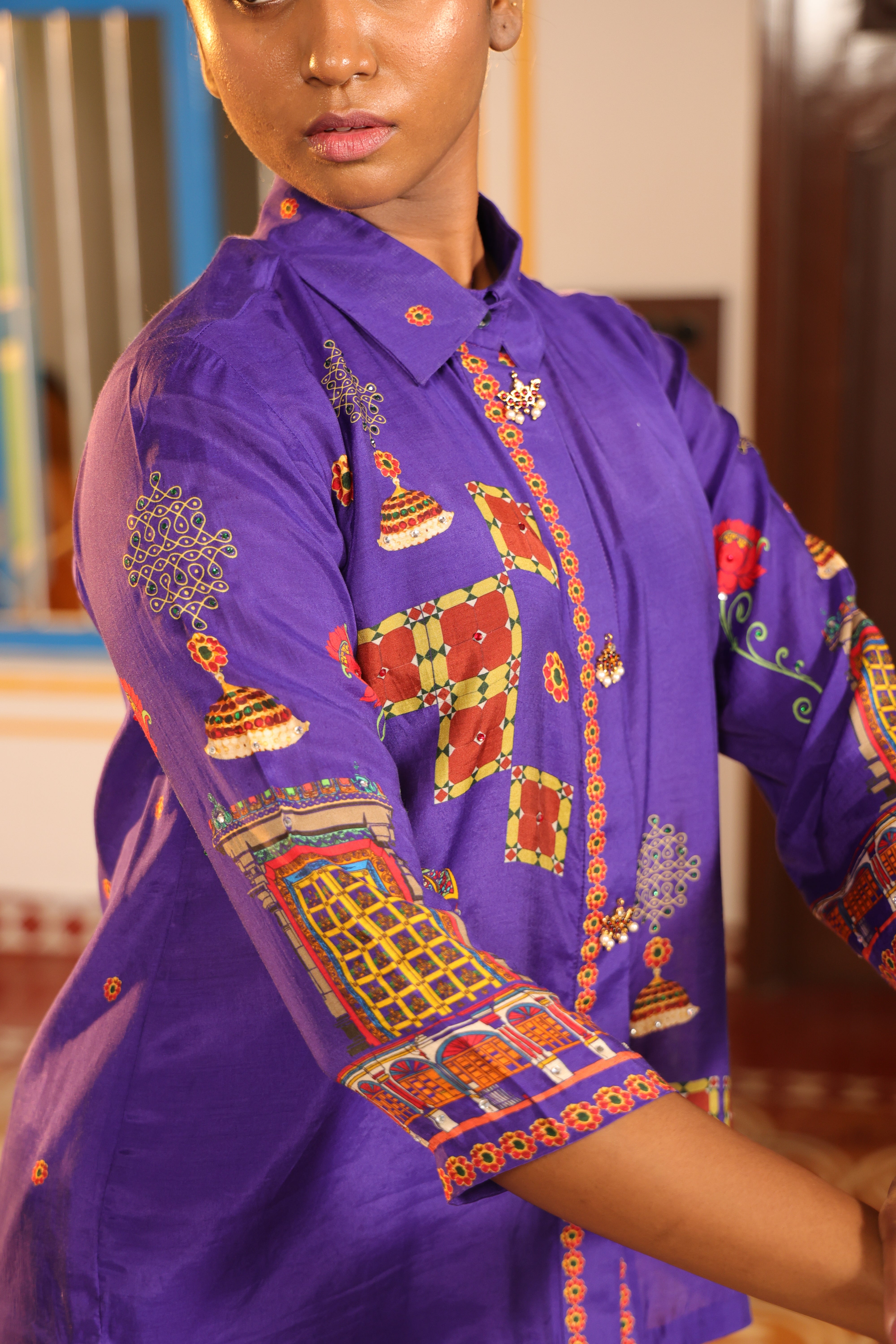 Shirt collar 3/4th sleeve,Front open,shirt,Front and back high low with chettinad architechture and jewellery print embellished with stone embroidery.