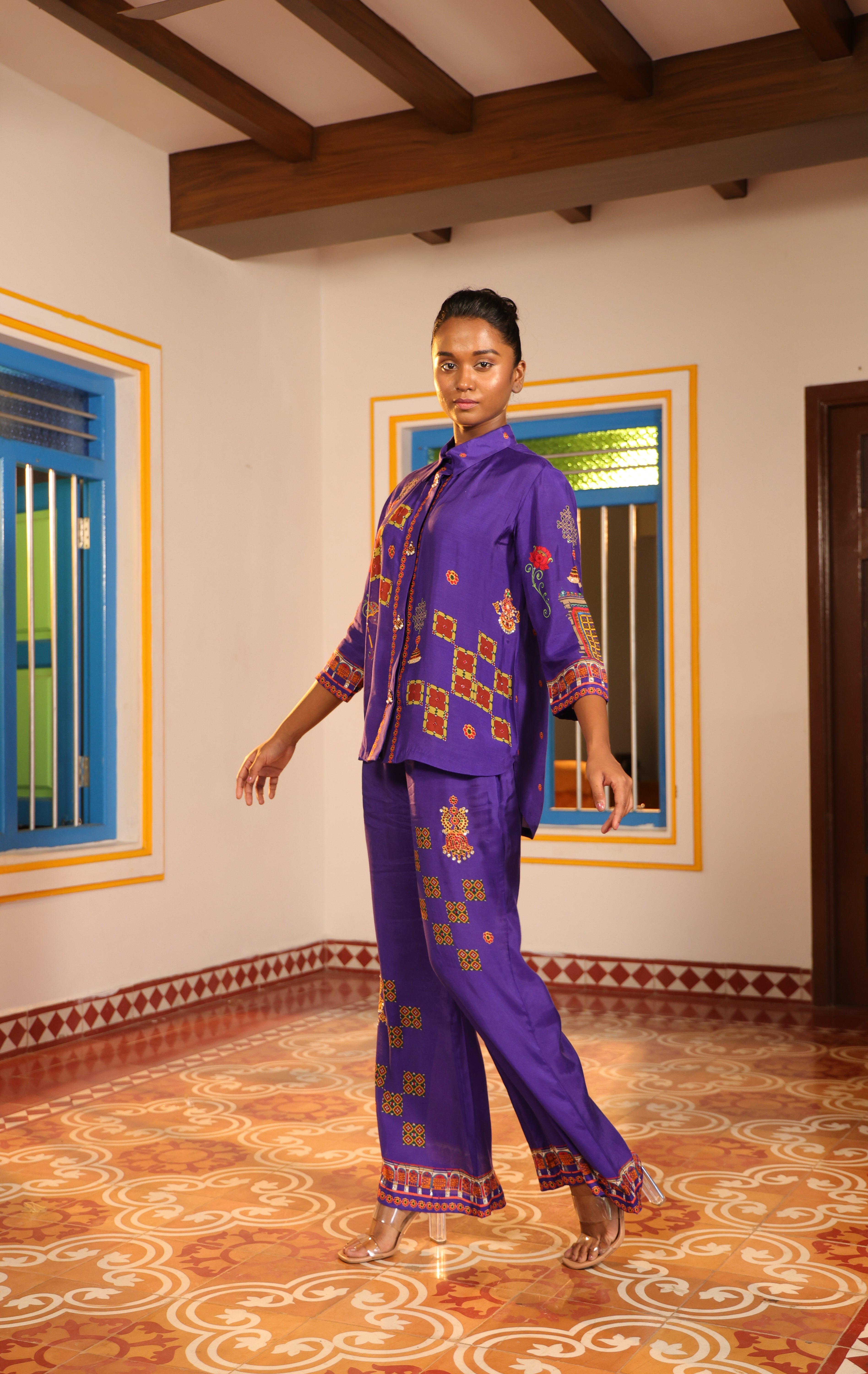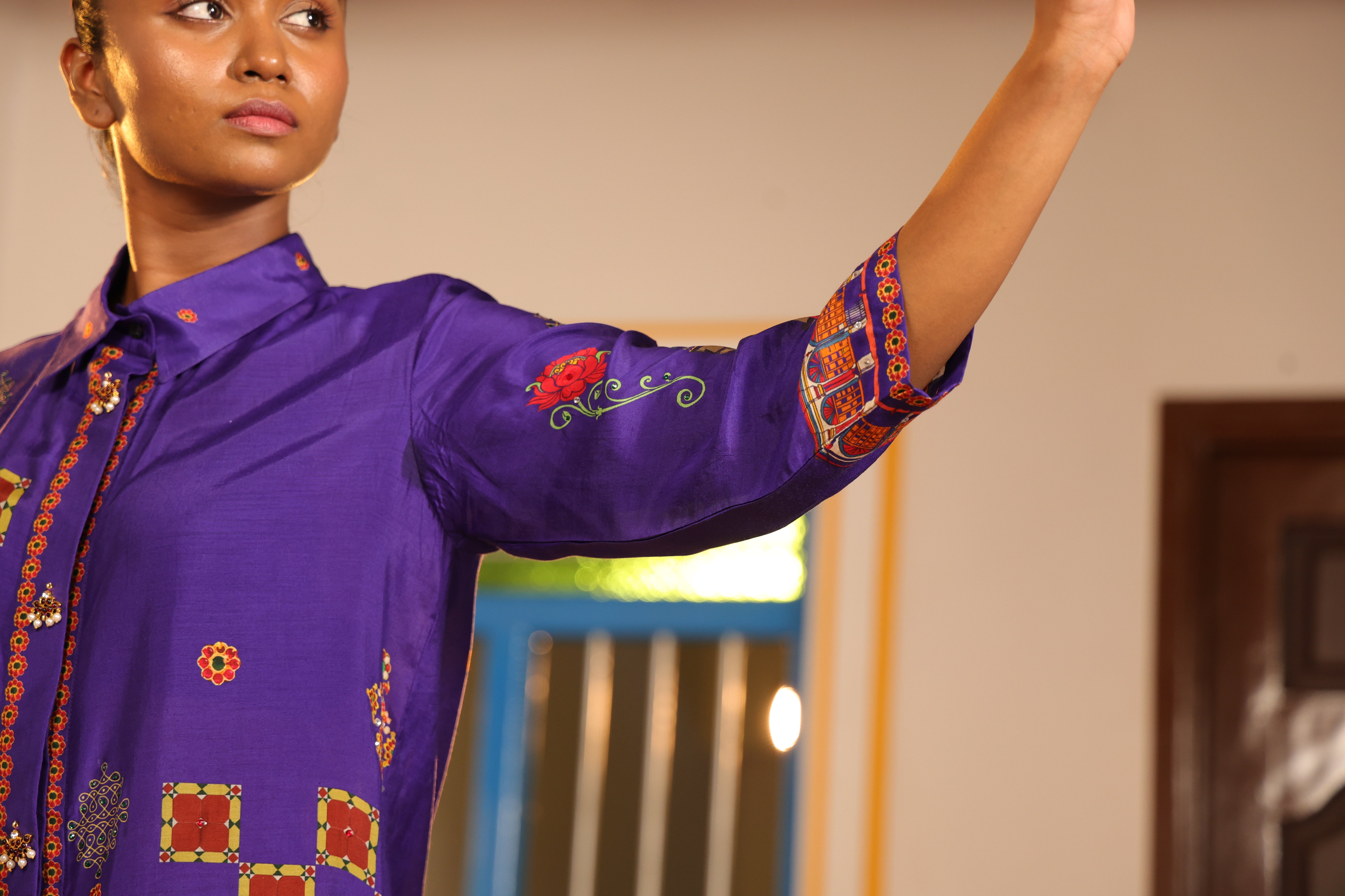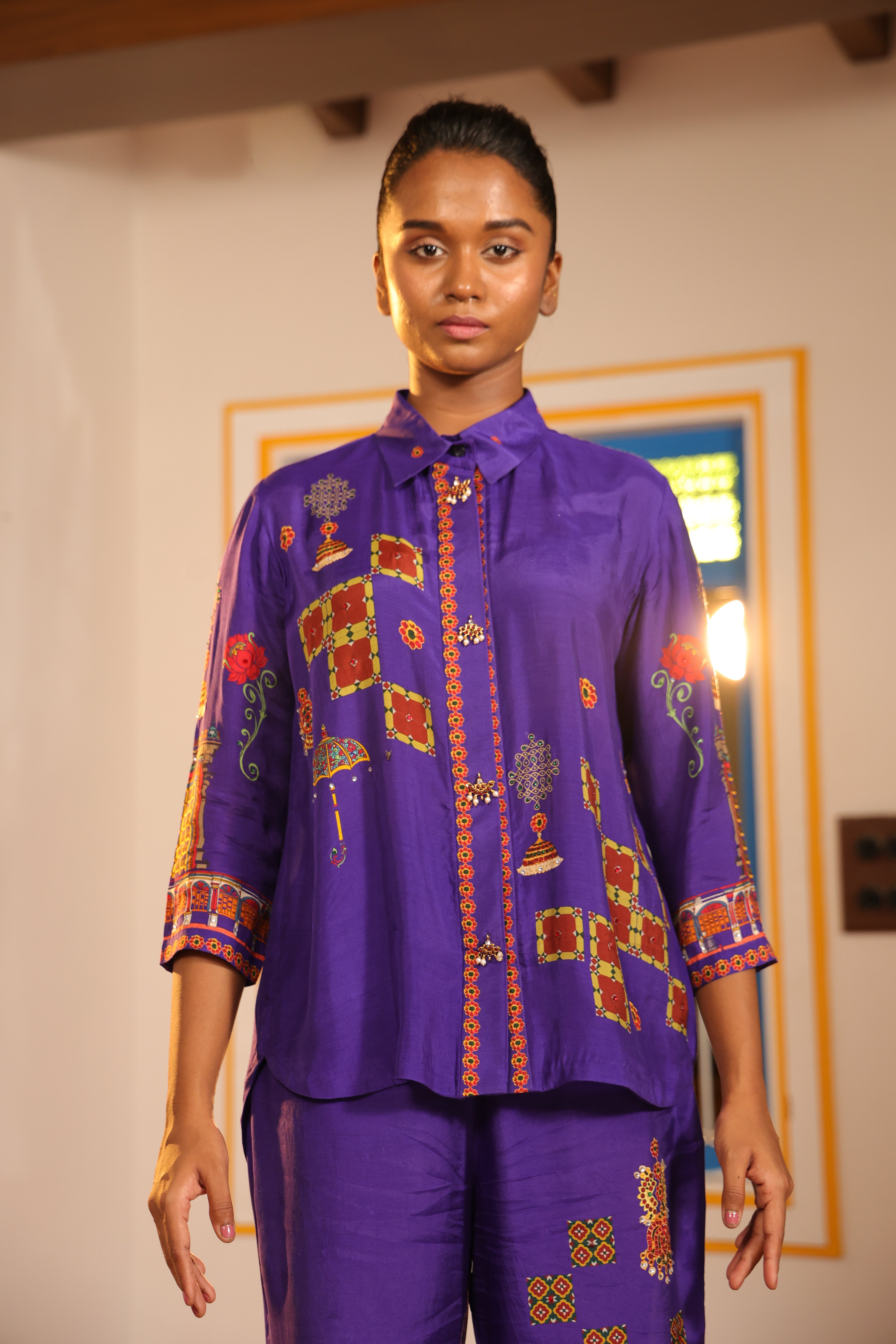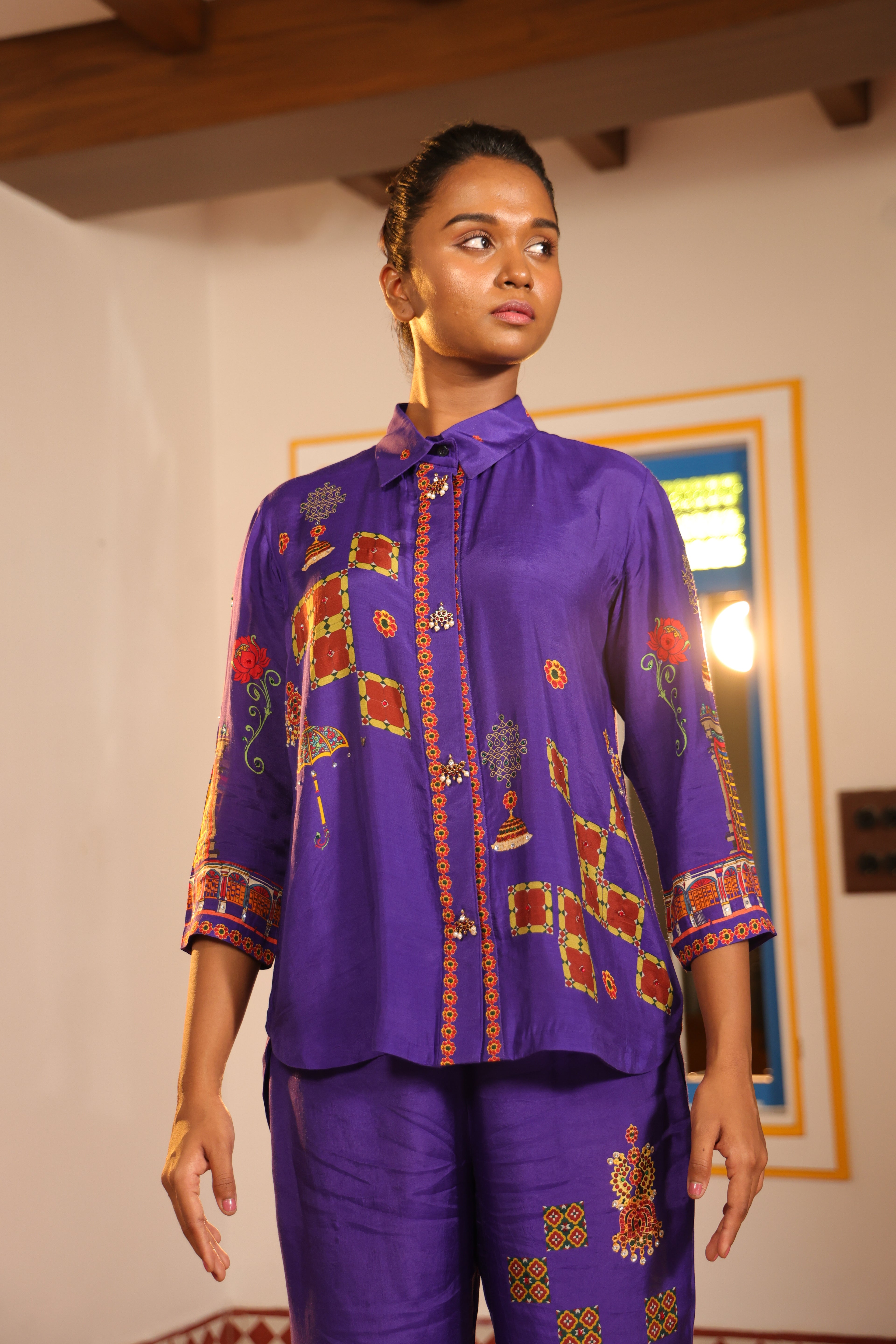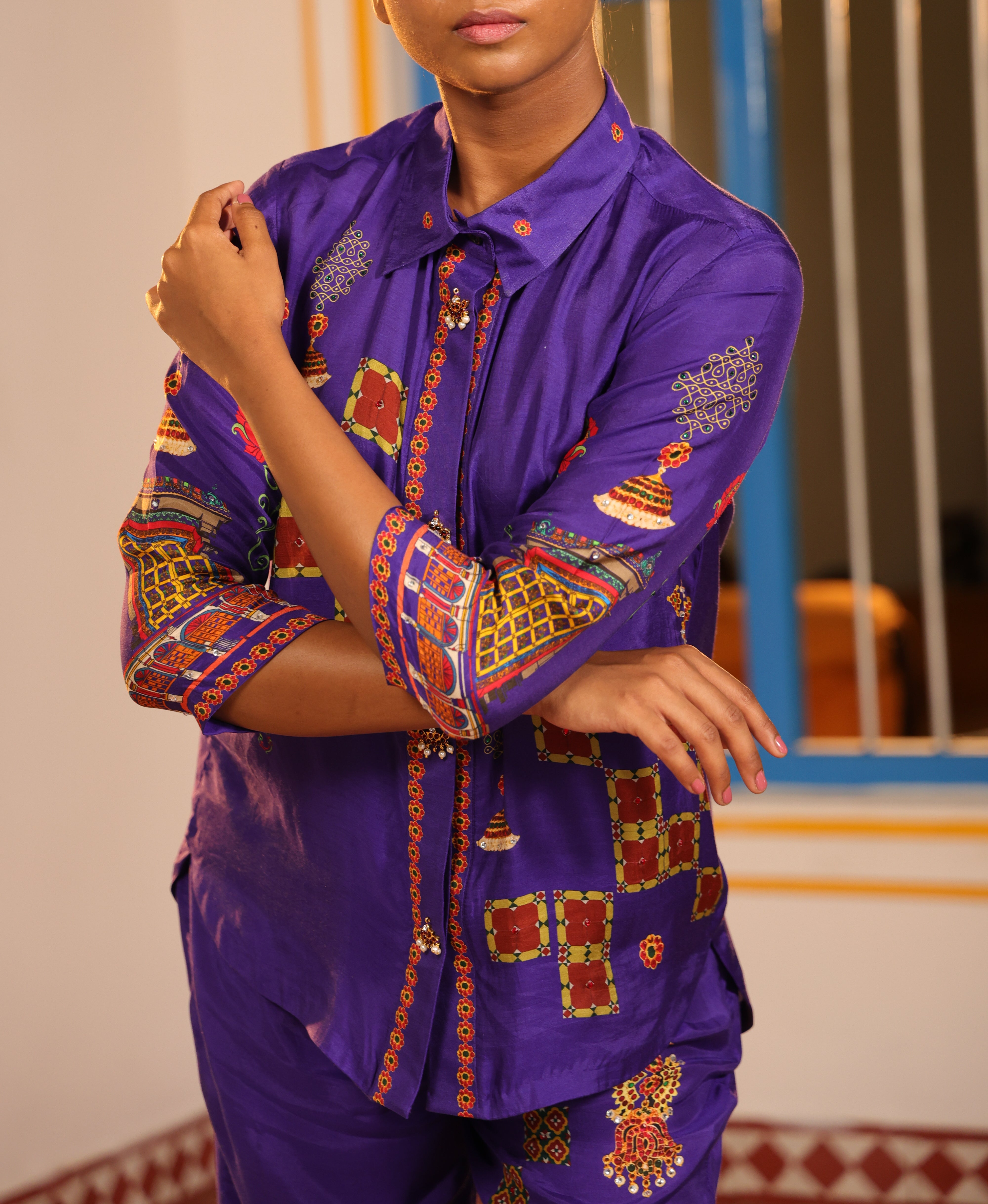 Shirt collar 3/4th sleeve,Front open,shirt,Front and back high low with chettinad architechture and jewellery print embellished with stone embroidery.