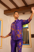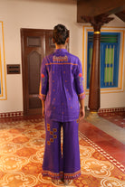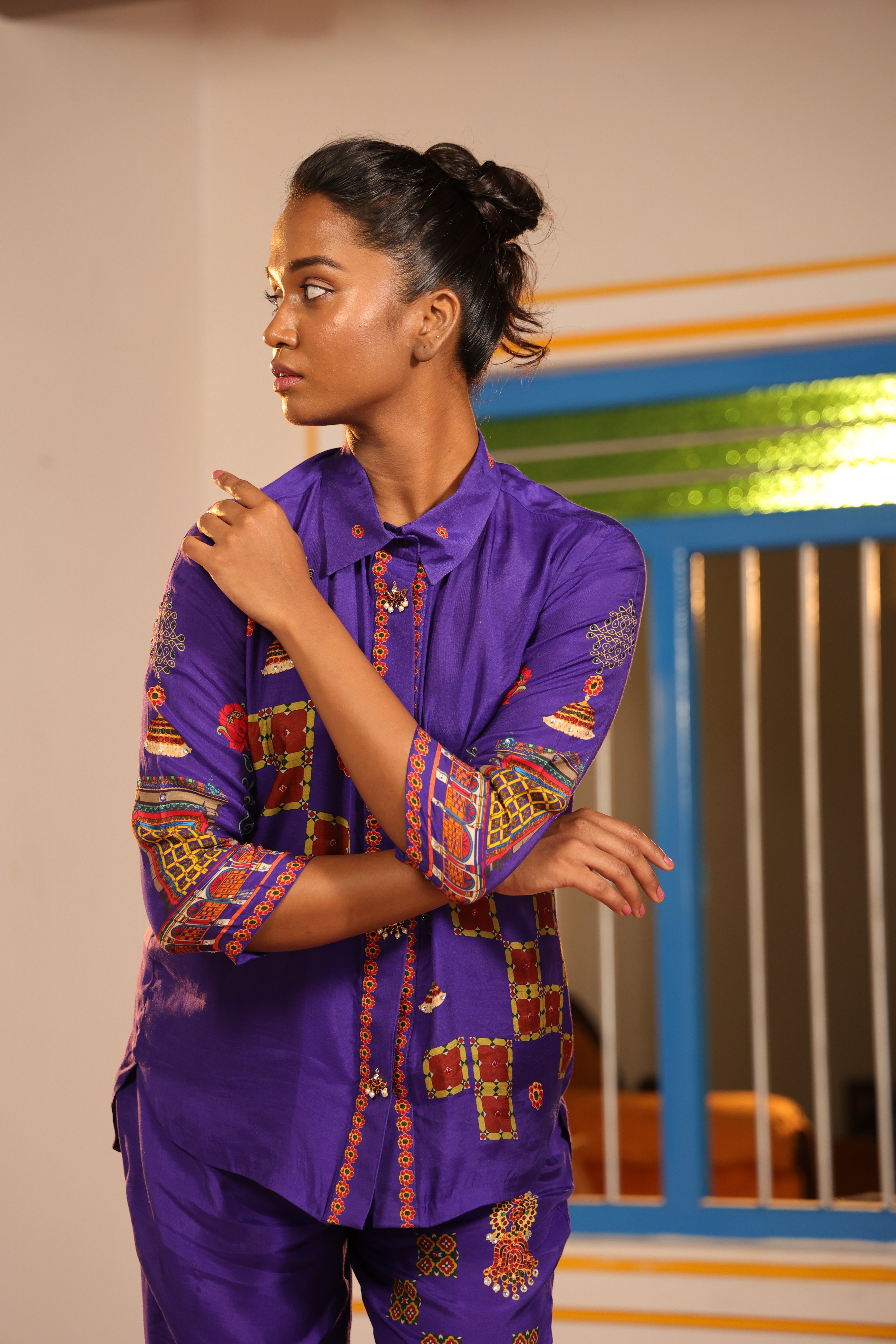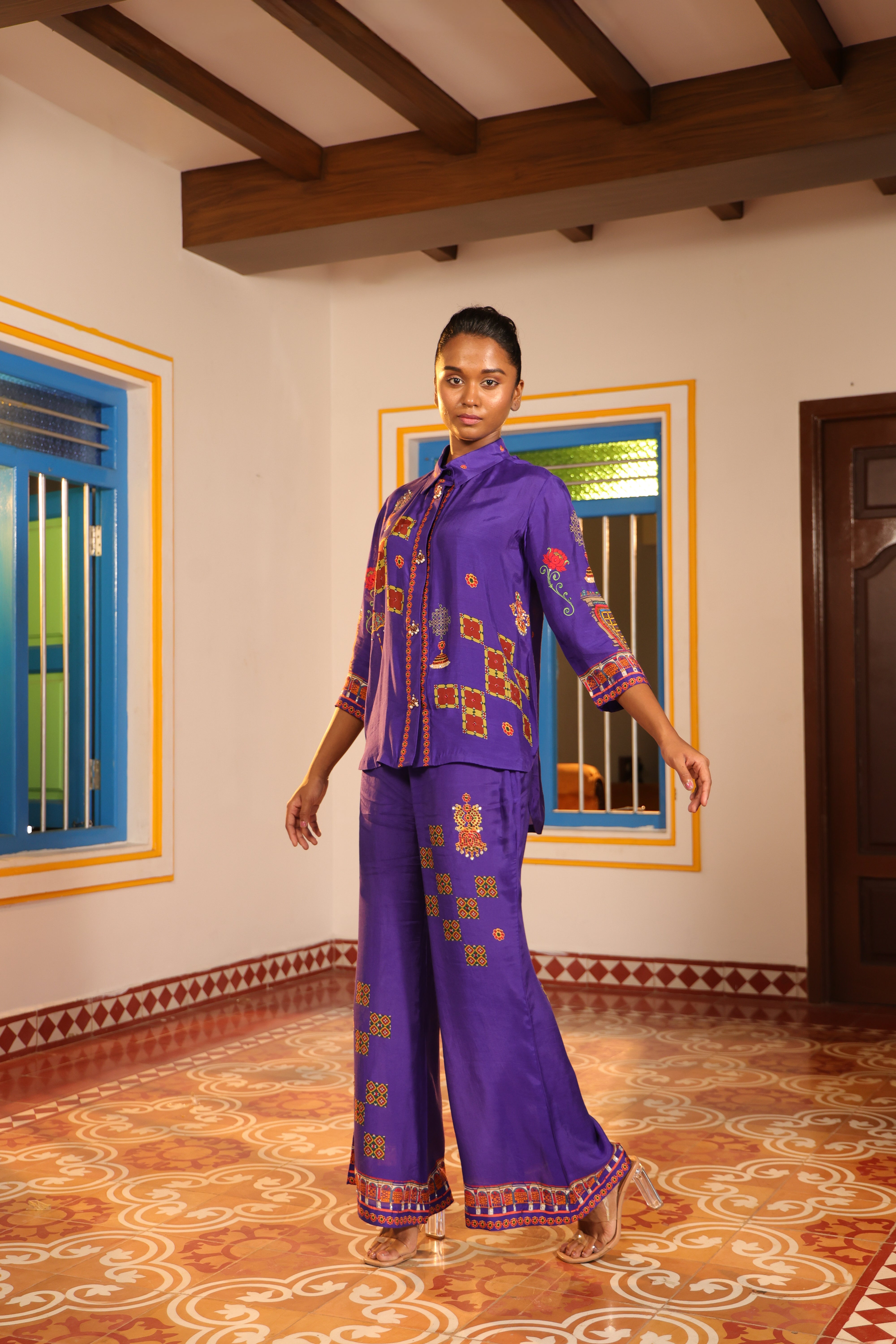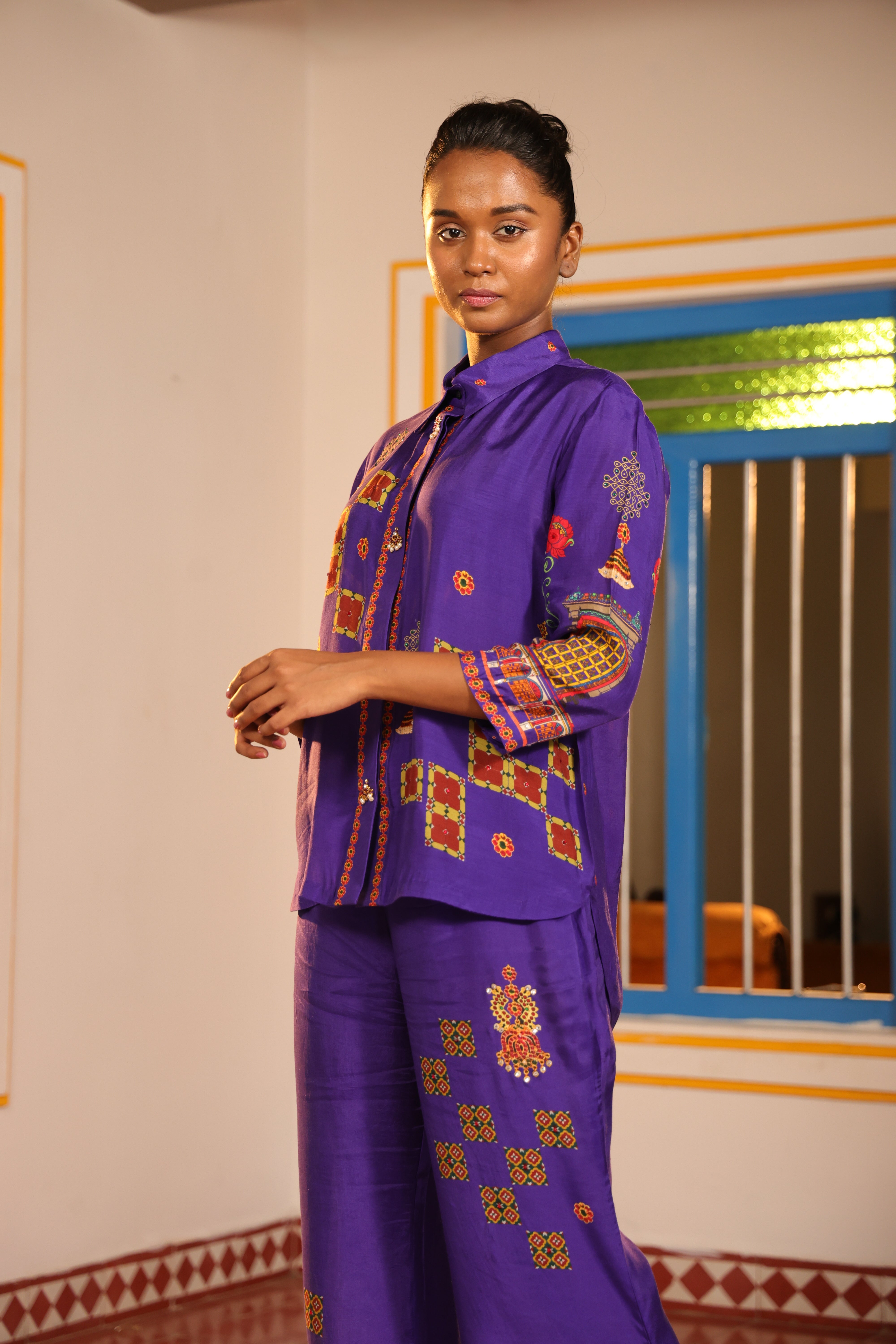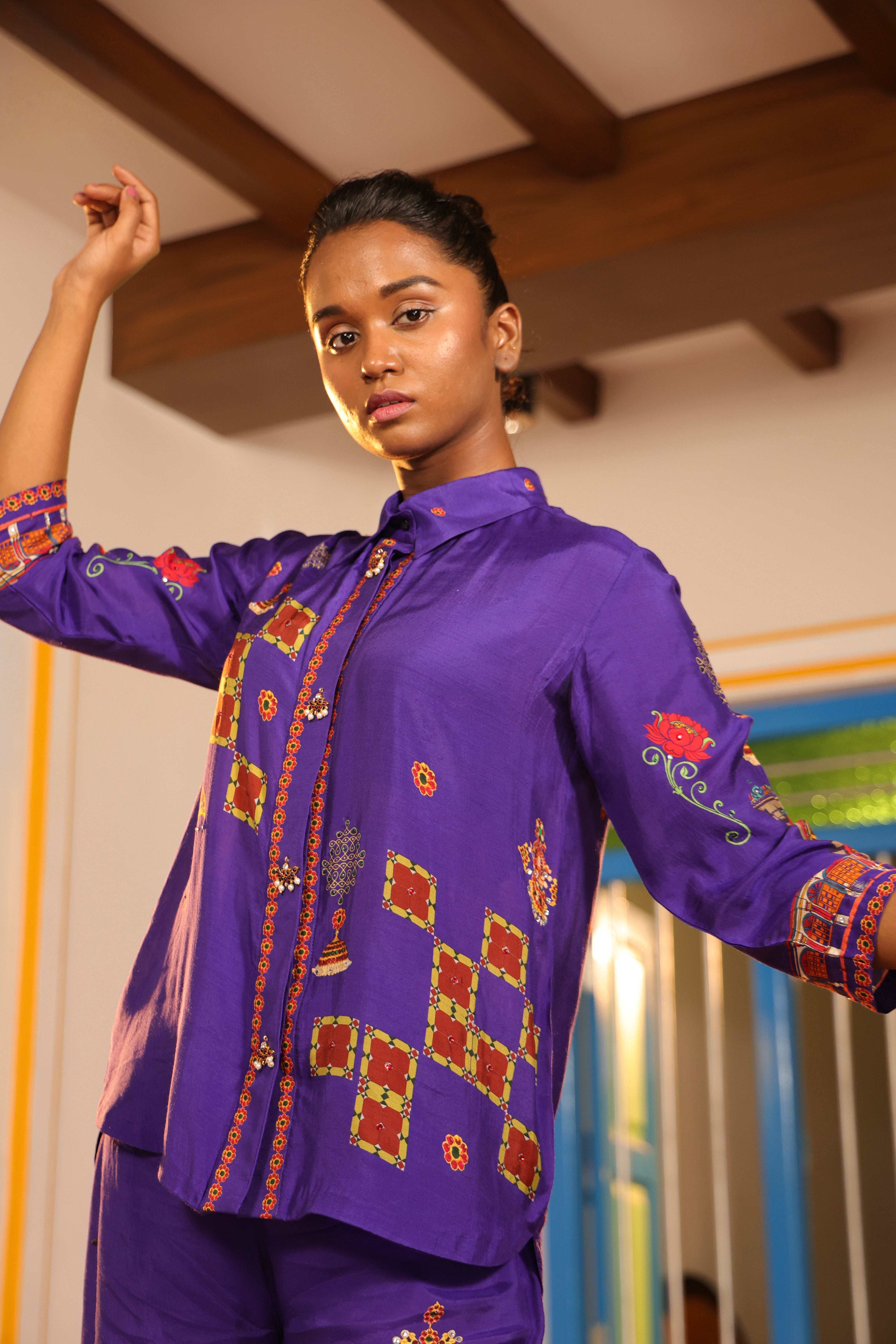 Shirt collar 3/4th sleeve,Front open,shirt,Front and back high low with chettinad architechture and jewellery print embellished with stone embroidery.