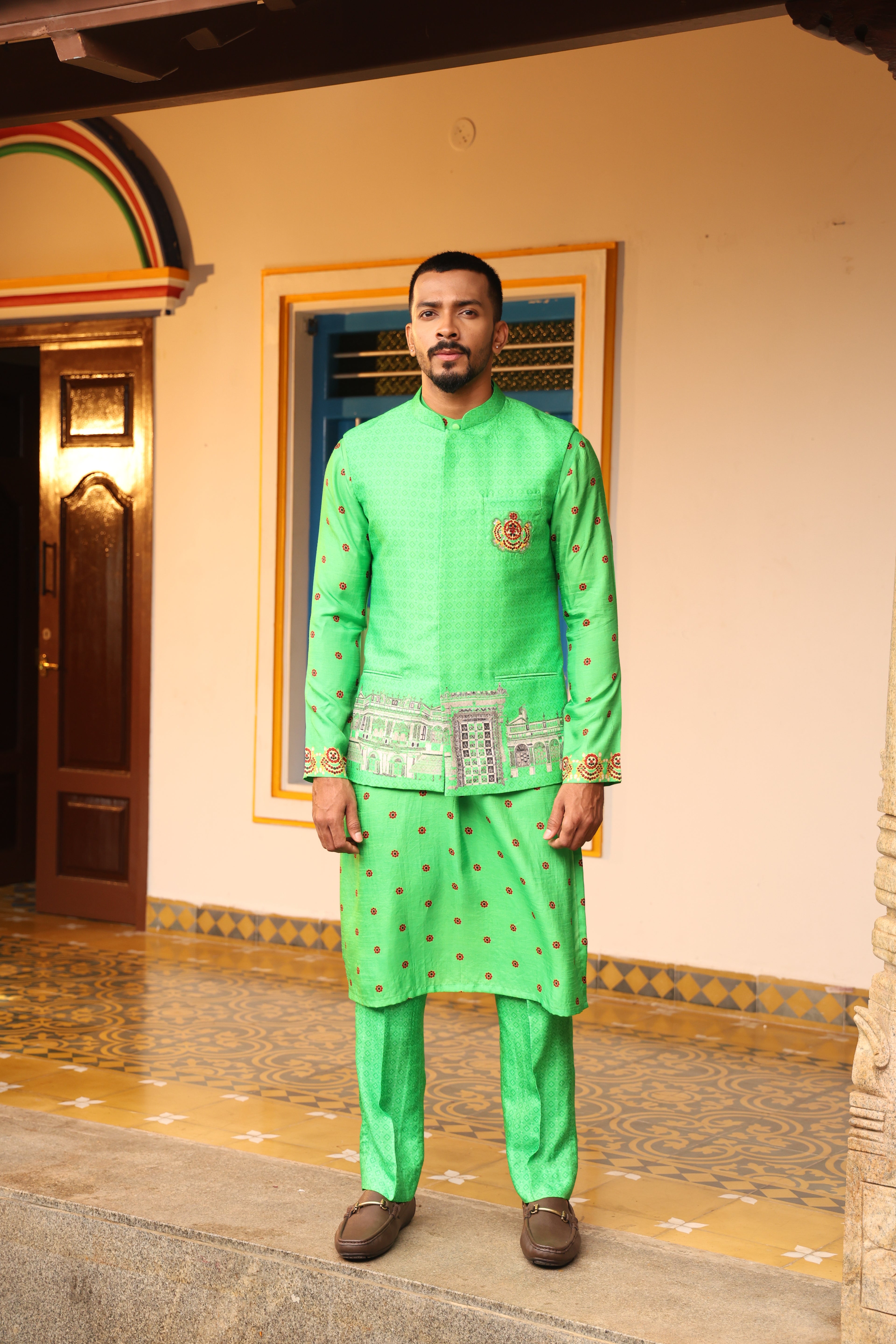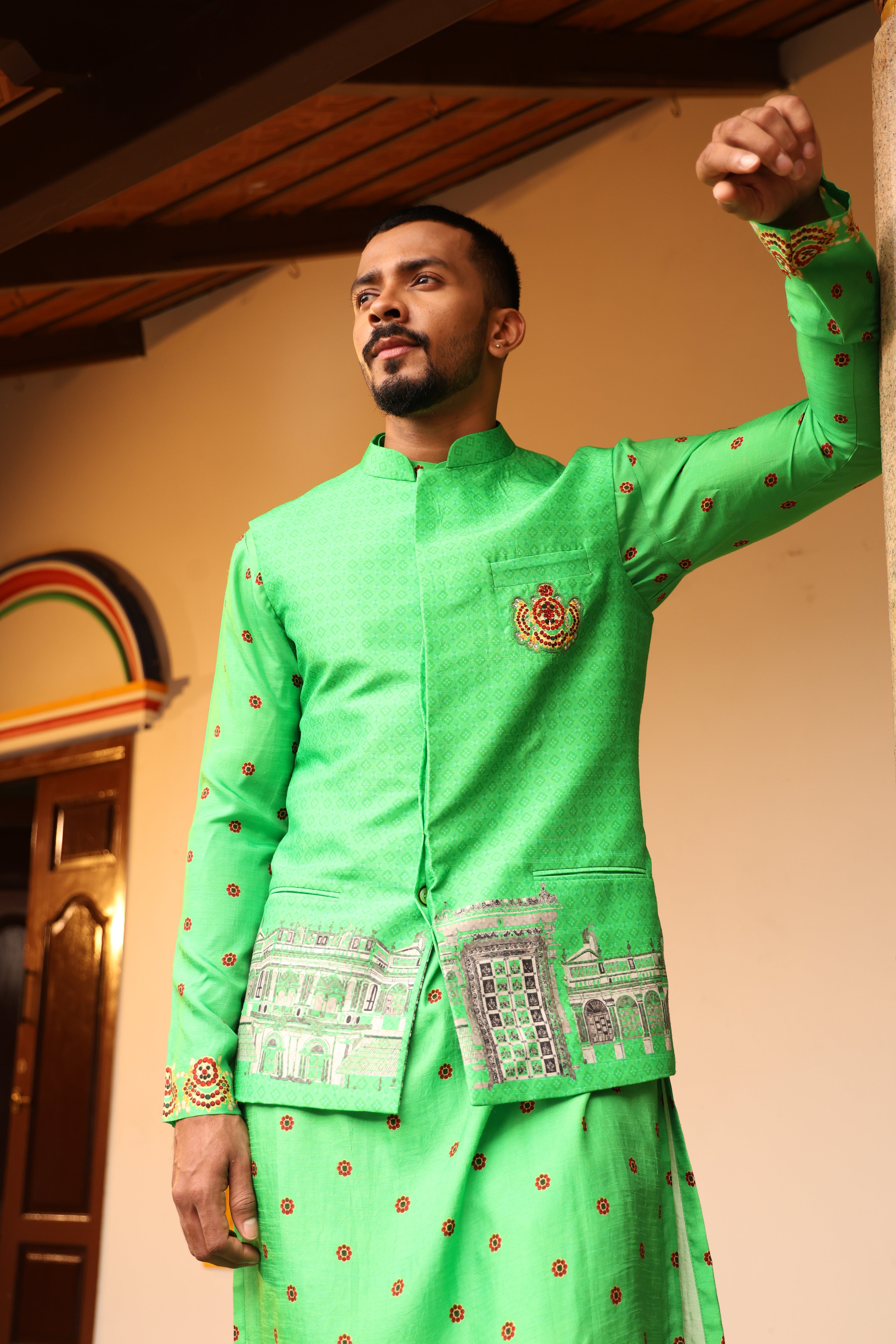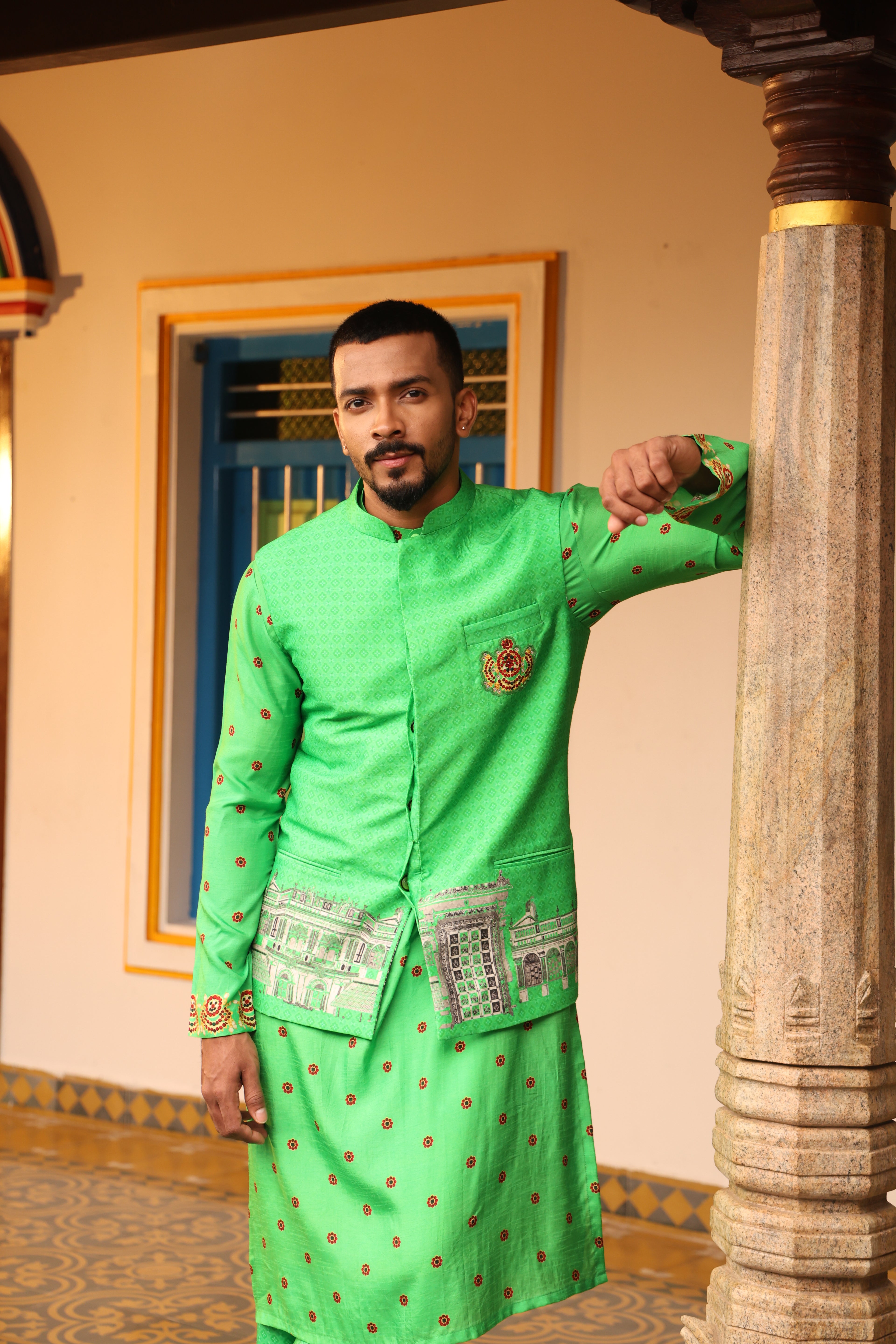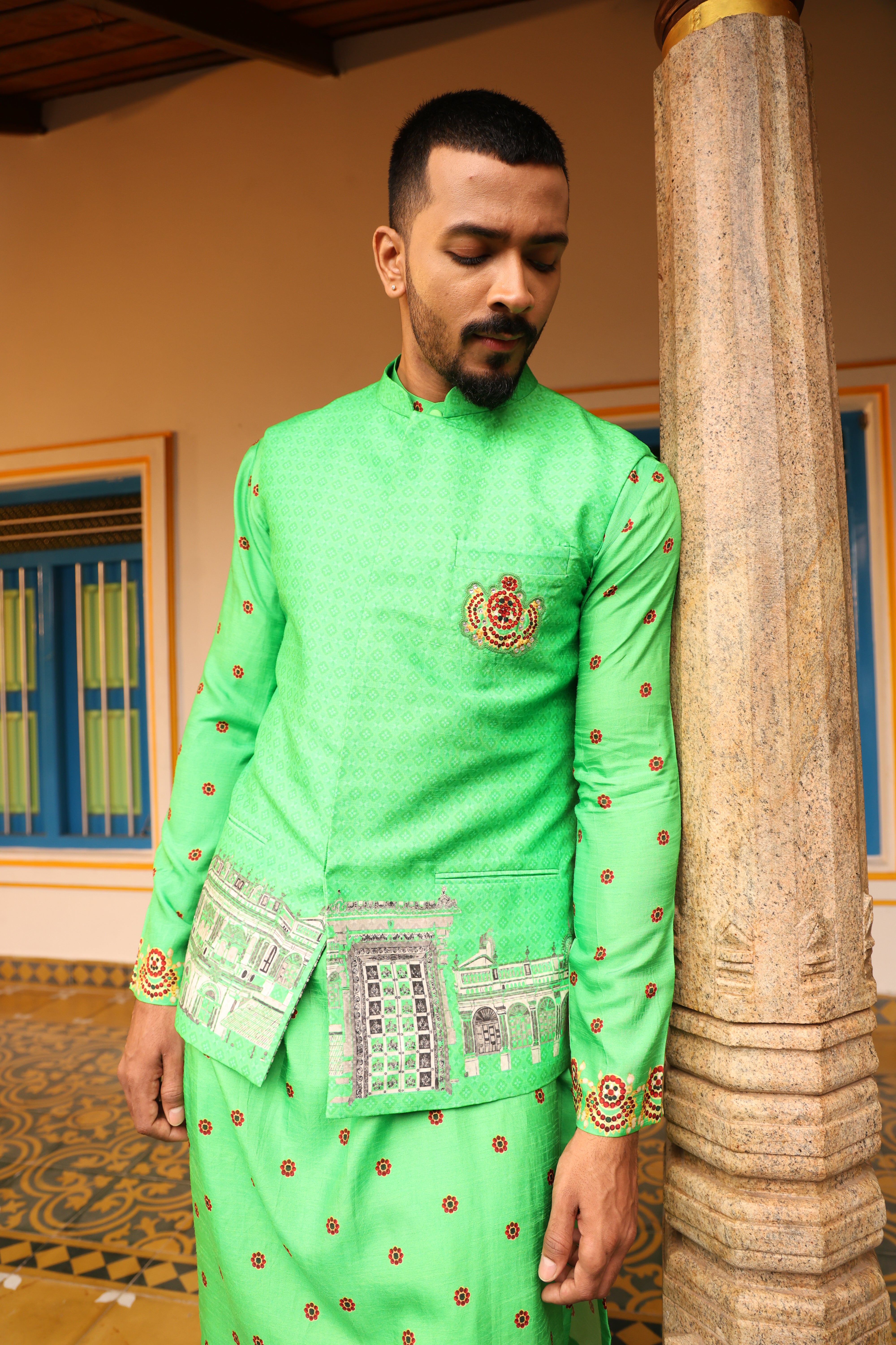 Round neck, front open jhuba with full sleeves. With chettinad architechture print and jewellery print embellished with stone embroidery.