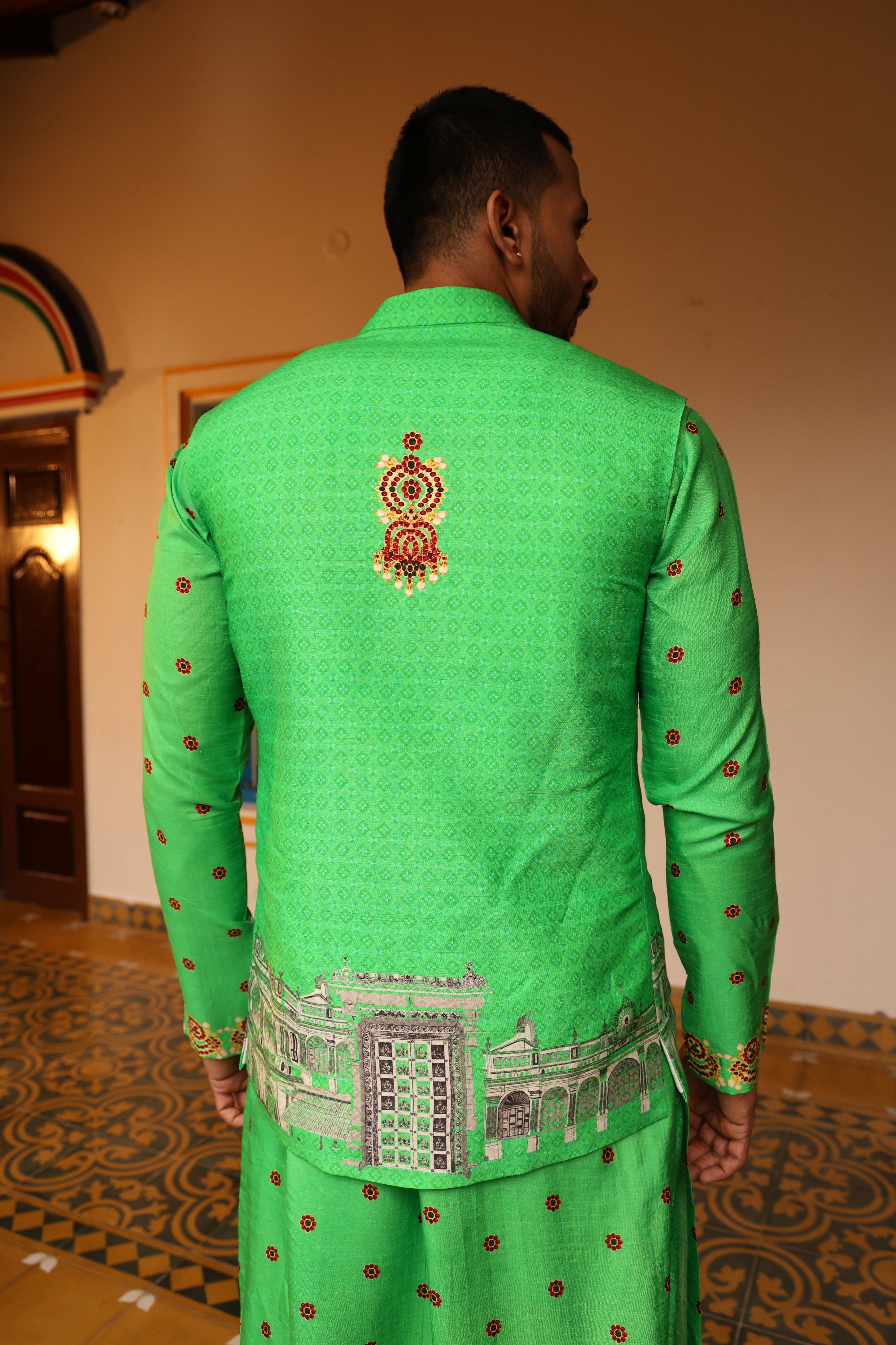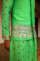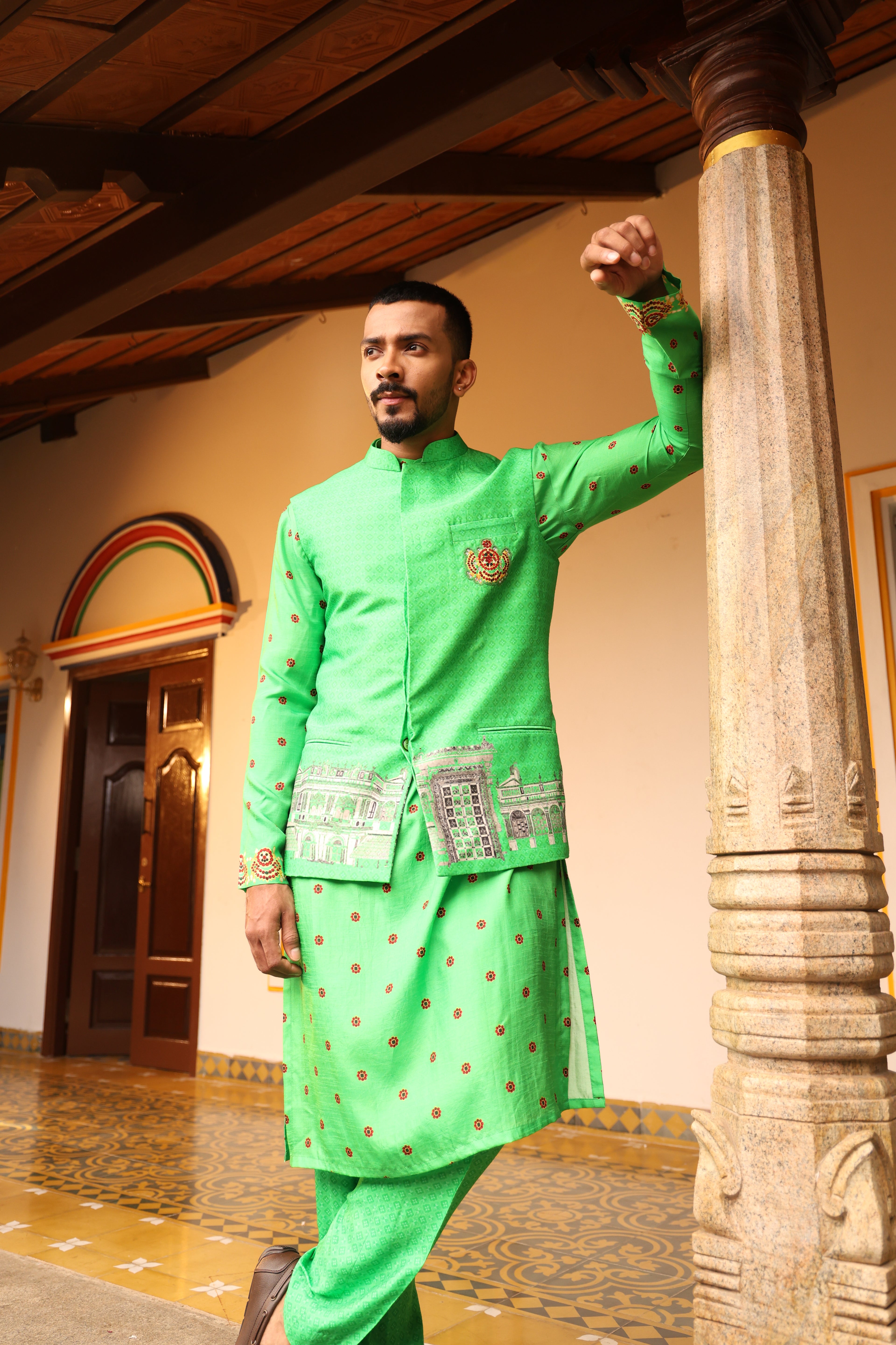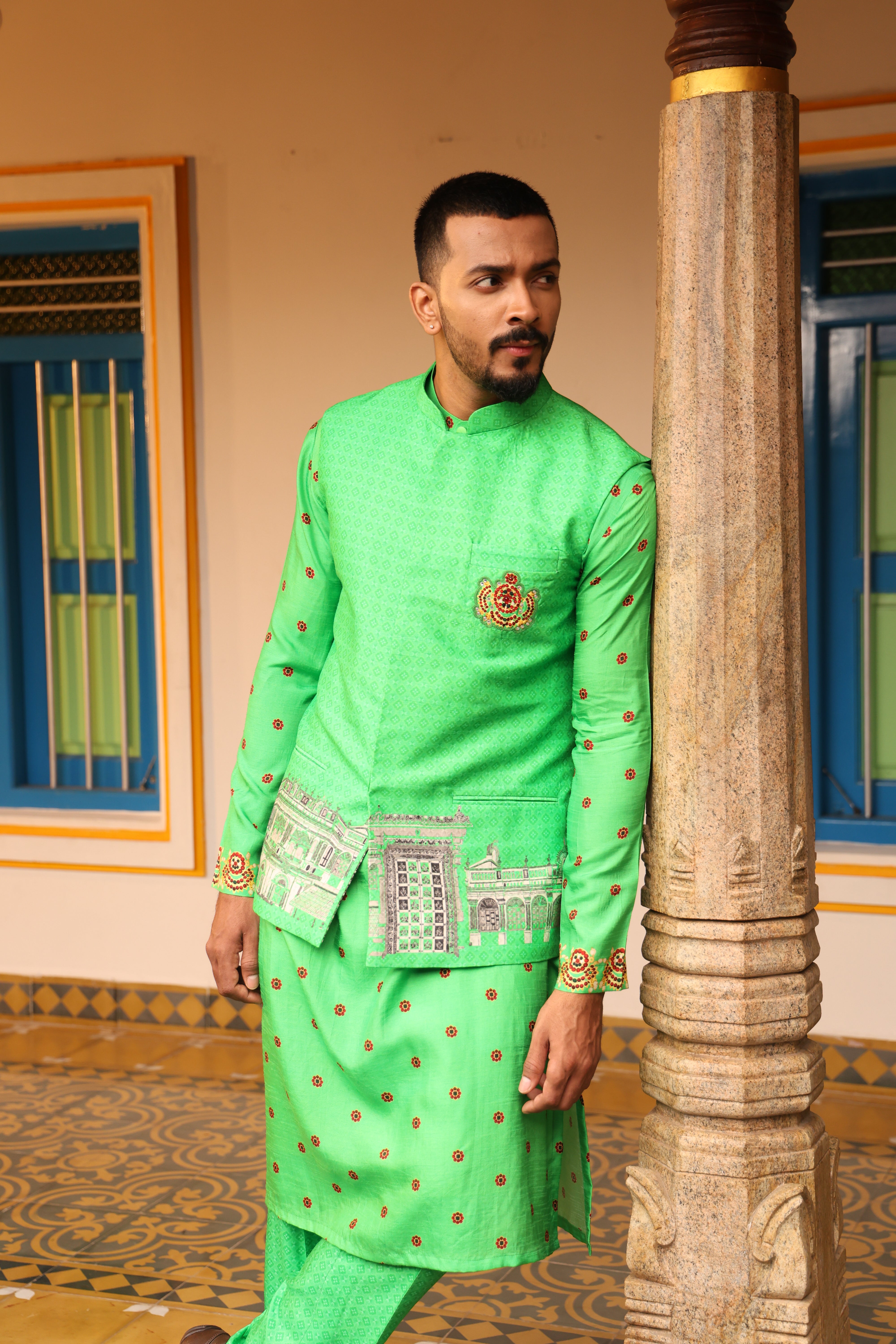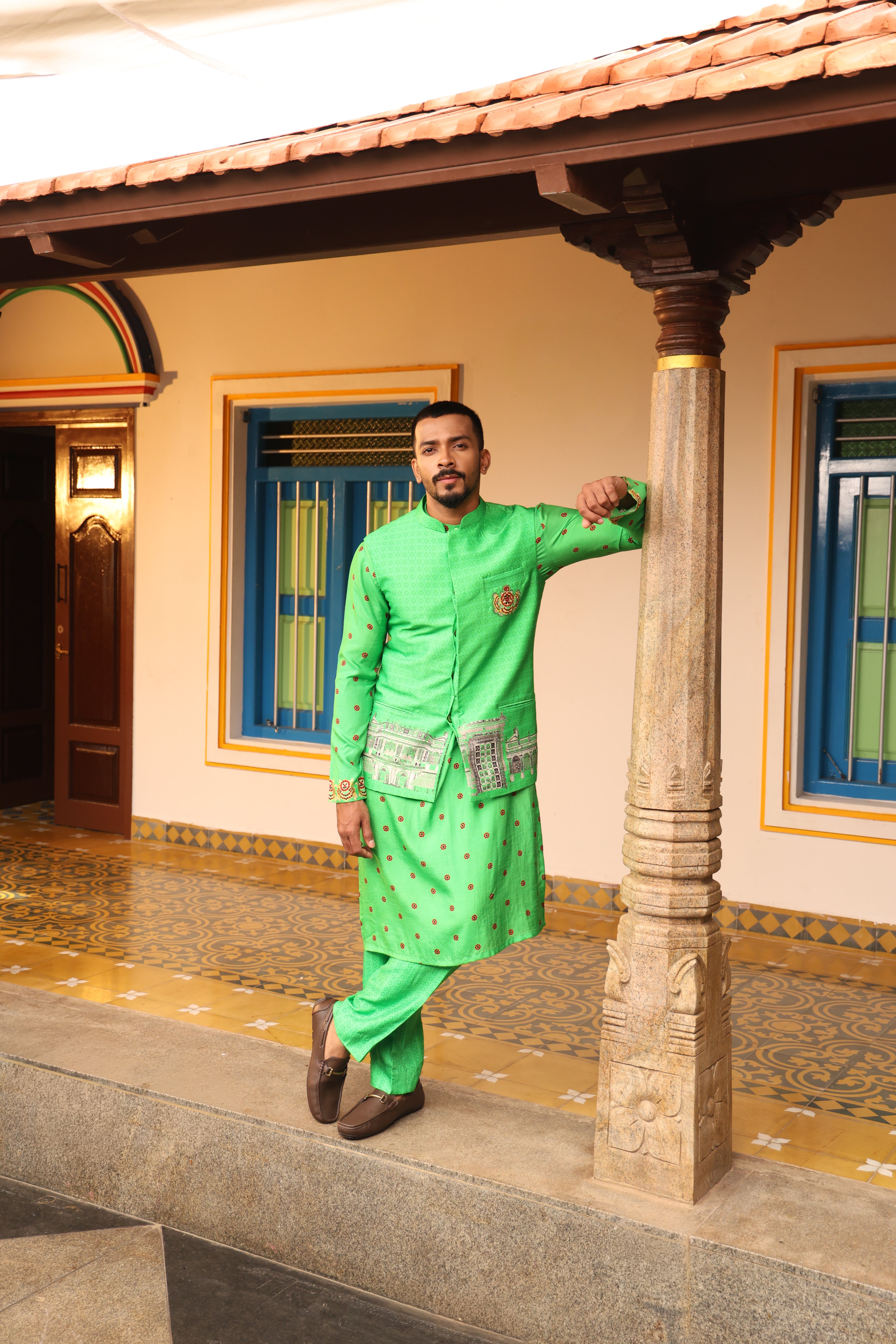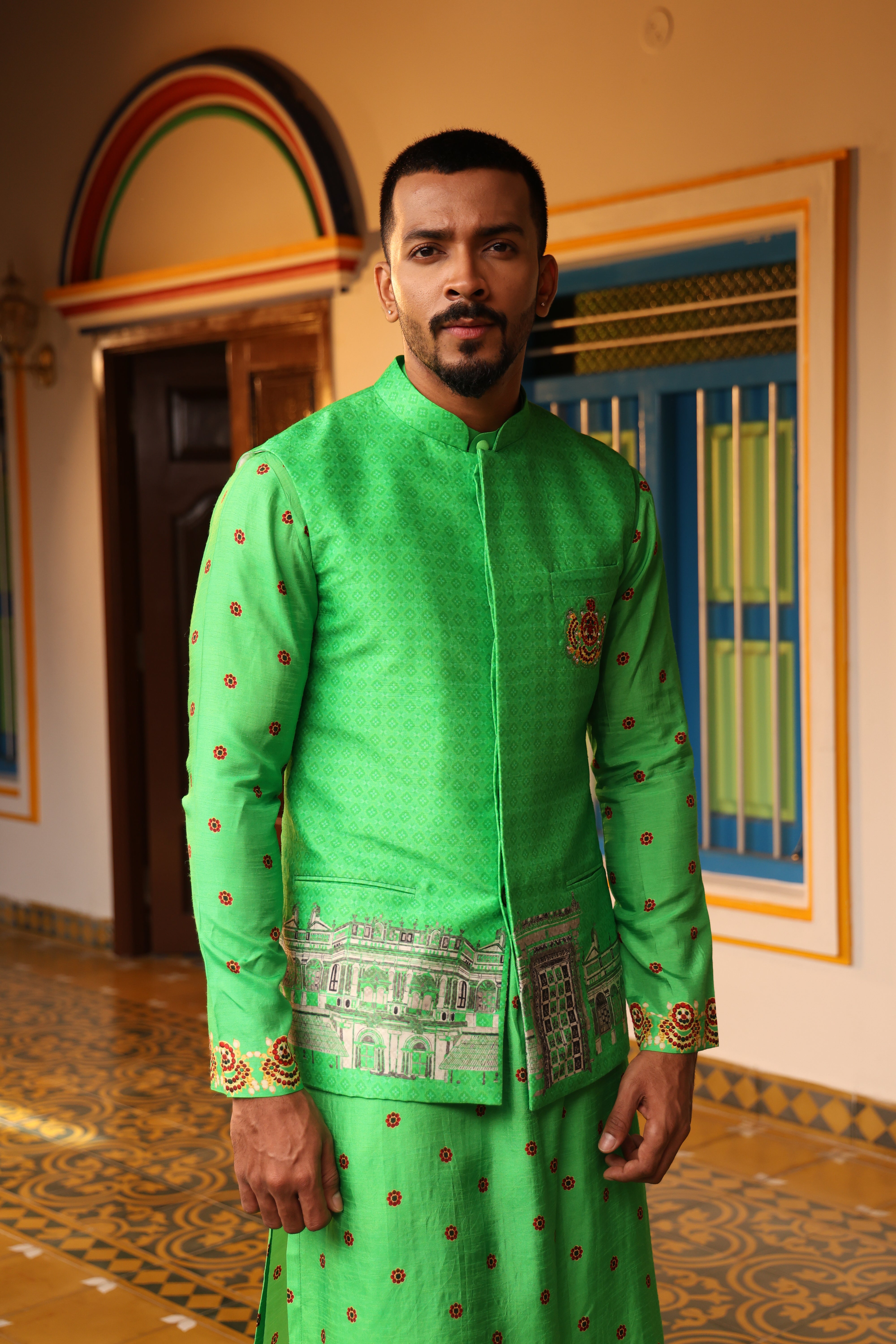 Round neck, front open jhuba with full sleeves. With chettinad architechture print and jewellery print embellished with stone embroidery.