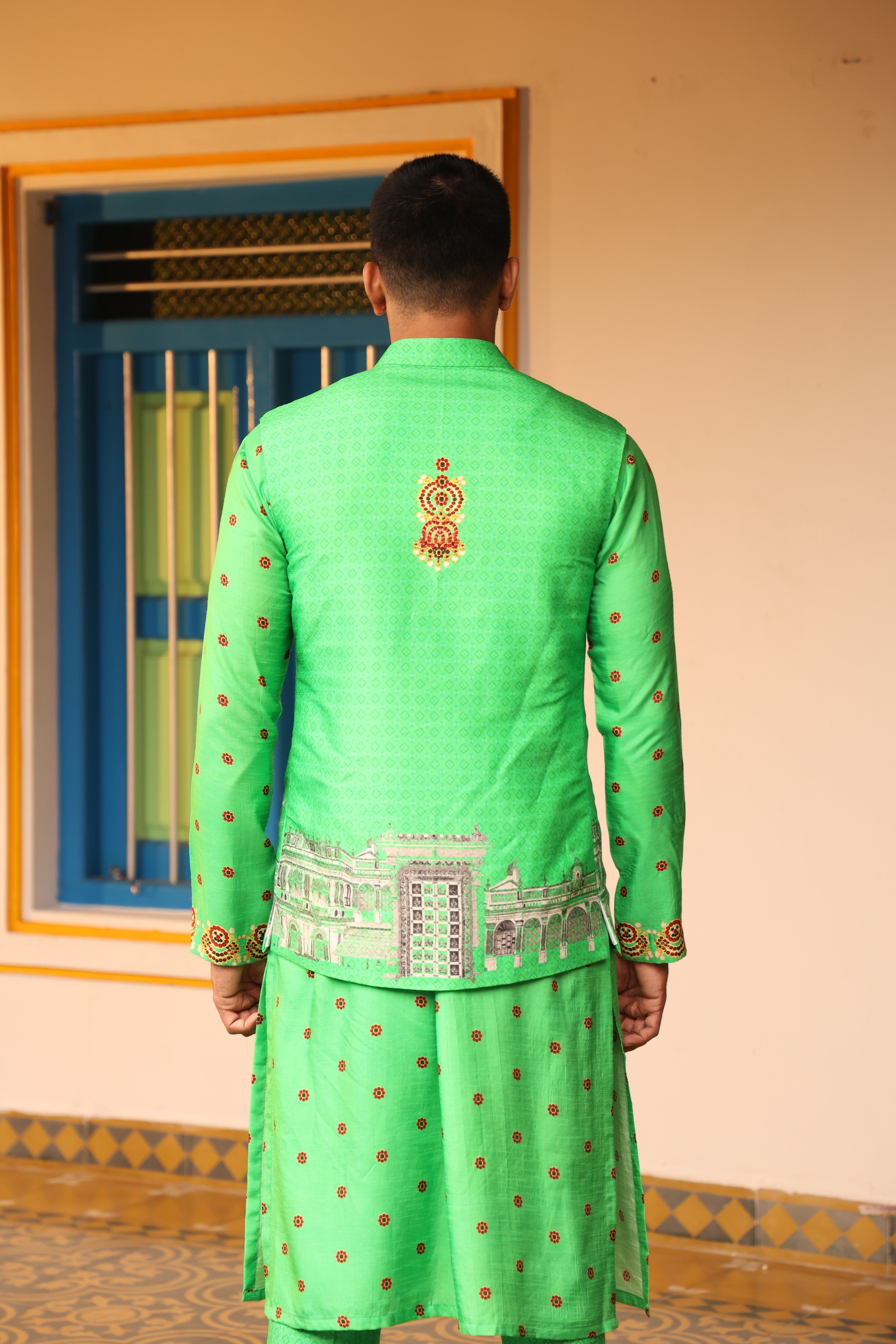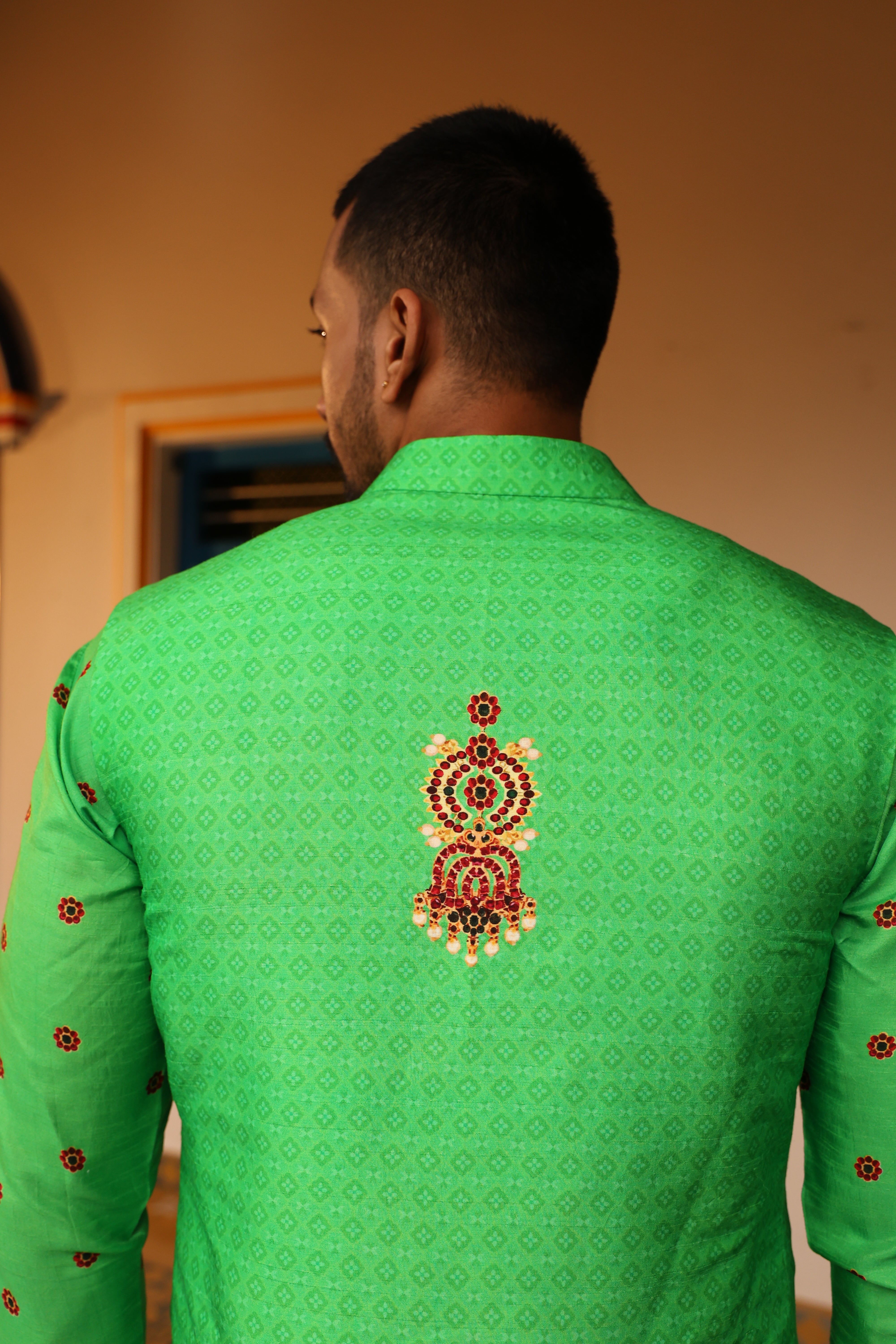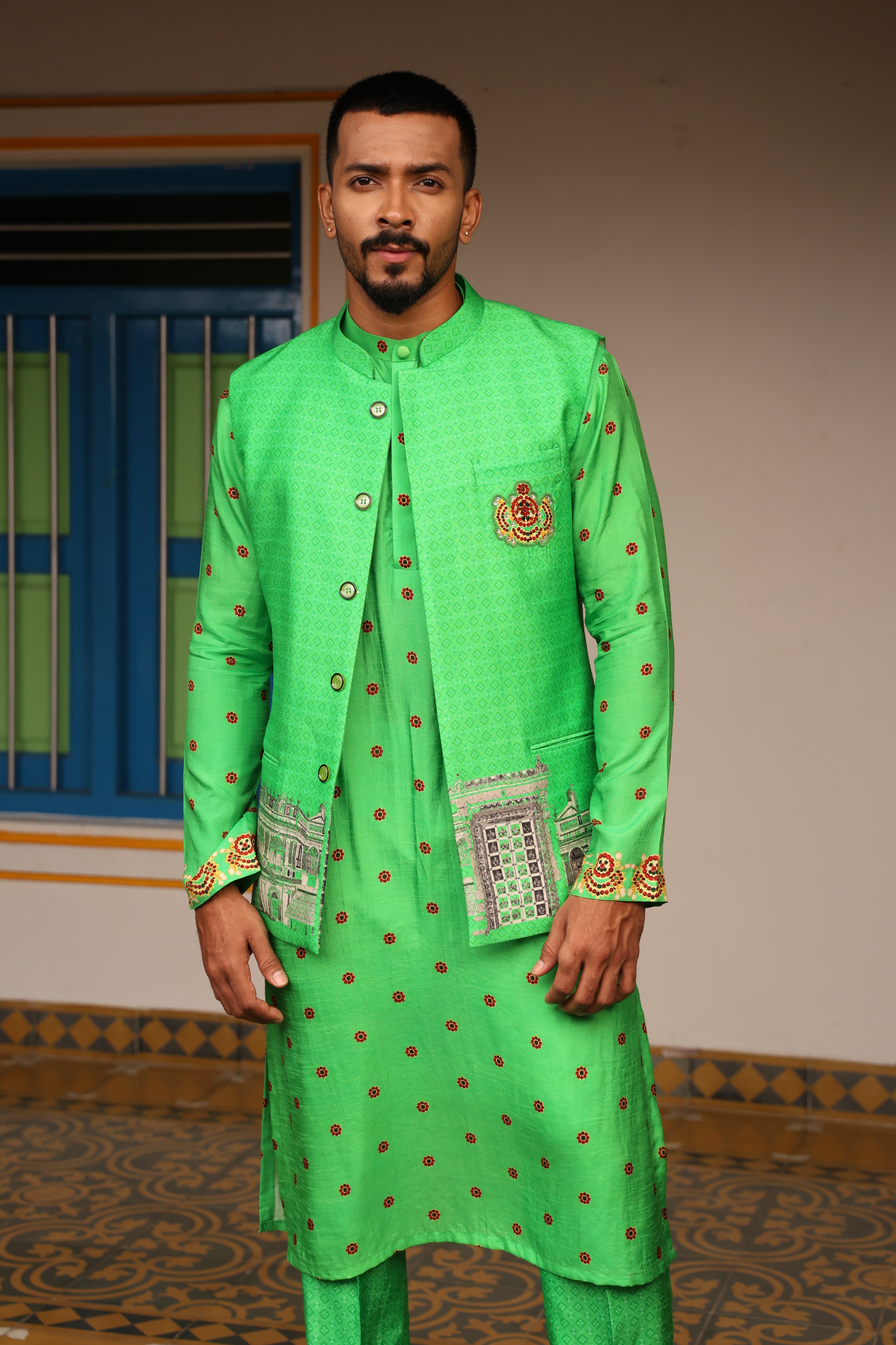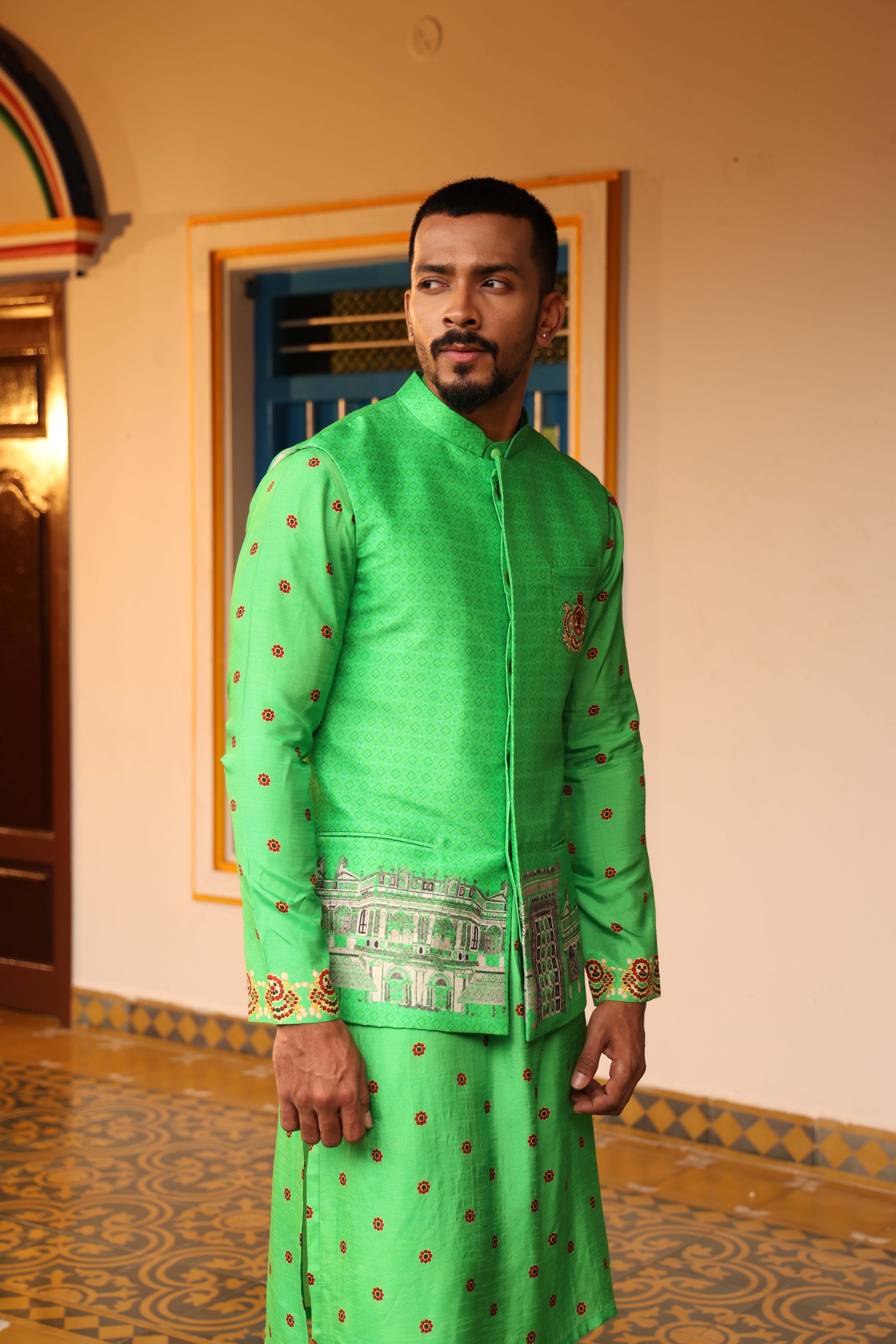 Round neck, front open jhuba with full sleeves. With chettinad architechture print and jewellery print embellished with stone embroidery.