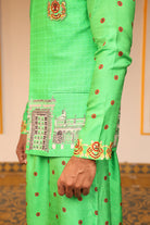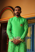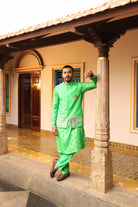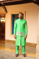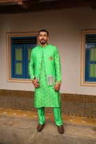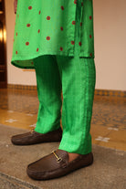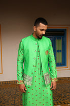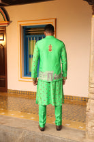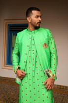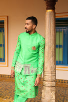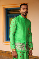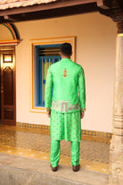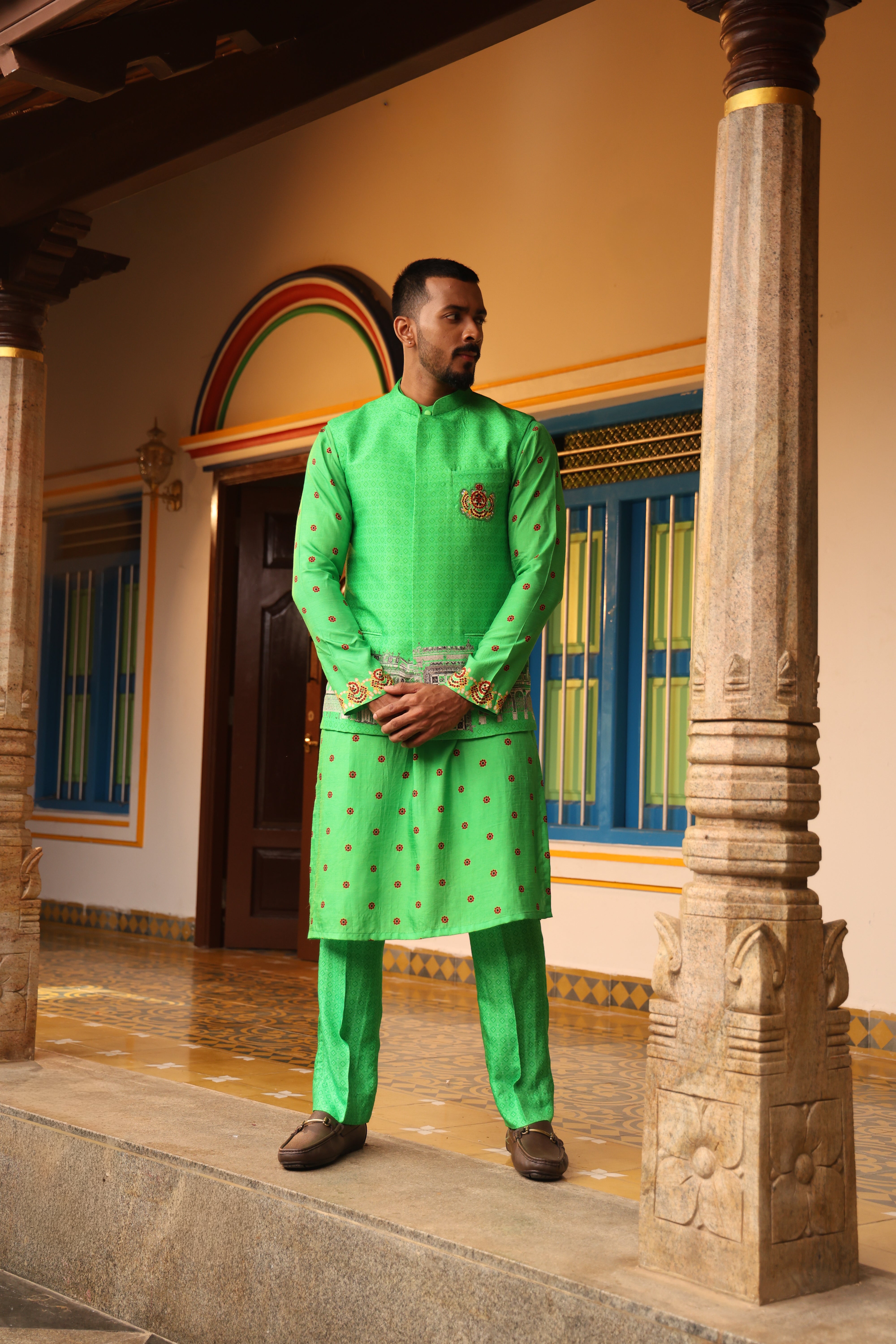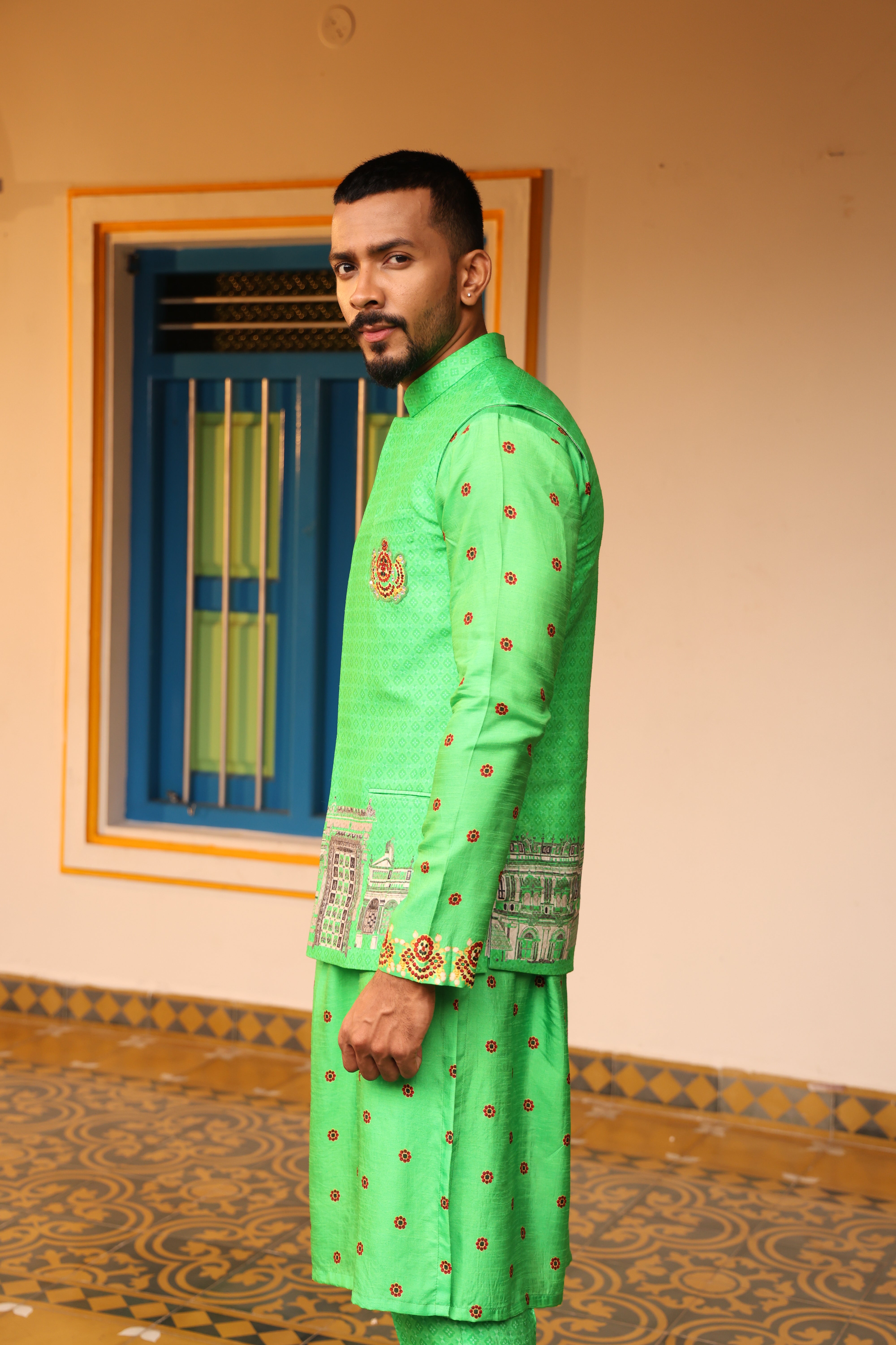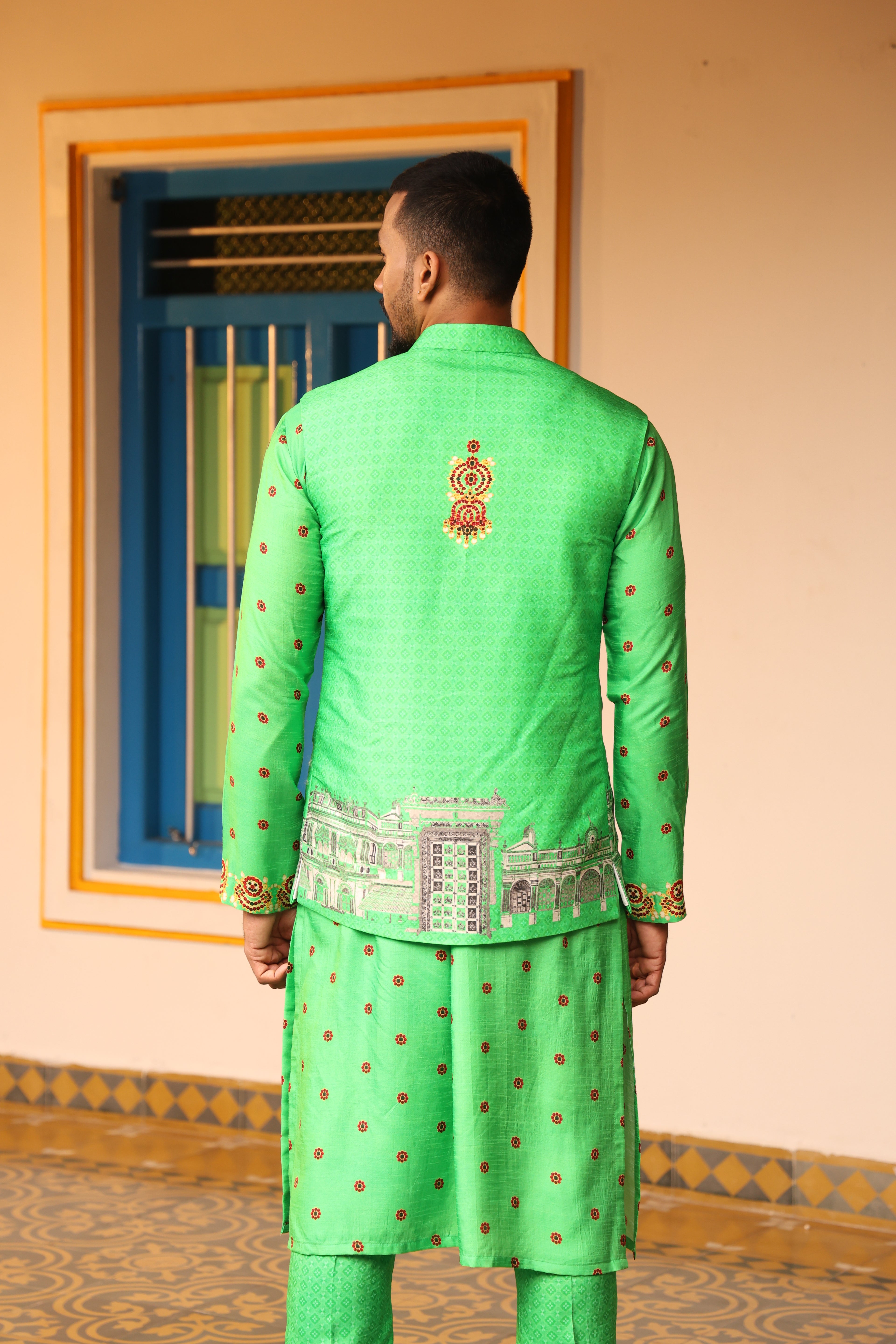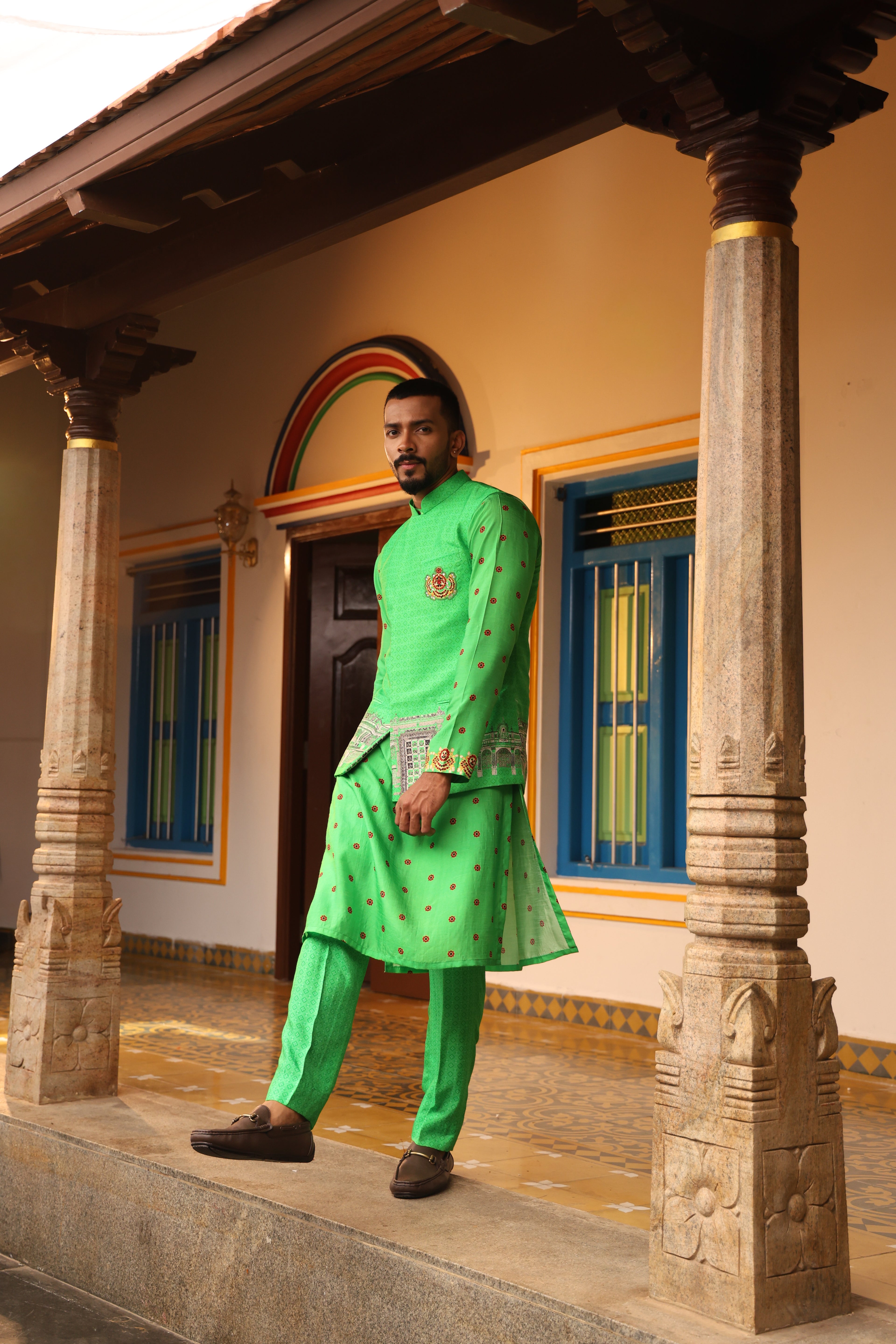 Round neck, front open jhuba with full sleeves. With chettinad architechture print and jewellery print embellished with stone embroidery.