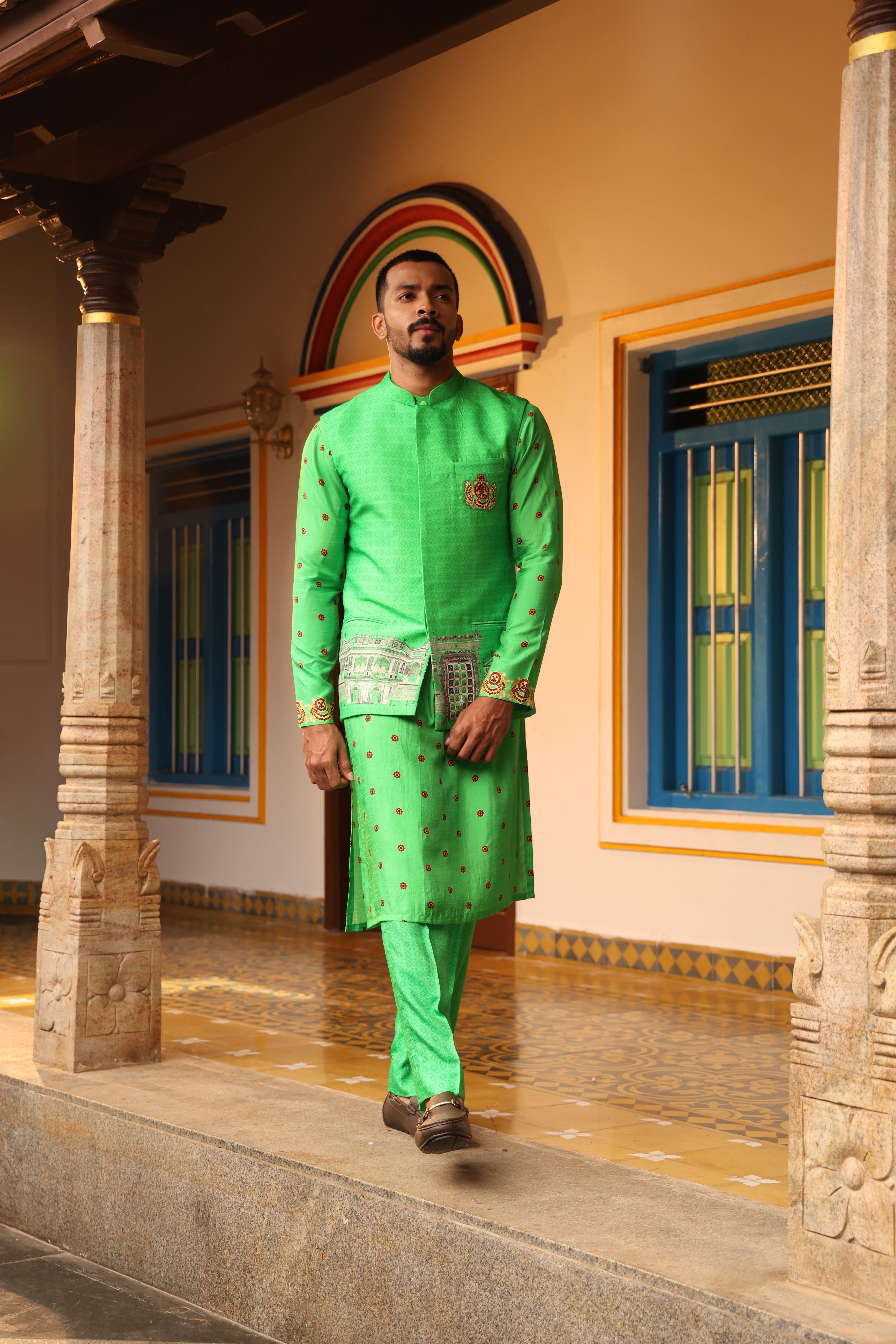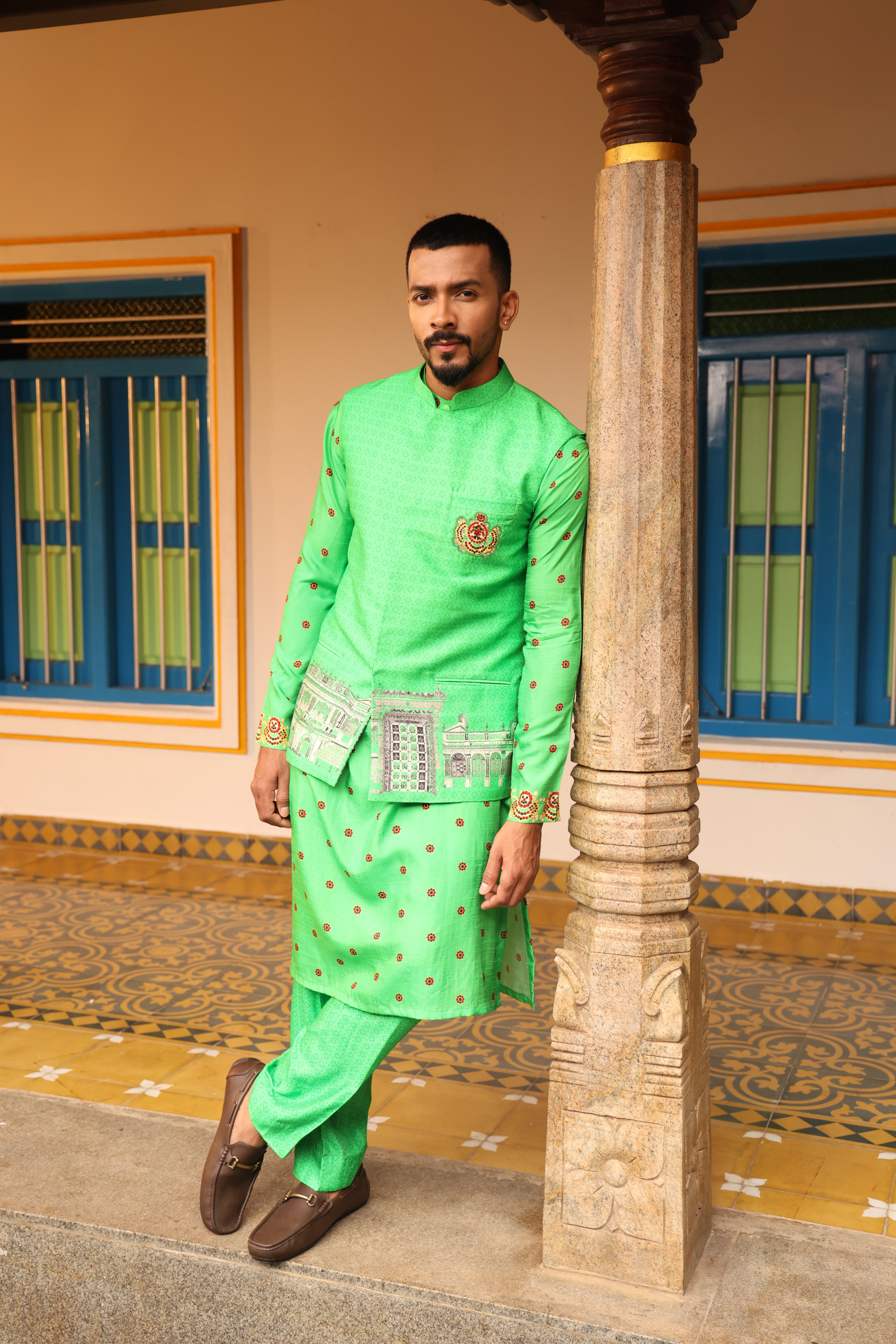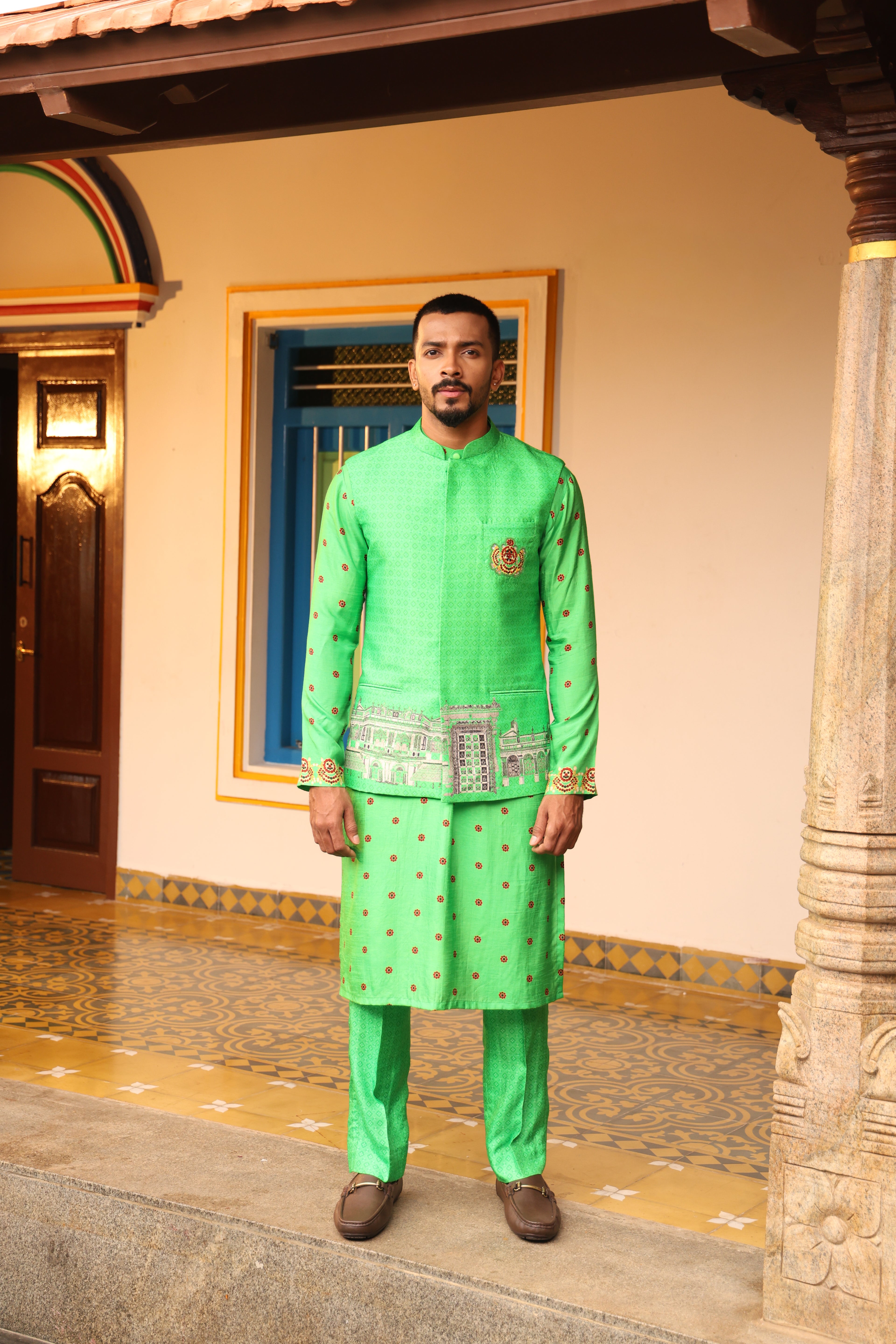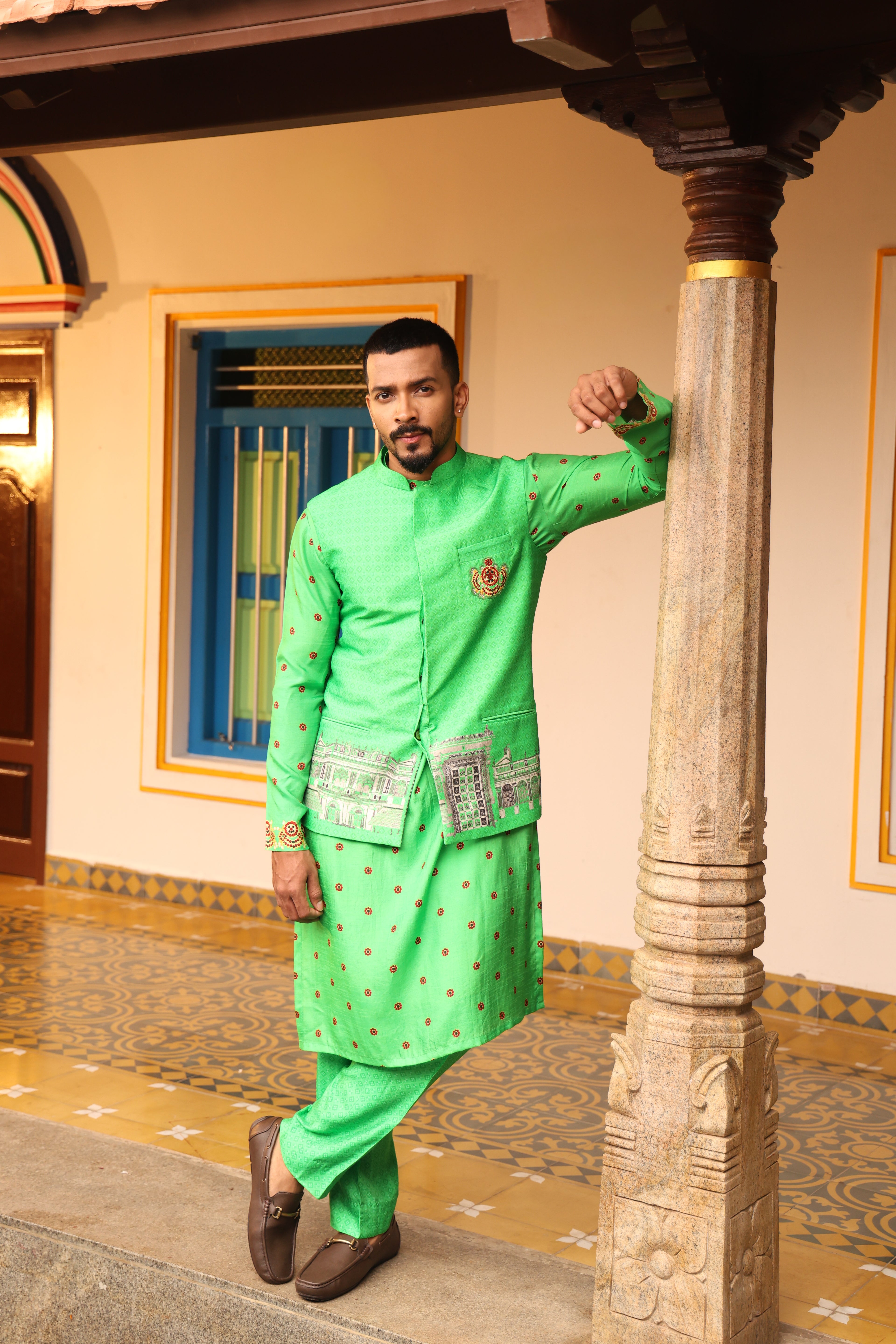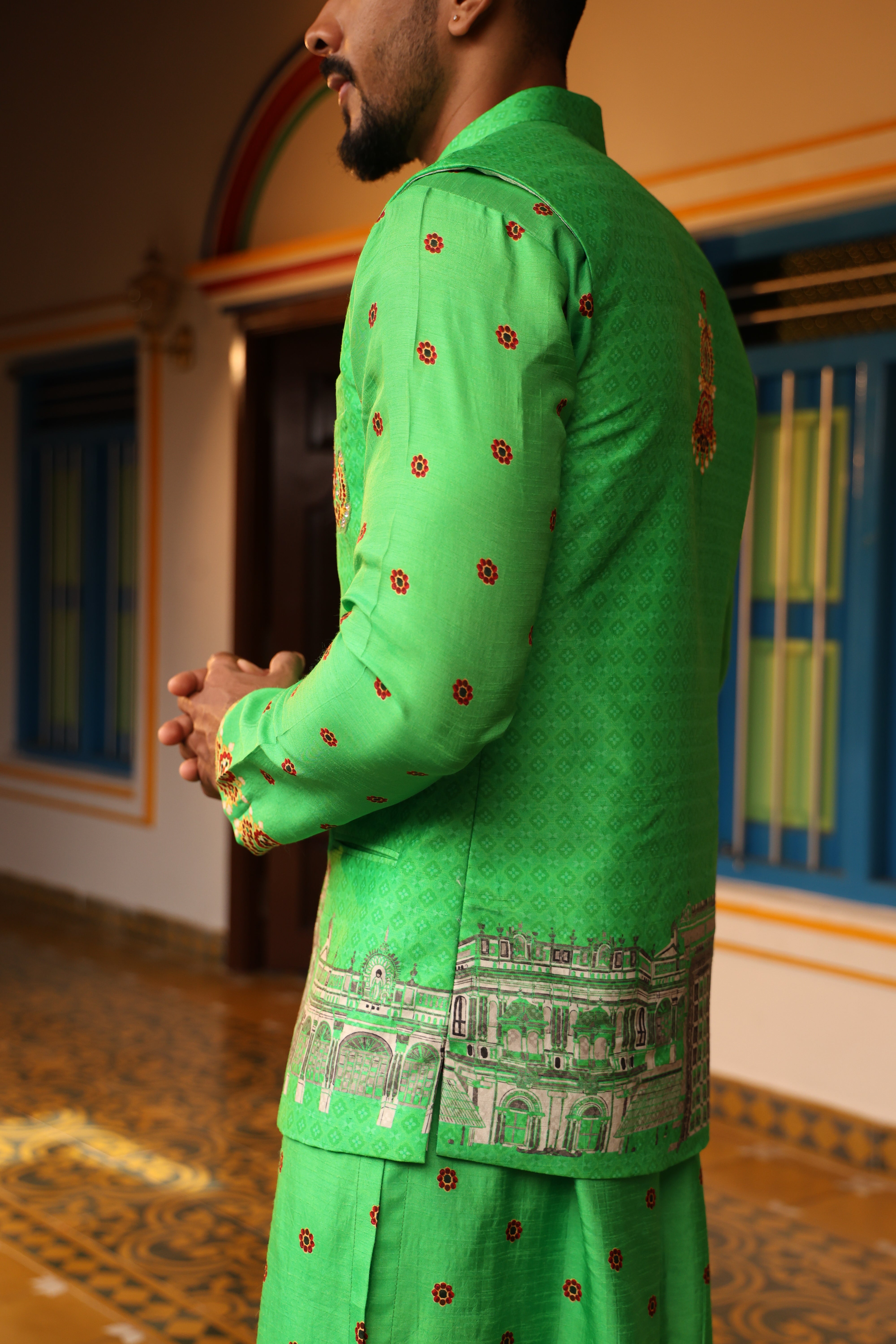 Teamed with straight fit troussers also to be worn with chinese collar bandgala enhancing chettinad architecture and jewellery in digital print.