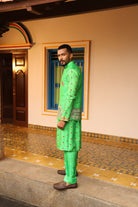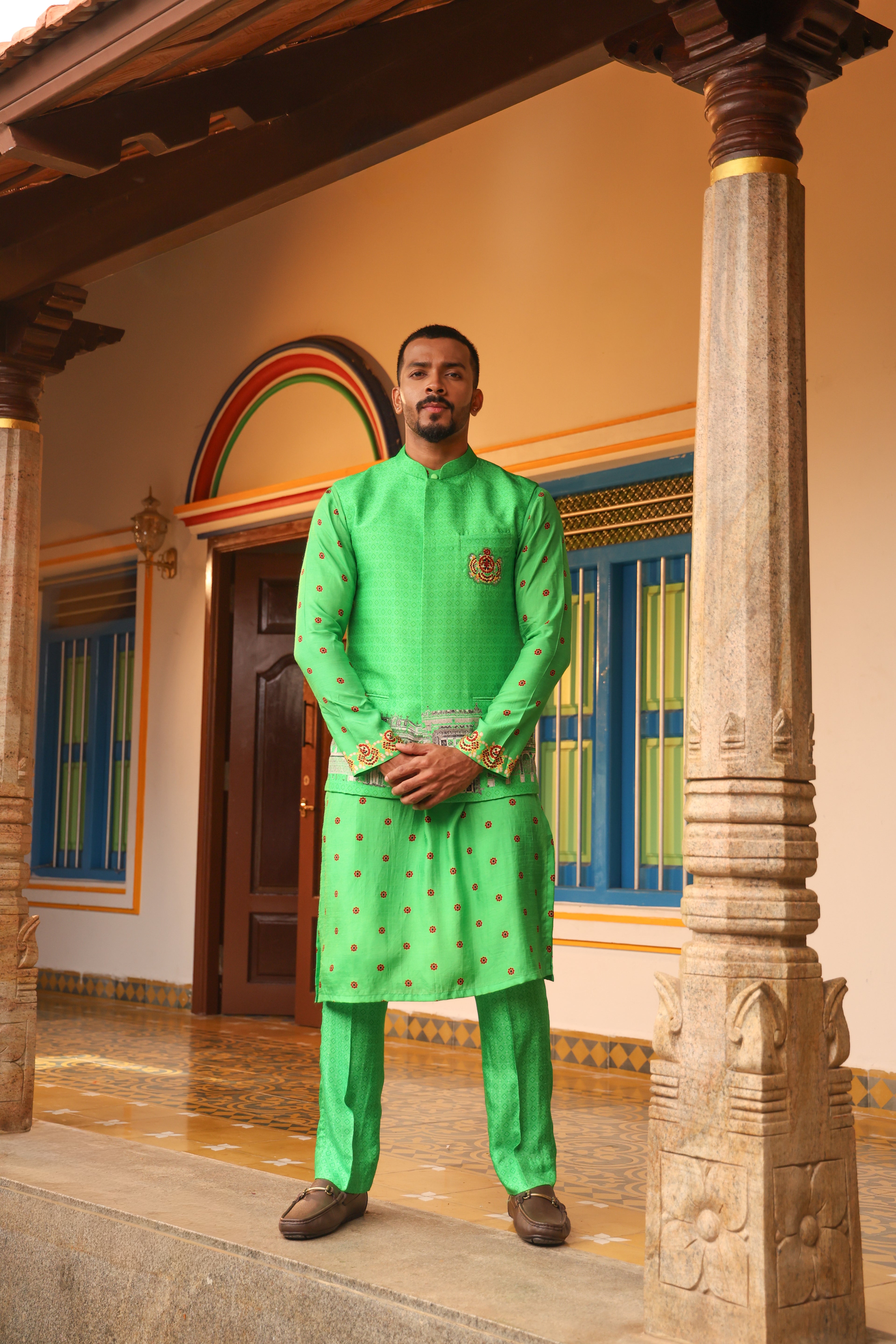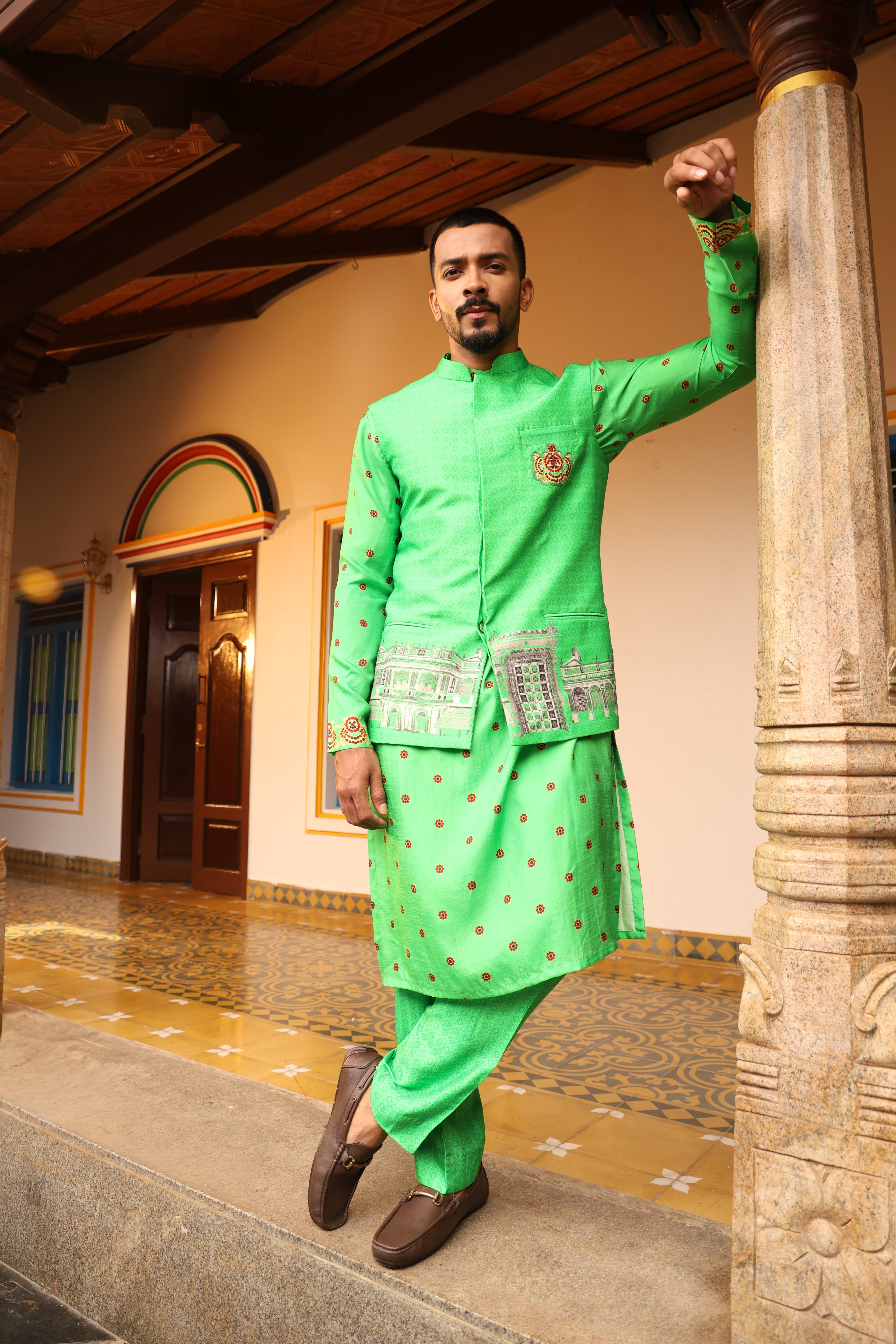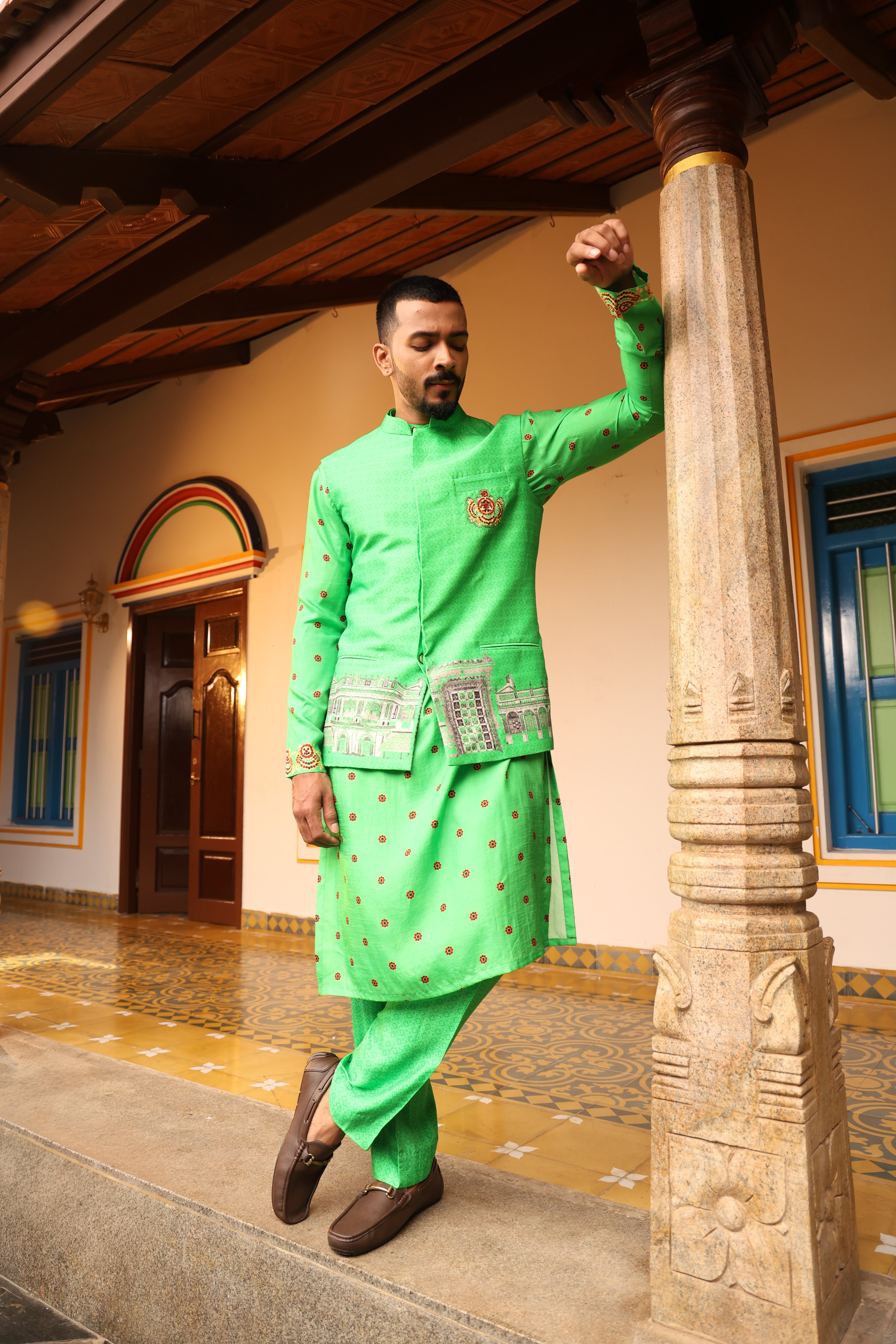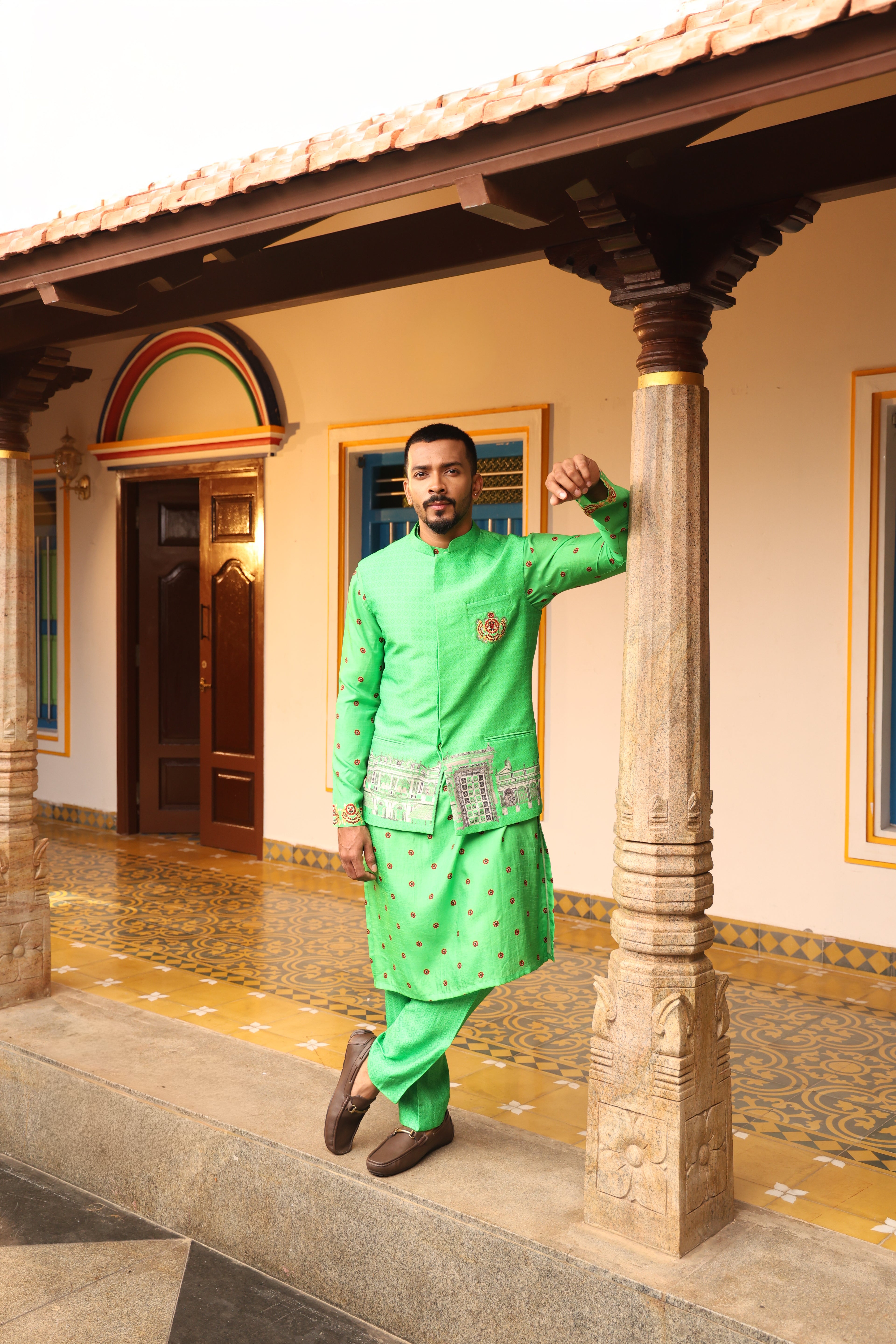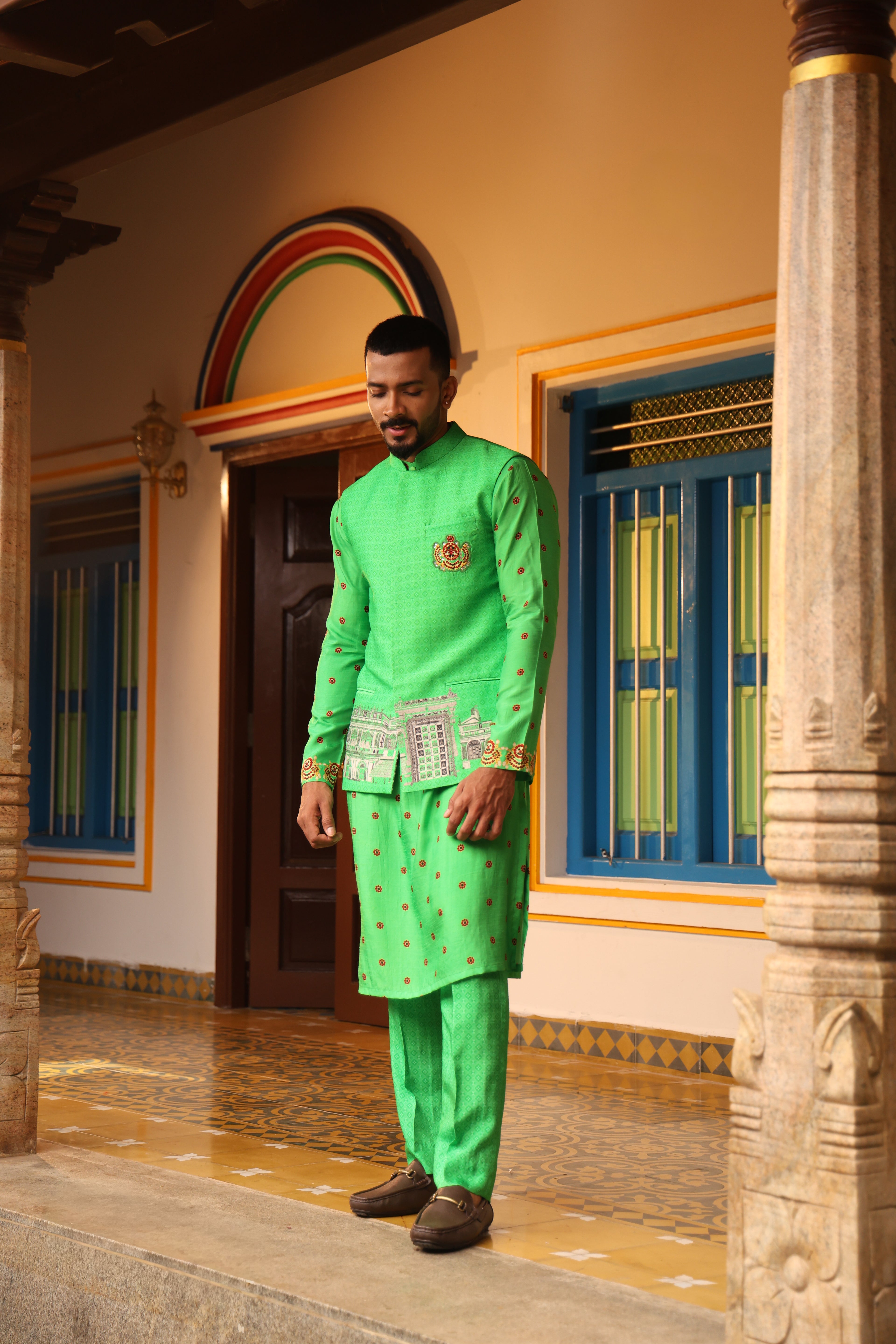 Teamed with straight fit troussers also to be worn with chinese collar bandgala enhancing chettinad architecture and jewellery in digital print.