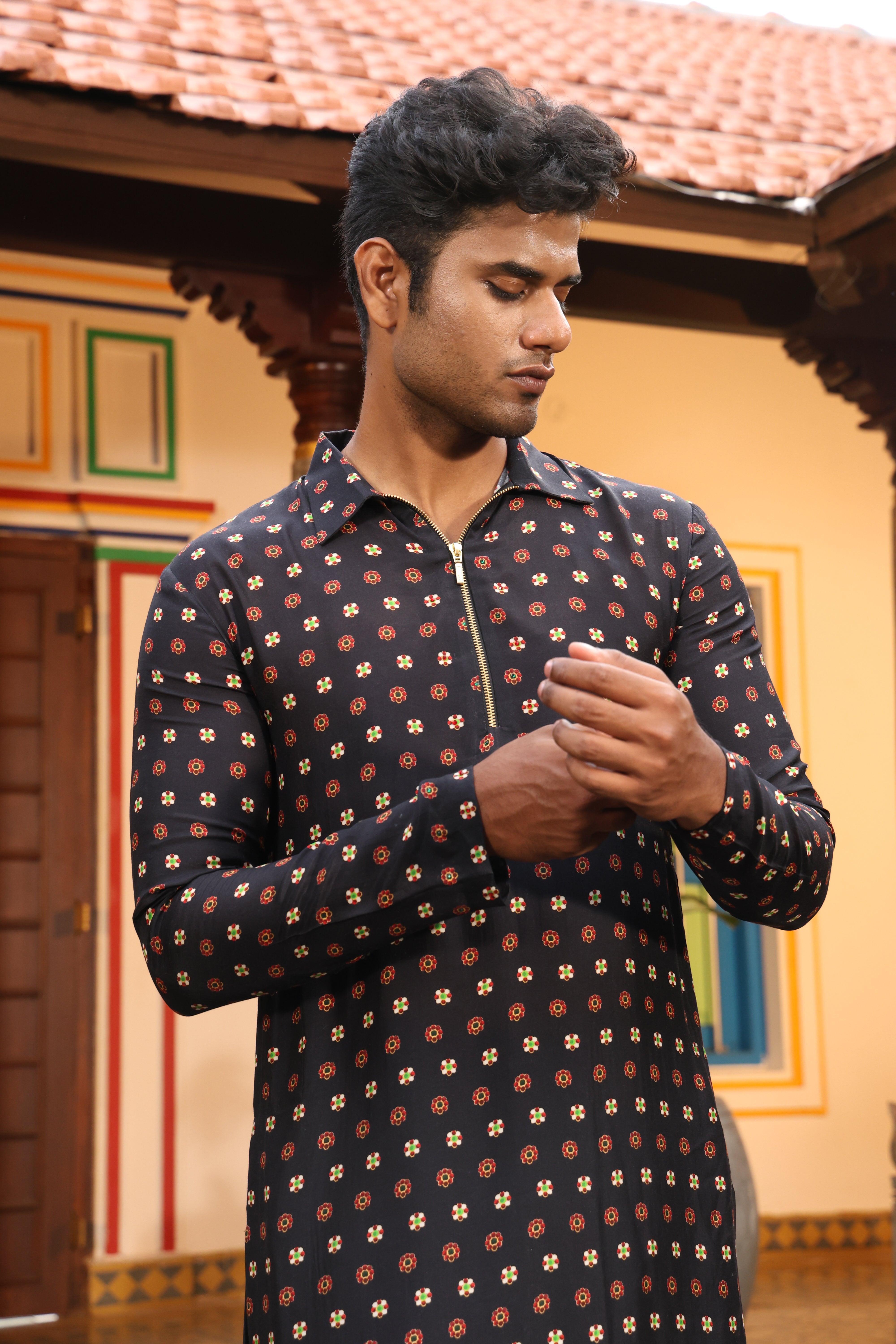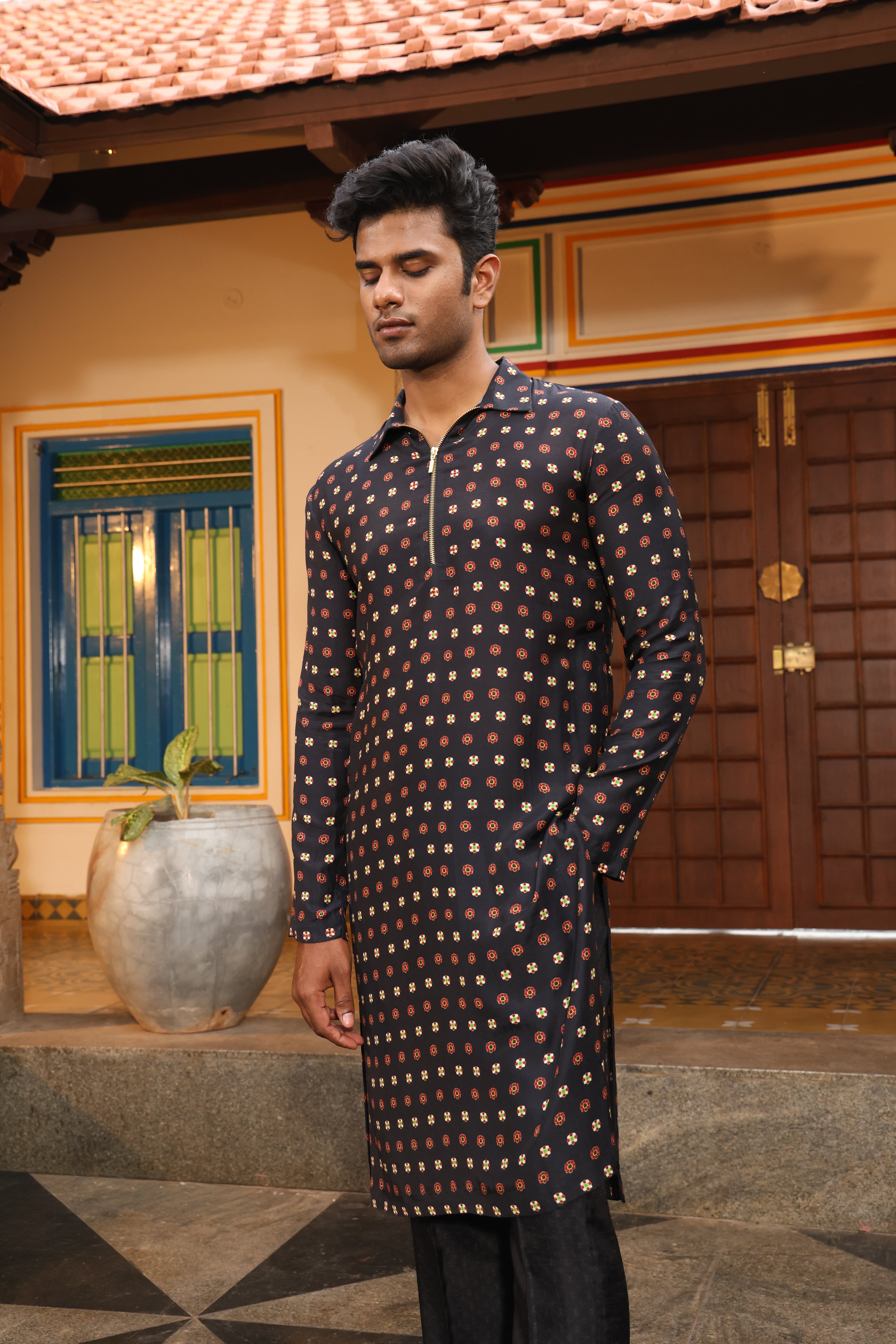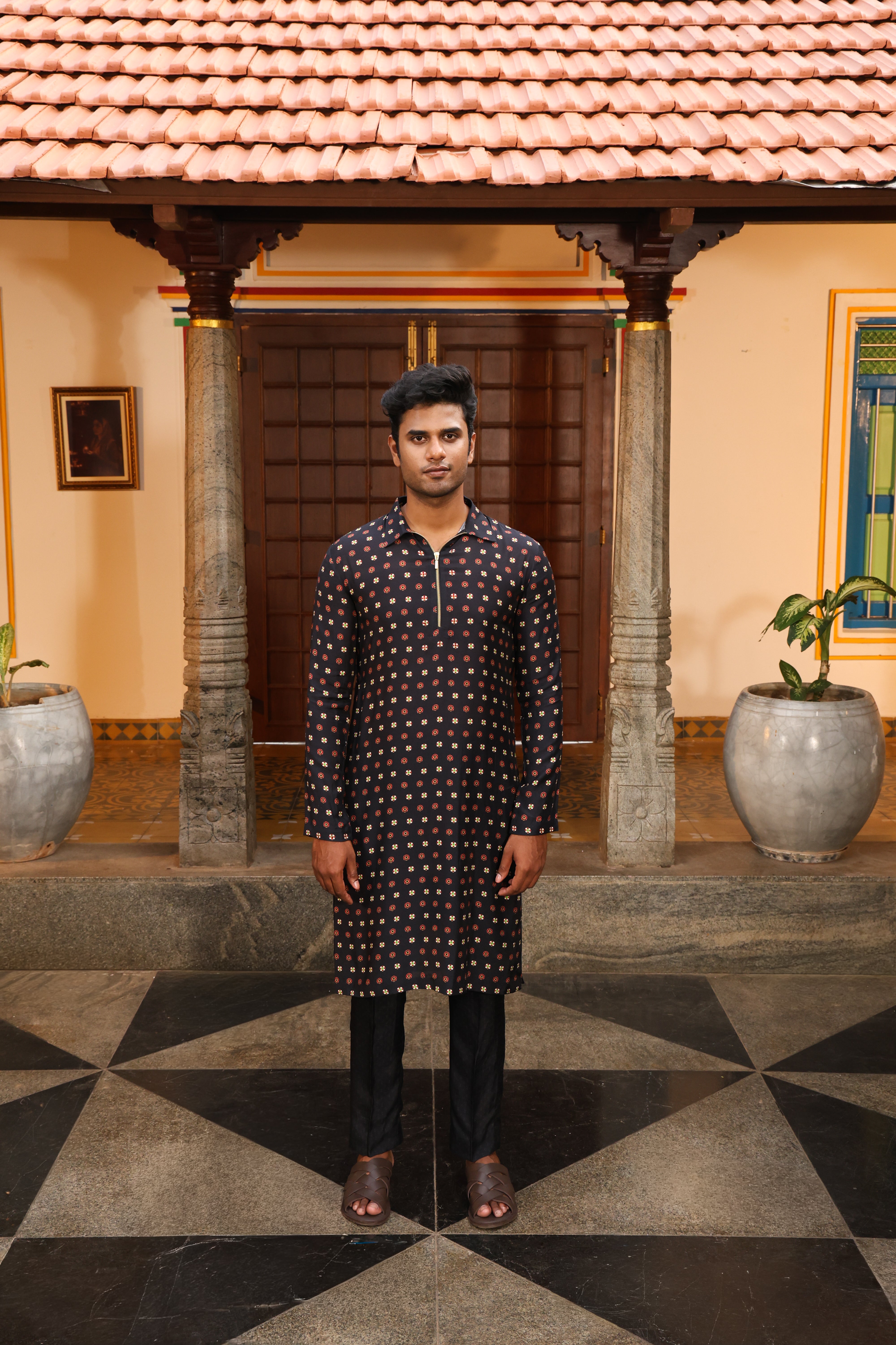 Celebrating craftsmanship rooted in chettinad jewellery digital print all over the kurta, shirt collar,