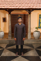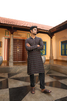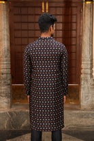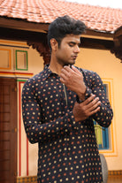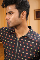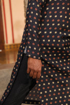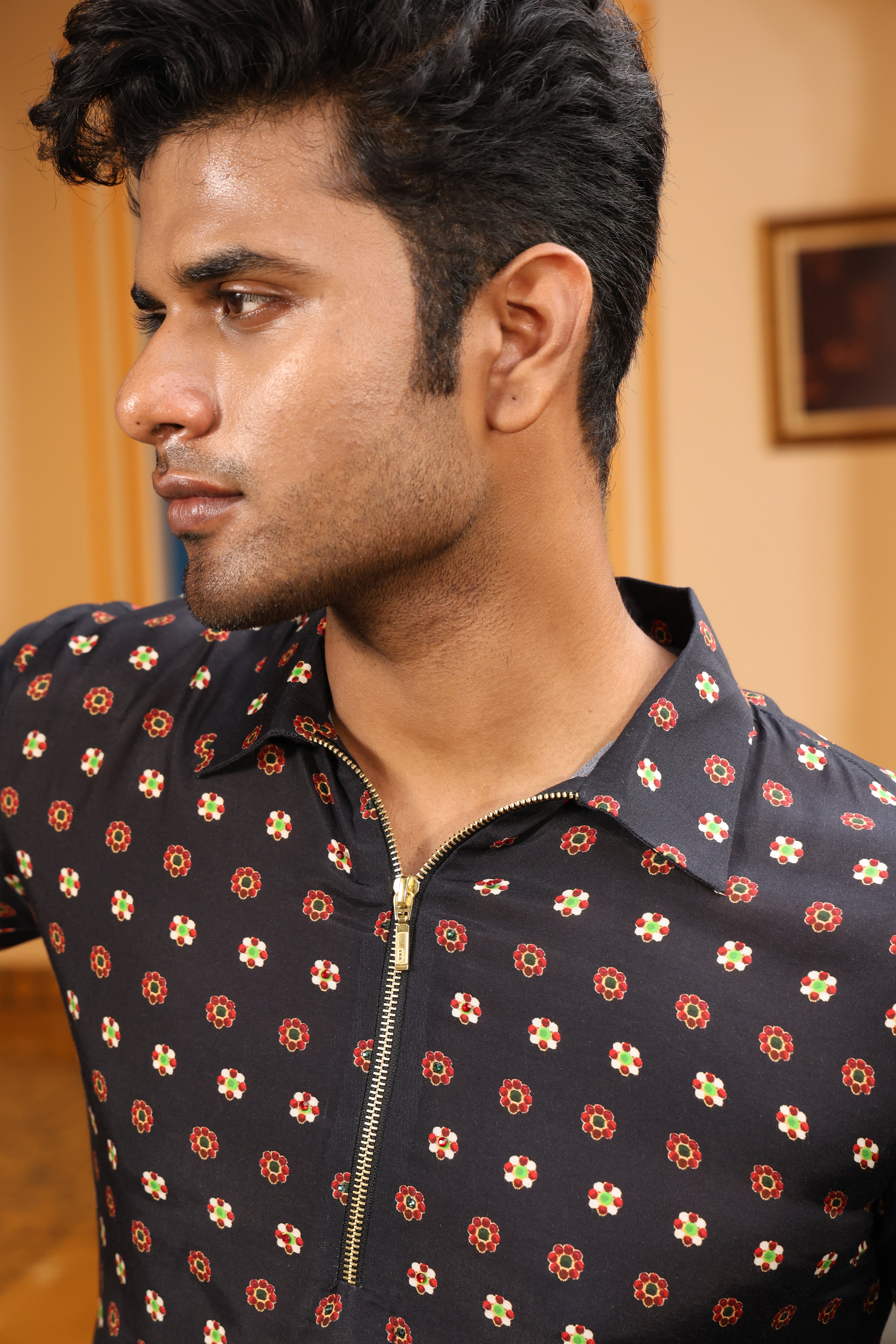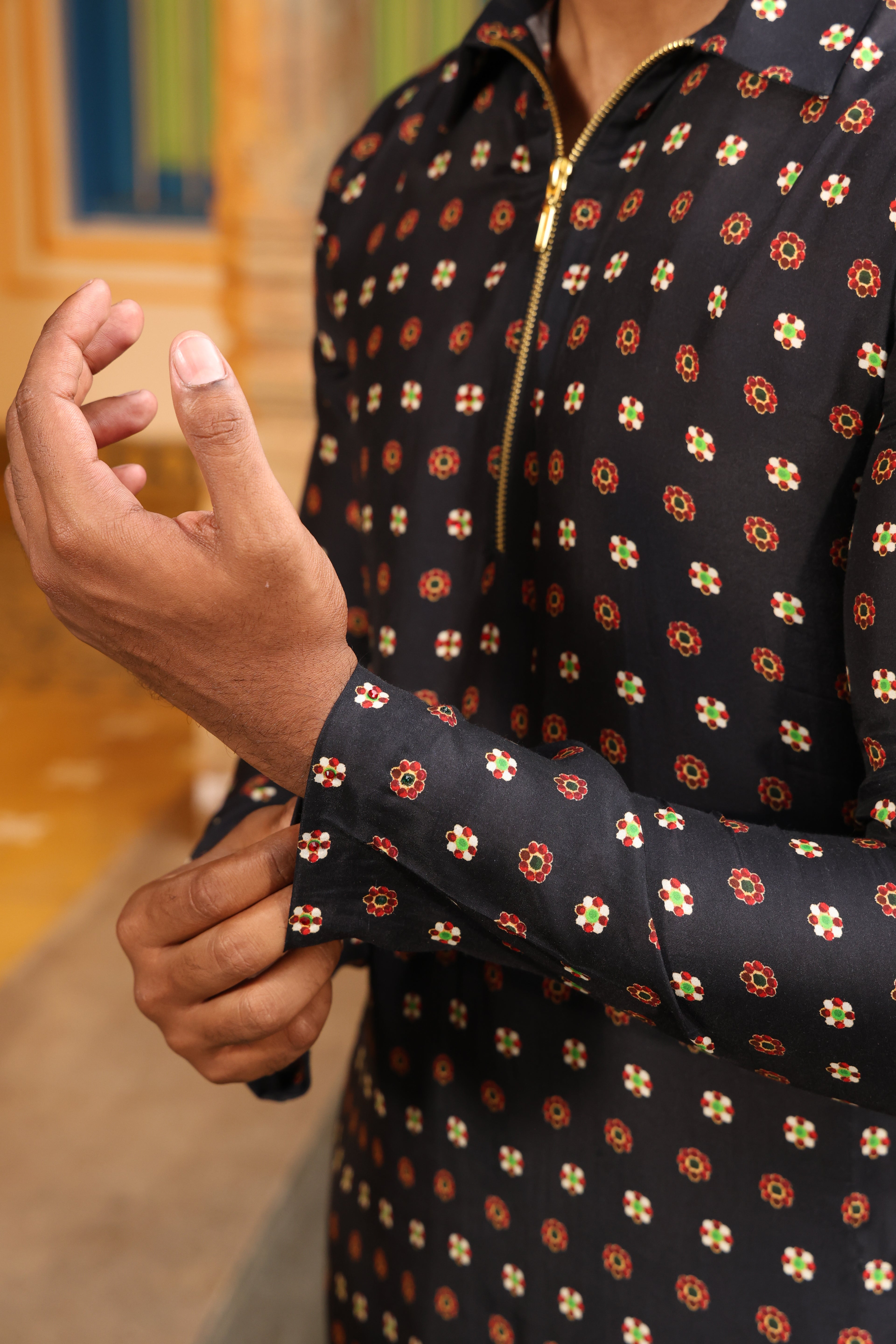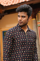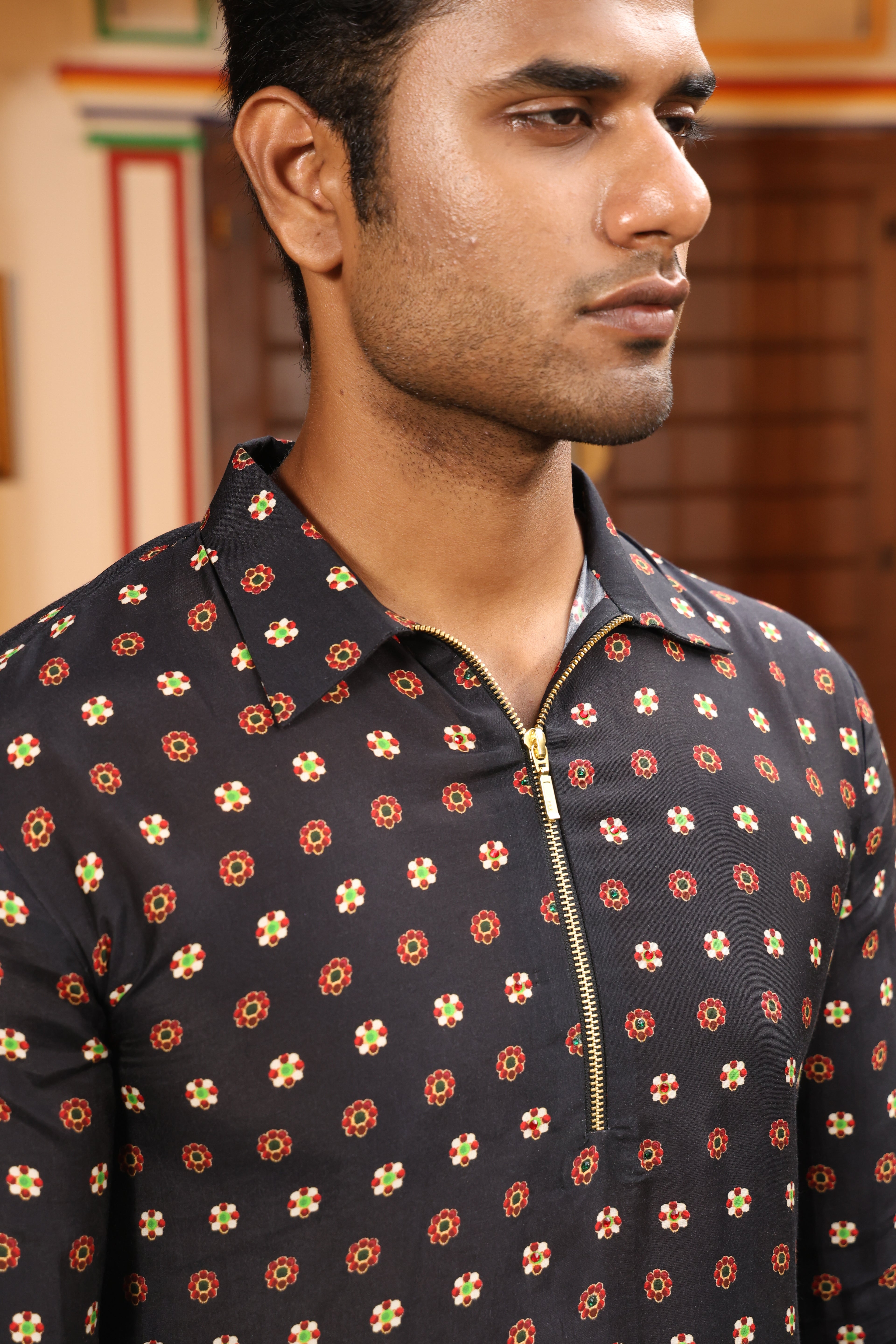 Celebrating craftsmanship rooted in chettinad jewellery digital print all over the kurta, shirt collar,