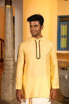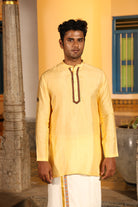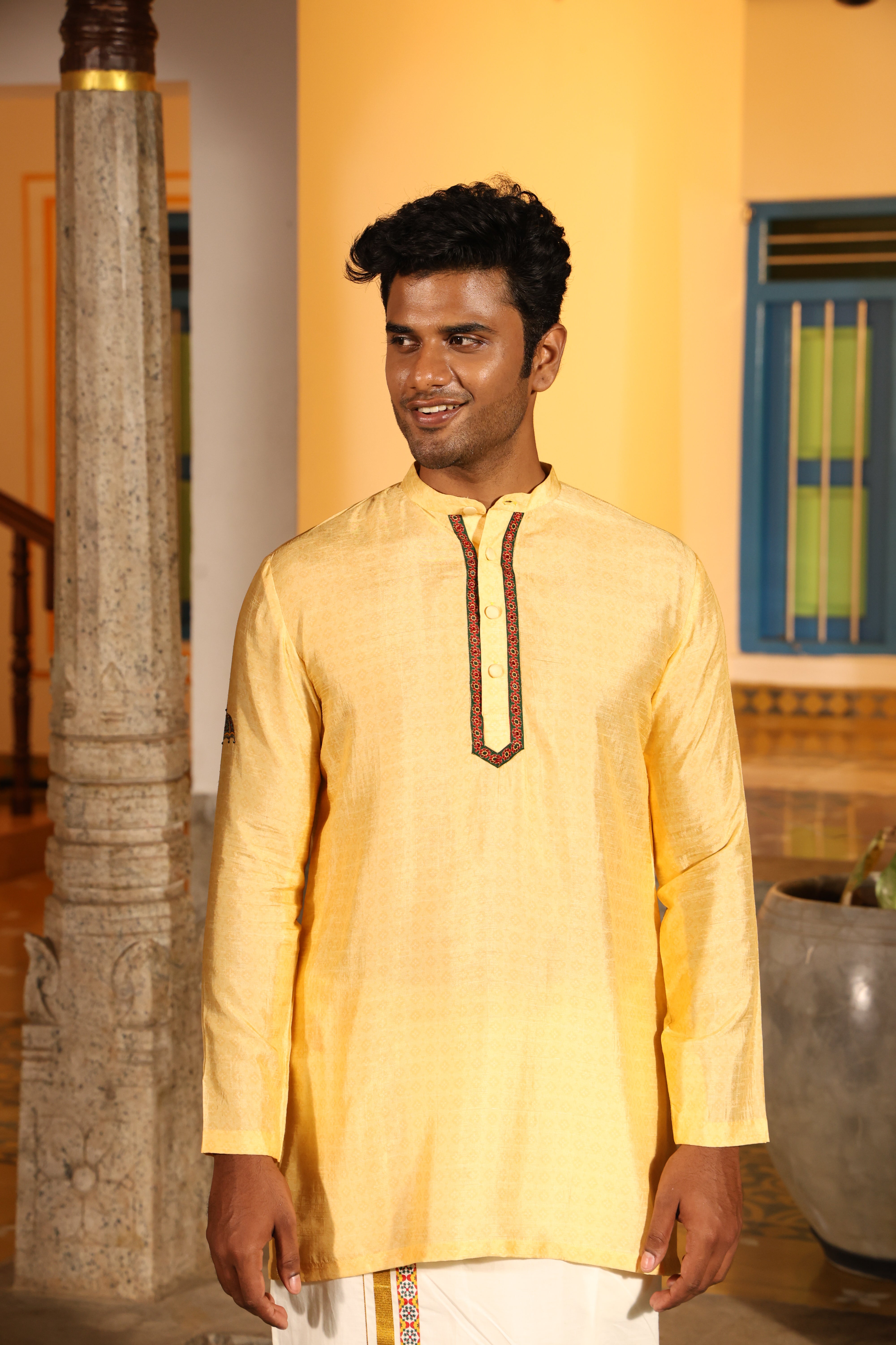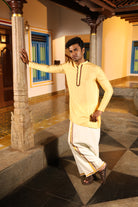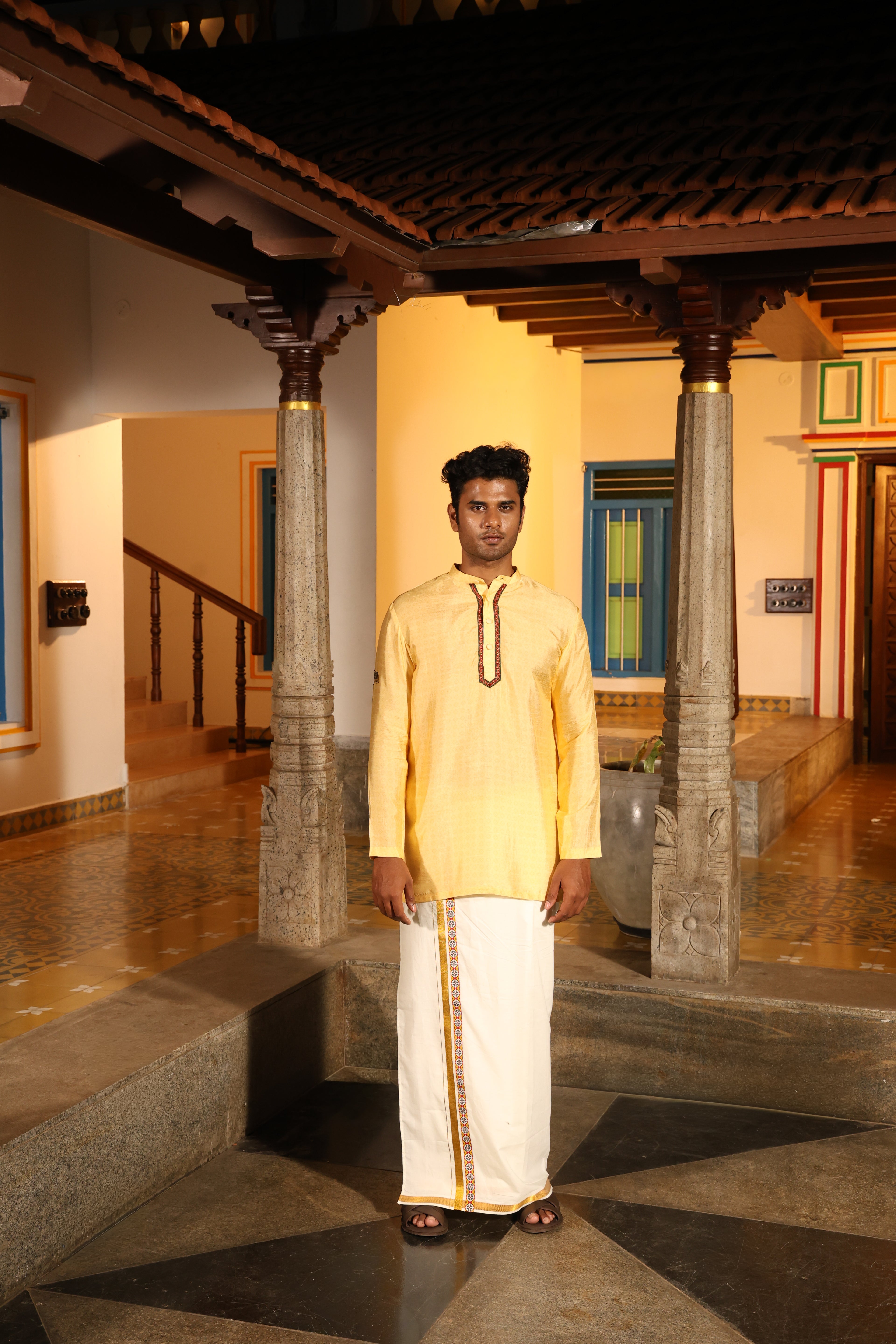 Highlighting traditional south indian veshti attair with gold zari border and athangudi tile border.(pre stiched)