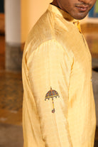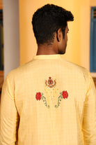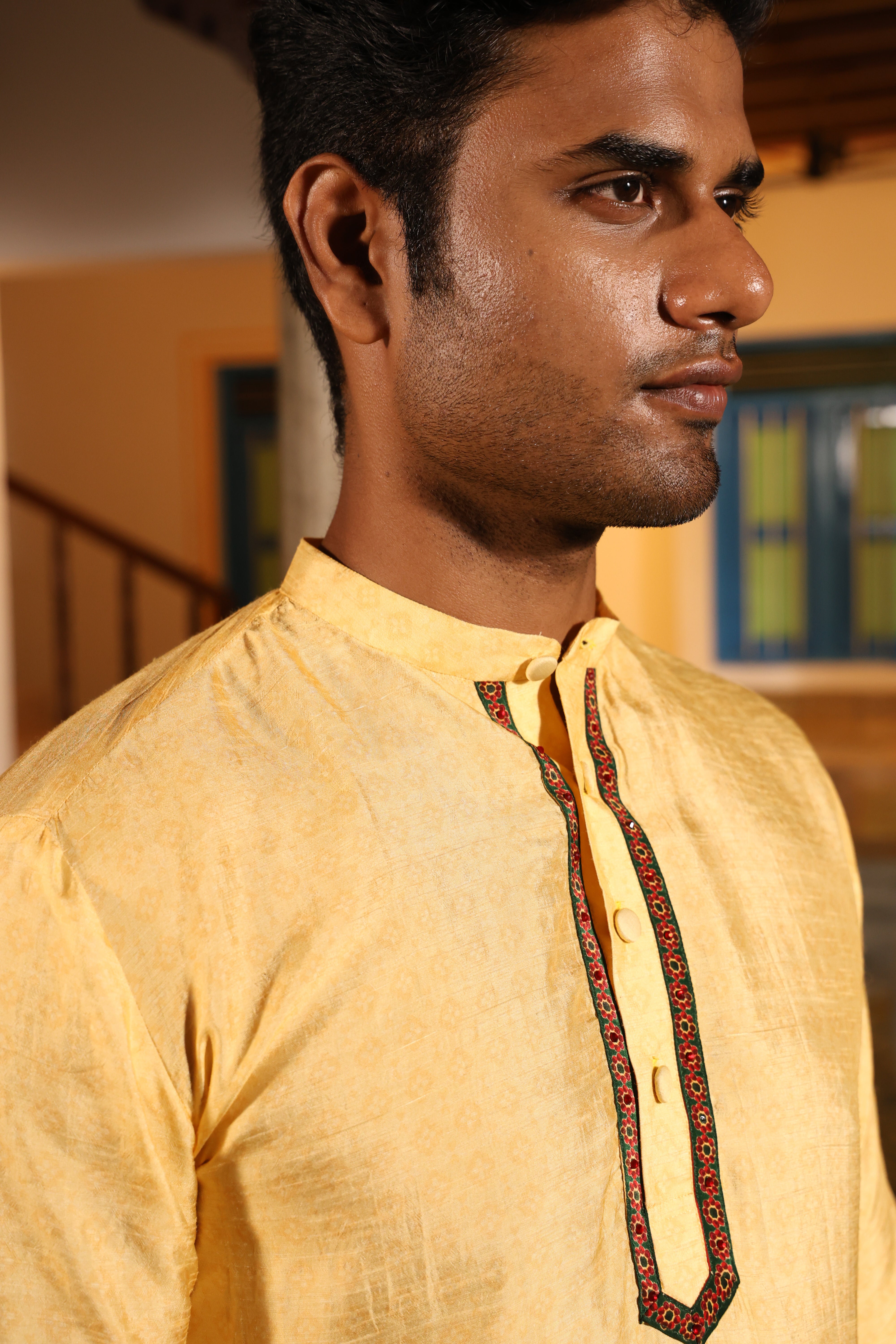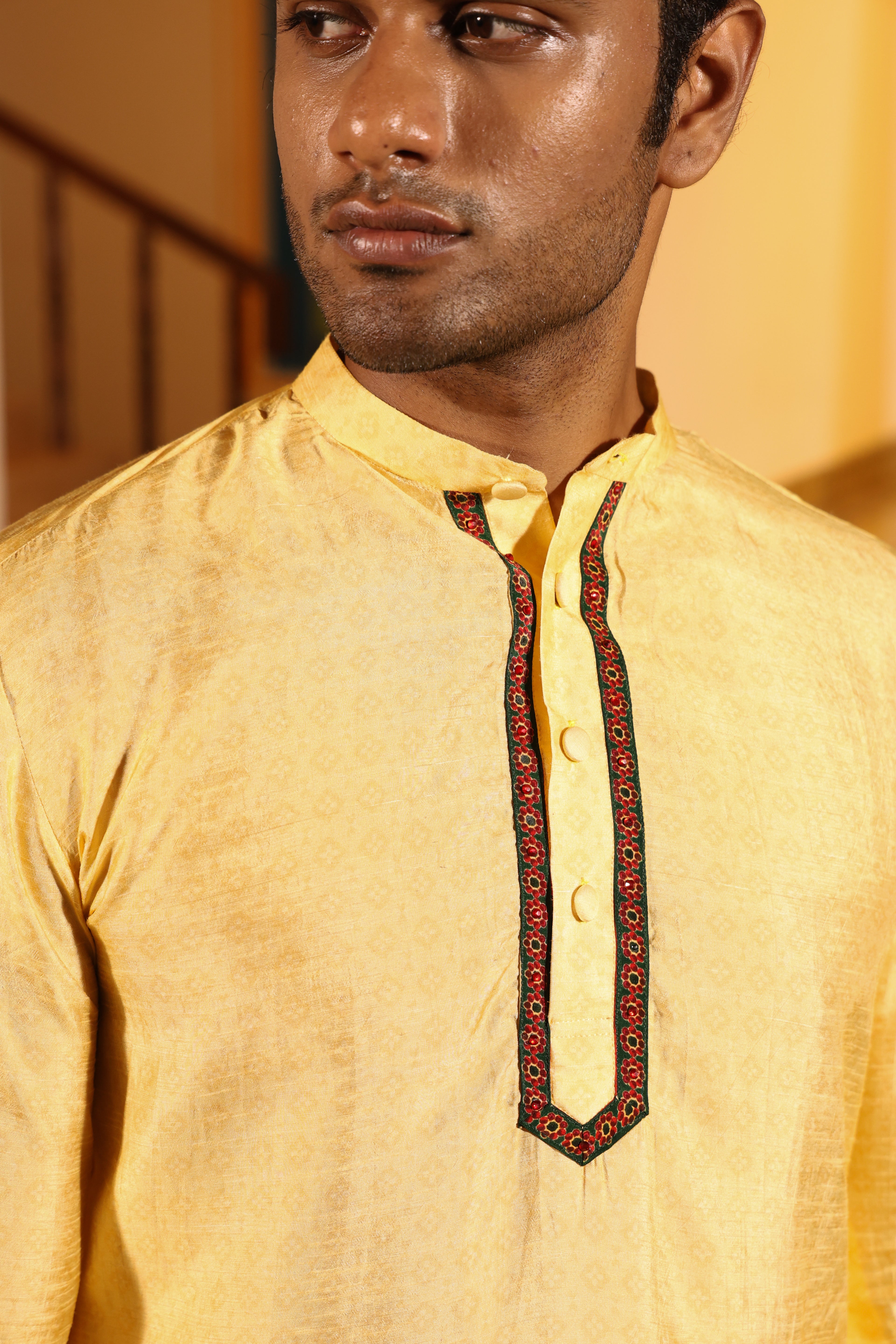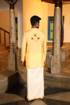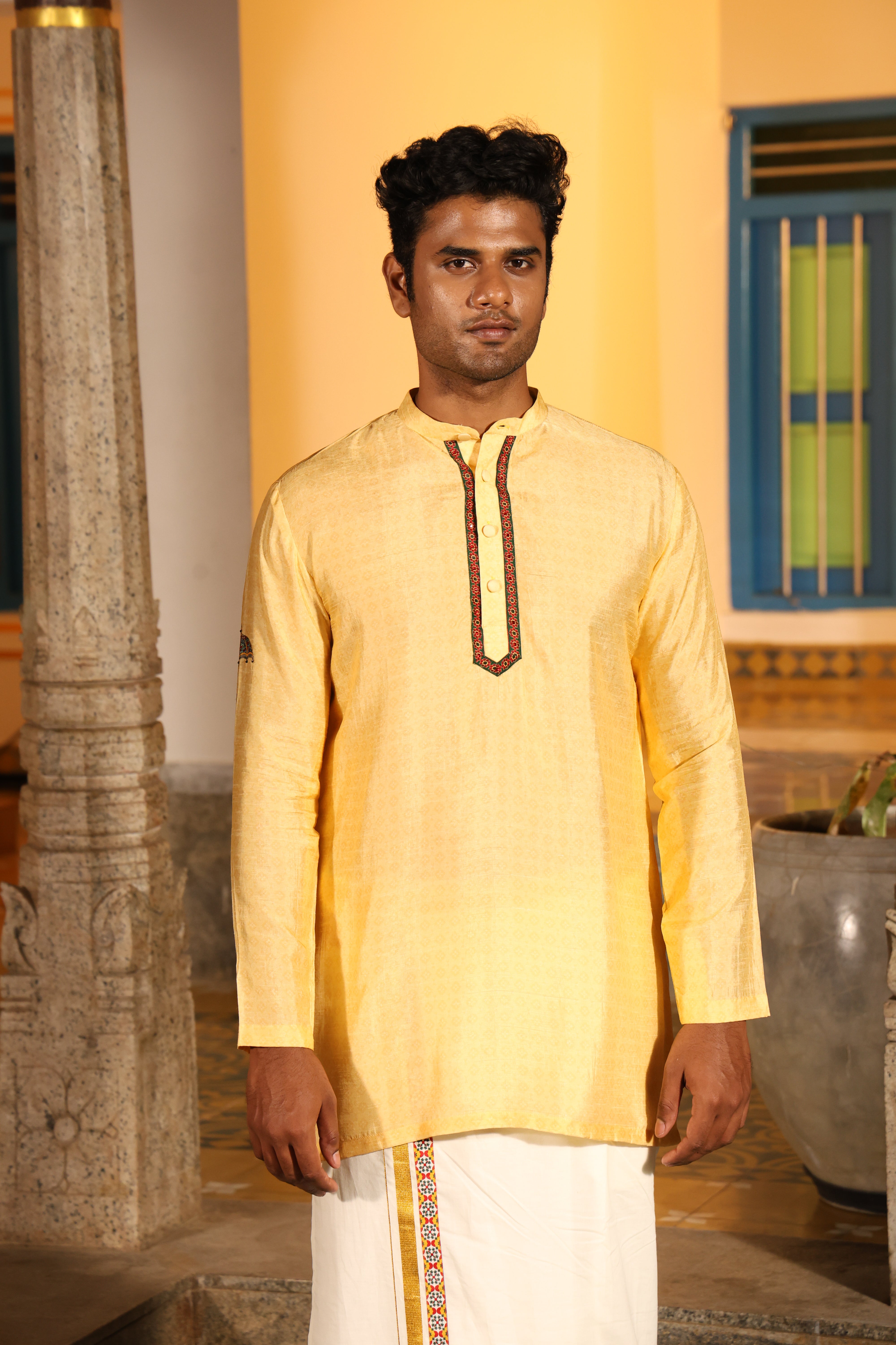 Worn with chinese collor full sleeves jhuba with chettinad architechture print and jewellery print embellished with stone embroidery.