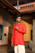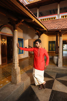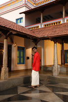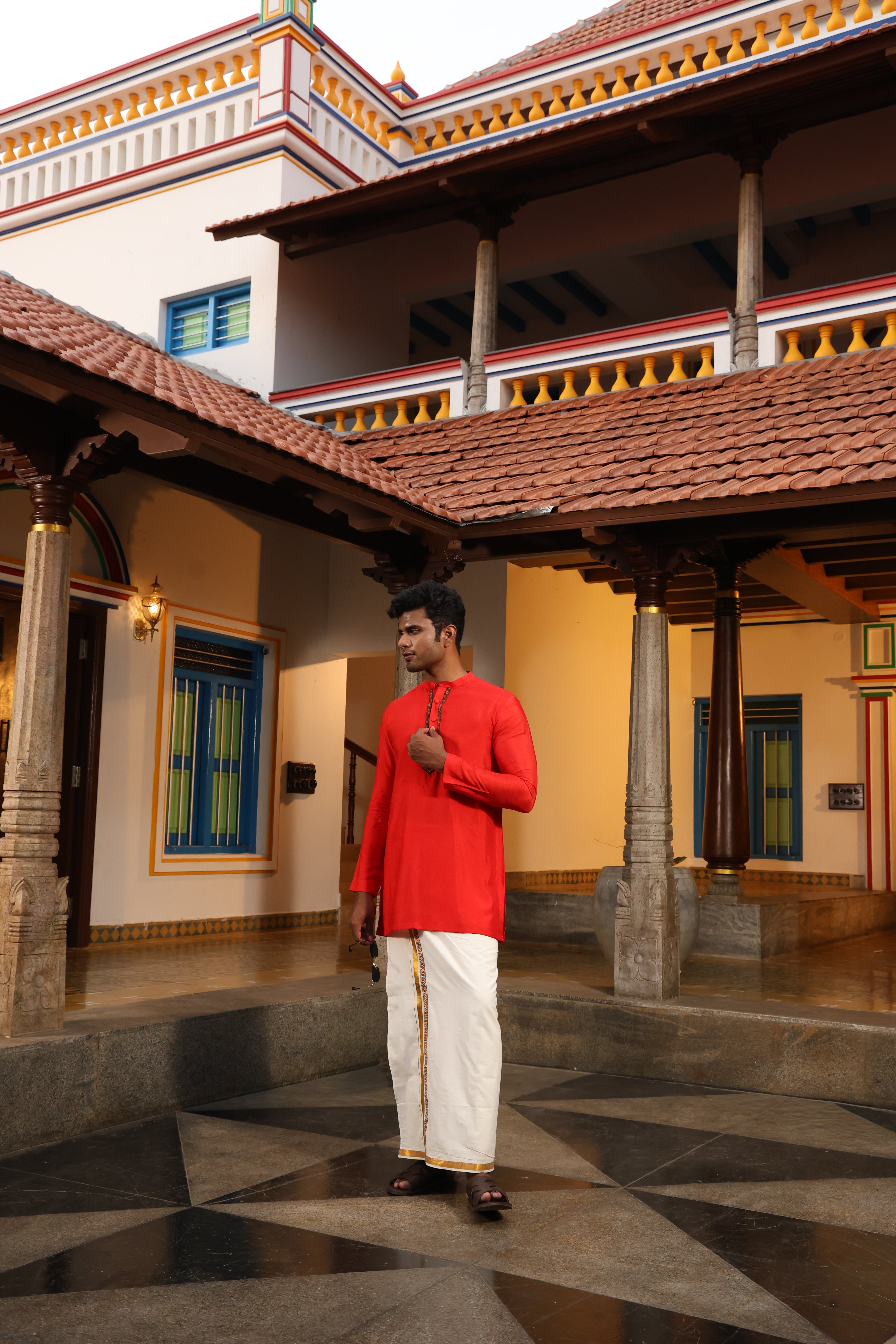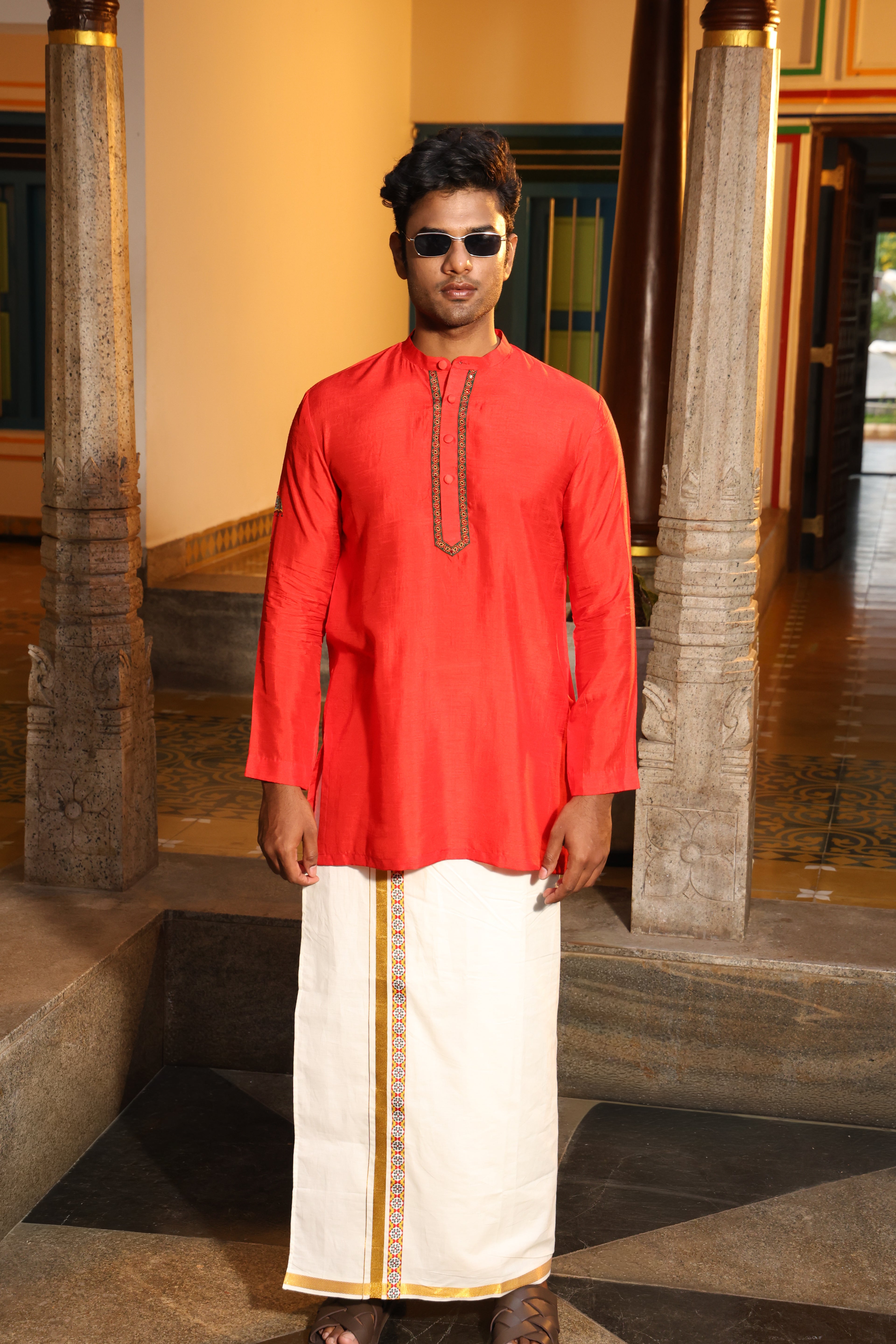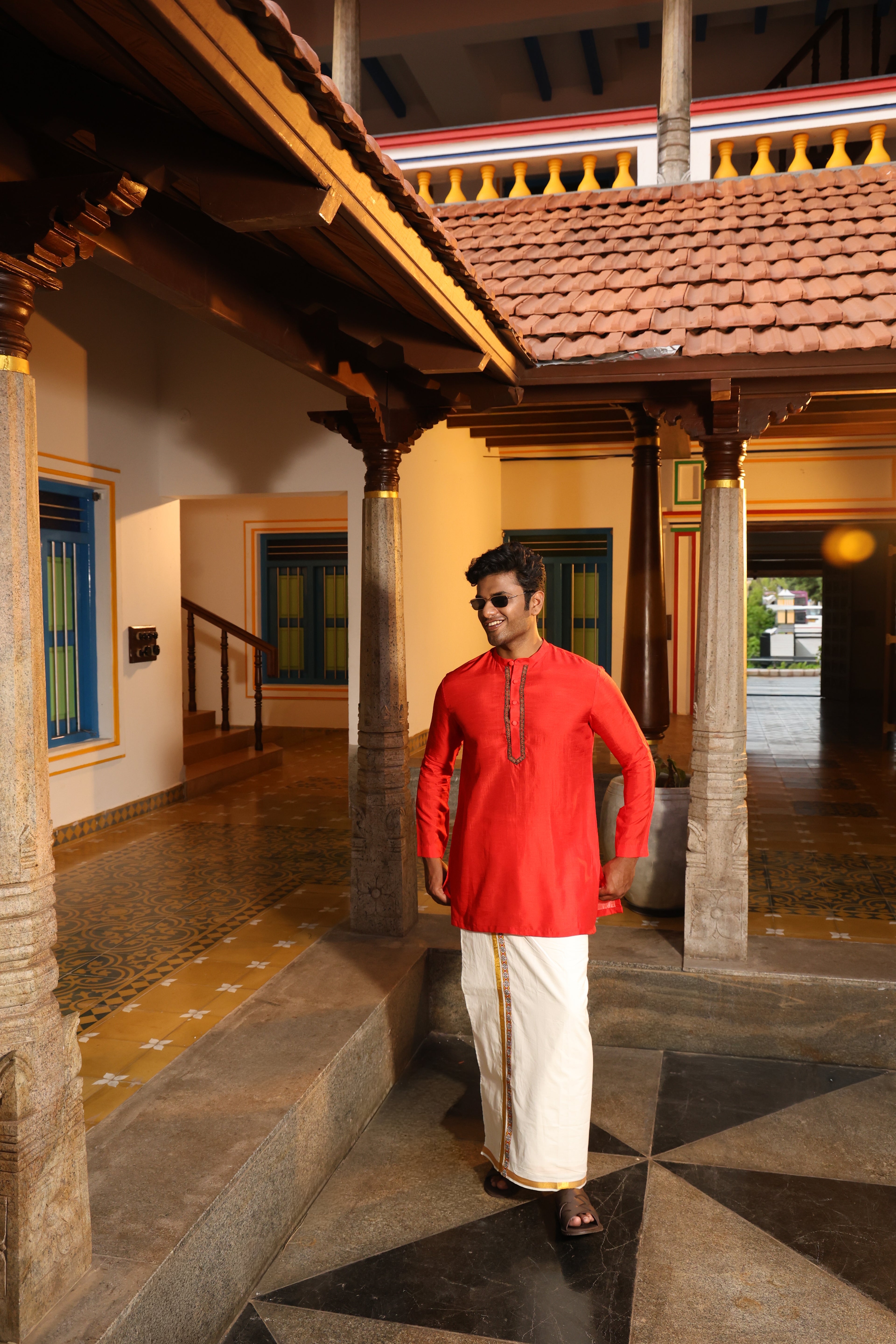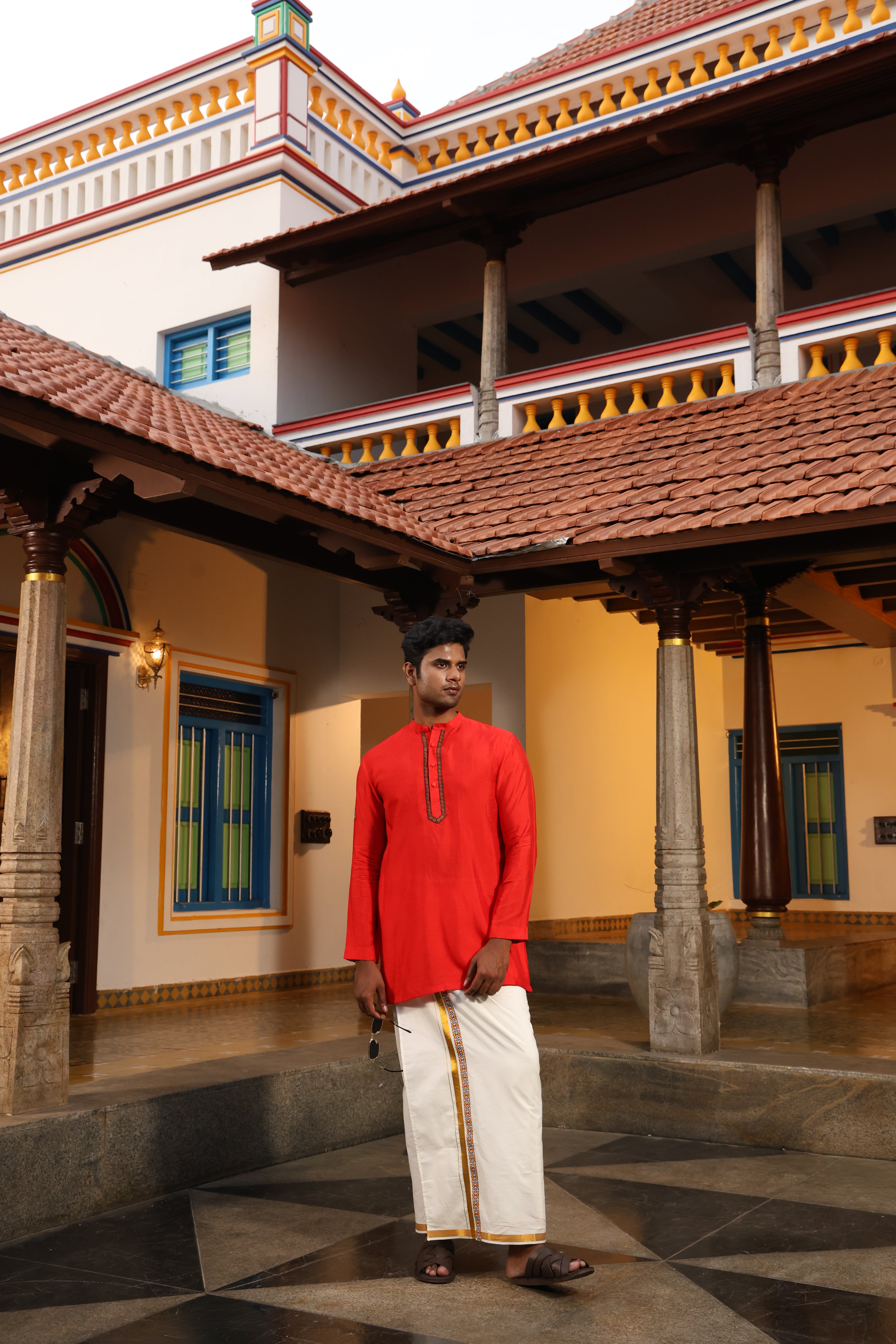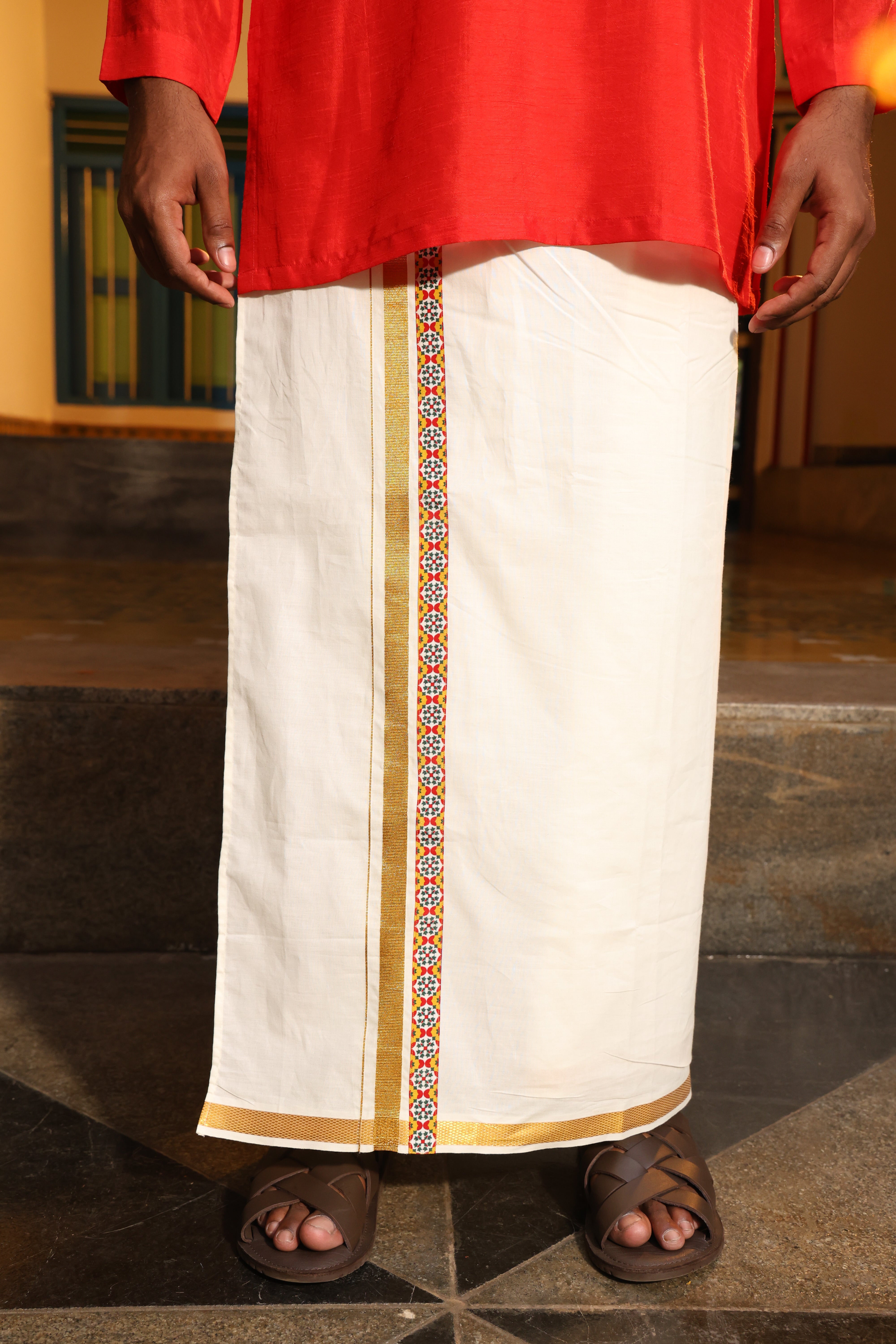Highlighting traditional south indian veshti attair with gold zari border and athangudi tile border.(pre stiched)