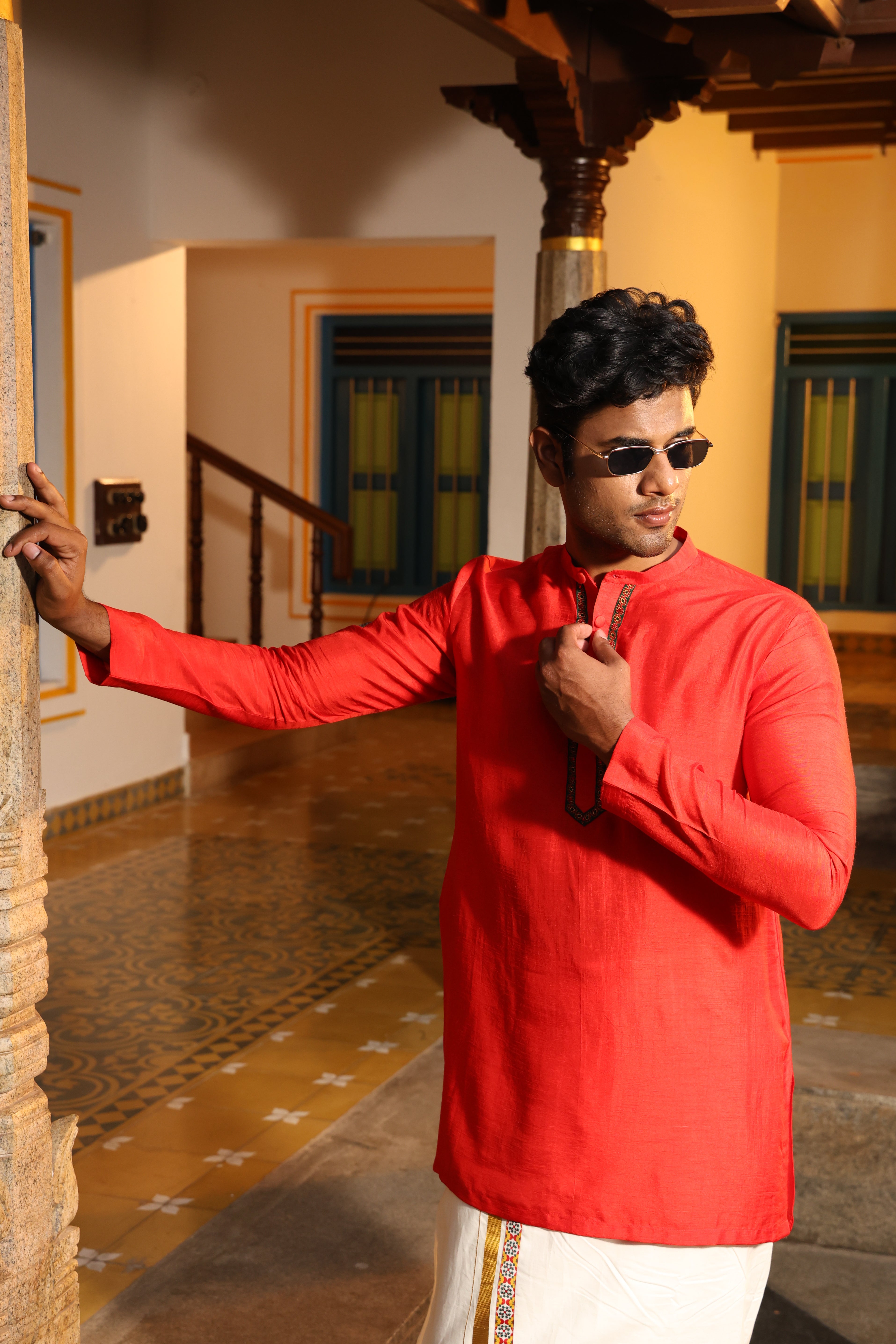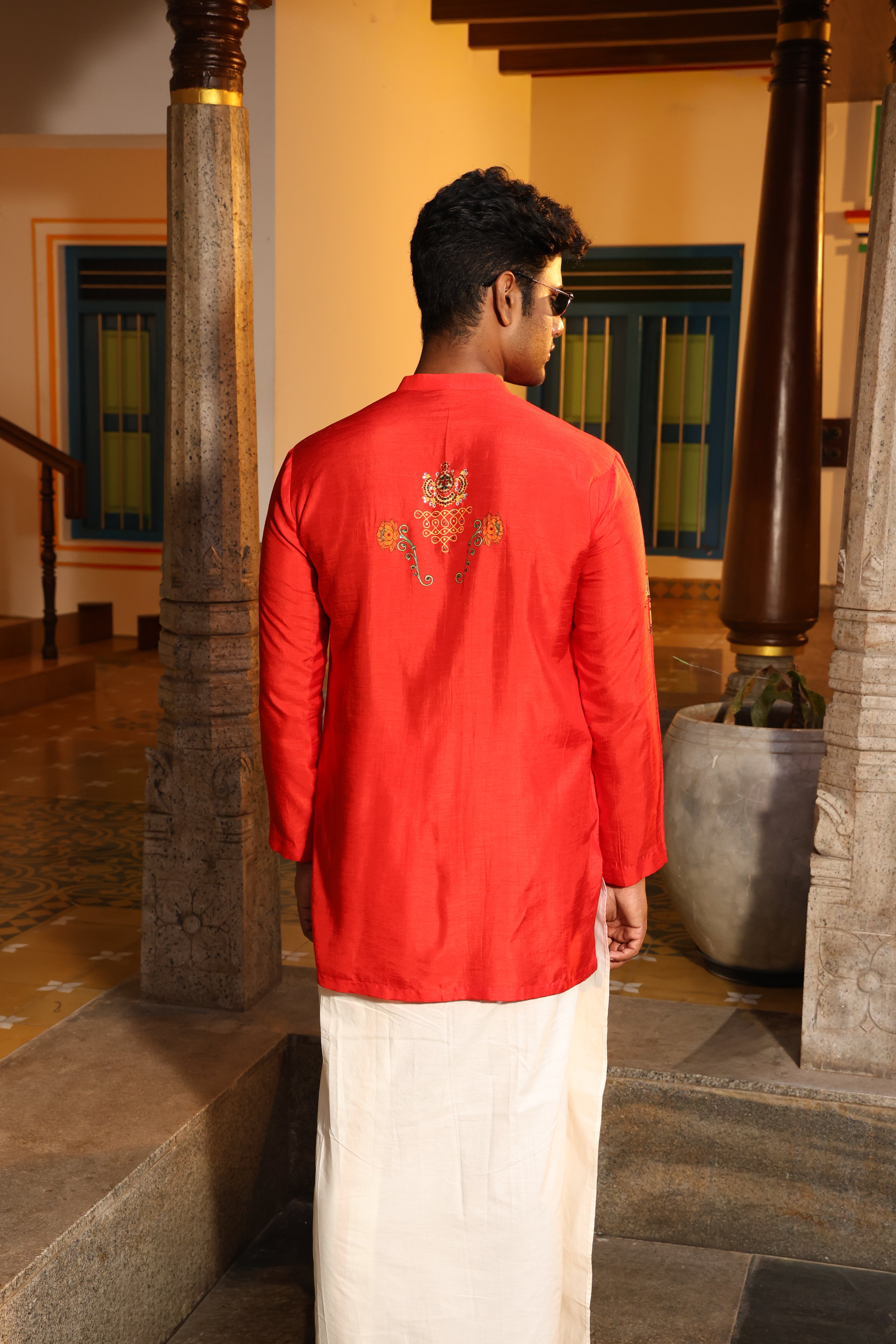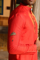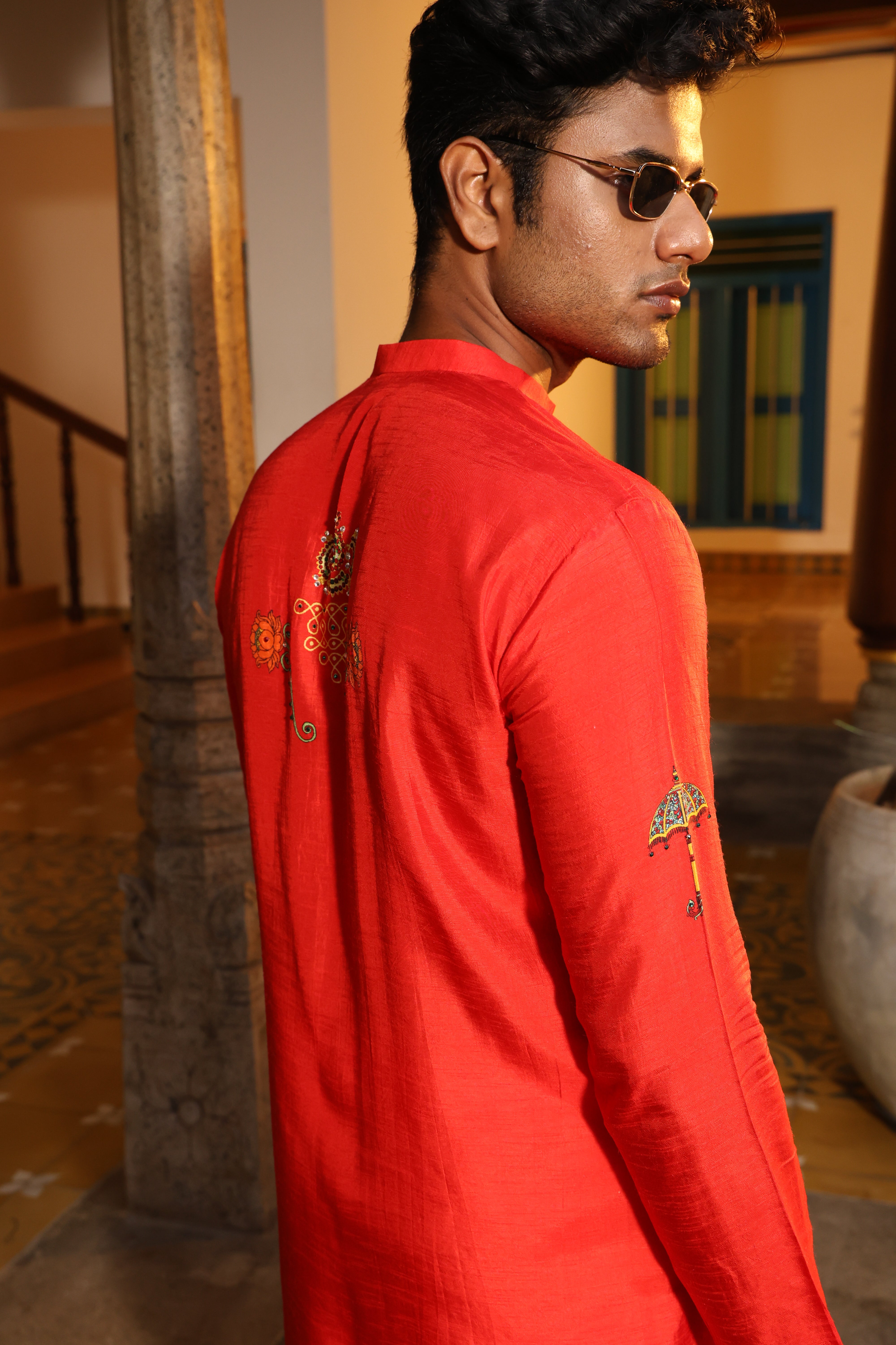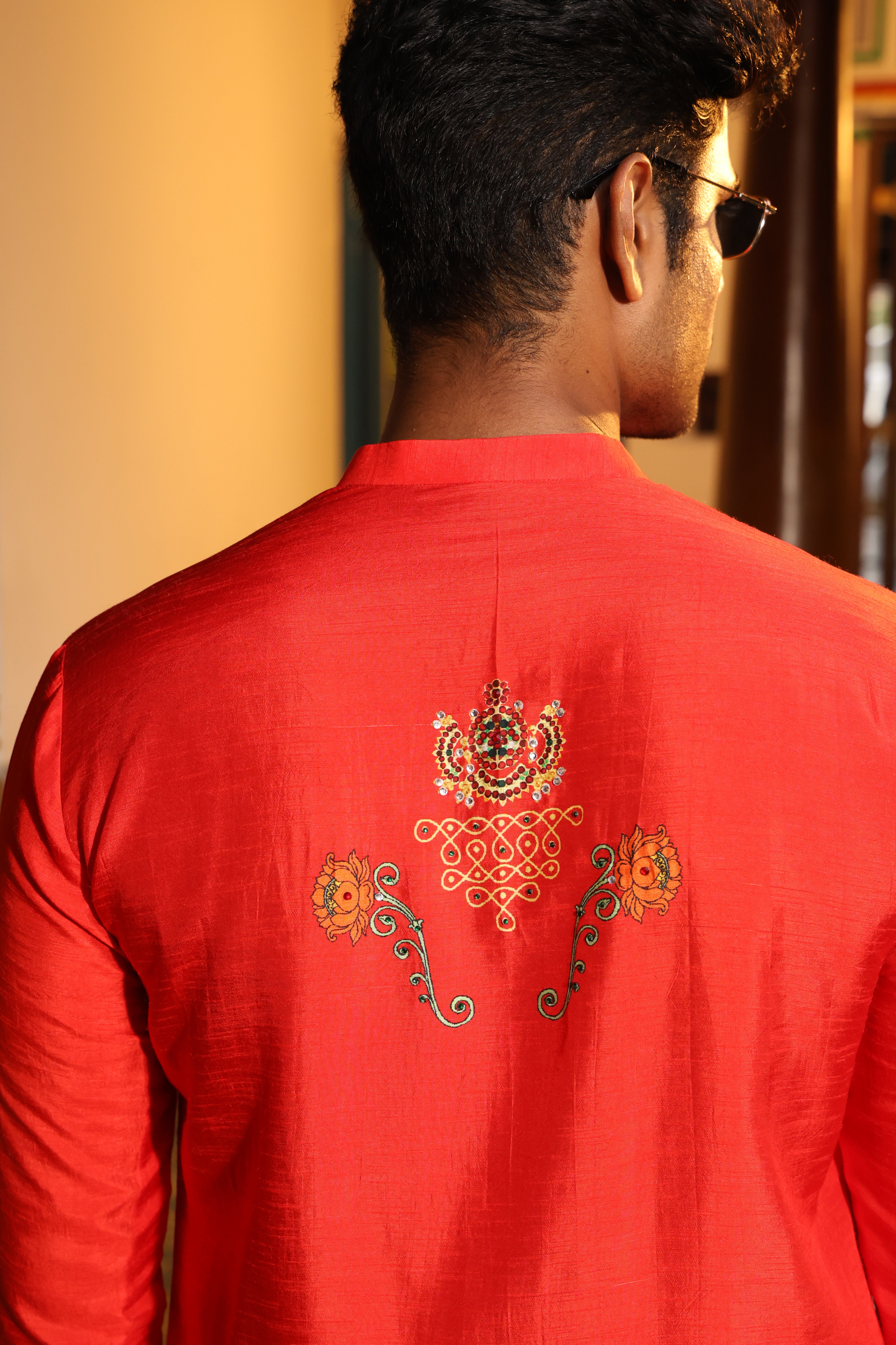 Worn with chinese collor full sleeves jhuba with chettinad architechture print and jewellery print embellished with stone embroidery.