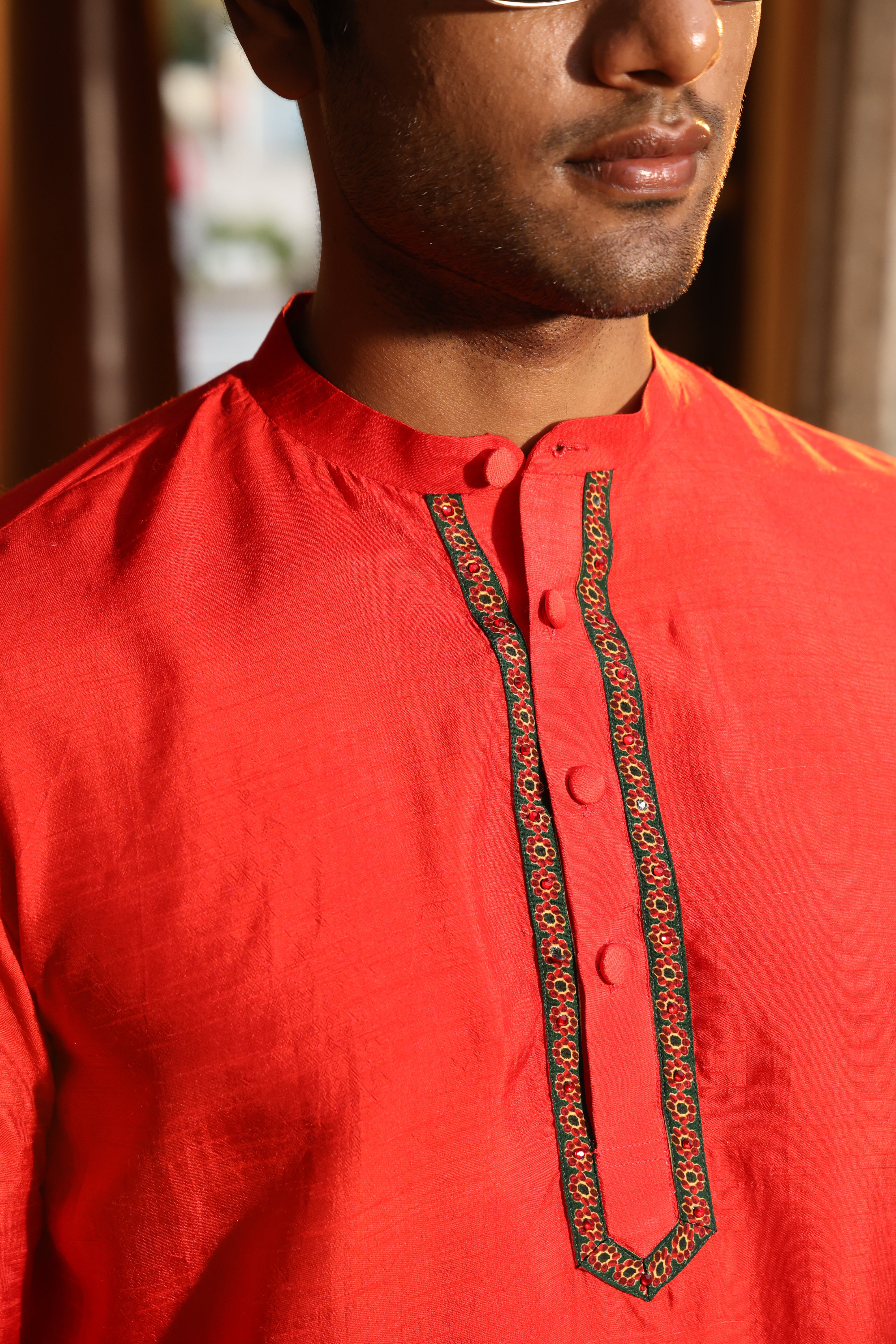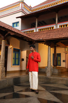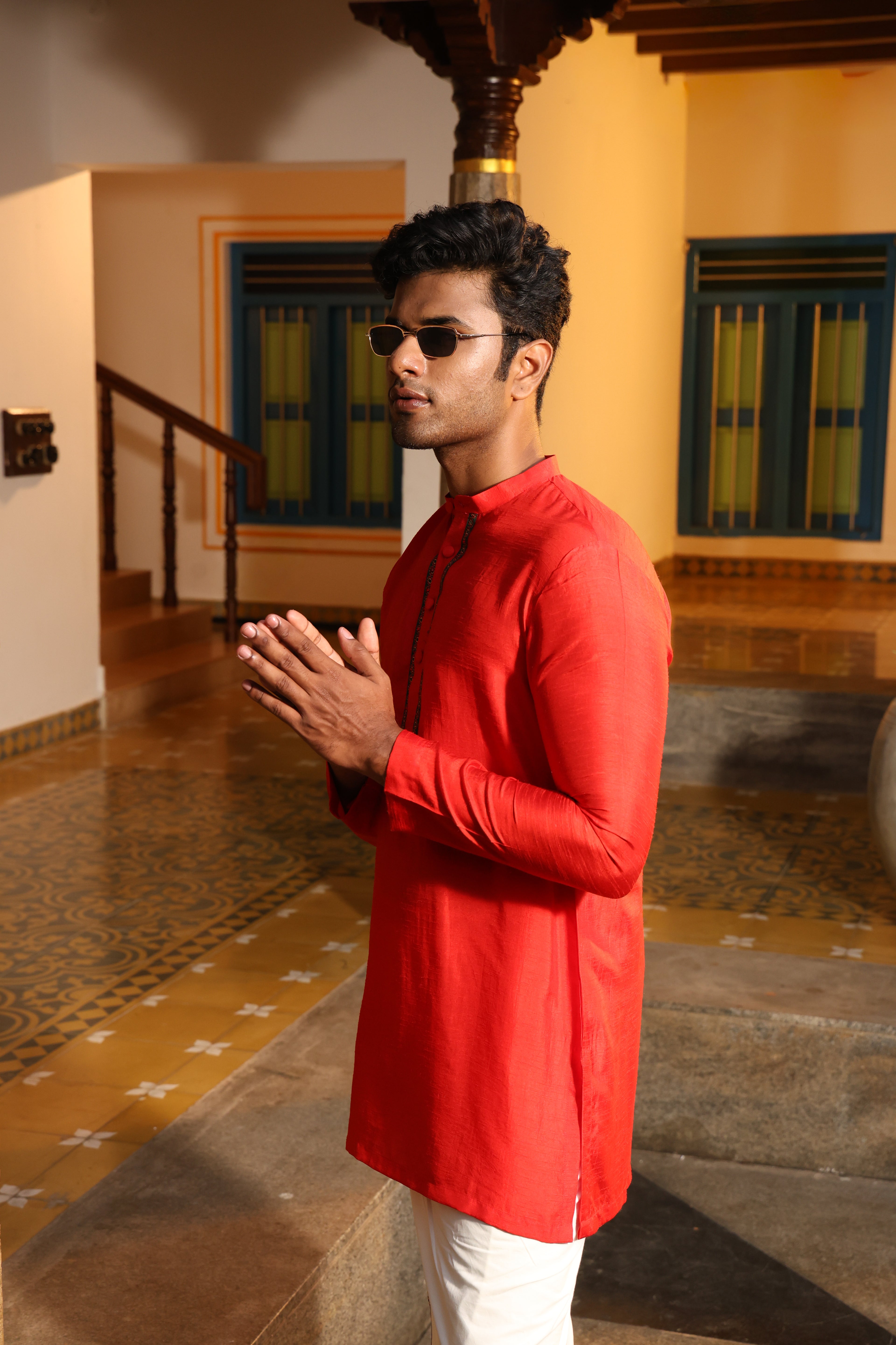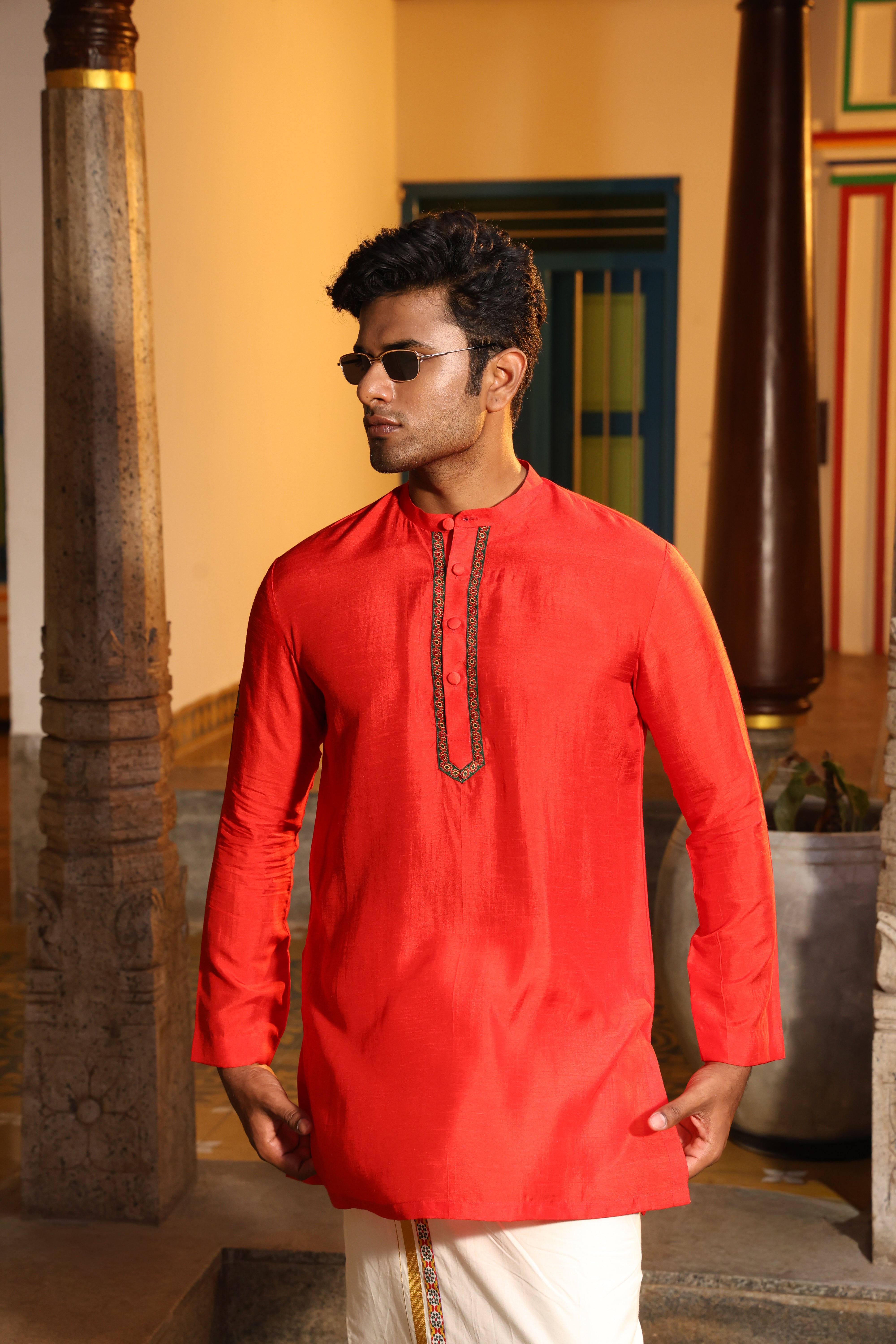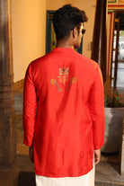 Worn with chinese collor full sleeves jhuba with chettinad architechture print and jewellery print embellished with stone embroidery.
