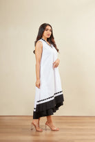 Over lap neck -Black border -Round lazer cut motif -Sleeve less -High-low