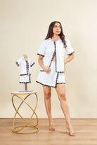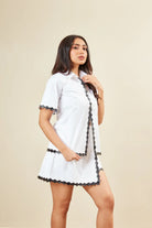 Front open -Round lazer cut motif -Short sleeve -Shirt collar -Skorts