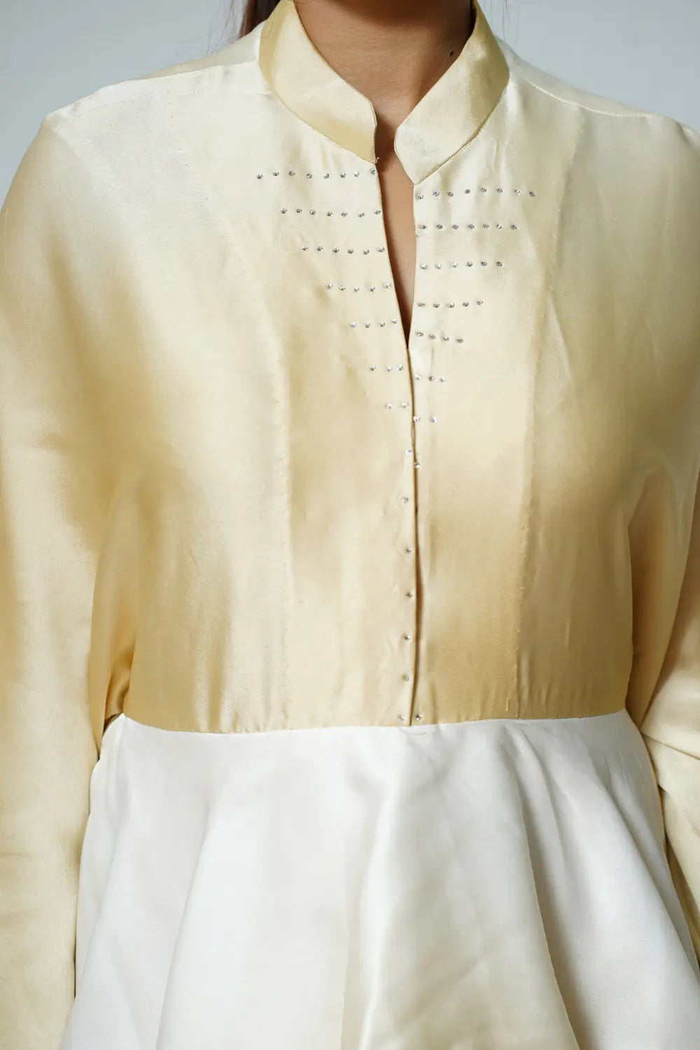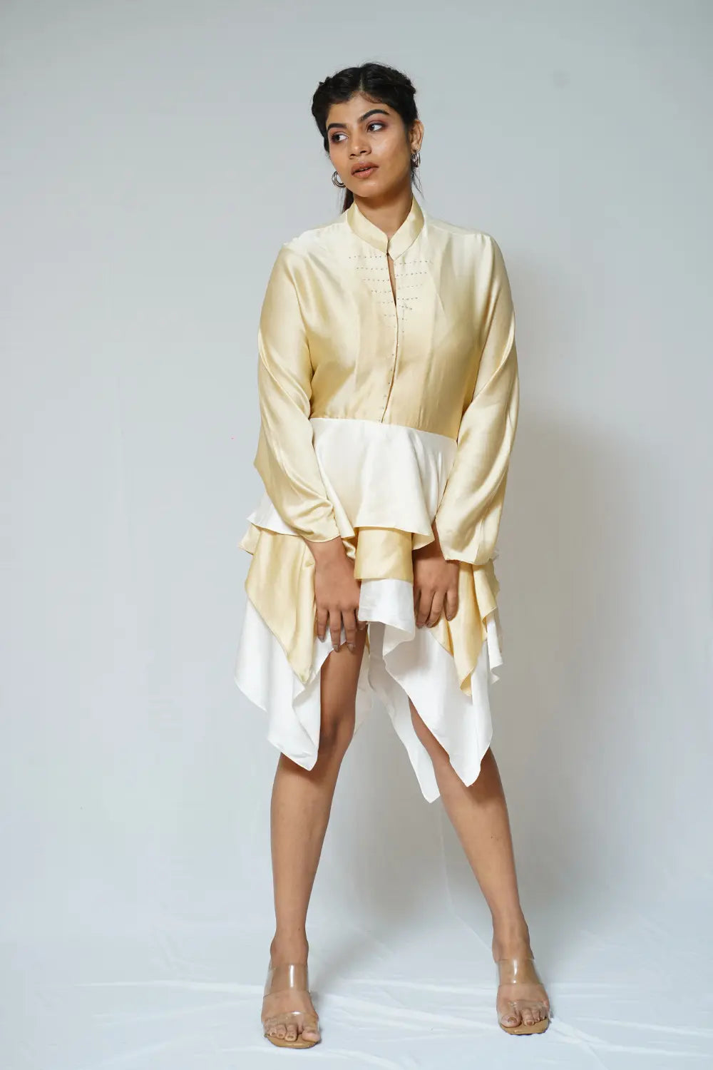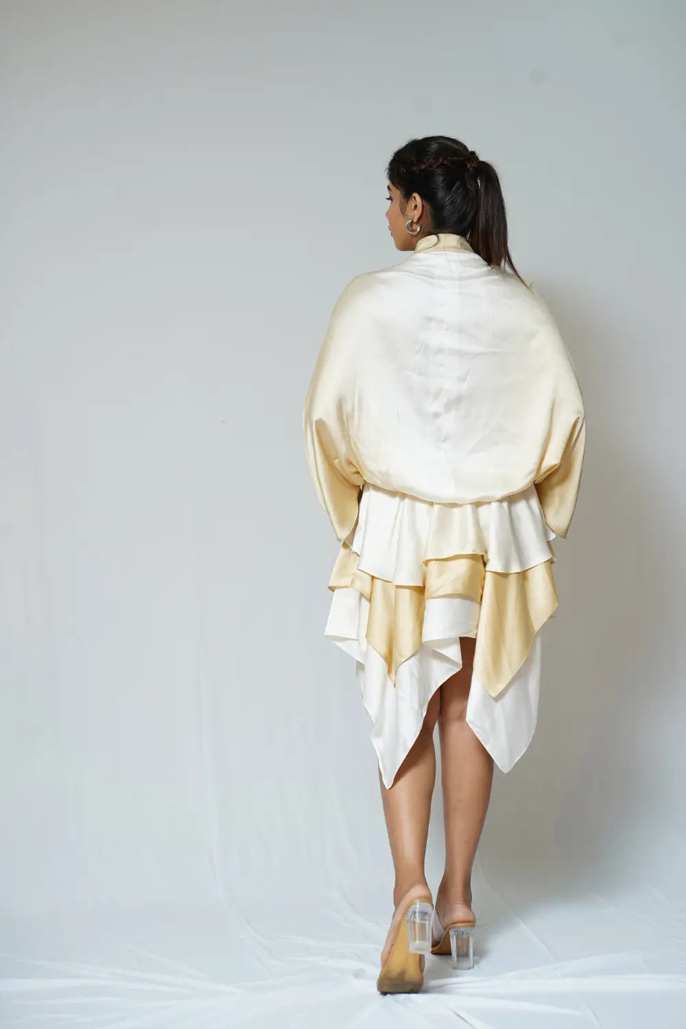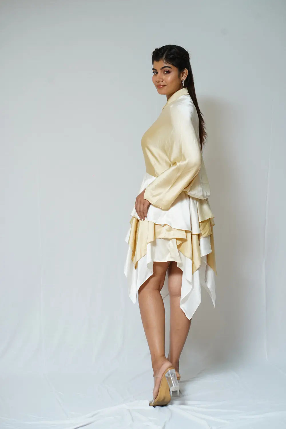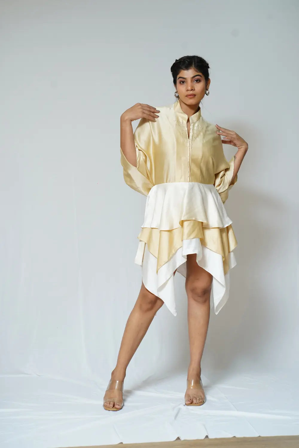 -Satin -Swarovski embellishment -White & Beige ombré -3 layer Handkerchief dress -Front open -Back elasticated -Straight skirt
