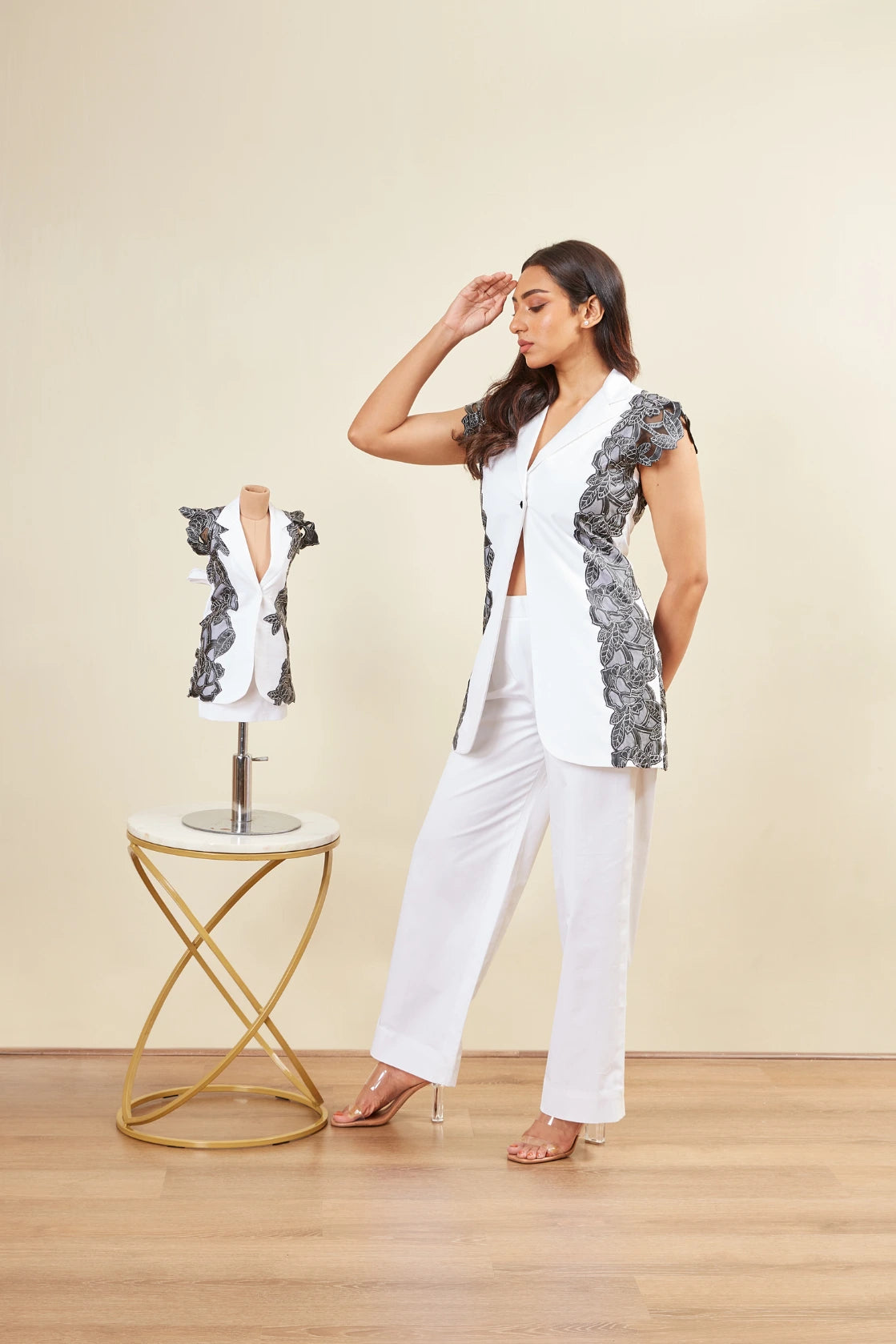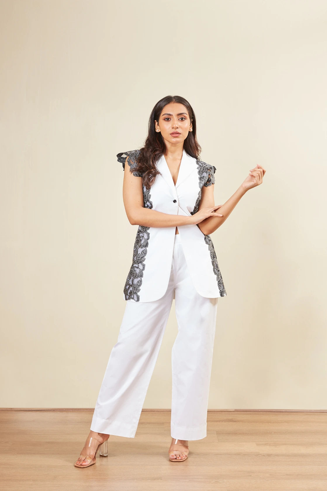 -Jacket -V neck -Sleeveless -Back belt -Lazer cut floral motif -Straight pants